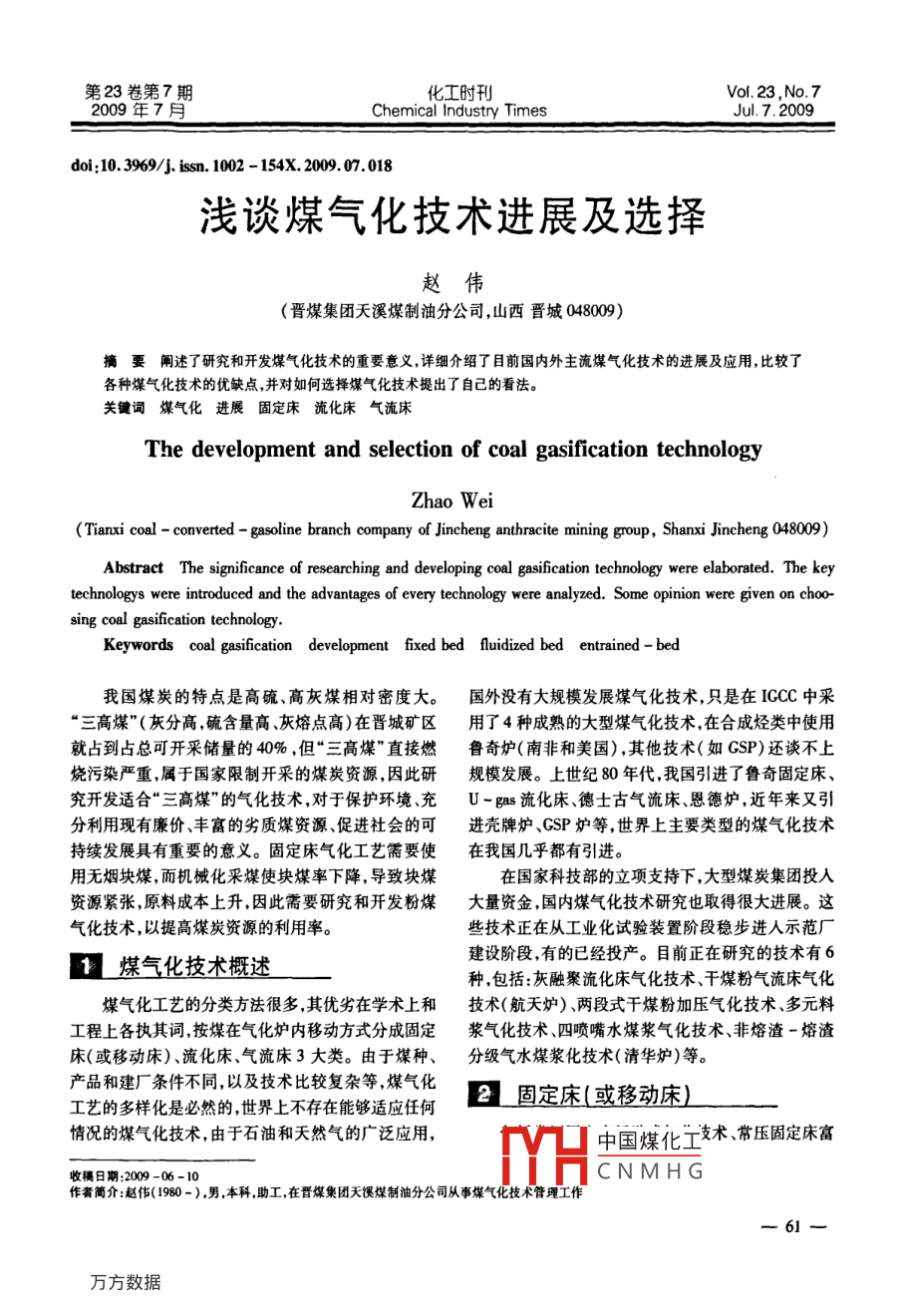 第23卷第7期化工時刊Vol. 23 ,No.72009年7月Chemical Industry TimesJul. 7.2009doi:10. 3969/j. isn. 1002 - 154X.2009.07. 018淺談煤氣化技術(shù)進展及選擇.趙偉(晉煤集團天溪煤制油分公司,山西晉城048009)摘要闡述了研究和開發(fā)煤氣化技術(shù)的重要意義,詳細介紹了目前國內(nèi)外主流煤氣化技術(shù)的進展及應(yīng)用,比較了各種煤氣化技術(shù)的優(yōu)缺點,并對如何選擇煤氣化技術(shù)提出了自己的看法。關(guān)鍵詞煤氣化進展固定床流化床氣流床The development and selection of coal gasification technologyZhao Wei(Tianxi coal - converted - gasoline branch company of Jincheng anthracite mining group, Shanxi Jincheng 048009)Abstract The signifcance of researeching and developing coal gasification technology were elaborated. The keytechnologys were introduced and the advantages of every technology were analyzed. Some opinion were given on choo-sing coal gasification technology.Keywords coal gasification development fixed bed fluidized bed entrained - bed我國煤炭的特點是高硫、高灰煤相對密度大。國外沒 有大規(guī)模發(fā)展煤氣化技術(shù),只是在ICCC中采“三高煤”(灰分高,硫含量高、灰熔點高)在晉城礦區(qū)用了4種成熟的大型煤氣化技術(shù),在合成烴類中使用就占到占總可開采儲量的40% ,但“三高煤"直接燃魯奇爐(南非和美國),其他技術(shù)(如GSP)還談不上燒污染嚴重,屬于國家限制開采的煤炭資源,因此研規(guī)模發(fā)展。上世紀80年代,我國引進了魯奇固定床、究開發(fā)適合“三高煤”的氣化技術(shù),對于保護環(huán)境、充U-gas流化床、德士古氣流床、 恩德爐,近年來又引分利用現(xiàn)有廉價、豐富的劣質(zhì)煤資源促進社會的可進殼牌爐、CSP爐等,世界上主要類型的煤氣化技術(shù)持續(xù)發(fā)展具有重要的意義。固定床氣化工藝需要使在我國幾乎都有引進。用無煙塊煤,而機械化采煤使塊煤率下降,導(dǎo)致塊煤在國家科技部的立項支持下,大型煤炭集團投入資源緊張,原料成本上升,因此需要研究和開發(fā)粉煤大量資金,國內(nèi)煤氣化技術(shù)研究也取得很大進展。這氣化技術(shù),以提高煤炭資源的利用率。些技術(shù)正在從工業(yè)化試驗裝置階段穩(wěn)步進人示范廠建設(shè)階段,有的已經(jīng)投產(chǎn)。目前正在研究的技術(shù)有61煤氣化技術(shù)概述種,包括:灰融聚流化床氣化技術(shù)、干煤粉氣流床氣化煤氣化工藝的分類方法很多,其優(yōu)劣在學(xué)術(shù)上和技術(shù)(航天爐)、兩段式干煤粉加壓氣化技術(shù)、多元料工程上各執(zhí)其詞,按煤在氣化爐內(nèi)移動方式分成固定漿氣化技術(shù)、四噴嘴水煤漿氣化技術(shù)非熔渣-熔渣床(或移動床)、流化床、氣流床3大類。由于煤種、分級氣水煤漿化技術(shù)(清華爐)等。產(chǎn)品和建廠條件不同,以及技術(shù)比較復(fù)雜等,煤氣化2固定床(或移動床)工藝的多樣化是必然的,世界上不存在能夠適應(yīng)任何情況的煤氣化技術(shù),由于石油和天然氣的廣泛應(yīng)用,中國煤化工術(shù)、常壓固定床富收稿日期:2009 -06- 10MYHCNMHG作者簡介:趙偉( 1980-).男,本科,助工,在晉煤集團天懊煤制油分公司從事煤氣化技術(shù)管理工作化工時刊2009. Vol. 23 ,No.7工藝.試驗《Technology & Experiment》氧連續(xù)氣化技術(shù)、魯奇固定床加壓氣化技術(shù),這類技料( 水煤漿)氣流床和干法進料(煤粉)氣流床,前者以術(shù)的共同特點是應(yīng)用廣泛、技術(shù)成熟、工藝可靠、容易德士古(Texaco)水煤漿爐為代表,還有國內(nèi)開發(fā)的多操作,但是對原料煤品種及粒度大小要求苛刻,隨著元料漿 加壓氣化爐、多噴嘴(四燒嘴)水煤漿加壓氣化技術(shù)革新的進步,固定床氣化的環(huán)保和效率也得到了爐。后者以殼牌(Shell)爐為代表,還有GSP爐以及國很大提高,因此對間歇固定床氣化技術(shù)也不宜“一刀內(nèi)開發(fā)的航天爐 、兩段爐、清華爐、四噴嘴干粉煤爐。切”,應(yīng)制定嚴格的環(huán)保標(biāo)準,使現(xiàn)有的固定床氣化4.1 水煤漿 氣流床與干粉煤氣流床的比較技術(shù)的水平逐步提高,允許符合新環(huán)保標(biāo)準的固定床總體來講,水煤漿氣流床要比干粉煤氣流床技術(shù)氣化技術(shù)發(fā)展。對魯奇爐而言,其目前仍是一個先進成熟,運行穩(wěn)定,設(shè)備國產(chǎn)化率高投資省,有備用爐適用的氣化技術(shù)。12的水煤漿加壓氣化與不設(shè)備用爐的干煤粉加壓氣化裝置建設(shè)費用的比例大致為Shell法: GSP法:多噴嘴9流化床水煤漿加壓氣化法:CE水煤漿法= =(2-2.5):(1.4包括灰熔聚流化床粉煤氣化技術(shù)和恩德粉煤氣-1.6):1.2:1,原料煤運輸、制漿、泵送入爐系統(tǒng)比化技術(shù),灰熔聚流化床粉煤氣化技術(shù)早在上世紀80Shell和CSP等干粉煤加壓氣化要簡單,安全可靠,建年代,就由中國科學(xué)院山西煤炭化學(xué)研究所開始研設(shè)投產(chǎn)周期短,這些都是業(yè)主所期望的,但缺點是氣究,2001年單爐配套20 kt合成氨/a工業(yè)性示范裝置化用原料煤受氣化爐耐火磚襯里的限制,只適宜于氣在陜西城固化肥廠成功運行,實現(xiàn)了工業(yè)化;2005年化低灰熔點的煤。碳轉(zhuǎn)化率較低。比氧耗和比煤耗4月,由山西晉城煤業(yè)集團公司與中科院山西煤化所較高。氣化爐耐火磚使用壽命較短,一般為1 ~2 a,聯(lián)合組建成立山西天和煤氣化科技有限公司,負責(zé)灰國產(