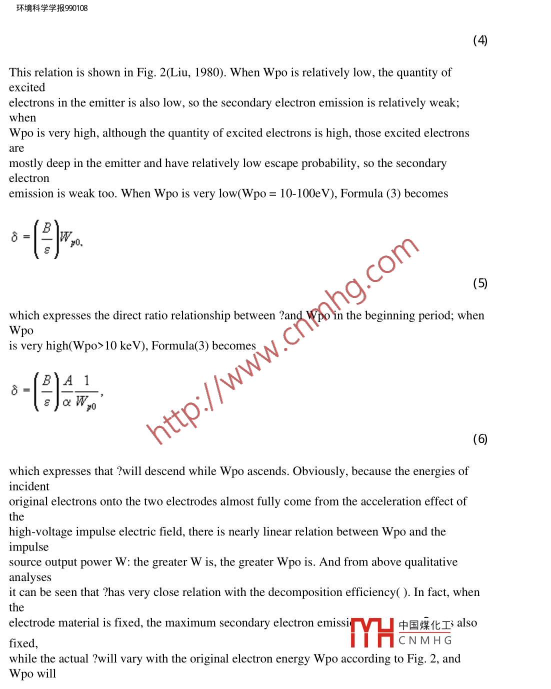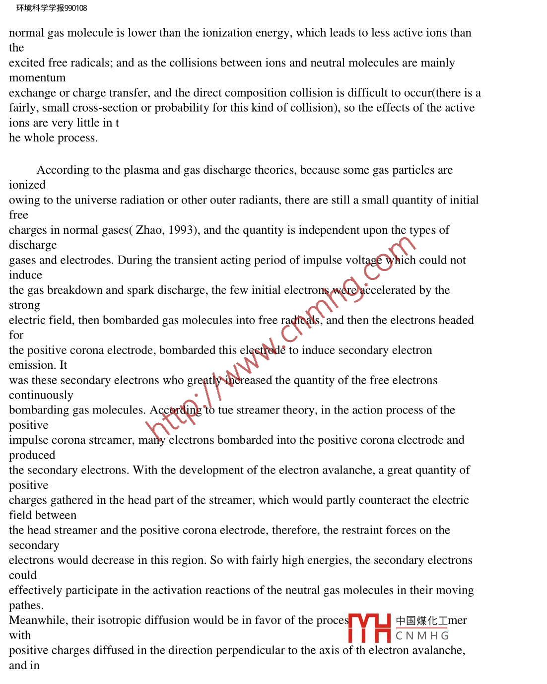 環(huán)境科學(xué)學(xué)報(bào)990108環(huán)境科學(xué)學(xué)報(bào)舊萬萬數(shù)據(jù)資源系統(tǒng) ENVIRONMENTAL數(shù)字化期刊WANFANG DATA (CHINAINFO)SCIENCESDIGITIZED PERIODICAL1999年第1期No.11999Analysis of impulse electric field effect on organic exhaust gasdecomposition*Zhang Yu, Jin Xin-yu**, Jian Xuan-zhen, Wang RuiDepartment of Information and Electronic Engineering, Zhejiang University, Hangzhou310027 ChinaAbstract--The technique of organic exhaust gas decomposition with impulse corono-dischrgeplasma has been investigated in this study. It has been discovered that the impulse electricfieldaffected the decomposition efficiency with the secondary electron emission coefficient8 of the corona electrode as an intermediate: when w was fixed the corona electrodematerial with higher 8 could induce higher decomposition efficiency. In these experimentswolfram electrode which has the highests has really induced the highest decompositioneFficiency.Keywords: impulse electric field power; impulse corona discharge; secondary electronemissioncoefficient; organic exhaust gas decomposition1 Introductionand The organic exhaust gases mainly contain adipose, aromatic hydrocarbon, alcohol, etheramine and so on. They have greatly polluted the atmospheric environment, and eventhreatened humanbeings existence. At present, the commonly used methods of the organic exhaust gas disposalcontainchemical catalytic oxidation (Su, 1990), electron beam irradiation (Xu, 1986), and microbialdecomposition(Tanaka, 1986)and soon. But these methods often needed the high cost ofproduction and complicated equipments. The technique of plasma decomposition has beenstudied in detail in the decomposition of some inorganic waste gases(Matsumoto, 1983), butthere has been few researches on the organic exhaust gas decomposition using this techniqueThough there have been some experimental reports(Huang, 1997Zheng, 1997), there has been very few reports about the detailed effCNMHeelectric fieldfle∥/Eyqk/ jese/jes99je9901/990108hm(第1/11頁)2010323033:46環(huán)境科學(xué)學(xué)報(bào)990108on the organic exhaust gas decomposition In this paper, based on lots of experiments,according to thestreamer theory of high-voltage impulse corona discharge, the electric field energy exchangemechanismin the plasma chemistry, and the reaction equipment applicability in the experiments, themechanism of the discharge electric field effects on the decomposition and the actual electricfield structure of the impulsecorona discharge have been analyzed2 ExperimentalThe schematic diagram of experimental system is shown in Fig. 1. It was a wire-cylinderreactor of impulse corona plasma. The reaction tube shell was made of stainless steel. TheInnerpin-like corona electrode was made of wolfram wire, and also could be made of copper orstainlesssteel wire, which was connected with the plasma electric source. The plasma electric sourceconsistedof dc source, high-voltage impulse source, and waveform shaper where the impulse width ofhigh-voltage impulse was about 5 ms(to be improved further). Organic exhaust gases flowedoutof their vessels and into the reactor through pin valves and flowmeters. In this experiment,toluenexylene or dichloromethane flowed into the reactor respectively, and the high-voltage impulseSourcewas stitched on to excite corona. Experimental gases were the steel-bottle gases containing900 ppmtoluene or xylene or containing 959 ppm dichloromethane, whose flow rates were 45 ml/minHitachi 163 GC and IRS were used to analyze the gas ingredients before and after thereaction3 Results and discussionsUnder the controls of directional reaction conditions, toluene, xylene or dichloromethanewasdecomposed into low-toxic matters, such as CO2, H20(gas )and NH3 and so on. In Table 1theexperiment results of toluene and xylene were given. In Table 2, thent resultsdichloromethane decomposition with different electrode were given中國煤化CNMHGcan beseen that there were different decomposition effects with the three kinds of electrodesfle∥/Eyqk/ jese/jes99je9901/990108hm(第2/11頁)2010323033:46環(huán)境科學(xué)學(xué)報(bào)990108wolframinduced the highest decomposition efficiency, copper electrode was the second high, andsteel was the lowest. Decomposition organic exhaust gases by high-voltage impulse coronaplasmatechnique, means that the gas molecules were bombarded by high-energy electrons and ionsfromimpulse corona discharge, the inner bonds of molecules were cut off, and then thedecompositionoccurred. The energies of free electrons from impulse corona were in the range of 2-20 e Vandmost of the corresponding ions were in the active-ion energy range of 20-50 eV(Matsumoto1983)As the electrons have lighter masses and greater speeds, the energy range of electrons, whichcouldbombard the molecules and induce their ionization or decomposition, is 5-15 eVTail gasFig. I Schematic diagram of experiment system 1. Plasma electric source; 2. pulse parametergauge; 3. reaction body; 4. insulator; 5. corona electrode; 6. organic exhaust gas; 7flowmeter;8 pin valve; 9. tail gas testerTable 1 High-voltage pulse corona plasma decomposition experiments of toluene and xylenewithdifferent corona electrodesGas T,C R.H., Vp, kv W,w, n, of wolfram n of copper n, of stainless steelToluene 27792.1中國煤化工CNMHGNotes: T is the average temperature; R H. is the relative humidity; Vp is the amplitude offle∥/Eyqk/ jese/jes99je9901/990108hm(第3/11頁)2010323033:46環(huán)境科學(xué)學(xué)報(bào)990108plvoltage; W is the output power; is the decomposition efficiencyTable 2 Decomposition results of dichloromethane with different corona electrodes4×4mm4×4mmstainless steelcopper wreWireVp W,n, Vp W,nKW|%K∨W(%4039824038762372.871.427674352264291.856291.854Notes: Vp is the amplitude of pulse voltage; w is the output power; is the decompositionefficiencyAccording to the streamer theory of hig