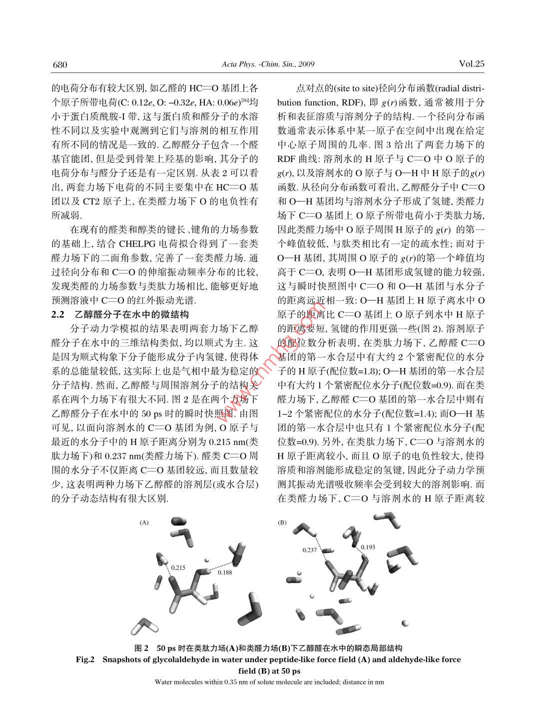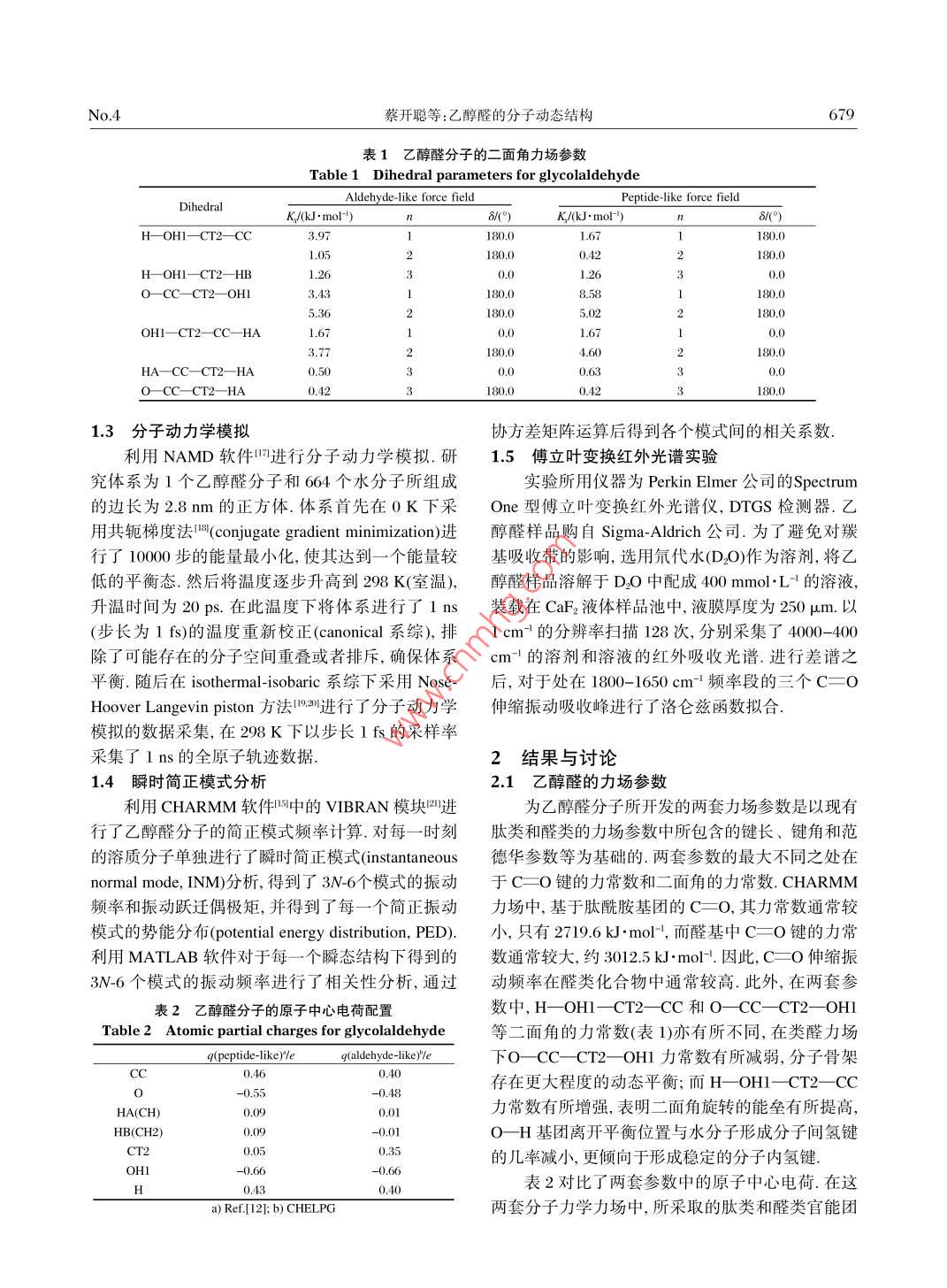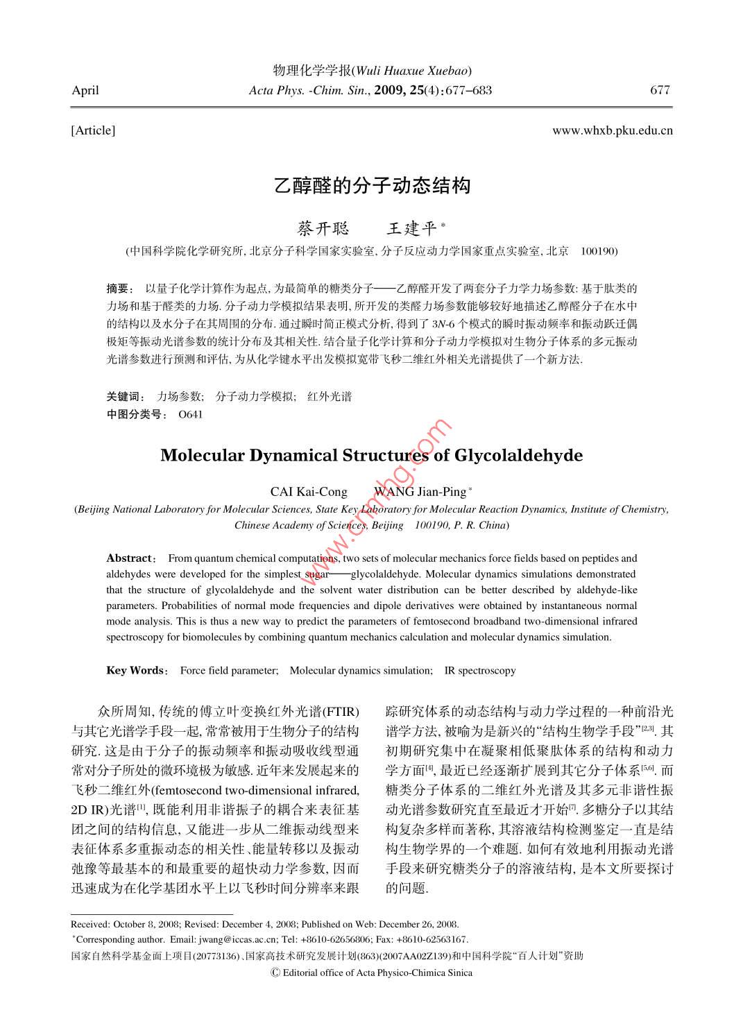 物理化學學報(Wuli Huaxue Xuebao) April Acta Phys.-him.sin.,2009,25(4):677-683677 [Article] www.whxb.pku.edu.cn乙醇醛的分子動態(tài)結構蔡開聰王建平(中國科學院化學研究所,北京分子科學國家實驗室分子反應動力學國家重點實驗室,北京100190摘要:以量子化學計算作為起點,為最簡單的糖類分子——乙醇醛開發(fā)了兩套分子力學力場參數(shù):基于肽類的力場和基于醛類的力場分子動力學模擬結果表明,所開發(fā)的類醛力場參數(shù)能夠較好地描述乙醇醛分子在水中的結構以及水分子在其周圍的分布通過瞬時簡正模式分析,得到了3N-6個模式的瞬時振動頻率和振動躍遷偶極矩等振動光譜參數(shù)的統(tǒng)計分布及其相關性結合量子化學計算和分子動力學模擬對生物分子體系的多元振動光譜參數(shù)進行預測和評估,為從化學鍵水平出發(fā)模擬寬帶飛秒維紅外相關光譜提供了一個新方法關鍵詞:力場參數(shù);分子動力學模擬;紅外光譜中圖分類號:0641 Molecular Dynamical Structures of Glycolaldehyde CAI Kai-Cong WANG Jian-Ping (Beijing National Laboratory for Molecular Sciences, State Key Laboratory for Molecular Reaction Dynamics, Institute of Chemistry, Chinese Academy of Sciences, Beijing 100190, P. R. China) Abstract: From quantum chemical computations, mechanics force fields based on peptides and aldehydes were developed for the simplest sug hyde. Molecular dynamics simulations demonstrated that the structure of glycolaldehyde and the can be better described by aldehyde-like parameters. Probabilities of normal mode ere obtained by instantaneous normal mode analysis. This is thus a new way to predict broadband two-dimensional infrared spectroscopy for biomolecules by combining quantum mechanics calculation and molecular dynamics simulation. Key Words: Force field parameter; Molecular dynamics simulation; IR spectroscopy眾所周知,傳統(tǒng)的傅立葉變換紅外光譜(FTIR)蹤研究體系的動態(tài)結構與動力學過程的一種前沿光與其它光譜學手段一起常常被用于生物分子的結構譜學方法,被喻為是新興的“結構生物學手段”23其研究這是由于分子的振動頻率和振動吸收線型通初期研究集中在凝聚相低聚肽體系的結構和動力常對分子所處的微環(huán)境極為敏感.近年來發(fā)展起來的學方面,最近已經逐漸擴展到其它分子體系而飛秒二維紅外(femtosecond twodimensional- infrared,糖類分子體系的二維紅外光譜及其多元非諧性振2DIR)光譜,既能利用非諧振子的耦合來表征基動光譜參數(shù)研究直至最近才開始多糖分子以其結團之間的結構信息,又能進一步從二維振動線型來構復雜多樣而著稱,其溶液結構檢測鑒定一直是結表征體系多重振動態(tài)的相關性能量轉移以及振動構生物學界的一個難題.如何有效地利用振動光譜弛豫等最基本的和最重要的超快動力學參數(shù),因而手段來研究糖類分子的溶液結構,是本文所要探討迅速成為在化學基團水平上以飛秒時間分辨率來跟的問題. Received: October 8, 2008; Revised: December 4, 2008; Published on Web: December 26, 2008 'Corresponding author. Email: jwang @iccas. ac.cn; Tel: +8610-62656806; Fax: +8610-62563167國家自然科學基金面上項目20773136)、國家高技術研究發(fā)展計劃(863)(200A02Z139)和中國科學院“百人計劃”資助 Editorial office of Acta Physico-Chimica Sinica678 Acta Phys.-Chim. Sin., 2009Vo1.25隨著二維紅外光譜實驗研究的逐步深入,從理 OHI論上模擬計算分子的二維紅外光譜正在成為一個研究熱點-0同時,由于二維紅外光譜包含了豐富的分子動態(tài)結構信息,認識光譜與結構的關系,需要了解多種振動參數(shù)的光譜特征其中最為關鍵的參數(shù)之一是非諧振子的零級振動頻率,即分子在不A受到光激發(fā)時的基團振動之基頻頻率.動態(tài)分子的圖1乙醇醛分子結構及其在 CHARMM力場下的零級頻率的計算化學預測一直是個難題,它涉及到原子類型如何從理論上描述一個動態(tài)分子的包括溶劑在內的Fig.1 Molecular structure of glycolaldehyde and the微環(huán)境.最近有人提出了靜電場及其梯度場模型 atom types in CHARMM force field用來預測肽鏈的酰胺-I帶(主要是C0伸縮振動)在文獻中從未有過報道.我們進行了乙醇醛的的液相振動頻率.這一途徑雖然復雜且具有局限 CHARMM力場參數(shù)開發(fā)研究的嘗試,在現(xiàn)有的化性,卻被證明是有效的因為靜電作用在許多溶劑學鍵長、鍵角以及范德華等參數(shù)基礎上獲得了類肽中都占主導但是,有關其它生物分子的多振動模和類醛的兩套力場參數(shù).在經典分子動力學模擬式的動態(tài)零級頻率的研究目前還未見報道中,勢能函數(shù)是一系列包括鍵長、鍵角、二面角等鍵在本文中以最小的糖類分子乙醇醛(圖1)為例合作用項,以及 Lennard-Jones-(LJ)6-12作用和靜電應用量子化學和分子動力學模擬相結合的方法對相互作用等非鍵合項的能量之和5其振動光譜參數(shù)進行了預測.首先以量化計算為起點開發(fā)了兩套分子力學力場參數(shù):類肽力場和類醛V(R)=k(b-b2+s2+-)2+ bond力場隨后用這兩套略有不同的力場參數(shù)分別進行了分子動力學模擬,并對乙醇醛的瞬態(tài)結構、與溶劑 K.1+cos(-8)+ KP-+ impropers的結構關系、振動頻率和振動躍遷偶極矩等光譜參數(shù)的統(tǒng)計分布及其相關性等進行了分析最后將乙+2醇醛的C=O伸縮振動的最可幾頻率及線寬等與式中,K、Ku、Ko、K和K分別為鍵長、Urey- Bradley實驗值進行了分析比較本文提出的這一結合量子勢、鍵