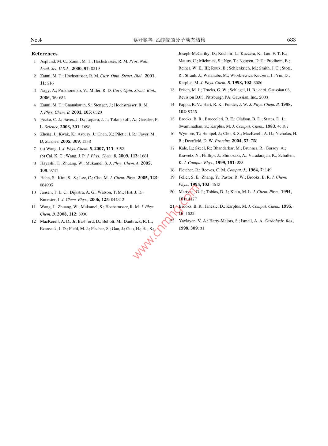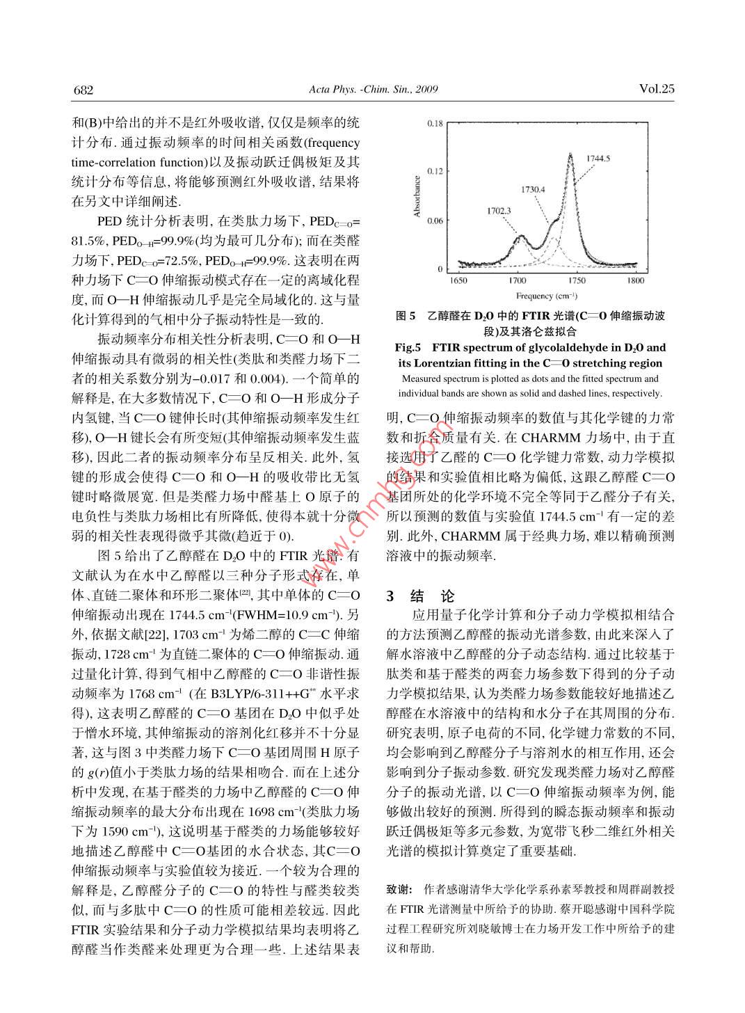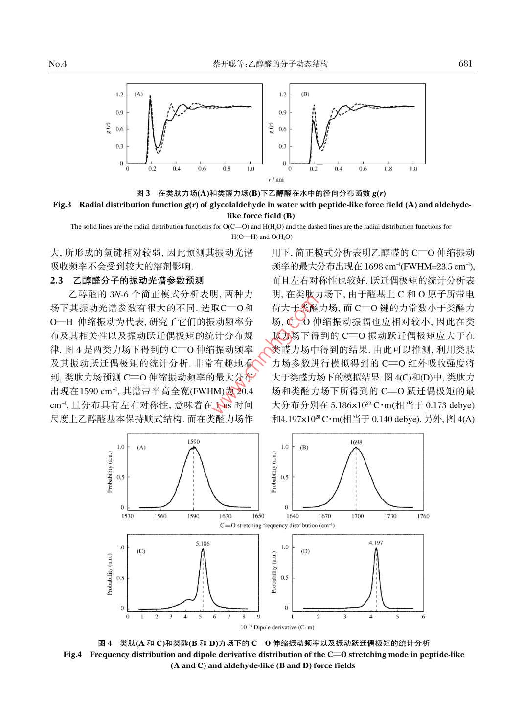 物理化學學報(Wuli Huaxue Xuebao) April Acta Phys.-him.sin.,2009,25(4):677-683677 [Article] www.whxb.pku.edu.cn乙醇醛的分子動態(tài)結構蔡開聰王建平(中國科學院化學研究所,北京分子科學國家實驗室分子反應動力學國家重點實驗室,北京100190摘要:以量子化學計算作為起點,為最簡單的糖類分子——乙醇醛開發(fā)了兩套分子力學力場參數(shù):基于肽類的力場和基于醛類的力場分子動力學模擬結果表明,所開發(fā)的類醛力場參數(shù)能夠較好地描述乙醇醛分子在水中的結構以及水分子在其周圍的分布通過瞬時簡正模式分析,得到了3N-6個模式的瞬時振動頻率和振動躍遷偶極矩等振動光譜參數(shù)的統(tǒng)計分布及其相關性結合量子化學計算和分子動力學模擬對生物分子體系的多元振動光譜參數(shù)進行預測和評估,為從化學鍵水平出發(fā)模擬寬帶飛秒維紅外相關光譜提供了一個新方法關鍵詞:力場參數(shù);分子動力學模擬;紅外光譜中圖分類號:0641 Molecular Dynamical Structures of Glycolaldehyde CAI Kai-Cong WANG Jian-Ping (Beijing National Laboratory for Molecular Sciences, State Key Laboratory for Molecular Reaction Dynamics, Institute of Chemistry, Chinese Academy of Sciences, Beijing 100190, P. R. China) Abstract: From quantum chemical computations, mechanics force fields based on peptides and aldehydes were developed for the simplest sug hyde. Molecular dynamics simulations demonstrated that the structure of glycolaldehyde and the can be better described by aldehyde-like parameters. Probabilities of normal mode ere obtained by instantaneous normal mode analysis. This is thus a new way to predict broadband two-dimensional infrared spectroscopy for biomolecules by combining quantum mechanics calculation and molecular dynamics simulation. Key Words: Force field parameter; Molecular dynamics simulation; IR spectroscopy眾所周知,傳統(tǒng)的傅立葉變換紅外光譜(FTIR)蹤研究體系的動態(tài)結構與動力學過程的一種前沿光與其它光譜學手段一起常常被用于生物分子的結構譜學方法,被喻為是新興的“結構生物學手段”23其研究這是由于分子的振動頻率和振動吸收線型通初期研究集中在凝聚相低聚肽體系的結構和動力常對分子所處的微環(huán)境極為敏感.近年來發(fā)展起來的學方面,最近已經逐漸擴展到其它分子體系而飛秒二維紅外(femtosecond twodimensional- infrared,糖類分子體系的二維紅外光譜及其多元非諧性振2DIR)光譜,既能利用非諧振子的耦合來表征基動光譜參數(shù)研究直至最近才開始多糖分子以其結團之間的結構信息,又能進一步從二維振動線型來構復雜多樣而著稱,其溶液結構檢測鑒定一直是結表征體系多重振動態(tài)的相關性能量轉移以及振動構生物學界的一個難題.如何有效地利用振動光譜弛豫等最基本的和最重要的超快動力學參數(shù),因而手段來研究糖類分子的溶液結構,是本文所要探討迅速成為在化學基團水平上以飛秒時間分辨率來跟的問題. Received: October 8, 2008; Revised: December 4, 2008; Published on Web: December 26, 2008 'Corresponding author. Email: jwang @iccas. ac.cn; Tel: +8610-62656806; Fax: +8610-62563167國家自然科學基金面上項目20773136)、國家高技術研究發(fā)展計劃(863)(200A02Z139)和中國科學院“百人計劃”資助 Editorial office of Acta Physico-Chimica Sinica678 Acta Phys.-Chim. Sin., 2009Vo1.25隨著二維紅外光譜實驗研究的逐步深入,從理 OHI論上模擬計算分子的二維紅外光譜正在成為一個研究熱點-0同時,由于二維紅外光譜包含了豐富的分子動態(tài)結構信息,認識光譜與結構的關系,需要了解多種振動參數(shù)的光譜特征其中最為關鍵的參數(shù)之一是非諧振子的零級振動頻率,即分子在不A受到光激發(fā)時的基團振動之基頻頻率.動態(tài)分子的圖1乙醇醛分子結構及其在 CHARMM力場下的零級頻率的計算化學預測一直是個難題,它涉及到原子類型如何從理論上描述一個動態(tài)分子的包括溶劑在內的Fig.1 Molecular structure of glycolaldehyde and the微環(huán)境.最近有人提出了靜電場及其梯度場模型 atom types in CHARMM force field用來預測肽鏈的酰胺-I帶(主要是C0伸縮振動)在文獻中從未有過報道.我們進行了乙醇醛的的液相振動頻率.這一途徑雖然復雜且具有局限 CHARMM力場參數(shù)開發(fā)研究的嘗試,在現(xiàn)有的化性,卻被證明是有效的因為靜電作用在許多溶劑學鍵長、鍵角以及范德華等參數(shù)基礎上獲得了類肽中都占主導但是,有關其它生物分子的多振動模和類醛的兩套力場參數(shù).在經典分子動力學模擬式的動態(tài)零級頻率的研究目前還未見報道中,勢能函數(shù)是一系列包括鍵長、鍵角、二面角等鍵在本文中以最小的糖類分子乙醇醛(圖1)為例合作用項,以及 Lennard-Jones-(LJ)6-12作用和靜電應用量子化學和分子動力學模擬相結合的方法對相互作用等非鍵合項的能量之和5其振動光譜參數(shù)進行了預測.首先以量化計算為起點開發(fā)了兩套分子力學力場參數(shù):類肽力場和類醛V(R)=k(b-b2+s2+-)2+ bond力場隨后用這兩套略有不同的力場參數(shù)分別進行了分子動力學模擬,并對乙醇醛的瞬態(tài)結構、與溶劑 K.1+cos(-8)+ KP-+ impropers的結構關系、振動頻率和振動躍遷偶極矩等光譜參數(shù)的統(tǒng)計分布及其相關性等進行了分析最后將乙+2醇醛的C=O伸縮振動的最可幾頻率及線寬等與式中,K、Ku、Ko、K和K分別為鍵長、Urey- Bradley實驗值進行了分析比較本文提出的這一結合量子勢、鍵