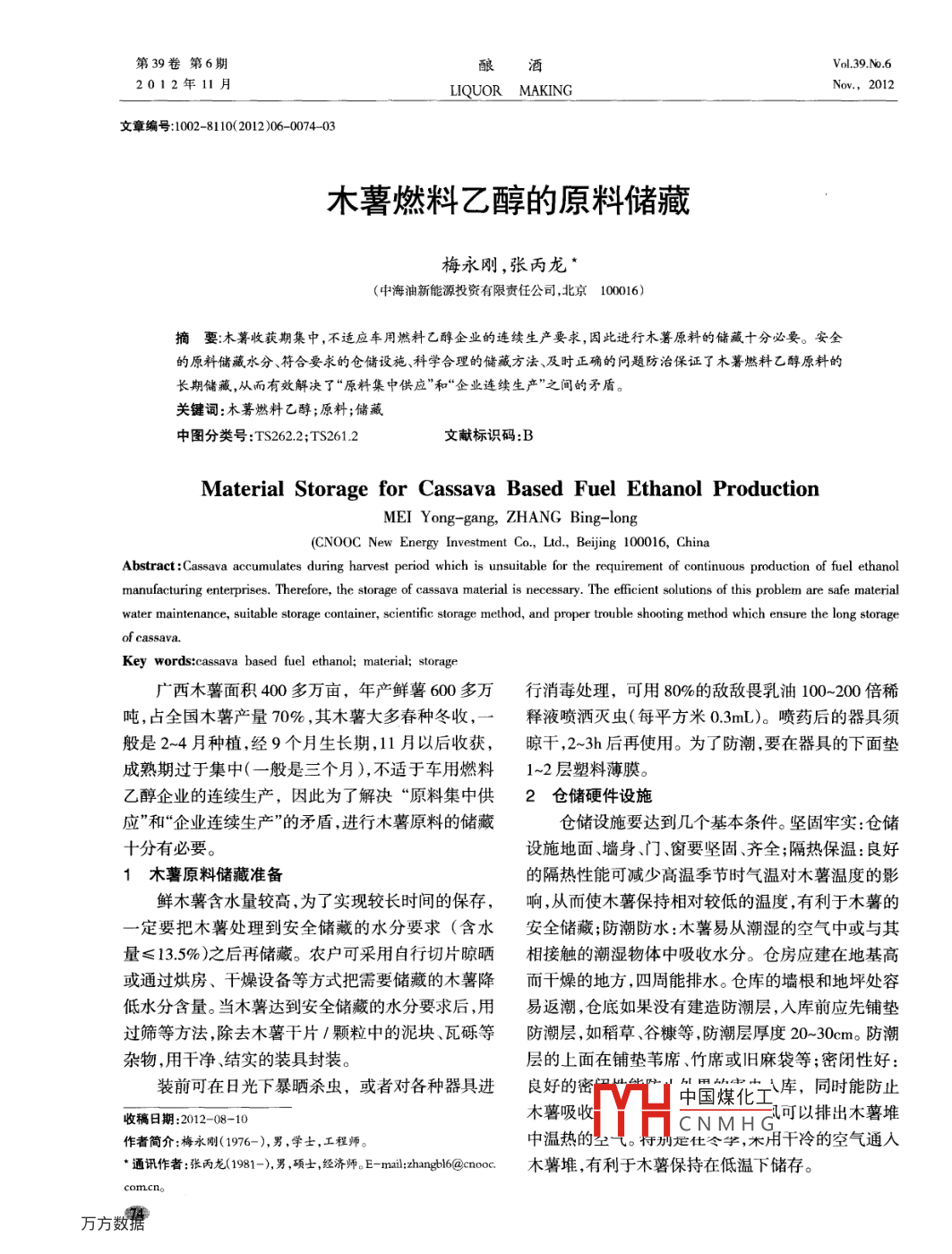 第39卷第6期釀酒Vol.39.№.62012年11月LIQUOR MAKINov.,2012文章編號:1002-8110(2012)06-007403木薯燃料乙醇的原料儲藏梅永剛,張丙龍(中海油新能源投資有限責(zé)任公司,北京100016)摘要:木薯收獲期集中,不適應(yīng)車用燃料醇企業(yè)的連續(xù)生產(chǎn)要求,因此進(jìn)行木薯原料的儲藏十分必要。安全的原料儲藏水分、符合要求的倉儲設(shè)施、科學(xué)合理的儲藏方法、及時正確的問題防治保證了木薯燃料乙醇原料長期儲藏,從而有效解決了“原料集中供應(yīng)”和“企業(yè)連續(xù)生產(chǎn)”之間的矛盾。關(guān)鍵詞:木薯燃料乙醇;原料;儲藏中圖分類號:TS2622;TS2612文獻(xiàn)標(biāo)識碼:BMaterial Storage for Cassava Based Fuel Ethanol ProductionMEI Yong-gang, ZHANG Bing-long(CNOOC New Energy Investment Co, Ltd, Beijing 100016, ChinaAbstract: Cassava accumulates during harvest period which is unsuitable for the requirement of continuous production of fuel ethanolmanufacturing enterprises. Therefore, the storage of cassava material is necessary. The efficient solutions of this problem are safe materialwater maintenance, suitable storage container, scientific storage method, and proper trouble shooting method which ensure the long storageof cassavaKey words: cassava based fuel ethanol; material; storage廣西木薯面積400多萬畝,年產(chǎn)鮮薯600多萬行消毒處理,可用80%的敵敵畏乳油100~200倍稀噸,占全國木薯產(chǎn)量70%,其木薯大多春種冬收,一釋液噴灑滅蟲(每平方米0.3mL)。噴藥后的器具須般是2-4月種植,經(jīng)9個月生長期,11月以后收獲,晾干,2~3h后再使用。為了防潮,要在器具的下面墊成熟期過于集中(一般是三個月),不適于車用燃料1~2層塑料薄膜。乙醇企業(yè)的連續(xù)生產(chǎn),因此為了解決“原料集中供2倉儲硬件設(shè)施應(yīng)”和“企業(yè)連續(xù)生產(chǎn)”的矛盾,進(jìn)行木薯原料的儲藏倉儲設(shè)施要達(dá)到幾個基本條件。堅固牢實:倉儲十分有必要。設(shè)施地面、墻身、門、窗要堅固、齊全;隔熱保溫:良好木薯原料儲藏準(zhǔn)備的隔熱性能可減少高溫季節(jié)時氣溫對木薯溫度的影鮮木薯含水量較高,為了實現(xiàn)較長時間的保存,響,從而使木薯保持相對較低的溫度,有利于木薯的定要把木薯處理到安全儲藏的水分要求(含水安全儲藏;防潮防水:木薯易從潮濕的空氣中或與其量≤13.5%)之后再儲藏。農(nóng)戶可采用自行切片晾曬相接觸的潮濕物體中吸收水分。倉房應(yīng)建在地基高或通過烘房、干燥設(shè)備等方式把需要儲藏的木薯降而干燥的地方,四周能排水。倉庫的墻根和地坪處容低水分含量。當(dāng)木薯達(dá)到安全儲藏的水分要求后,用易返潮,倉底如果沒有建造防潮層,入庫前應(yīng)先鋪墊過篩等方法,除去木薯干片/顆粒中的泥塊、瓦礫等防潮層,如稻草、谷糠等,防潮層厚度20-30cm。防潮雜物,用干凈、結(jié)實的裝具封裝層的上面在鋪墊葦席、竹席或舊麻袋等;密閉性好裝前可在日光下暴曬殺蟲,或者對各種器具進(jìn)良好的密中國煤化庫,同時能防止收稿日期:2012-08-10木薯吸LCNMHG可以排出木薯堆作者簡介;梅永剛(1976-),男,學(xué)士,工程師中溫?zé)岬?。力定仕令?米用干冷的空氣通入通訊作者張丙龍(1981-),男碩士,經(jīng)濟(jì)師。E-mil: zhangbl6@cnooc.木薯堆,有利于木薯保持在低溫下儲存。萬方數(shù)搪第六期梅永剛,等:木薯燃料乙醇的原料儲藏20123木薯儲藏方法凈、無異味以提高捕殺效果;藥物滅殺一般要采用安31木薯的保管特點(diǎn)全、高效的慢性滅鼠藥,要按規(guī)定用量投放毒餌,且木薯的儲藏具有明顯的特性:容易吸收水分,霉要投到安全隱蔽的地方,次日檢查,吃多少補(bǔ)多少變、發(fā)熱。因此,木薯保管的原則是“干燥、低溫、密吃光加倍,連續(xù)檢查,投放期至少應(yīng)在2周以上,滅閉”。按照這個原則保管,能夠?qū)崿F(xiàn)長期安全儲藏。木鼠期間要照顧好幼兒,同時管好禽畜,數(shù)天后將鼠藥薯切片或粉碎后,沒有密實表皮保護(hù),對外界溫度、全部收回,集中處理,并組織人員收集和掩埋鼠尸濕度的變化和蟲霉的危害基本沒有防御功能,所以發(fā)現(xiàn)有人中毒應(yīng)立即送往醫(yī)院救治。非常難保管,特別是長期儲藏。木薯收獲時,正值低42發(fā)熱霉變的防治措施溫干燥季節(jié),但光照不足,干燥較慢,且收獲季節(jié)后,木薯處于濕度高于80%和溫度高于25℃的高馬上進(jìn)入高溫多雨季節(jié),人庫水分較難保證,易引起溫高濕環(huán)境下,在長期儲藏過程容易發(fā)生發(fā)霉,甚至霉變、發(fā)熱。腐爛,造成損失,影響木薯儲藏效果,不利于進(jìn)行長3.2木薯儲藏方法期儲藏,但可進(jìn)行短期儲藏或臨時儲藏;木薯處于濕利用倉庫進(jìn)行木薯儲藏,為了達(dá)到儲藏期長低度高于80%和溫度低于25℃的高濕低溫環(huán)境下,在成本、儲藏效果好的目的,需要降低倉庫內(nèi)空氣濕長期儲藏過程容易生發(fā)霉,儲藏期比高溫高濕環(huán)境度,降低木薯水分含量,降低倉庫和木薯堆內(nèi)的溫下儲藏期長,因此,不利于進(jìn)行長期儲藏,但可進(jìn)行度,減少木薯與空氣的接觸面積。中短期儲藏;木薯處于濕度低于80%和溫度高于或32.Ⅰ保證人庫木薯質(zhì)量:水分大、雜質(zhì)多的木薯,容低于25℃的低溫低濕或高溫低濕環(huán)境下,在長期儲易發(fā)熱霉變,而不耐久藏。因此,提高人庫木薯質(zhì)量,藏過程中不易發(fā)霉,適宜進(jìn)行
