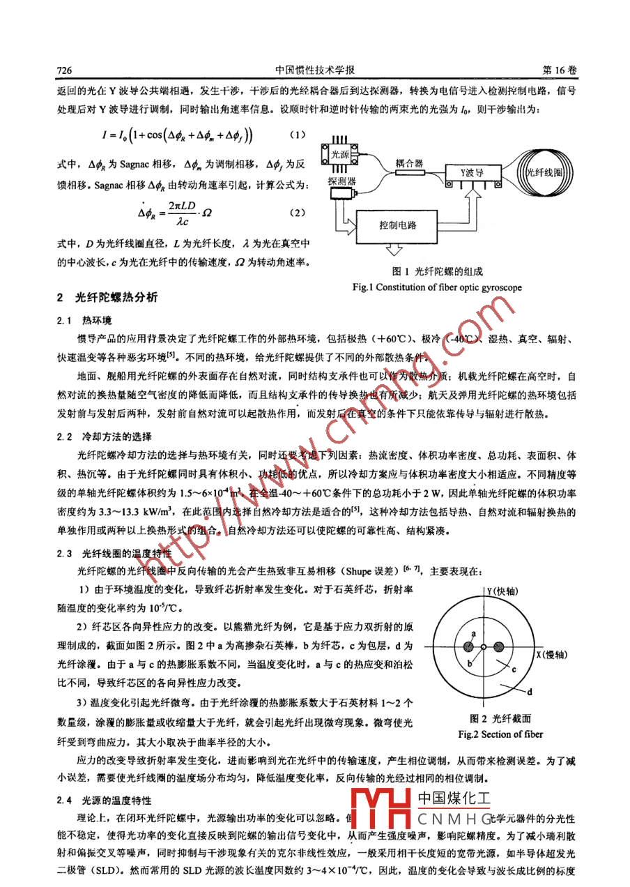 第16卷第6期中國慣性技術(shù)學(xué)報Vol 16 No 62008年12月Journal of Chinese Inertial Technology文章編號:1005-6734(2008)06-072505光纖陀螺的熱分析與熱設(shè)計方法賈明,晁代宏,張春熹(北京航空航天大學(xué)儀器科學(xué)與光電工程學(xué)院,北京100083摘要:光纖陀螺隨溫度變化產(chǎn)生的熱噪聲及熱致非互易性相移誤差直接影響其使用精度。為解決溫度問題,分析了光纖陀蝶工作的熱環(huán)境,根據(jù)光纖陀螺的體積功率密度選擇了自然冷卻方法,包括導(dǎo)熱、自然對流和輻射換熱的單獨作用或組合。通過分析光纖線圈及其他光電器件的溫度特性及溫度變化產(chǎn)生誤差的機理,指出熱設(shè)計的目的是控制光纖陀螺內(nèi)部的溫度場分布及最髙溫度,并對光纖陀螺的熱設(shè)計方法進(jìn)行研究,包括光纖線圈的熱設(shè)計、光電器件的安裝方式、控制電路的熱設(shè)計等,由最后熱仿真與測試結(jié)果可知,熱設(shè)計方法合理可行,關(guān)鑣詞:光纖;光纖陀螺;熱分析;熱設(shè)計中圖分類號:U6661文獻(xiàn)標(biāo)志碼:AThermal analysis and design for fiber optic gyroscopeJIA Ming, CHAO Dai-hong, ZHANG Chun-xi(School of Instrument Science and Opto-electronics Engineering, Beijing University of Aeronautics andAstronautics, Beijing, 100083, China)Abstract: Thermal noise and thermally induced nonreciprocity error of fiber optic gyro could directly affect itsapplication performance. In order to solve this problem, the gyro's thermal environment during working and the itsvolumetric power density were analyzed. Then the methods of natural cooling were selected, which include thermalconduction, natural convection and radiation recuperation. By analyzing the thermal characteristic of fiber ring andphotoconducting device, it is pointed out that the thermal design can achieve rational temperature field and maintainall the components of gyro within their respective temperature limits. Finally, the thermal design methods werepresented, including fiber ring design, mounting way and circuit scheme. The simulation and test results show that thethermal design methods are feasibleKey words: fiber; fiber optic gyroscope; thermal analysis; thermal design光纖陀螺是一種用來檢測載體運動角速度的傳感器,利用光學(xué)上的薩格奈克效應(yīng)與光纖傳輸原理,克服了機電陀螺與激光陀螺的一系列缺點,被廣泛應(yīng)用于航天、航空、航海、石油勘探等領(lǐng)域{光纖陀螺作為光機電一體化的傳感器,溫度對性能的影響是不可忽視的4首先,作為敏感元件的光纖線圈,在溫度變化時會產(chǎn)生熱致“非互易性”相移,導(dǎo)致陀螺輸出誤差;其次,傳感器的不同結(jié)構(gòu)也會隨著溫度的變化發(fā)生變形,進(jìn)而擠壓到光纖線圈,從而產(chǎn)生誤差;另外,任何具有電阻的光電器件都是一個內(nèi)部熱源,當(dāng)傳感器工作時,器件本身溫度會有所上升,從而影響到器件的性能與工作可靠性,同時這種溫度變化還會影響到傳感器其它部分的溫度。因此,對光纖陀螺進(jìn)行必要的熱分析與熱設(shè)計是保證光纖陀螺具有良好熱穩(wěn)定性的關(guān)鍵光纖陀螺組成目前光纖陀螺普遍采用干涉式閉環(huán)方案,單軸陀螺的結(jié)構(gòu)組成如圖信號由光源出發(fā),經(jīng)耦合器一分為二束傳輸?shù)結(jié)波導(dǎo),另一束傳到空端.Y波導(dǎo)將其輸入光分成順時H中國煤化工千線圈。從光纖線圈收稿日期:2008-09-22;修回日期:2008-11-25CNMHG基金項目:國家863高技術(shù)研究發(fā)展計劃項目(2007AA06Z101);航空科學(xué)基金(2007ZC5106作者簡介:賈明(1978—),男,講師,研究方向為光纖陀螺技術(shù)。E-mail:jiaming@buaaedu.cn中因慣性技術(shù)學(xué)報第16卷返回的光在Y波導(dǎo)公共端桕遇,發(fā)生干涉,干涉后的光經(jīng)耦合器后到達(dá)探測器,轉(zhuǎn)換為電信號進(jìn)入檢測控制電路,信號處理后對Y波導(dǎo)進(jìn)行調(diào)制,同時輸出角速率信息。設(shè)順時針和逆時針傳輸?shù)膬墒獾墓鈴姙閘,則干涉輸出為:=(+cos(△頭+△+△4)(1)式中,△中為 Sagnac相移,△中為調(diào)制相移,4為反耦合器導(dǎo)纖線圈饋相移, Sagnac相移△由轉(zhuǎn)動角速率引起,計算公式為:測器(2)控制電路式中,D為光纖線圈直徑,L為光纖長度,A為光在真空中的中心波長,c為光在光纖中的傳輸速度,為轉(zhuǎn)動角速率。圖1光纖陀螺的組成ig. I Constitution of fiber optic gyroscope光纖陀螺熱分析2.1熱環(huán)境慣導(dǎo)產(chǎn)品的應(yīng)用背景決定了光纖陀螺工作的外部熱環(huán)境,包括極熱(+60℃)、極冷(-40℃)、濕熱、真空、輻射快速溫變等各種惡劣環(huán)境。不同的熱環(huán)境,給光纖陀螺提供了不同的外部散熱條件地面、艦船用光纖陀螺的外表面存在自然對流,同時結(jié)構(gòu)支承件也可以作為散熱介質(zhì);機載光纖陀螺在高空時,自然對流的換熱量隨空氣密度的降低而降低,而且結(jié)構(gòu)支承件的傳導(dǎo)換熱也有所減少;航天及彈用光纖陀螺的熱環(huán)境包括發(fā)射前與發(fā)射后兩種,發(fā)射前自然對流可以起散熱作用,而發(fā)射后在真空的條件下只能依靠傳導(dǎo)與輻射進(jìn)行散熱。22冷卻方法的選擇光纖陀蝶冷卻方法的選擇與熱環(huán)境有關(guān),同時還要考慮下列因素:熱流密度、體積功率密度、總功耗、表面積、體積、熱沉等。由于光纖陀螺同時具有體積小、功耗低的優(yōu)點,所以冷卻方案應(yīng)與體積功率密度大小相適應(yīng)。不同精