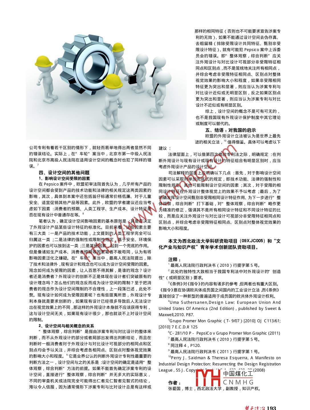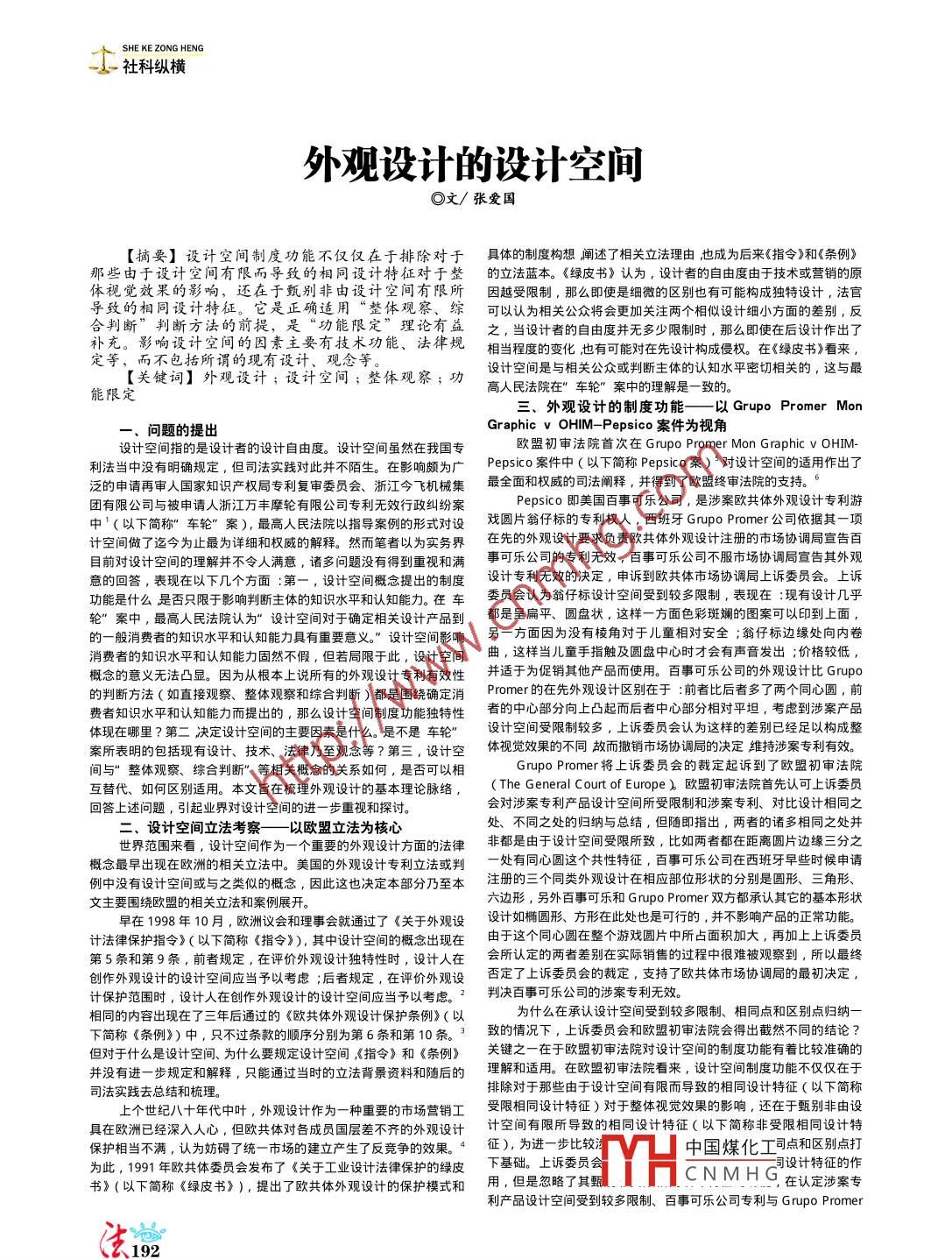 SHE KE ZONG HENG。社科縱橫外觀設(shè)計的設(shè)計空間◎文/張愛國[摘要]設(shè)計空間制度功能不僅僅在于排除對于具體的制度構(gòu)想 闡述了相關(guān)立法理由也成為后來《指令》和《條例》那些由于設(shè)計空間有限而導(dǎo)致的相同設(shè)計特征對于整的立法藍(lán)本。 《綠皮書》認(rèn)為,設(shè)計者的自由度由于技術(shù)或營銷的原體視覺效果的影響,還在于甄別非由設(shè)計空間有限所因越受限制 ,那么即使是細(xì)微的區(qū)別也有可能構(gòu)成獨(dú)特設(shè)計,法官導(dǎo)致的相同設(shè)計特征。它是正確適用“整體觀察、綜可以認(rèn)為相關(guān)公眾將 會更加關(guān)注兩個相似設(shè)計細(xì)小方面的差別,反合判斷”,判斷方法的前提,是“功能限定”理論有益之, 當(dāng)設(shè)計者的自由度并無多少限制時,那么即使在后設(shè)計作出了補(bǔ)充。影響設(shè)計空間的因素主要有技術(shù)功能、法律規(guī)相當(dāng)程度的變化也有可能對在先設(shè)計構(gòu)成侵權(quán)。在《綠皮書》看來,定等,而不包括所謂的現(xiàn)有設(shè)計、觀念等。[關(guān)鍵詞]外觀設(shè)計;設(shè)計空間;整體觀察;功設(shè)計空間是與相關(guān)公眾或判斷主體的認(rèn)知水平密切相關(guān)的,這與最高人民法院在”車輪”案中的理解是一致的。能限定三、 外觀設(shè)計的制度功能一以 Grupo Promer Mon問題的提出Graphic v OHIM-Pepsico 案件為視角設(shè)計空間指的是設(shè)計者的設(shè)計自由度。設(shè)計空間雖然在我國專歐盟初審法院首次在GrupoPromerMonGraphicvOHIM-利法當(dāng)中沒有明確規(guī)定,但司法實踐對此并不陌生。在影響頗為廣Pepsico 案件中(以下簡稱Pepsico案)。對設(shè)計空間的適用作出了泛的申請再審人國家知識產(chǎn)權(quán)局專利復(fù)審委員會、浙江今飛機(jī)械集最全面和權(quán)威的司法闡釋 ,并得到了歐盟終審法院的支持。團(tuán)有限公司與被申請人浙江萬豐摩輪有限公司專利無效行政糾紛案Pepsico即美國百事可樂公司,是涉案歐共體外觀設(shè)計專利游中'(以下簡稱”車輪"案),最高人民法院以指導(dǎo)案例的形式對設(shè)戲圓片 翁仔標(biāo)的專利權(quán)人,西班牙Grupo Promer公司依據(jù)其一項計空間做了迄今為止最為詳細(xì)和權(quán)威的解釋。然而筆者以為實務(wù)界在先的外觀設(shè)計 要求負(fù)責(zé)歐共體外觀設(shè)計注冊的市場協(xié)調(diào)局宣告百目前對設(shè)計空間的理解并不令人滿意,諸多問題沒有得到重視和滿事可樂公司的專利無效,百事可樂公司不服市場協(xié)調(diào)局宣告其外觀意的回答,表現(xiàn)在以下幾個方面:第- ,設(shè)計空間概念提出的制度設(shè)計專利無效的決定,申訴到歐共體市場協(xié)調(diào)局上訴委員會。上訴功能是什么是否只限于影響判斷主體的知識水平和認(rèn)知能力。在車委員會認(rèn)為翁仔標(biāo)設(shè)計空間受到較多限制,表現(xiàn)在:現(xiàn)有設(shè)計幾乎輪”案中,最高人民法院認(rèn)為"設(shè)計空間對于確定相關(guān)設(shè)計產(chǎn)品到都是呈扁平、 圓盤狀, 這樣- -方面色彩斑斕的圖案可以印到上面,的一般消費(fèi)者的知識水平和認(rèn)知能力具有重要意義?!痹O(shè)計空間影響另一方面因為沒有棱角對于兒童相對安全;翁仔標(biāo)邊緣處向內(nèi)卷消費(fèi)者的知識水平和認(rèn)知能力固然不假,但若局限于此,設(shè)計空間曲 ,這樣當(dāng)兒童手指觸及圓盤中心時才會有聲音發(fā)出;價格較低,概念的意義無法凸顯。因為從根本上說所有的外觀設(shè)計專利有效性并適于為促銷其他產(chǎn)品而使用。百事可樂公司的外觀設(shè)計比Grupo的判斷方法(如直接觀察、整體觀察和綜合判斷)都是圍繞確定消Promer 的在先外觀設(shè)計區(qū)別在于:前者比后者多了兩個同心圓.前費(fèi)者知識水平和認(rèn)知能力而提出的,那么設(shè)計空間制度功能獨(dú)特性者的中心部分向 上凸起而后者中心部分相對平坦,考慮到涉案產(chǎn)品體現(xiàn)在哪里?第二決定設(shè)計空間的主要因素是什么。是不是車輪”設(shè)計 空間受限制較多,上訴委員會認(rèn)為這樣的差別已經(jīng)足以構(gòu)成整案所表明的包括現(xiàn)有設(shè)計、技術(shù)、 法律乃至觀念等?第三,設(shè)計空體視覺效果的不同故而撤銷市場協(xié)調(diào)局的決定維持涉案專利有效。間與”整體觀察、綜合判斷”等相關(guān)概念的關(guān)系如何,是否可以相GrupoPromer將上訴委員會的裁定起訴到了歐盟初審法院互替代、如何區(qū)別適用。本文旨在梳理外觀設(shè)計的基本理論脈絡(luò),(The General cCourt of Europe ).歐盟初審法院首先認(rèn)可上訴委員回答上述問題,引起業(yè)界對設(shè)計空間的進(jìn)-步重視和探討。會對涉案專利產(chǎn)品設(shè)計空間所受限制和涉案專利、對比設(shè)計相同之二、設(shè)計空間立法考察一以歐盟 立法為核心處、不同之處的歸納與總結(jié),但隨即指出,兩者的諸多相同之處并世界范圍來看,設(shè)計空間作為一個重要的外觀設(shè)計方面的法律非都是由于設(shè)計空間受限所致,比如兩者都在距離圓片邊緣三分之概念最早出現(xiàn)在歐洲的相關(guān)立法中。美國的外觀設(shè)計專利立法或判- -處有同心圓這個共性特征, 百事可樂公司在