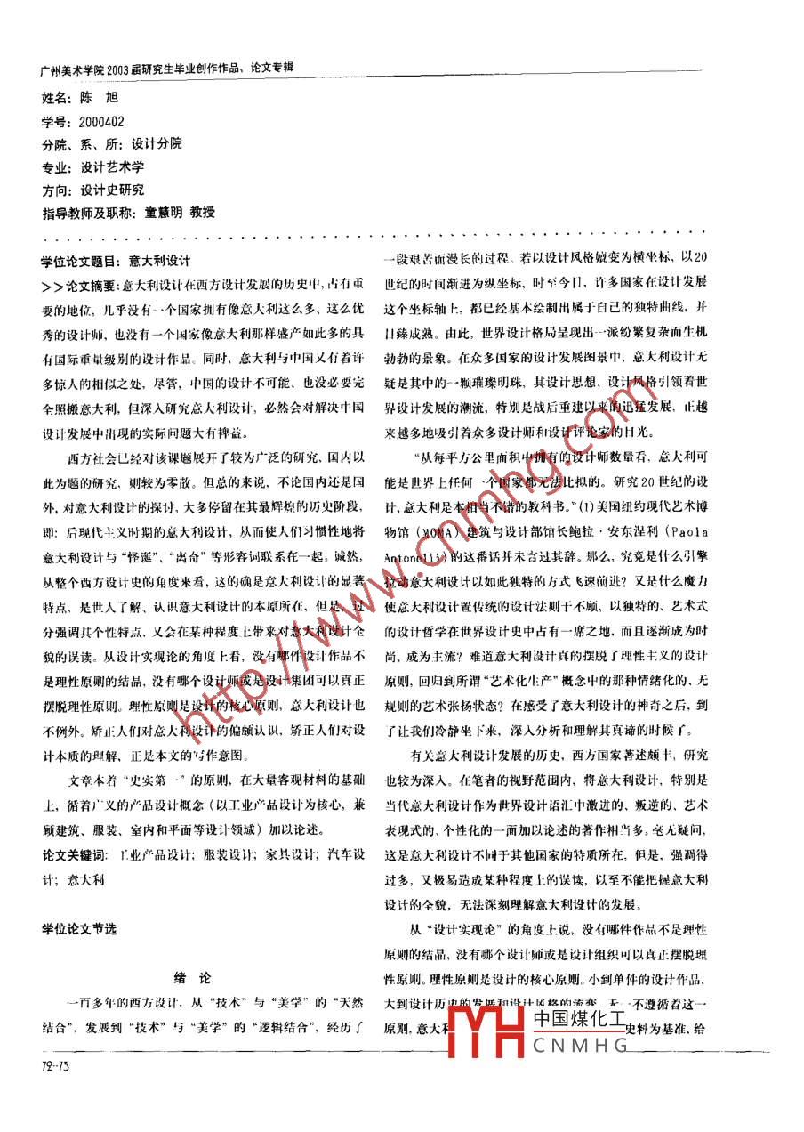 廣州美術(shù)學(xué)院2003屆研究生畢業(yè)創(chuàng)作作品、論文專輯姓名:陳旭學(xué)號(hào): 2000402分院、系所:設(shè)計(jì)分院專業(yè):設(shè)計(jì)藝術(shù)學(xué)方向:設(shè)計(jì)史研究指導(dǎo)教師及職稱:童慧明教授學(xué)位論文題目:意大利設(shè)計(jì)-段艱苦而沒長(zhǎng)的過程。若以設(shè)計(jì)風(fēng)格概變?yōu)闄M坐標(biāo),以20>>論文摘要:息大利設(shè)計(jì)在西方設(shè)計(jì)發(fā)展的歷史電古有雨世紀(jì)的時(shí)間漸進(jìn) 為縱坐標(biāo),時(shí)今日,許多國(guó)家任設(shè)計(jì)發(fā)展要的地你,幾乎沒有一.個(gè)國(guó)家擁有像意大利這么多、這么優(yōu)這個(gè)坐 標(biāo)軸卜,都已經(jīng)基本繪制出屬于自己的獨(dú)特曲線,#秀的設(shè)計(jì)師,也沒有一個(gè)國(guó)家像意大利那樣盛產(chǎn)如此多的具|I臻成熟。 由此,世界設(shè)計(jì)格局呈現(xiàn)出--派紛繁復(fù)雜而生機(jī)有國(guó)際重歇級(jí)別的設(shè)計(jì)作品。同時(shí),意大利與中國(guó)義有者許勃勃的景象。 仨眾多國(guó)家的設(shè)計(jì)發(fā)展圖景中,意大利設(shè)計(jì)無多驚人的相似之處,盡管,中國(guó)的設(shè)計(jì)不可能、也沒必嬰完疑是 其中的一-顆璀璨明珠,其設(shè)計(jì)思想、設(shè)計(jì)風(fēng)格引領(lǐng)著世全照搬意大利,但深入研究意大利設(shè)計(jì),必然會(huì)對(duì)解決中國(guó)界 設(shè)計(jì)發(fā)展的潮流,特別是戰(zhàn)后重建以來的迅猛發(fā)展,正越設(shè)計(jì)發(fā)展中出現(xiàn)的實(shí)際問題大有神益。來越多地吸引著眾多設(shè)計(jì)師和設(shè)計(jì)評(píng)論家的目光。西方社會(huì)已經(jīng)對(duì)該課題展開了較為廣泛的研究,國(guó)內(nèi)以“從每平方公里面積中擁有的設(shè)計(jì)師數(shù)量看,總大利可此為題的研究,則較為零散。但總的來說,不論國(guó)內(nèi)還是國(guó)能 是世界上任何.個(gè)國(guó)家 都無法比擬的。研究20世紀(jì)的設(shè)外,對(duì)意大利設(shè)計(jì)的探討,大多停留在其最輝燦的歷火階段,計(jì),意大利足本相當(dāng)不錯(cuò)的教科書。”(1)美國(guó)組約現(xiàn)代出術(shù)博即:后現(xiàn)代主義時(shí)期的總大利設(shè)計(jì),從而使人們習(xí)慣性地將物館(MOMA)建筑與設(shè)計(jì)部館長(zhǎng)鮑拉.安東涅利(Paola意大利設(shè)計(jì)與“怪誕”、“離奇”等形容詞聯(lián)系在一.起。 誠(chéng)然,Antonolli) 的這番話并末古過其辭。那么,究竟是什么引繁從整個(gè)西方設(shè)it史的角度來看,這的確是意人利設(shè)計(jì)的顯著拉動(dòng)意 大利設(shè)計(jì)以如此獨(dú)特的方式飛速前進(jìn)?又是什么魔力特點(diǎn),是世入了解、認(rèn)識(shí)意大利設(shè)計(jì)的本原所在,但是,過使 愿大利設(shè)計(jì)置傳統(tǒng)的設(shè)計(jì)法則于不顧,以獨(dú)特的、藝術(shù)式分強(qiáng)調(diào)其個(gè)性特點(diǎn),義會(huì)在某種程度上帶來對(duì)意大利設(shè)計(jì)倉的設(shè)計(jì)哲學(xué) 在世界設(shè)i計(jì)史中占有一席之地,而且逐漸成為時(shí)貌的誤讀。從設(shè)計(jì)實(shí)現(xiàn)論的角度上:看,沒有哪件設(shè)計(jì)作品不尚, 成為主流?難道意大利設(shè)計(jì)真的擺脫了理性義的設(shè)計(jì)是理性原則的結(jié)晶,沒有哪個(gè)設(shè)計(jì)師或是設(shè)i集團(tuán)可以真正原則, 回歸到所謂“藝術(shù)化生產(chǎn)"概念中的那種情緒化的、無擺脫理性原則。理性原則是設(shè)計(jì)的核心原則,總大利設(shè)計(jì)也規(guī) 則的藝術(shù)張揚(yáng)狀態(tài)?在感受了意大利設(shè)計(jì)的神奇之后,到不例外。矯正人們對(duì)意大利設(shè)計(jì)的偏頗認(rèn)識(shí),矯正人們對(duì)設(shè)了 讓我們冷靜坐下來,深人分析和理解其真諦的時(shí)候了。計(jì)本質(zhì)的理解,正是本文的寫作意圖。有關(guān)意大利設(shè)計(jì)發(fā)展的歷史,西萬國(guó)家著述頗書,研究文章本著“史實(shí)第.” 的原則、在大量客觀材料的基礎(chǔ)也較為深入。 在筆者的視野范圍內(nèi),將意大利設(shè)計(jì),特別是上,循著廣義的產(chǎn)品設(shè)計(jì)概念(以工業(yè)產(chǎn)品設(shè)計(jì)為核心,兼當(dāng)代怠 大利設(shè)計(jì)作為世界設(shè)計(jì)語匯中激進(jìn)的、叛逆的、藝術(shù)顧建筑、服裝、室內(nèi)和平面等設(shè)計(jì)領(lǐng)域)加以論述。表現(xiàn)式的、個(gè)性化的一- 面加以論述的著作相當(dāng)多。老尤疑問,論文關(guān)鍵詞: I.業(yè)產(chǎn)品設(shè)計(jì); 服裝設(shè)計(jì);家具設(shè)計(jì);汽車設(shè)這 是意大利設(shè)計(jì)不同于其他國(guó)家的特質(zhì)所在,但是,強(qiáng)調(diào)得計(jì);意大利過多,又極易造成某種程度上的誤讀,以至不能把握意大利設(shè)計(jì)的會(huì)貌,無法深刻理解意大利設(shè)計(jì)的發(fā)展。學(xué)位論文節(jié)選從“設(shè)計(jì)實(shí)現(xiàn)論”的角度上說,沒有哪件作品不足理性原則的結(jié)晶,沒有哪個(gè)設(shè)計(jì)師或是設(shè)計(jì)組織可以真正擺脫理緒論性原則。理性原則是設(shè)計(jì)的核心原則。小到單件的設(shè)計(jì)作品,-百多年的西方設(shè)計(jì),從“技術(shù)”與“美學(xué)”的“天然大到設(shè)計(jì)歷中的發(fā)戚和設(shè):+風(fēng)格的漳