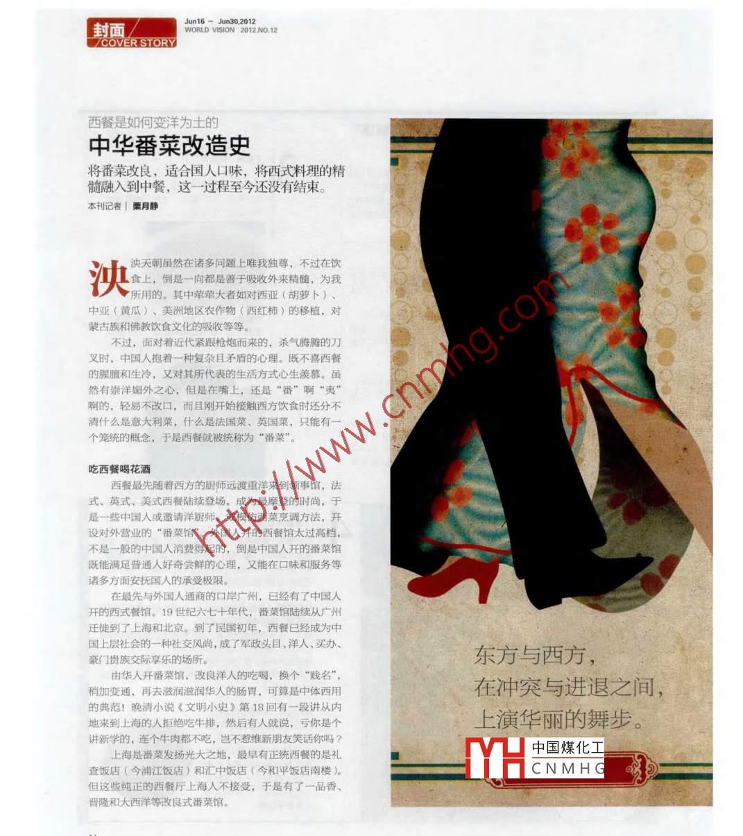 Jun16-Jun302012面WORLD VISION 2012 NO 12VER STORY西餐是如何變洋為土的中華番菜改造史將番菜改良,適合國人口味,將西式料理的精髓融入到中餐,這一過程至今還沒有結束本刊記者|粟月靜泱泱天朝雖然在諸多問題上唯我獨尊,不過在飲食上,倒是一向都是善于吸收外來精髓,為我所用的。其中葷葷大者如對西亞(胡蘿卜)、中亞(黃瓜)、美洲地區(qū)農作物(西紅柿)的移植,對蒙古族和佛教飲食文化的吸收等等。不過,面對著近代緊跟槍炮而來的,殺氣騰騰的刀叉時,中國人抱著一種復雜且矛盾的心理。既不喜西餐的腥膻和生冷,又對其所代表的生活方式心生羨慕。雖然有崇洋媚外之心,但是在嘴上,還是“番”啊“夷”啊的,輕易不改口,而且剛開始接觸西方飲食時還分不清什么是意大利菜,什么是法國菜、英國菜,只能有個籠統(tǒng)的概念,于是西餐就被統(tǒng)稱為“番菜"。吃西餐喝花酒西餐最先隨著西方的廚師遠渡重洋來到領事館,法式、英式、美式西餐陸續(xù)登場,成為最摩登的時尚,于是一些中國人或邀請洋廚師,或模仿西菜烹調方法,開設對外營業(yè)的“番菜館”。外國人開的西餐館太過高檔不是一般的中國人消費得起的,倒是中國人開的番菜館既能滿足普通人好奇嘗鮮的心理,又能在口味和服務等諸多方面安撫國人的承受極限。在最先與外國人通商的口岸廣州,已經有了中國人開的西式餐館。19世紀六七十年代,番菜館陸續(xù)從廣州遷徙到了上海和北京。到了民國初年,西餐已經成為中國」上層社會的一種社交風尚,成了軍政頭目、洋人、買辦、豪門貴族交際享樂的場所。東方與西方,由華人開番菜館,改良洋人的吃喝,換個“賤名”,稍加變通,再去滋潤滋潤華人的腸胃,可算是中體西用在沖突與進退之間,的典范!晚清小說《文明小史》第18回有一段講從內地來到上海的人拒絕吃牛排,然后有人就說,虧你是個上演華麗的舞步。講新學的,連個牛肉都不吃,豈不惹維新朋友笑話你嗎?上海是番菜發(fā)揚光大之地,最早有正統(tǒng)西餐的是禮查飯店(今浦江飯店)和匯中飯店(今和平飯店南樓)H中國煤化工CNMHG但這些純正的西餐廳上海人不接受,于是有了一品香晉隆和大西洋等改良式番菜館O菜爭推一品香,西洋風味睹先嘗,刀叉耀眼盆盤潔,我愛香檳酒一觴?!敝袊碎_的番菜館自然有特色,比如說一品香的特色是煙花樓,一般妓女不能進西菜館,但這里都是吃花酒的。關于吃花酒的番菜館,曾樸在《孽?;ā防镉薪榻B第二十二回寫光緒年間有個叫魚伯陽的山東土財主與人在東交民巷吃西餐,書中寫到,東交民巷番菜館……本是很正當的旅館。但是,后來有幾個酒醉的外國人,偶然看中了鄰近小家女子,起了狎侮之心;館內無知仆歐,媚外凌趣,設計招徠:從此賣酒之家,變?yōu)椴鼗ㄖ畨]了……進此館,只要化京錢十二吊交給仆歐,頃刻間纏頭錢去,賣笑人來,比妓館娼樓還要靈便,就不能指揭姓名、揀擇妍丑罷了。除了能吃花酒,中國人開的這些番菜館還西餐中做中餐西做,中西合璧,烹飪適合中國人口味的西餐,如“鐵扒牛肉”、“華洋里脊”、“西法大蝦”、“西洋鴨肝”等菜均是中菜西做,西菜中做的佳品。民國小說《海上繁華夢》里說到上海番菜館里的菜式有:鮑魚雞絲湯、炸板魚、法式豬排,蝦仁湯、花雀火腿蛋、芥辣雞飯、元蛤湯、腌鱖魚、鐵排雞、香蕉夾餅、腓利牛排、紅煨山雞、蝦仁粉餃。點心有西米布丁,還有香擯和啤酒佐餐。如此看來,番菜在做法和吃法上與正規(guī)西餐相差不多,但所用原料則為“中西合璧”。像鮑魚和鱖魚,都難入“正宗”西餐菜單,卻是中國人餐桌上的寵物。鱖魚又叫魚季花魚,為中國特產,因此國外也稱其為“中華魚”。因肉厚刺少味鮮,鱖魚很早便被中國人視為美味。因此將其引入番菜,以西法治之,自然也會受到國人歡經過上海人改良的還有羅宋湯。羅宋湯在上海曾經用大桶裝了在弄堂口供應,非常大眾。但和俄羅斯的紅菜湯已經完全不同,偏酸甜。正宗的羅宋湯模樣味道實在不大一樣,俄羅斯人是用甜菜根和牛肉湯為底湯,在此基礎上也可加入卷心菜、番茄、土豆或西芹,才算是真正羅宋湯。上海沒有紅菜,羅宋湯的主角就變成了番開的番菜館既能滿足普通人好奇嘗鮮的心理,又能在口味和服務等諸多方國人的承受極限茄、卷心菜和洋山芋,海派羅宋湯的另外一大改造是加《清稗類鈔》中說:“我國之設肆售西餐者,始于上假西餐與新番菜海福州路之一品香,其價每人大餐一元,坐茶七角,小正宗西中國煤化工在于價格。食五角。外加堂彩、煙酒之費。當時人鮮過問,其后漸秦瘦鷗老人有趨之者,于是有海天春、一家春、江南春、萬丈春CNMHG式餐廳沙利文里“這種MYH米列寫一楊,一魚(或吉祥春等繼起,且分堂設坐焉?!蔽r),一主菜,還有一小杯咖啡和一道甜點。面包是由一海昌太憨生在《淞濱竹枝詞》中為一品香做廣告:“番個孩子背著一只藤制的盤送到餐桌前的,客人可以盡量取封面WORLD VISION 2012. NO 12/COVER STORY食,不取分文。”聽上去并不算貴,但是1926年到1936年孫中山先生在《建國方略》中自豪地說,我上海一枚銀元可以買16斤大米或四五斤豬肉中國近代文明進化,事事皆落人之后,惟飲到了解放后,各地西餐廳紛紛歇業(yè)或是改制、合并食一道之進步,至今尚為文明各國所不及西餐行業(yè)開始凋零。那時候中國與蘇聯(lián)為首的東歐國家交往密切,