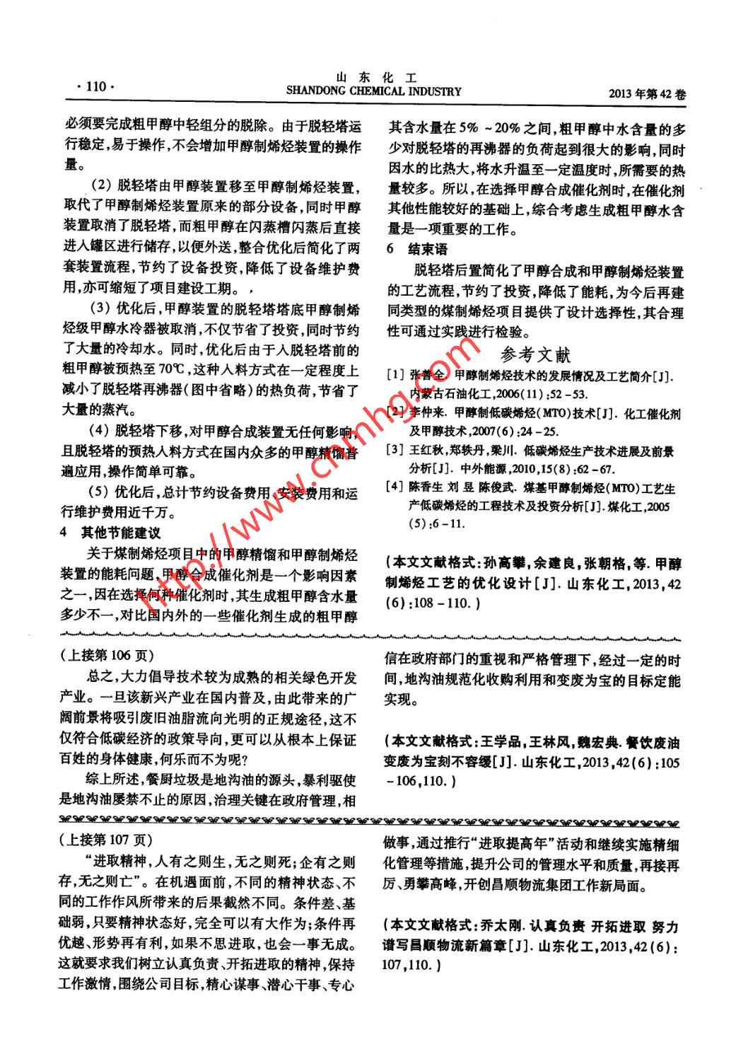 山東化工●108●SHANDONG CHEMICAL INDUSTRY2013年第42卷化工設(shè)計1111l11甲醇制烯烴工藝的優(yōu)化設(shè)計孫高攀,余建良,張朝格,趙玉勇,賈瑞寶(中國神華煤制油化工有限公司包頭煤化工分公司,內(nèi)蒙古包頭014010)摘要:從煤制烯烴廠各裝置間的結(jié)合點出發(fā),對甲醇合成裝和甲醇制烯烴裝置的工藝流程進(jìn)行整合優(yōu)化,達(dá)到了項目節(jié)約投資、運(yùn)行節(jié)能降耗的目的,并降低了項目運(yùn)行的復(fù)雜性。關(guān)鍵詞:甲醇合成;甲醇制烯烴;脫輕塔經(jīng)濟(jì)中國分類號:T0649.4*2文獻(xiàn)標(biāo)識碼:A文章編號:1008 -021X(2013)06 -0108 -03The Optimization Design of the Technology of MTOSUN Gao - pan, YU Jian - liang , ZHANG Chao- ge,ZHAO Yu - yong ,JIA Rui - bao( Baotou Coal Chemical Industry Branch of Shenhua Coal LiquefactionChemical Industry Ltd. ,Co.,Baotou 014010 ,China)Abstract:This article from the coal to olefin plant of the device with the point of view, on methanolsynthesis device and MTO device process integration and optimization, the project investment saving,operation energy consumption, and reduces the complexity of the project operation.Key words: methanol synthesis; MTO ;stabilising column; economic為了進(jìn)一步提高煤制烯烴項目的運(yùn)行經(jīng)濟(jì)性,1甲醇合成與甲醇制烯烴工藝入料工藝流程簡介優(yōu)化煤質(zhì)烯烴工藝流程已成為國內(nèi)眾多煤制烯烴企傳統(tǒng)的生產(chǎn)甲醇制烯烴級甲醇的合成裝置流程業(yè)提高自身競爭力的重要手段。在煤制烯烴項目大致為:凈化合成氣從上游低溫甲醇洗裝置供給,新中,國內(nèi)外設(shè)計生產(chǎn)的甲醇合成裝置和甲醇制烯烴鮮合成氣先經(jīng)過壓縮機(jī)入口分離器與循環(huán)氣- -起經(jīng)裝置均為獨立的裝置,而且由不同的設(shè)計院來完成,過加壓換熱后進(jìn)人合成塔進(jìn)行反應(yīng),反應(yīng)氣經(jīng)過換由于甲醇制烯烴工藝參照FCC開發(fā),其多以石油化熱降溫后經(jīng)過空冷或水冷器冷卻至40C左右進(jìn)入工特點為設(shè)計基礎(chǔ),并在整體設(shè)計時對下游裝置考粗甲醇分離器,氣相與新鮮合成氣匯合后進(jìn)行循環(huán)慮相對較多,同上游裝置的緊密性表現(xiàn)不是很突出。反應(yīng),液相則進(jìn)人低壓閃蒸槽(0.6MPaG、40C) ,利為此,針對煤制烯烴項目的甲醇裝置和甲醇制烯烴用低壓閃蒸槽的壓力將粗甲醇壓人脫輕塔,在脫輕裝置特點,尋找裝置特點中的交叉點進(jìn)行工藝整合塔塔頂溫度控制在86C ,塔底溫度控制在93C ,脫優(yōu)化,進(jìn)-步降低煤制烯烴項目的投資費用和運(yùn)行輕塔主要是除去粗甲醇中的輕組分,生產(chǎn)甲醇制烯維護(hù)費用,是提高煤制烯烴企業(yè)競爭力的一個重要烴級甲醇,塔底甲醇制烯烴級甲醇升壓后冷卻至手段,本文針對煤制烯烴中的甲醇合成和甲醇制烯40C送人成品罐區(qū),然后利用罐區(qū)泵將甲醇制烯烴烴裝置工藝流程進(jìn)行了整合優(yōu)化,以期進(jìn)- -步提高級甲醇利用泵升壓后供給甲醇制烯烴裝置,如圖1煤制烯烴運(yùn)行的經(jīng)濟(jì)性。左半部分。收稿日期:2013-03-21作者簡介:孫高攀(1985- ),男 ,安徽蕭縣人,大學(xué)本科,現(xiàn)主要從事甲醇生產(chǎn)和技術(shù)管理工作。.第6期孫高攀,等:甲醇制烯烴工藝的優(yōu)化設(shè)計. 109.反應(yīng)氣自三旋中間換熱器甲等-蒸汽換熱器p上甲醇-反應(yīng)氣換熱器甲醇至反應(yīng)器新鮮氣分離器循環(huán)氣壓縮機(jī)-,-日甲醇-凝結(jié)水換熱器二。粗甲醇分離器甲惠-汽提氣換熱器L水冷去燃料氣管網(wǎng)?8甲醇升壓泵內(nèi)取熱頭燃料《管網(wǎng)中甲醇-凝結(jié)水換熱器|粗甲A甲醇-凈化水換熱器|醉閃|塔TO甲醇產(chǎn)品顢LN JewT0甲醇外送泵圖1優(yōu)化前的甲醇合成-甲醇制烯烴裝置流程簡圖目前國內(nèi)運(yùn)行的甲醇制烯烴裝置人料甲醇預(yù)熱性,針對國內(nèi)煤制烯烴運(yùn)行項目做如下整合優(yōu)化:如工藝流程:甲醇成品罐區(qū)供給的甲醇制烯烴級甲醇圖 2,將甲醇裝置的脫輕塔下移至甲醇制烯烴裝置(40° 1. 15MPaG)進(jìn)人甲醇制烯烴裝置界區(qū),先分的甲醇人料預(yù)熱部分,以取代甲醇制烯烴裝置的甲成兩路:一路經(jīng)過反應(yīng)器內(nèi)取熱后與另- -路匯合,經(jīng).醇-凝結(jié)水換熱器(兩臺)、升壓泵(兩臺)和甲醇-過甲醇-凈化水換熱器(兩臺)換熱至約70C ,再經(jīng)汽提氣換熱器三部分設(shè)備。整合優(yōu)化后的流程為:甲醇-凝結(jié)水換熱器(兩臺)換熱后分成三路:一路甲醇裝置生產(chǎn)的粗甲醇經(jīng)過粗甲醇閃蒸罐閃蒸后,經(jīng)過升壓泵(兩臺)升壓,一路經(jīng)過甲醇-汽提氣換利用閃蒸罐的壓力直接將粗甲醇壓人粗甲醇儲罐,熱器,- -路經(jīng)過甲醇-蒸汽換熱器,三路匯合后溫度利用粗甲醇泵將甲醇升壓送至甲醇制烯烴裝置,先約為100C再經(jīng)過甲醇-反應(yīng)氣換熱器(兩臺)至經(jīng)過反應(yīng)器 的內(nèi)取熱和甲醇-凈化水預(yù)熱器預(yù)熱至250C左右進(jìn)人反應(yīng)器進(jìn)行反應(yīng),反應(yīng)器人口溫度可約70C ,送人脫輕塔,經(jīng)過脫輕塔將粗甲醇中的輕以通過甲醇-凝結(jié)水換熱器(二)進(jìn)行微調(diào),如圖1組分雜質(zhì)徹底脫除后,將93C合格甲醇制烯烴級甲右半部分。醇加壓后直接送入甲醇-蒸汽換熱器中,再經(jīng)甲醇2優(yōu)化后的甲醇合成和甲醇制烯烴裝置工藝-反應(yīng)氣換熱器升
