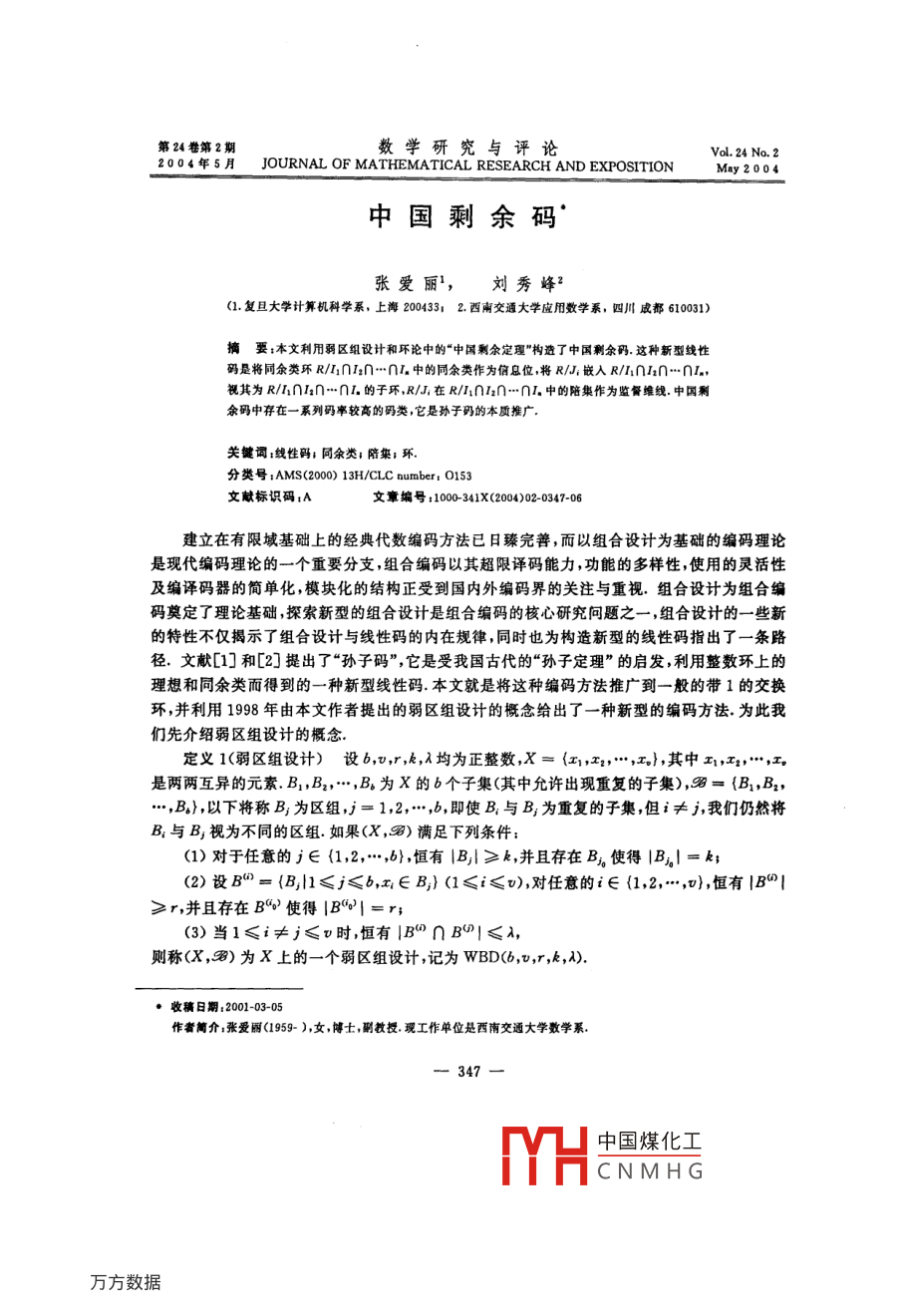第24卷第2期數(shù)學(xué)研究與評(píng)論VoL 24 No. 22004F5 JOURNAL OF MATHEMATICAL RESEARCH AND EXPOSITION May 200中國剩余碼張愛麗劉秀峰1.復(fù)旦大學(xué)計(jì)算機(jī)科學(xué)系,上海20043312.西南交通大學(xué)應(yīng)用數(shù)學(xué)系,四川成都610031)搞要:本文利用弱區(qū)組設(shè)計(jì)和環(huán)論中的“中國剩余定理”杓造了中國剩余碼這種新型線性碼是將同余類環(huán)R/I∩I2∩…∩,中的同余類作為信息位,將R/J嵌入R/n∩2n…∩L,視其為R/n∩nan…∩L的子環(huán),R/J在R/1∩n2∩…∩中的陪集作為監(jiān)督維線中國剩余碼中存在一系列碼率較高的碼類,它是孫子碼的本質(zhì)推廣關(guān)鍵詞:線性碼;同余類;陪集;環(huán)分類號(hào):AMS(200013H/ CLC Dumber o153文獻(xiàn)標(biāo)識(shí)碼:A文章編號(hào):1000341X(2004)020347-06建立在有限域基礎(chǔ)上的經(jīng)典代數(shù)編碼方法已日臻完善,而以組合設(shè)計(jì)為基礎(chǔ)的編碼理論是現(xiàn)代編碼理論的一個(gè)重要分支,組合編碼以其超限譯碼能力,功能的多樣性,使用的靈活性及編譯碼器的簡單化,模塊化的結(jié)構(gòu)正受到國內(nèi)外編碼界的關(guān)注與重視.組合設(shè)計(jì)為組合編碼奠定了理論基礎(chǔ),探索新型的組合設(shè)計(jì)是組合編碼的核心研究問題之一,組合設(shè)計(jì)的一些新的特性不僅揭示了組合設(shè)計(jì)與線性碼的內(nèi)在規(guī)律,同時(shí)也為構(gòu)造新型的線性碼指出了一條路徑,文獻(xiàn)[1]和[2]提出了“孫子碼”,它是受我國古代的“孫子定理”的啟發(fā),利用整數(shù)環(huán)上的理想和同余類而得到的一種新型線性碼本文就是將這種編碼方法推廣到一般的帶1的交換環(huán),并利用1998年由本文作者提出的弱區(qū)組設(shè)計(jì)的概念給出了一種新型的編碼方法為此我們先介紹弱區(qū)組設(shè)計(jì)的概念定義1(弱區(qū)組設(shè)計(jì))設(shè)b,,r,k,λ均為正整數(shù),X=(x1,x2,…,x},其中x1,x23,…,x是兩兩互異的元素B1,B2,…,B為X的b個(gè)子集(其中允許出現(xiàn)重復(fù)的子集),圖={B1,B2,…,B},以下將稱B為區(qū)組,j=1,2,…b,即使B與B為重復(fù)的子集但i≠j我們?nèi)匀粚4與B視為不同的區(qū)組如果(X,)滿足下列條件(1)對于任意的j∈1,2,…,b},恒有|B≥k,并且存在B4使得|B|=k(2)設(shè)B={B1≤j≤b,x∈B}(1≤i≤v),對任意的∈(1,2,…,v),恒有|B°≥r,并且存在B使得|B|=r;(3)當(dāng)1≤i≠j≤v時(shí),恒有|B∩B|≤λ,則稱(X,)為X上的一個(gè)弱區(qū)組設(shè)計(jì),記為WBD(b,v,r,k,A)·收稿日期:2001-03-05作者簡介:張愛麗(1959),女,博士,副教授,現(xiàn)工作單位是西南交通大學(xué)數(shù)學(xué)系347中國煤化工CNMHG由定義可以看出:弱區(qū)組設(shè)計(jì)(WBD)是平衡不完全區(qū)組設(shè)計(jì)(BIBD)和異元平衡區(qū)組設(shè)計(jì)(DBBD)的推廣,WBD不要求每個(gè)區(qū)組包含同樣多的元素,也不要求每個(gè)元素在區(qū)組中出現(xiàn)的次數(shù)相等或者每兩個(gè)區(qū)組的交集包含同樣多的元素更重要的是,弱區(qū)組設(shè)計(jì)與線性碼在同構(gòu)意義下是一一對應(yīng)的任給一個(gè)弱區(qū)組設(shè)計(jì)WBD(b,U,,k,A),存在一個(gè)線性碼C[n,h,d]與之對應(yīng)其中nh,d分別表示碼長維數(shù)與極小碼距并且諸參數(shù)滿足:n=b+v,h=v,[/4+1≤d≤r+1,[表示不小于/A的最小整數(shù)反之任給定一個(gè)線性碼C[n,h,d],則存在一個(gè)弱區(qū)組設(shè)計(jì)WBD(b,v,r,k,),使得該弱區(qū)組設(shè)計(jì)對應(yīng)的線性碼C1=C1[b+v,,d]與C同構(gòu)設(shè)WBD(b,v,r,k,)表示一個(gè)弱區(qū)組設(shè)計(jì),A=(a1)b是它的關(guān)聯(lián)矩陣,即∫1,如果x∈B,0,如果x;∈B,其中X={x1,x2,…,x}表示W(wǎng)BD的頂點(diǎn)集,={B1,B2,…,B}表示區(qū)組族令G表示下面的分塊矩陣G=(,A),其中表示v階單位矩陣,則以G為生成矩陣的線性碼就是WBD對應(yīng)的線性碼C[n,h,d]即以WBD的頂點(diǎn)為信息位以區(qū)組為監(jiān)督維線,同時(shí)以關(guān)聯(lián)矩陣為監(jiān)督關(guān)系的線性碼就是C[nh,d]引理設(shè)R是帶1的交換環(huán),I1,I2,…,是R的s個(gè)兩兩互素的理想,并且R/為有限環(huán),|R/I,|=m;,=1,2,…,5,J1=I:∩I3∩…∩I,J2=l1∩I3∩…∩r,J=l1∩l2∩…∩l-1(1)|R/1∩n2n…∩H=Ⅱm;(2)|R/,|=(mm2…m,)/m,證明(1)因?yàn)閘1,I2,…,是環(huán)R中兩兩互素的理想,由“中國剩余定理,則有環(huán)的自然同構(gòu)R/l1n2∩…∩L,R/1R/I2…④R/,a(mod∩)→(a(modl1),a(modl2),…,a(modl2)按假設(shè)|R/I,=m,1≤i≤s,對于任意的a∈R/l1∩I2∩…∩I,a能夠一意地表示為因此,R/1∩I2∩…∩I,=m1m2…m1(2)因?yàn)镽/J,=R/I1∩…∩I-1∩I+∩…∩L,再根據(jù)“中國剩余定理”,可以得到R/J≈R/1④…⊕R/I-1R/+1…R/I,348中國煤化工CNMHGa(modJ4)→(a(modI1),…,a(modI-1),a(modI,+1),…,a(mod)),所以有|R/J=m1…m-m+1…m,=(m1m2…m,)m定理1(1)設(shè)R是帶1的交換環(huán),l1,12,…,是R的5個(gè)兩兩互素的理想,并且R/I,為有限環(huán),1≤i≤5;I=l1nI2∩…∩I,J1=l2∩I3∩…∩I,r,∩I3∩…∩LJ=I∩I2∩…∩L(3)設(shè)|R/|=m1,1≤i≤5;(4)設(shè)R/J,中含有n個(gè)同余類,每一個(gè)同余類選取一個(gè)代表元素得到y(tǒng),y2…,y,用R/I·中的同余類作信息位,定義監(jiān)督維線B1=(∈R/I,=x+I,x≡y(modJ1)},1≤j≤nB2=(|∈R/,=x+I,x≡y(mod/2)},1≤j≤n2lB,={∈RH·,=x+I,xy(mod)},1≤j≤n按照上述信息位和監(jiān)督維線,可得到一個(gè)[n,h,d]線性碼,這里n,h,d分別表示碼長維數(shù)和極小