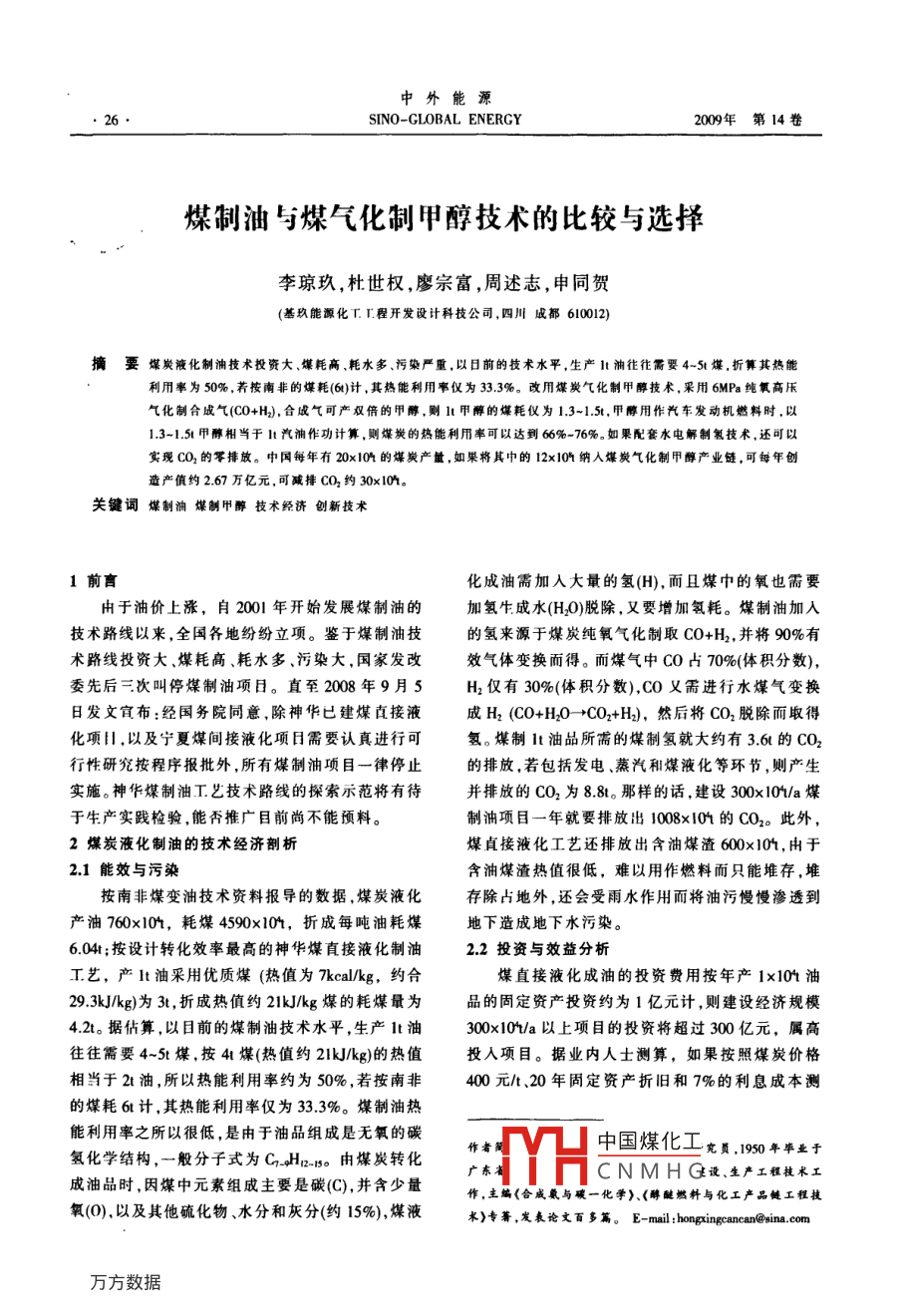 中外能源●26SINO-GLOBAL ENERGY2009年第14卷煤制油與煤氣化制甲醇技術(shù)的比較與選擇李瓊玖,杜世權(quán),廖宗富,周述志,申同賀(基玖能源化T. I.程開發(fā)設(shè)計(jì)科技公司,四川成都610012)摘要煤炭液化制油技術(shù)投資大、煤耗高.耗水多、污染嚴(yán)重,以日前的技術(shù)水平,生產(chǎn)It油往往需要4~51煤.折算其熱能利用率為50% ,蕎按南非的煤耗(6)計(jì),其熱能利用率儀為33.3%。改用煤炭氣化制甲醇技術(shù),采用6MPa純氧高厭氣化制合成氣(Co+H),合成氣可產(chǎn)奴倍的甲醇,則1t甲醇的煤耗儀為1.3-1.5t.甲醇用作汽車發(fā)動(dòng)機(jī)燃料時(shí),以1.3-1.51甲醇相當(dāng)于It汽油作功計(jì)算,則煤炭的熱能利用率可以達(dá)到66%-76%。如果配套水電解制氡技術(shù).還可以.實(shí)現(xiàn)CO2的零排放。中國每年有20x10%的煤炭產(chǎn)量,如果將其中的12x104納入煤炭氣化制甲醇產(chǎn)業(yè)鏈,可每年創(chuàng)造產(chǎn)值約2.67萬億元,可臧排CO2約30x104。關(guān)鍵詞煤制油煤制甲醇技術(shù)經(jīng)濟(jì)刨新技術(shù)1前育化成油需加人大鼂的氫(H),而且煤中的氧也需要由于油價(jià)上漲,自2001年開始發(fā)展煤制油的加氫生成水(H2O)脫除,又要增加氫耗。煤制油加入技術(shù)路線以來,全國各地紛紛立項(xiàng)。鑒于煤制油技的氫來源于煤炭純氧氣化制取CO+H2,并將90%有術(shù)路線投資大、煤耗高、耗水多,污染大,國家發(fā)改效氣體變換而得。而煤氣中CO占70%(體積分?jǐn)?shù)),委先后三次叫停煤制油項(xiàng)目。直至2008年9月5H2僅有30%(體積分?jǐn)?shù)),CO義需進(jìn)行水煤氣變換日發(fā)文宣布:經(jīng)國務(wù)院同意,除神華已建煤直接液成H2 (CO+H20- +CO2+H2), 然后將CO2脫除而取得化項(xiàng)|,以及寧夏煤間接液化項(xiàng)日需要認(rèn)真進(jìn)行可氫。煤制It油品所需的煤制氫就大約有3.6t的CO2行性研究按程序報(bào)批外,所有煤制油項(xiàng)目一律停止的排放,若包括發(fā)電.蒸汽和煤液化等環(huán)節(jié),則產(chǎn)生實(shí)施。神華煤制油工藝技術(shù)路線的探索示范將有待并排放的CO2為8.8t。那樣的話,建設(shè)300x10%/a煤于生產(chǎn)實(shí)踐檢驗(yàn),能否推廣目前尚不能預(yù)料。制油項(xiàng)目一年就要排放出1008x104 的CO2。此外,2煤炭液化制油的技術(shù)經(jīng)濟(jì)剖析煤貞接液化工藝還排放出含油煤渣600x101,由于2.1能效與污染含油煤渣熱值很低,難以用作燃料而只能堆存,堆按南非煤變油技術(shù)資料報(bào)導(dǎo)的數(shù)據(jù),煤炭液化存除占地外,還會(huì)受雨水作用而將油污慢慢滲透到產(chǎn)油760x104,耗煤4590x104,折成每噸油耗煤地下造成地下水污染。6.04t;按設(shè)計(jì)轉(zhuǎn)化效率最高的神華煤直接液化制油2.2投資與效益分析工藝,產(chǎn)1t油采用優(yōu)質(zhì)煤(熱值為7kcal/kg, 約合煤直接液化成油的投資費(fèi)用按年產(chǎn)1x104油29.3kJ/kg)為3t,折成熱值約21kJ/kg煤的耗煤最為品的固定資產(chǎn)投資約為1億元計(jì),則建設(shè)經(jīng)濟(jì)規(guī)模4.2t。據(jù)估算,以目前的煤制油技術(shù)水平,生產(chǎn)1t油300x10t/a以上項(xiàng)目的投資將超過300億元,屬高往往需要4~5t煤,按41煤(熱值約21kJ/kg)的熱值投入項(xiàng)目。據(jù)業(yè)內(nèi)人士測算,如果按照煤炭價(jià)格相當(dāng)于2t油,所以熱能利用率約為50%,若按南非400元/t、20年固定資產(chǎn)折舊和7%的利息成本測的煤耗6t計(jì),其熱能利用率僅為33.3%。煤制油熱能利用率之所以很低,是由于油品組成是無氧的碳作者簡中國煤化工員.1950年畢業(yè)于.氫化學(xué)結(jié)構(gòu),一般分子式為C.H2-15。由煤炭轉(zhuǎn)化廣東省:YHCN M H G設(shè)、生產(chǎn)工程技術(shù)工成油品時(shí),因煤中元素組成主要是碳(C),并含少量作,主編《合成氨與碳一化學(xué)).<醇醚燃料與化工產(chǎn)品鏈工程技氧(0),以及其他硫化物、水分和灰分(約15%),煤液*>專蕭,發(fā)表論文百多篇。E-mail :hongringcancan@sin .com第7期李瓊玖等。煤制油與煤氣化制甲醇技術(shù)的比較與選擇●27算,煤制油出廠成本對應(yīng)的油價(jià)大約為60美元/bbl;當(dāng)甲醇售價(jià)為2500~3000元/t時(shí),投資回收期為6~當(dāng)煤價(jià)為600元/時(shí),煤制油出廠成本將上升到747a(包括建設(shè)期)。美元/bbl。若國際原油價(jià)格維持在80美元/bbl,則煤4我國自主開發(fā)的支撐甲醇生產(chǎn)的創(chuàng)新技術(shù).制油盈利空間基本為零。所以國家發(fā)改委再度發(fā)出①焦?fàn)t氣、鋼鐵爐氣、煤層氣高溫(1400C)非通知指出,煤制油項(xiàng)目是人才、技術(shù)、資金密集型的催化轉(zhuǎn)化制甲醇用合成氣合成甲醇工藝,在壓力高投入、高耗能項(xiàng)目,投資風(fēng)險(xiǎn)大。目前無論是產(chǎn)品5MPa下轉(zhuǎn)化,實(shí)現(xiàn)等壓合成甲醇,不用合成氣壓縮方向、工藝路線.技術(shù)裝備,還是運(yùn)營管理、經(jīng)濟(jì)效機(jī)。該工藝可實(shí)現(xiàn)原料元素充分利用,回收廢棄物益等方面都存在許多不確定因素。煤制油是一項(xiàng)巨和免除環(huán)境污染。每噸甲醇耗焦?fàn)t氣1600m' (標(biāo)大的系統(tǒng)工程,涉及煤資源、水資源、生態(tài)、環(huán)境、技準(zhǔn))。按我國年產(chǎn)焦?fàn)t氣量681x104m'計(jì),可產(chǎn)甲醇術(shù)、資金以及諸多社會(huì)配套要求。只有通過神華的約0.43x104;如焦?fàn)t氣用于燃?