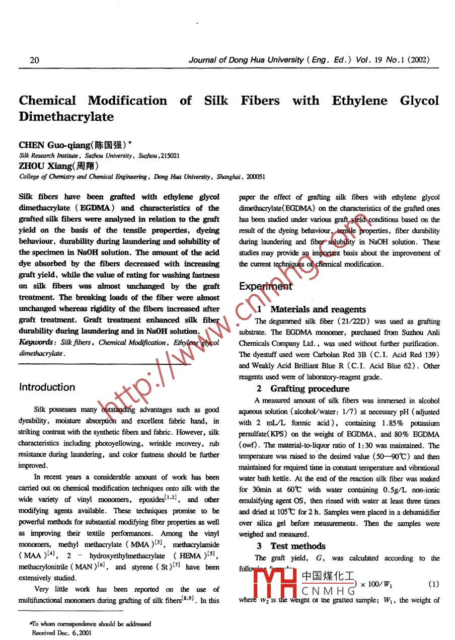 20Journal of Dong Hua University (Eng. Ed.) Vol. 19 No.1 (2002)Chemical Modification of Silk Fibers with Ethylene GlycolDimethacrylateCHEN Guo-qiang(陳國強) *Silk Research Instiue, Suzhou University, Suzhou ,215021ZHOU Xiang(周翔)College of Chemistry and Chenmical Eninering; Dong Hua Unvrsity, Shanghai , 200051Sillk fibers have been grafted with ethylene glycolpaper the effect of gafting sik fibers with ethylene glycoldimethacrylate ( EGDMA) and characteristics of thedimethacrylate(EGDMA) on the characteritics of the grafted onesgrafted silk fibers were analyzed in relation to the grafthas been studied under various graft yield conditions based on theyield on the basis of the tensile properties, dyeingresult of the dyeing behaviour, tensile properties, fiber durabilitybehaviour, durability during laundering and solubility ofduring laundering and fiber solubility in NaOH solution. Thesethe specimen in NaOH solution. The amount of the acidstudies may provide an important basis about the improvement ofdye absorbed by the fibers decreased with increasingthe current techniques of chemical mdifcation.graft yield, while the value of rating for washing fastnesson silk fibers was almost unchanged by the graftExperimenttreatment. The breaking loads of the fiber were almostunchanged whereas rigidity of the fibers increased afterlMaterials and reagentsgraft treatment. Graft treatnent enhanced silk fiberThe degummed silk fiber (21/22D) was used as gratingdurability during laundering and in Na0H solution.substrate. The EGDMA monomer, purchased from Suzhou AnliKeywords : Silk fibers, Chemical Modification, Ethylene glycolChemicals Company Ltd., was used without further purification.dimethacrylate.The dyestuff used were Carbolan Red 3B (C.1. Acid Red 139)and Weakly Acid Brliant Blue R (C.I. Acid Blue 62). Otherreagents used were of laboratory -reagent grade.Introduction2 Grafting procedureA measured amount of silk fibers was immersed in alcobolSilk pssesses many outstanding advantages such as goodaqucous solution (alcohol/water: 1/7) at necessary pH ( adjusteddyeability,moisture absorption and excellent fabric hand, inwith 2 mL/L formic acid), containing 1.85% potassiumnstriking contrast with the synthetic fbers and fabric. However, silkpersulfate(KPS) on the weight of BGDMA, and 80% EGDMAcharacteristics including photoyellowing, wrinkle recovery, rut(owf) . The materialto-liquor ratio of 1:30 was maintained. Thresistance during laundering, and color fatness should be furthertemperature was raised to the desired value (50- 90C) and thenimproved.maintained for required time in constant temperature and vibrationalIn recent years a considerable amountof work has beenwater bath kettle. At the end of the reaction silk fiber was soakedcarnied out on chemical modification techniques onto silk with theior 30min at 60C with water containing 0.5g/L non ionicwide variety of vinyl monomers, epoxides1.2], and otheemulsifying agent OS, then rinsed with water at least three timesmodifying agents available. These techniques promise to band dried at 105C for 2 h. Samples were placed in a dehumidiferpowerful methods for substantial modifying fiber properties as wellover silica gel before measurements. Then the samples wereIs improving their textile performances. Among the vinylweighed and measured.monomers, methyl methacrylate ( MMA )b3J,methacrylamide3 Test methods(MAA )4,2- hydroxyethylmethacrylate ( HEMA )[s],The graft yield, G, was calculated according to themethacrylonitrile ( MAN)l6],and styrene ( St)l7] have beenfolloextensively studied.中國煤化工x 100/w(1)Very litle work has been reported on the use ofTYHCNMHGmoulifunctional monomers during grafting of silk fibers(8,9]. In this where W2 1s the weignt of une grautea sample; Wi, the weight of#To whom crrespondence should be adressedReceived Dec. 6,2001Journal of Dong Hua University (Eng. Ed.) Vol. 19 No.1 (2002)21the original sample.polymer, which can be accomplished in many ways. The chemicalTensile tests of single silk flaments were made with a fiberinitiation technique inevitably needs initiators for this purpose. Thestrength tester (YG003) at 30C and 65% RH. The strain rateinitiators decompose on heating into free radicals that are capablewas 30 mm/ min and the gauge length was 25 mm. Machine strainof abstracting the H atom from the backbone polymer, creating sitewas within experimental eror. Breaking load and rigidity, whichfor the growth of a graft chain.are defined as the values of the tensile strength and initial modulusIn grafting systems like the one in this study, it is inevitablemultiplied by the cross-sectional area of the fiber werethat the homopolymer of the grafted monomer is formned in thedetermined 10.The values presented are the average of ten tests.graft polymerization medium. The common method for theDyeing was carried out at 9sC for 40 min and the dyebathremoval of the homopolymer from the fber is extraction of thewas adjusted to pH 4.5 using acetic acid (0.4mL/L), keeping ahomopolymer with an appropriate solvent. In the studiesmaterial-to-liquor ratio of 1:50. The initial dye concentration wasconcerming the grafting of vinyl monomers, the major solvents1% (owf). The dyed sample was taken out and rinsed well withused for the extraction of the homopolymer are acetene11.121] anddisilled water.benzene . 13.14) There was no decrease in the gaied sample weightThe colour measurement of the dyed samples was performedafter the sample was Soxhlet-extracted with acetone and benzeneunder Des iluminant at 10P observed through an Ultra Scan XErespectively for8 h. The increase in weight in the original samplespectophotometer. The reflectance values at maximum absorptionincluded two parts of graft polymer and homopolymer, but thewavelength were converted into K/S values.homopolymer may be very litle. It is believed that theThe fastness testing was caried out according to Chinesepolymerization reaction is mainly a grafting process. So, we tookNation