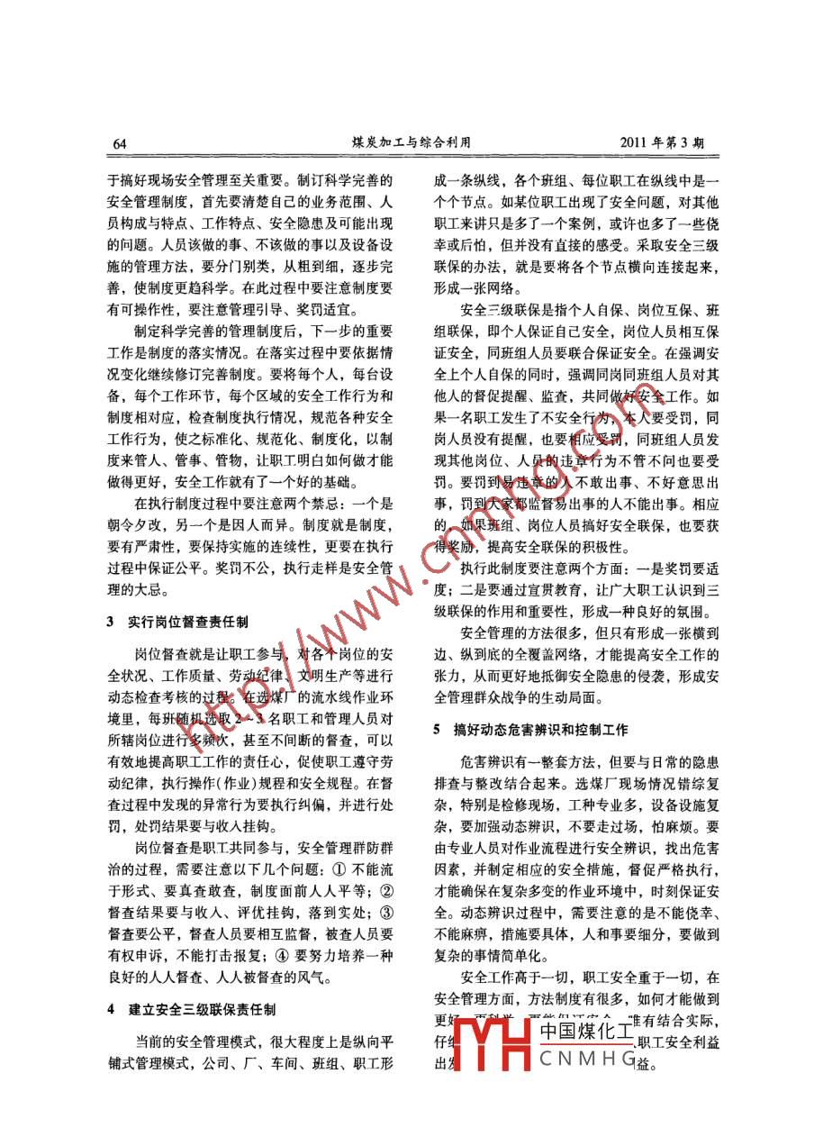 某炭加工與綜合利用No.3, 2011COAL PROCESSING & COMPREHENSIVE UTIUZATION63選煤現(xiàn)場的安全管理胡云繼,常江(中國平煤神馬有限責任公司物流貿易公司,河南平頂山467000)摘要:介紹了選煤現(xiàn)場安全管理的難點,從應用安全現(xiàn)狀分析法、完善安全管理制度、實行崗位督查責任制、建立安全三級聯(lián)保責任制、搞好動態(tài)危害辨識和控制工作等方面論述了如何搞好選煤現(xiàn)場安全管理工作。關鍵詞:選煤廠;安全管理;現(xiàn)狀分析;制度;責任制.中圖分類號: F407.21文獻標識碼: A文章編號: 1005-8397(2011 )03-0063-02選煤廠是現(xiàn)代化、機械化、自動化的工廠,安全的環(huán)境中作業(yè),或對問題司空見慣、得過且有著大量的機電設備和一定數(shù)量的操作維修人過等等,均是安全管理的大忌。員,工作現(xiàn)場復雜,交叉作業(yè)多,再加上人員素搞好選煤廠現(xiàn)場安全管理,要真抓真管、心系質高低不同,安全生產(chǎn)形勢復雜,安全工作的難職工。只有時刻牢記自己的安全責任,時刻惦記職度也很大。因此,搞好選煤廠現(xiàn)場安全管理具有工的安全,創(chuàng)造性地開展工作,強化現(xiàn)場安全管理,十分重要的意義。才能夠把安全工作抓好抓實,抓出成效。雖然選煤廠發(fā)生事故的可能性和嚴重程度比1安全 現(xiàn)狀分析法的應用井下低,但從全國選煤廠的安全情況來看,死亡、重傷事故也時有發(fā)生。例如平頂山的幾個大型選安全現(xiàn)狀分析法是一種對安全狀況的定量、煤廠均發(fā)生過- -次或數(shù)次死亡事故,重傷以下的定性分析方法,利用該法找準定位,查找不足,事故基本年年都會發(fā)生,可以說,安全系數(shù)、安明確目標和解決的方法,使安全管理處于清楚、全管理的難度不像想象中的容易,所以應該高度清醒的狀態(tài)。分析方法步驟如下:①選一個時重視選煤廠的安全管理,要從政策、人員、資金、間段,分門別類地分析此時間段的安全狀況,包領導等各方面抓好選煤廠的安全管理。括人員事故、設備事故、工藝事故等,并從操作抓好現(xiàn)場管理是選煤廠安全管理的關鍵,選人、機器、物料、工藝方法、環(huán)境等方面進行深煤現(xiàn)場安全管理的困難主要表現(xiàn)為以下幾點:①層次分析,據(jù)此評價當前的安全現(xiàn)狀,可分為操作人員思想上易滋生松懈麻痹情緒,認為地面良、中、差三個等級,分析各等級的評定原因;廠肯定不會出事;②操作人員技術水平參差②對查找出的問題制定相應的解決措施,要按不齊,冒險蠻干,違章指揮,違章作業(yè)現(xiàn)象多;指定責任人、時間、任務、標準的原則認真解③生產(chǎn)現(xiàn)場流水線作業(yè),機電設備多,檢修復決;③確定下一個時間段(或稱安全周期)的安雜,作業(yè)交叉、專業(yè)交叉,易產(chǎn)生安全隱患;④全目標以及達到目標的方法途徑,目標要科學,職T職業(yè)道德水平、勞動紀律執(zhí)行方面有差距,方法要合理、具體、不空泛;④在職工中進行睡崗、脫崗、串崗等均能造成重大安全隱患;⑤.宜貫,征求意見,取得理解和支持,共同搞好下領導安全管理不到位,方法不科學,制度不完一周期的安全工作,下一周期結束后再進行安全善,安全隱患得不到及時整改,使職工長期在不現(xiàn)狀分析,檢查安全工作進展情況,使現(xiàn)場安全管理滾動前進,不斷提升管理水平。收稿日期: 2011-02-21作者簡介:胡云繼(1969-),男,河南信陽人,1991 年畢業(yè)于中國礦業(yè)大學選礦工程專業(yè),工學學士,中國平煤神馬有限中國煤化工責任公司物流貿易公司工程師,電話: 0375 -2788355TYHCNMHG完善的制度對6煤炭加工與綜合利用2011年第3期于搞好現(xiàn)場安全管理至關重要。制訂科學完善的成一條縱線,各個班組、每位職工在縱線中是一安全管理制度,首先要清楚自己的業(yè)務范圍、人個個節(jié)點。如某位職工出現(xiàn)了安全問題,對其他員構成與特點、工作特點、安全隱患及可能出現(xiàn)職工來講只是多了一個案例,或許也多了一些僥的問題。人員該做的事、不該做的事以及設備設幸或后怕,但并沒有直接的感受。采取安全三級施的管理方法,要分門別類,從粗到細,逐步完聯(lián)保的辦法,就是要將各個節(jié)點橫向連接起來, .善,使制度更趨科學。在此過程中要注意制度要形成一張網(wǎng)絡。有可操作性,要注意管理引導、獎罰適宜。安全三級聯(lián)保是指個人自保、崗位互保、班制定科學完善的管理制度后,下一步的重要.組聯(lián)保,即個人保證自己安全,崗位人員相互保工作是制度的落實情況。在落實過程中要依據(jù)情證安全,同班組人員要聯(lián)合保證安全。在強調安況變化繼續(xù)修訂完善制度。要將每個人,每臺設全上個人自保的同時,強調同崗同班組人員對其備,每個工作環(huán)節(jié),每個區(qū)域的安全工作行為和他人的督促提醒、監(jiān)查,共同做好安全工作。如制度相對應,檢查制度執(zhí)行情況,規(guī)范各種安全果一名職工發(fā)生了不安全行為,本人要受罰,同工作行為,使之標準化、規(guī)范化、制度化,以制崗人員沒有提醒,也要相應受罰,同班組人員發(fā)度來管人、管事、管物,讓職工明白如何做才能現(xiàn)其他崗位、人員的違章行為不管不問也要受做得更好,安全工作就有了一個好的基礎。罰。要罰到易違章的人不敢出事、不好意思出在執(zhí)行