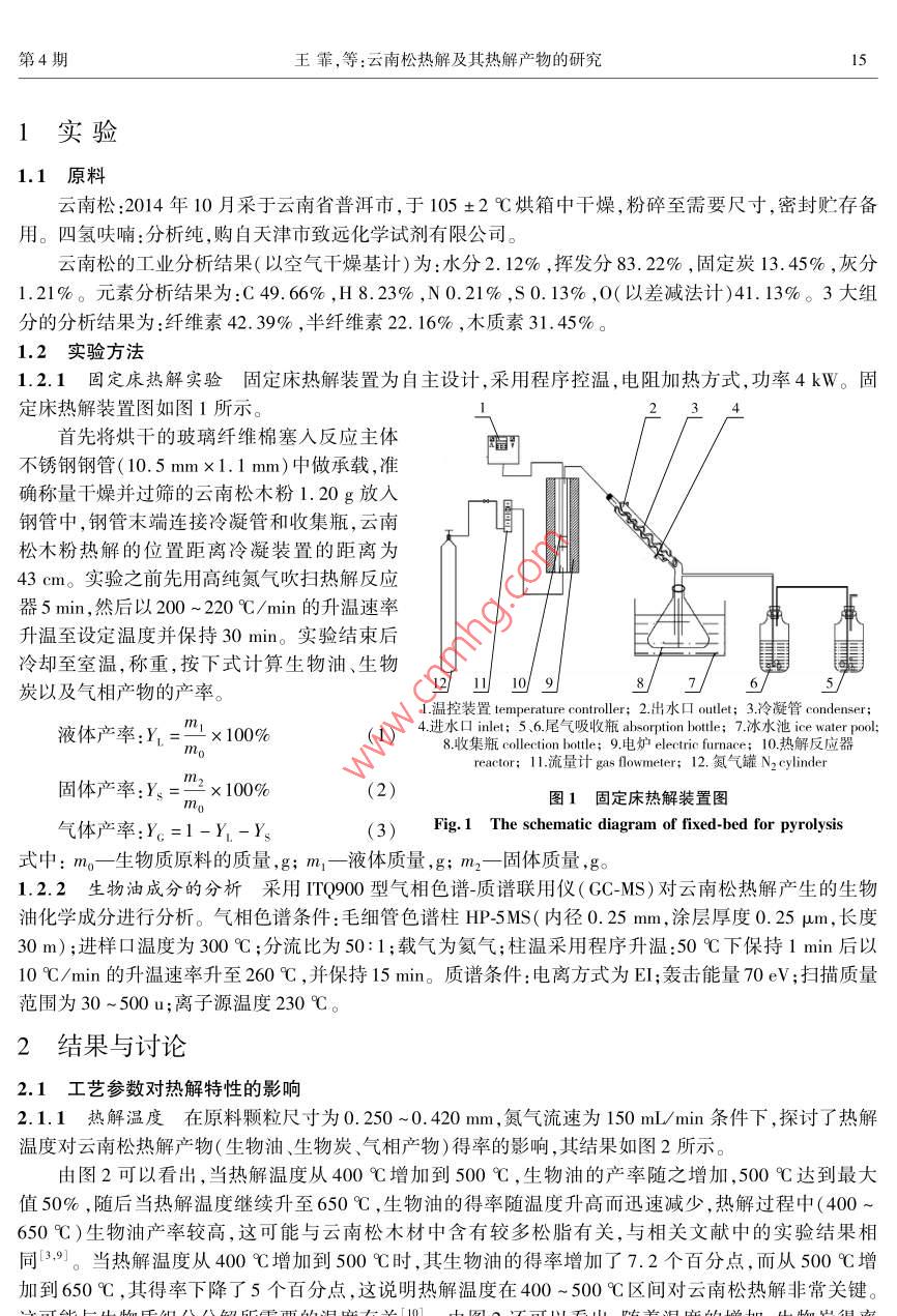 第49卷第4期生物質(zhì)化學(xué)I程Vol. 49 No.42015年7月.Biomass Chemical EngineeringJuly 2015doi:10. 3969/j. isn. 1673-5854. 2015.04. 003●研究報(bào)告一生 物質(zhì)能源●云南松熱解及其熱解產(chǎn)物的研究王霏',鄭云武12,鄭志鋒l”(1.云南省高校生物質(zhì)化學(xué)煉制與合成重點(diǎn)實(shí)驗(yàn)室;西南林業(yè)大學(xué)材料工程學(xué)院,云南昆明650224;2.東北林業(yè)大學(xué)材料科學(xué)與工程學(xué)院,黑龍江哈爾濱150040)摘要:采用自制固定床反應(yīng)器對(duì)云南松木粉進(jìn)行熱解,探討了熱解溫度、原料顆粒尺寸和氮?dú)饬魉賹?duì)云南松熱解特性的影響,并采用GC-MS對(duì)生物油的組分含量進(jìn)行分析。結(jié)果表明:在熱解溫度為500 C,原料顆粒尺寸為0.250 ~0.420 mm,氮?dú)饬魉贋?50 mL/min條件下,生物油的產(chǎn)率最高為50% ,液體組分主要以2,6-二叔丁基對(duì)甲酚、2-甲氧基-4-甲基苯酚、異丁香酚、愈創(chuàng)木酚為主,占液體總量的39. 24%。關(guān)鍵詞:云南松;熱解;熱解參數(shù);生物油;化學(xué)成分中圖分類號(hào):TQ35文獻(xiàn)標(biāo)識(shí)碼:A文章編號(hào):1673-5854( 2015 )04-0014-05Yields and Compositions of Products by Pyrolysis of Yunnan PineWANG Fei', ZHENG Yun-wul2, ZHENG Zhi-feng'(1. University Key Laboratory of Biomass Chemical Refinery & Synthesis , Yunnan Province; College of MaterialsEngineering, Southwest Forestry University, Kunming 650224,China; 2. College of MaterialsScience & Engineering, Northeast Forestry University, Harbin 150040, China)Abstract: The pyrolysis of Yunnan pine was conducted in home-made, fixed-bed reactor. The efeets of pyrolysis temperatures,feedstock particle size and nitrogen gas flow rate on characteritic of Yunnan pine pyrolysis were studied. And the compositions ofbio-oil were identified by GC-MS. The results showed that : the highest yield of bio-oil was obtained as 50% when the pyrolysistemperature was 500 C,particle size was 0. 250 - 0. 420 mm, and nitrogen gas flow rate was 150 mL/min. 2 , 6-Di-tert-buty-p-cresol ,2-methoxy-4-methylphenol,isoeugenol , guaiacol composed the main liquid products,and accounted for 39. 24% .Key words : Yunnan pine; pyrolysis ; parameters; bio-oil; chemical compositions當(dāng)前全球的能源利用形式主要是煤、石油和天然氣,有報(bào)告指出這類化石燃料到2050年將會(huì)被消耗殆盡,且其大量使用還造成了嚴(yán)重的環(huán)境問題中。生物質(zhì)作為--種傳統(tǒng)的能源載體,具有可再生、來源廣、產(chǎn)量豐富、無污染的優(yōu)點(diǎn),生物質(zhì)能源已成為世界各國研究的熱點(diǎn)。生物質(zhì)熱解是生物質(zhì)熱化學(xué)轉(zhuǎn)化過程中最受關(guān)注的一-種方式,是生物質(zhì)在300~650C,隔絕或者部分隔絕氧化介質(zhì)條件下,轉(zhuǎn)化為液體產(chǎn)物(生物油)、氣體和生物炭的反應(yīng)口]。生物質(zhì)熱解得到的生物油經(jīng)過改良后可以與現(xiàn)有的汽油、柴油混合使用,從而減少化石燃料的使用。當(dāng)前,很多學(xué)者對(duì)于生物質(zhì)熱解工藝進(jìn)行了研究,主要包括熱解參數(shù)以及催化劑對(duì)于生物質(zhì)熱解產(chǎn)物的組成結(jié)構(gòu)、產(chǎn)率以及選擇性的影響[3-8],然而,到目前為止,關(guān)于云南松熱解的相關(guān)研究還非常少。本研究利用自制固定床反應(yīng)器對(duì)云南松進(jìn)行熱解探討不同工藝參數(shù)(熱解溫度、原料顆粒尺寸以及氮?dú)饬魉?對(duì)熱解特性的影響。同時(shí)利用GC-MS對(duì)生物油的化學(xué)組分進(jìn)行了分析,以期為云南松的利用和云南松熱解技術(shù)的發(fā)展提供可靠的實(shí)驗(yàn)及理論依據(jù)。收稿日期:2015-03-31基金項(xiàng)目:國家林業(yè)局引進(jìn)國際先進(jìn)林業(yè)科學(xué)技術(shù)項(xiàng)目(2013-4- 08) ;云南省教育廳科學(xué)研究基金重大專項(xiàng)項(xiàng)目(ZD2014012)第4期王靠,等:云南松熱解及其熱解產(chǎn)物的研究1實(shí)驗(yàn)1.1原料云南松:2014年10月采于云南省普洱市,于105 +2 C烘箱中干燥,粉碎至需要尺寸,密封貯存?zhèn)溆谩K臍溥秽?分析純,購自天津市致遠(yuǎn)化學(xué)試劑有限公司。云南松的工業(yè)分析結(jié)果(以空氣干燥基計(jì))為:水分2.12% ,揮發(fā)分83. 22% ,固定炭13. 45% ,灰分1.21%。元素分析結(jié)果為:C49. 66% ,H 8.23% ,N0.21% ,S0. 13% ,0(以差減法計(jì))41.13%。3大組分的分析結(jié)果為:纖維素42. 39%,半纖維素22. 16% ,木質(zhì)素31.45%。1.2 實(shí)驗(yàn)方法1.2.1 固定床熱解實(shí)驗(yàn)固定床熱解裝置為自主設(shè)計(jì),采用程序控溫, 電阻加熱方式,功率4 kW。固定床熱解裝置圖如圖1所示。首先將烘干的玻璃纖維棉塞人反應(yīng)主體不銹鋼鋼管( 10.5 mmx1.1 mm)中做承載,準(zhǔn)確稱量干燥并過篩的云南松木粉1. 20g放入鋼管中,鋼管末端連接冷凝管和收集瓶,云南松木粉熱解的位置距離冷凝裝置的距離為43 cm。實(shí)驗(yàn)之前先用高純氮?dú)獯祾邿峤夥磻?yīng)器5min,然后以200~220C/min的升溫速率來用升溫至設(shè)定溫度并保持30min。實(shí)驗(yàn)結(jié)束后冷卻至室溫,稱重,按下式計(jì)算生物油、生物12/ 110/ 987/65/炭以及氣相產(chǎn)物的產(chǎn)率。1.溫控裝置temperature controller; 2.出水口 outlet; 3.冷凝管condenser;4.進(jìn)水口inlet; 5 6.尾氣吸收瓶absorption btle; 7.冰水池ice water pool;液體產(chǎn)率:Y ="x 100%(1)8.收集瓶cllction bottle; 9.電爐electric furnace; 10.熱解反應(yīng)器moreactor; 11.流量計(jì)gas flowm