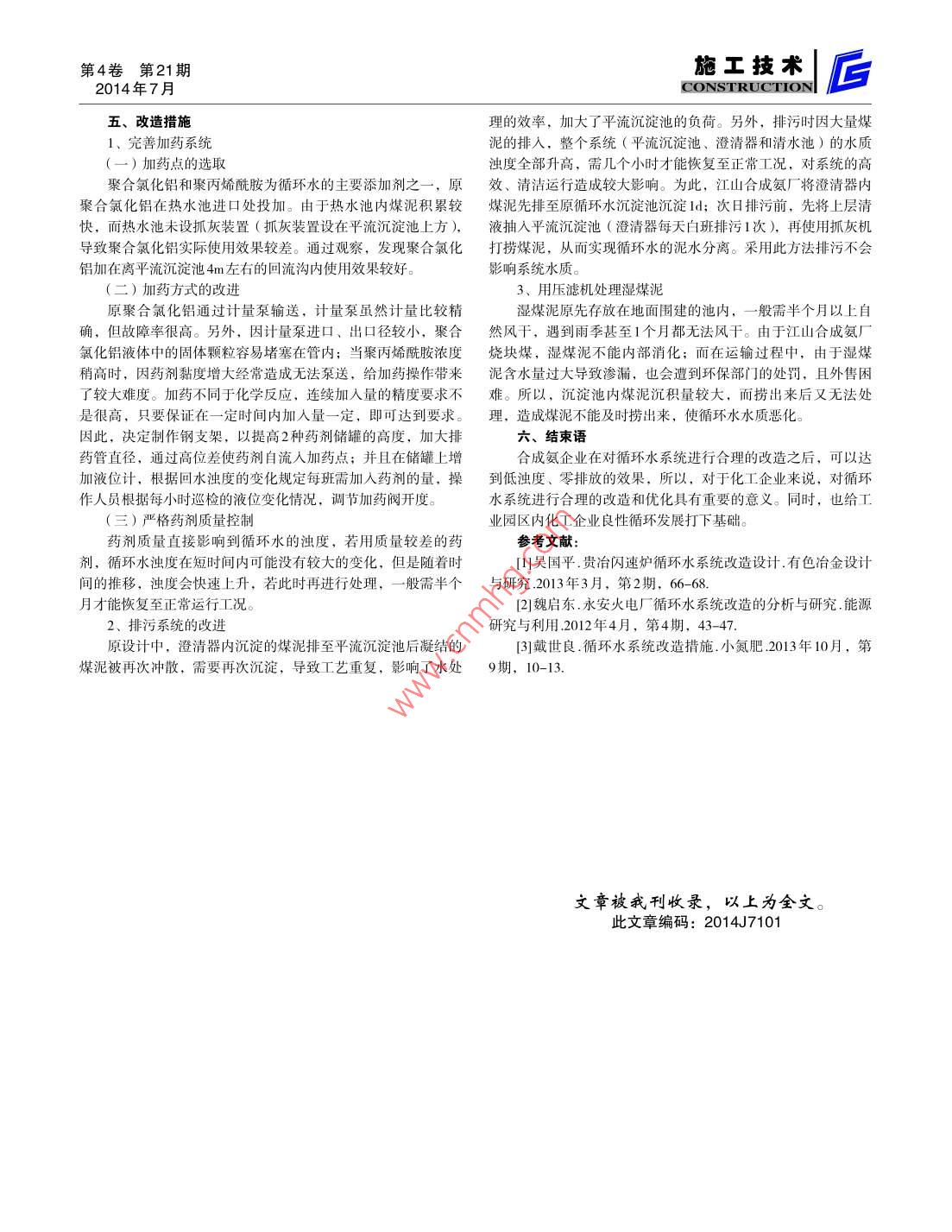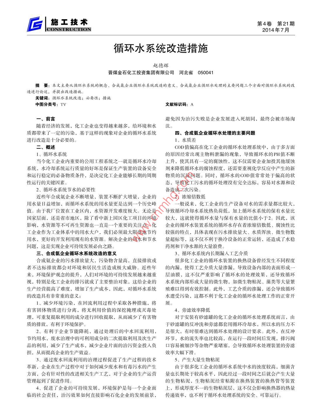 施工技術第4卷第21期后|CONSTRUCTION2014年7月循環(huán)水系統(tǒng)改造措施趙德輝晉煤金石化工投資集團有限公司河北省050041滴要:本文主要從循環(huán)水系統(tǒng)的概念、合成氨企業(yè)循環(huán)水系統(tǒng)改造的意義、合成氨企業(yè)循環(huán)水處理的主要問題三個方面對循環(huán)水系統(tǒng)的改造進行論述,并提出改造措施。關鍵詞:循環(huán)水系統(tǒng)改造;必要性;措施中圖分類號: TV文獻標識碼: A一、前言避免因為治污失敗是企業(yè)發(fā)展進入死胡同,最終會被市場淘隨著經濟的發(fā)展,化工企業(yè)也變得越來越多,給環(huán)境和水汰質都帶來了-一定的污染,基于這樣的現(xiàn)象對企業(yè)的循環(huán)水系統(tǒng)四、合成氨企業(yè)循環(huán)水處理的主要問題進行改造是十分必要的。1、水質差二、概述COD值偏高在化工企業(yè)的循環(huán)水處理系統(tǒng)中,由于多方面1、循環(huán)水系統(tǒng)的原因經常出現(xiàn)主物料泄漏的現(xiàn)象,導致循環(huán)水的PH值不斷當今化工企業(yè)內重要的公用工程系統(tǒng)之- -就是循環(huán)水冷卻上升, 使其具有一-定的腐蝕性, 這不僅需要企業(yè)加投其他緩蝕系統(tǒng),水冷卻系統(tǒng)運行質量的好壞是保證生產裝置的設備安全劑 來降低循環(huán)水的腐蝕程度,還需要重視化學反應中產生的新和運行穩(wěn)定的必備物質條件,是決定化工企業(yè)能夠長期的周期物 質的沉淀問題。同時,循環(huán)水的COD值常常處于偏高的狀性運行的關鍵因素。態(tài),導致化工污水的循環(huán)處理沒有完全達標,容易對水源和設2、 循環(huán)水系統(tǒng)節(jié)水的必要性備造成二次污染。近些年合成氨企業(yè)不斷增量,裝置不斷擴大增量,企業(yè)的2、濃縮倍數(shù)低用水量日益增加,而循環(huán)水系統(tǒng)的用水量更是達到一個歷史峰--般說來,化工企業(yè)的生產設備對水的需求量都比較大,值。由于我廠位置在工業(yè)區(qū)內,水資源開發(fā)難度極大。無論是導 致循環(huán)冷卻水系統(tǒng)熱負荷低,加上循環(huán)水系統(tǒng)的保有水量比國家層面,還是省市地區(qū),除了看中新上園區(qū)化工項目的環(huán)境較大, 這就使得循環(huán)水量與保有水量的比值小于2。因此,該影響,水資源等不可再生資源也一直是一一個重要的關注點?;髽I(yè) 的循環(huán)水裝置系統(tǒng)的循環(huán)水存在著濃縮倍數(shù)低、腐蝕性比工企業(yè)作為工業(yè)體系中的用水大戶,我們必須最大限度地節(jié)約較強的特點, 具體表現(xiàn)在污水排放量大、水質渾濁.微生物數(shù)用水,更好的開發(fā)利用現(xiàn)有的水資源。解決企業(yè)的用水和節(jié)水量超標等, 這不僅不利于換冷設備的正常運轉,還造成了水穩(wěn)問題,這是實現(xiàn)企業(yè)可持續(xù)發(fā)展必由之路。藥劑和干凈水源的大量浪費。三、合成氨企業(yè)循環(huán)水系統(tǒng)改造的意義3、循環(huán)水系統(tǒng)內長期漏人工藝介質合成氨企業(yè)的污水排放量大,污染物含量高,直接排放或很多化工企業(yè)的循環(huán)水裝置的換熱設備曾經發(fā)生不同程度者不達標排放都會對環(huán)境和居民生活造成極大威脅。近些年的內漏,使得工藝介質大量滲漏,導致設備內部的表面形成一來,環(huán)境保護觀念的提升,人們對環(huán)境的可持續(xù)發(fā)展越來越重層油膜, 這不僅嚴重影響了循環(huán)水的處理效果,還導致循環(huán)視,特別是化工企業(yè)的排污就成了主要整治對象,這給企業(yè)的水 系統(tǒng)內部形成大量的微生物,如微生物粘泥、藻類等大量繁生產經營提高了難度,增加了生產成本,因此,對循環(huán)水系統(tǒng)殖難以得到有效控制。 此外,工藝介質的滲漏,還會導致循環(huán)的改造具有非常重的意義:水遭受污染,這都不利于化L企業(yè)的循環(huán)水處理工作的正常開1、減少環(huán)境污染,在回流利用過程中采取各種措施,將1有害固體物質進行分離,將無利用價值的深挖掩埋或滅毒處4、旁濾效率降低理,可重復提取利用的成分進行回收提取,從而減少了有害物對于安裝有砂濾罐的化工企業(yè)的循環(huán)水處理系統(tǒng)而言,由質的排放,有利于環(huán)境保護。于砂濾罐的反沖洗和旁濾都套用循環(huán)冷卻水,所以水的壓力不2、有利于企業(yè)節(jié)能降耗,通過處理后的中水回流利用,是很大, 有時很難達到循環(huán)水處理的設計要求。此外,在反沖節(jié)約用水,廢水治理中的可利用成分的二次提取利用及次生產環(huán)節(jié), 水的流失率也比較高,在運行一段時間后發(fā)現(xiàn), 排污閥品的利用,減少了生產成本,減少企業(yè)片面的治污資金投入負口 容易被細沙等雜物嚴重堵塞,會導致循環(huán)水處理裝置的旁濾擔,從而提高企業(yè)的生產效益。效率大幅下滑。3、通過廢水回流利用的治理過程促進了生產過程的技術5、產生大量生物粘泥革新,企業(yè)在生產過程中對于如何減少廢水和有毒污水的產生由于很多化I企業(yè)的循環(huán)水系統(tǒng)中水的濁度較高,細菌含方面,會有針對性的改進相關生產工藝,對于企業(yè)的生產運營量 也長期處于較高水平,因此經過一段時間之后 就會產生大量管理起到了促進作用。的生物粘泥,生物粘泥經常粘附在換熱裝置的換熱管等裝置4、促進了企業(yè)的可持續(xù)