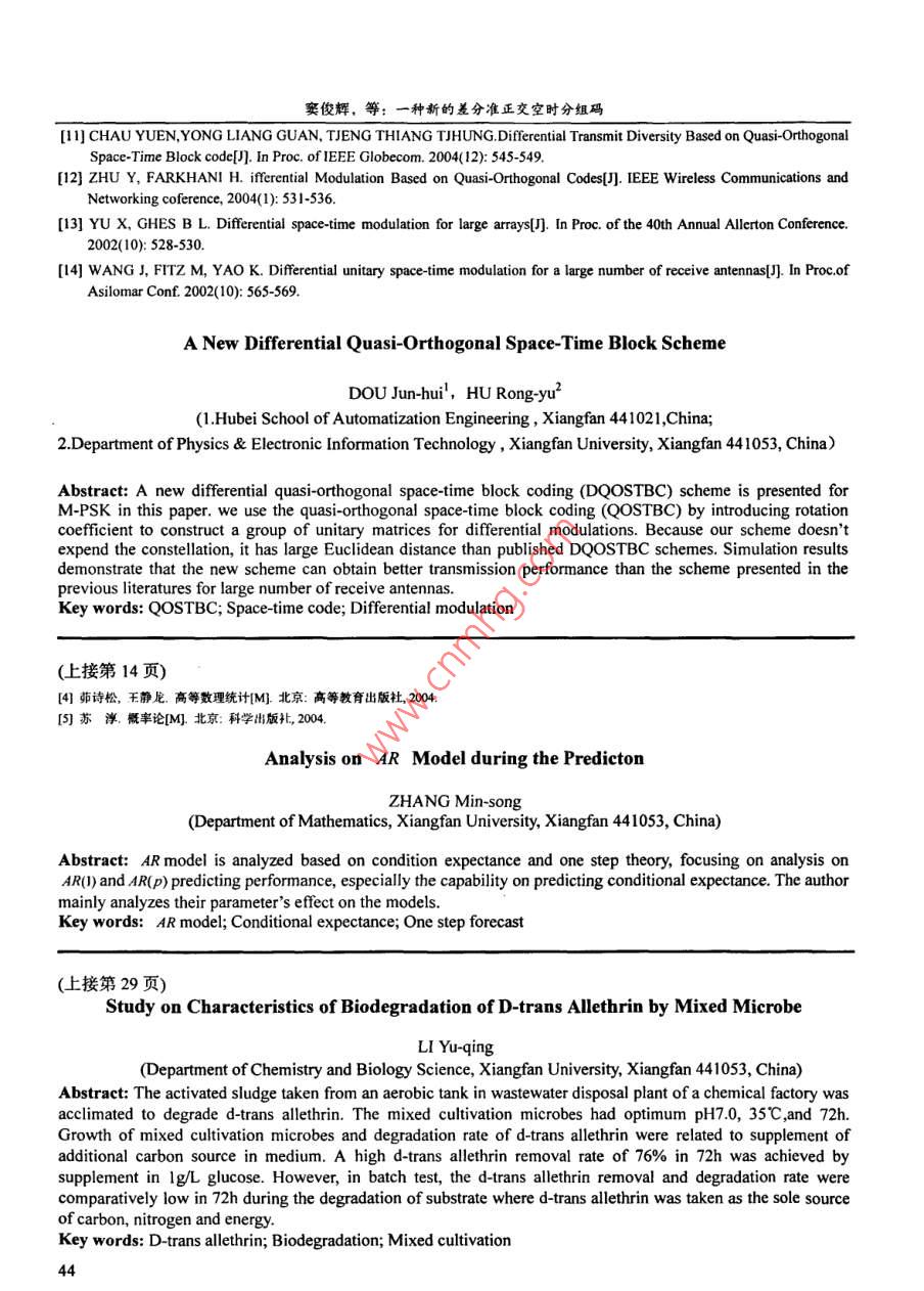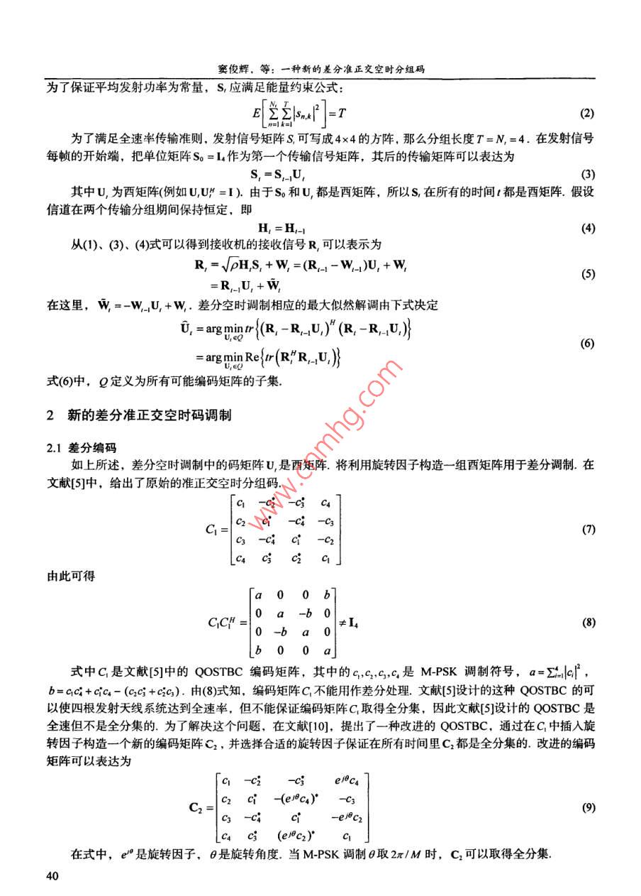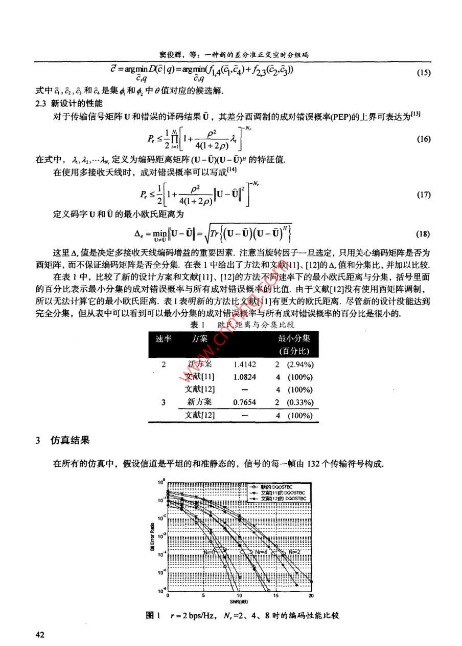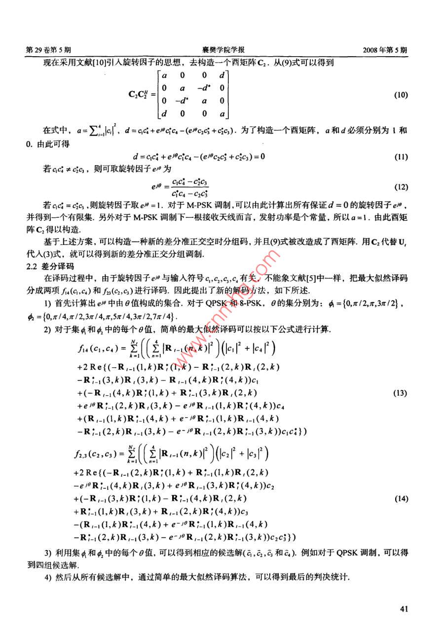 2008年5月襄樊學(xué)院學(xué)報May. 2008第29卷第5期Vol29 No 5一種新的差分準(zhǔn)正交空時分組碼竇俊輝,胡榮玉2(1湖北自動化工程學(xué)校,湖北襄樊441021;2.襄樊學(xué)院物理與電子信息技術(shù)系,湖北襄樊44053)摘要:設(shè)計了一種新的MPSK調(diào)制下的差分準(zhǔn)正交空時分組碼( DQOSTBC),這種方法通過引入一種基于旋轉(zhuǎn)因子的準(zhǔn)正交空時分組碼,構(gòu)造出一組差分調(diào)制酉矩陣.這種引入的準(zhǔn)正交空時分組碼沒有帶來星座擴展,使得新的編碼具有更大的歐氏距離.仿真結(jié)果表明,在使用多接收天線條件下,此設(shè)計方法比先前文獻中關(guān)于差分準(zhǔn)正交的方案能獲得更大的傳輸性能關(guān)鍵詞:準(zhǔn)正交空時分組碼;空時編碼;差分調(diào)制中圖分類號:TN914文獻標(biāo)志碼:A文章編號:1009-2854(2008)05-003906在過去幾年中,無線信道基于發(fā)射分集的空時編碼技術(shù)的研究很多,然而大多數(shù)的研究方法需要在接收端知道信道狀態(tài)信息(CSD).盡管可以通過發(fā)射信號或者導(dǎo)頻序列來進行信道估計,獲得信道的CSI,但是在一些情況下(例如高速移動的環(huán)境,或者信道衰落條件快速改變時),很難準(zhǔn)確地估計信道,或者準(zhǔn)確估計信道的代價很高.這種情況下,在接收機端和發(fā)射機端都不需要信道估計的差分空時調(diào)制(DSTM技術(shù)便非常有用 Hughes提出了基于群碼的差分空時調(diào)制", Tarokh和 Jafarkhani提出了一種基于正交設(shè)計的差分空時分組碼, Hochwald和 Sweldens提出了基于兩矩陣的設(shè)計方案, Ganesa和Soia提出了一種低誤碼率和低復(fù)雜度的差分空時調(diào)制.文獻[4的方案是基于正交設(shè)計的,但是這種正交空時分組碼在發(fā)射天線超過四根時最大速率只能達到34.文獻巧提供了一種四發(fā)射天線速率為1非完全分集的準(zhǔn)正交空時分組碼隨后文獻[6-10提出了改進的全速率全分集的準(zhǔn)正交空時分組碼,這種編碼的思路是利用旋轉(zhuǎn)星座或者引入旋轉(zhuǎn)因子來達到全速全分集.基于這種準(zhǔn)正交空時分組碼,文獻[提是出了一種差分方法,把調(diào)制和特定的信號星座集結(jié)合起來,從而把準(zhǔn)正交空時分組碼構(gòu)遣成酉矩陣.但這種方法當(dāng)發(fā)射天線數(shù)大于2時,文獻[ll中的星座集會被大大擴展.文獻2]提出的差分準(zhǔn)正交空時調(diào)制方法是把準(zhǔn)正交空時分組碼分成兩個子系統(tǒng),每個子系統(tǒng)由兩發(fā)射天線構(gòu)成,并分別使用差分的正交空時分組碼調(diào)制.這種方法同樣的一個問題是在使用大數(shù)目接收天線時,由于星座擴展,星座符號間的歐氏距離減小,從而減小了系統(tǒng)的編碼增益.本文提出了一種新的基MPSK調(diào)制的四發(fā)射天線和多接收天線的差分準(zhǔn)正交空時分組碼,主要思想是通過引入旋轉(zhuǎn)因子,把準(zhǔn)正交空時分組碼構(gòu)造成酉矩陣.在文獻[10中,旋轉(zhuǎn)因子是按照把準(zhǔn)正交空時分組碼設(shè)計成全速率完全分集的原則來選取的,而在本文的設(shè)計中,旋轉(zhuǎn)因子是按照把準(zhǔn)正交空時分組碼構(gòu)造成酉矩陣的原則來優(yōu)化的,同時保證其編碼的全速率,但不能保證全分集.因此在使用單一接收天線的情況下,文獻[1012]的方法比此方法更有效,但是在使用多接收天線時,此方法可以取得更好的傳輸性能.仿真結(jié)果證明了這一點,特別是在8PSK的情況下1系統(tǒng)模型考慮一個M根發(fā)射天線和N根接收天線的無線通信系統(tǒng),處于平坦的瑞利衰落信道.定義S,為在時間t時MxT的發(fā)射信號矩陣,其中T是分組長度,H為MxM的衰落信道矩陣,w為在時間t時NxT的噪聲矩陣.則接收到的NxT的信號矩陣R,可以表達為R,=√HS,+w(1)在(1)式中,W是均值為0方差為an2加性復(fù)高斯隨機噪聲的采樣項,p是一根接收天線時的發(fā)射功率收稿日期:2006-12-15作者簡介;竇俊輝(1972-),男,湖北襄樊人,湖北閂動化程學(xué)校講師.竇俊輝,等:一種新的差分準(zhǔn)正交空時分組碼為了保證平均發(fā)射功率為常量,S,應(yīng)滿足能量約束公式:T為了滿足全速率傳輸準(zhǔn)則,發(fā)射信號矩陣S可寫成4×4的方陣,那么分組長度T=M=4.在發(fā)射信號每幀的開始端,把單位矩陣S。=I作為第一個傳輸信號矩陣,其后的傳輸矩陣可以表達為S,=S-U其中U為酉矩陣(例如UU=1).由于S和U都是酉矩陣,所以S在所有的時間t都是酉矩陣.假設(shè)信道在兩個傳輸分組期間保持恒定,即H=H,-1(4)從(1)、(3)、(4)式可以得到接收機的接收信號R,可以表示為R,=pH,S, +W,=(R_-)U, +wR,U+w在這里,W=-WU4+w.差分空時調(diào)制相應(yīng)的最大似然解調(diào)由下式?jīng)Q定U,=E出m(,一R,U)(R,-R,URetr(rR,u式(6)中,Q定義為所有可能編碼矩陣的子集新的差分準(zhǔn)正交空時碼調(diào)制2.1差分編碼如上所述,差分空時調(diào)制中的碼矩陣U是酉矩陣.將利用旋轉(zhuǎn)因子構(gòu)造一組酉矩陣用于差分調(diào)制.在文獻巧5]中,給出了原始的準(zhǔn)正交空時分組碼CI-CI -C4由此可得000 a -bb00a600 a式中C是文獻S]中的 QOSTBC編碼矩陣,其中的c,c2,,c是MPSK調(diào)制符號,a=|e,b=ad+ca-(a+c).由(8)式知,編碼矩陣C不能用作差分處理.文獻[5]設(shè)計的這種 QOSTBC的可以使四根發(fā)射天線系統(tǒng)達到全速率,但不能保證編碼矩陣C取得全分集,因此文獻[S]設(shè)計的 QOSTBC是全速但不是全分集的為了解