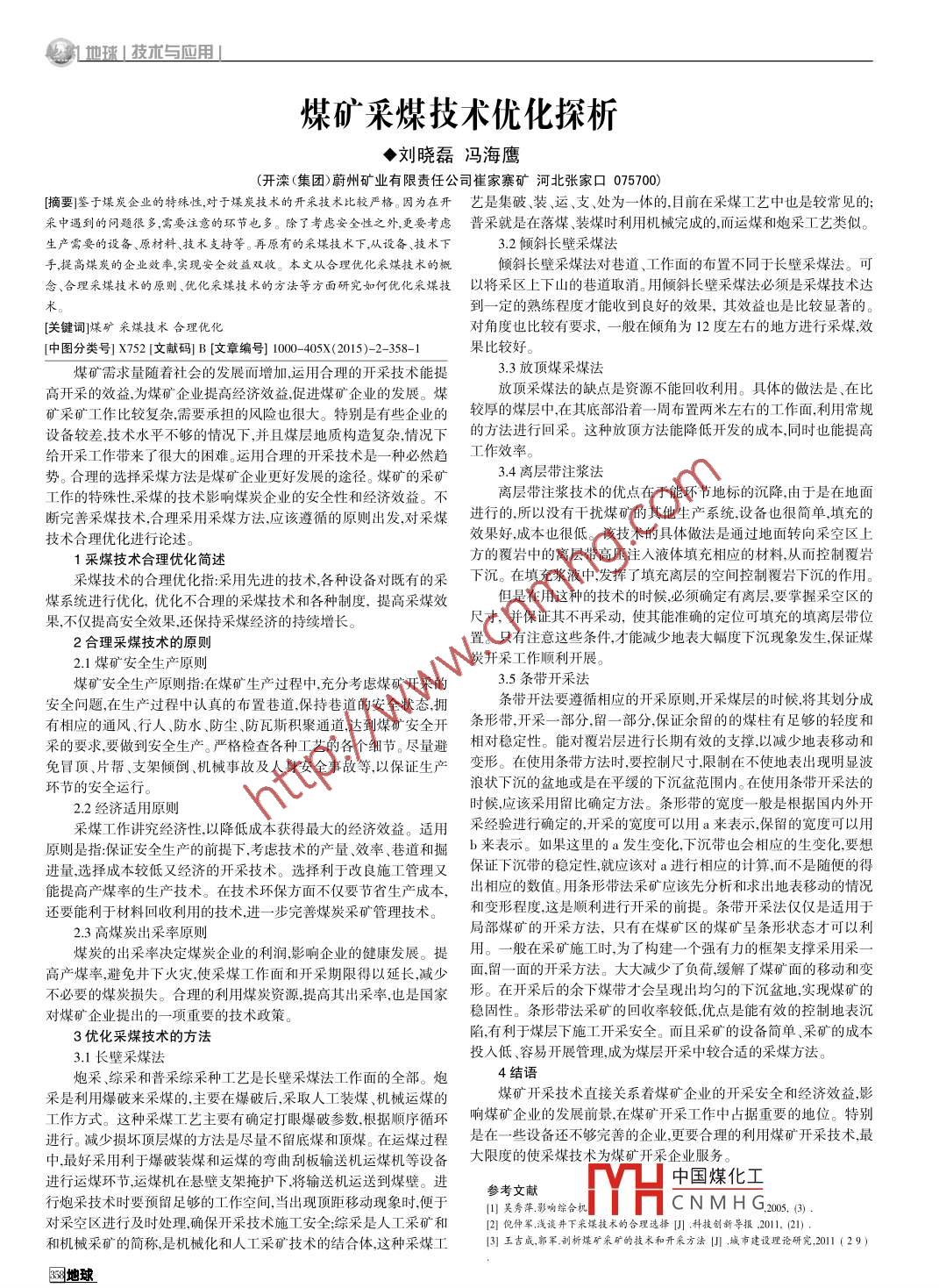 零1地球I 技術(shù)與應(yīng)用|煤礦采煤技術(shù)優(yōu)化探析◆劉曉磊馮海鷹(開灤(集團(tuán))蔚州礦業(yè)有限責(zé)任公司崔家寨礦河北張家口075700)[摘要]鑒于煤炭企業(yè)的特殊性,對于煤炭技術(shù)的開采技術(shù)比較嚴(yán)格。因?yàn)樵陂_藝是集破 、裝、運(yùn)、支、處為一體的,目前在采煤工藝中也是較常見的;采中遇到的問題很多,需要注意的環(huán)節(jié)也多。除了考慮安全性之外,更要考慮普采就是在落煤 、裝煤時利用機(jī)械完成的,而運(yùn)煤和炮采工藝類似。生產(chǎn)需要的設(shè)備、原材料、技術(shù)支持等。再原有的采煤技術(shù)下,從設(shè)備、技術(shù)下3.2傾斜長壁采煤法手,提高煤炭的企業(yè)效率,實(shí)現(xiàn)安全效益雙收。本文從合理優(yōu)化采煤技術(shù)的概傾斜長壁采煤法對巷道、工作面的布置不同于長壁采煤法。可念合理采煤技術(shù)的原則.優(yōu)化采媒技術(shù)的方法等方面研究如何優(yōu)化采媒技以將采區(qū) 上下山的巷道取消。用傾斜長壁采煤法必須是采煤技術(shù)達(dá)到一定的熟練程度才能收到良好的效果,其效益也是比較顯著的。[關(guān)鍵詞]煤礦采煤技術(shù)合理優(yōu)化對角度也比較有要求, -般在傾角為12度左右的地方進(jìn)行采煤,效[中圖分類號X752 [文獻(xiàn)碼] B [文章編號] 10 405X(2015)-2- -358-1果比較好。煤礦"需求量隨著社會的發(fā)展而增加,運(yùn)用合理的開采技術(shù)能提3.3放頂煤采煤法高開采的效益,為煤礦企業(yè)提高經(jīng)濟(jì)效益,促進(jìn)煤礦企業(yè)的發(fā)展。煤放頂采煤法的缺點(diǎn)是資源不能回收利用。具體的做法是、在比礦采礦工作比較復(fù)雜需要承擔(dān)的風(fēng)險也很大。特別是有些企業(yè)的較厚的煤層中,在其底部沿著一周布置兩米左右的工作面,利用常規(guī)設(shè)備較差,技術(shù)水平不夠的情況下,并且煤層地質(zhì)構(gòu)造復(fù)雜,情況下的方法進(jìn)行回采。這種放頂方法能降低開發(fā)的成本,同時也能提高給開采工作帶來了很大的困難。運(yùn)用合理的開采技術(shù)是一種必然趨工作效率。勢。合理的選擇采煤方法是煤礦企業(yè)更好發(fā)展的途徑。煤礦的采礦3.4離層帶注漿法離層帶注漿技術(shù)的優(yōu)點(diǎn)在于能環(huán)節(jié)地標(biāo)的沉降,由于是在地面工作的特殊性,采煤的技術(shù)影響煤炭企業(yè)的安全性和經(jīng)濟(jì)效益。不進(jìn)行的,所以沒有干擾煤礦的其他生產(chǎn)系統(tǒng),設(shè)備也很簡單填充的斷完善采煤技術(shù),合理采用采煤方法,應(yīng)該遵循的原則出發(fā),對采煤技術(shù)合理優(yōu)化進(jìn)行論述。效果好,成本也很低。該技術(shù)的具體做法是通過地面轉(zhuǎn)向采空區(qū)上1采煤技術(shù)合理優(yōu)化簡述方的覆巖中的離層帶高壓注入液體填充相應(yīng)的材料,從而控制覆巖采煤技術(shù)的合理優(yōu)化指:采用先進(jìn)的技術(shù),各種設(shè)備對既有的采下沉。在填充漿液中,發(fā)揮了填充離層的空間控制覆巖下沉的作用。煤系統(tǒng)進(jìn)行優(yōu)化,優(yōu)化不合理的采煤技術(shù)和各種制度,提高采煤效但是在用這種的技術(shù)的時候,必須確定有離層,要掌握采空區(qū)的果,不僅提高安全效果,還保持采煤經(jīng)濟(jì)的持續(xù)增長。尺寸,并保證其不再采動,使其能準(zhǔn)確的定位可填充的填離層帶位2合理采煤技術(shù)的原則置。只有注意這些條件,才能減少地表大幅度下沉現(xiàn)象發(fā)生,保證煤2.1煤礦安全生產(chǎn)原則炭開采工作順利開展。煤礦安全生產(chǎn)原則指:在煤礦生產(chǎn)過程中,充分考慮煤礦開采的3.5條帶開采法條帶開法要遵循相應(yīng)的開采原則,開采煤層的時候,將其劃分成安全問題,在生產(chǎn)過程中認(rèn)真的布置巷道,保持巷道的安全狀態(tài),擁有相應(yīng)的通風(fēng)、行人防水、防塵、防瓦斯積聚通道,達(dá)到煤礦安全開條形帶,開采- 部分 .留-部分,保證余留的的煤柱有足夠的輕度和采的要求,要做到安全生產(chǎn)。嚴(yán)格檢查各種工藝的各個細(xì)節(jié)。盡量避相對穩(wěn)定性。能對覆巖層進(jìn)行長期有效的支撐,以減少地表移動和免冒頂、片幫支架傾倒、機(jī)械事故及人身安全事故等以保證生產(chǎn)變形。 在使用條帶方法時,要控制尺寸限制在不使地表出現(xiàn)明顯波環(huán)節(jié)的安全運(yùn)行。浪狀下沉的盆地或是在平緩的下沉盆范圍內(nèi)。在使用條帶開采法的2.2經(jīng)濟(jì)適用原則時候,應(yīng)該采用留比確定方法。條形帶的寬度一般是根據(jù)國內(nèi)外開采煤工作講究經(jīng)濟(jì)性,以降低成本獲得最大的經(jīng)濟(jì)效益。適用采經(jīng)驗(yàn)進(jìn)行確定的,開采的寬度可以用a來表示,保留的寬度可以用原則是指:保證安全生產(chǎn)的前提下,考慮技術(shù)的產(chǎn)量效率、巷道和掘b來表示。如果這里的a發(fā)生變化,下沉帶也會相應(yīng)的生變化,要想進(jìn)量,選擇成本較低又經(jīng)濟(jì)的開采技術(shù)。選擇利于改良施工管理又保證下沉帶的穩(wěn)定性,就應(yīng)該對a進(jìn)行相應(yīng)的計(jì)算,而不是隨便的得能提高產(chǎn)煤率的生產(chǎn)技術(shù)。在技術(shù)環(huán)保方面不僅要節(jié)省生產(chǎn)成本,出相應(yīng)的數(shù)值。 用條形帶