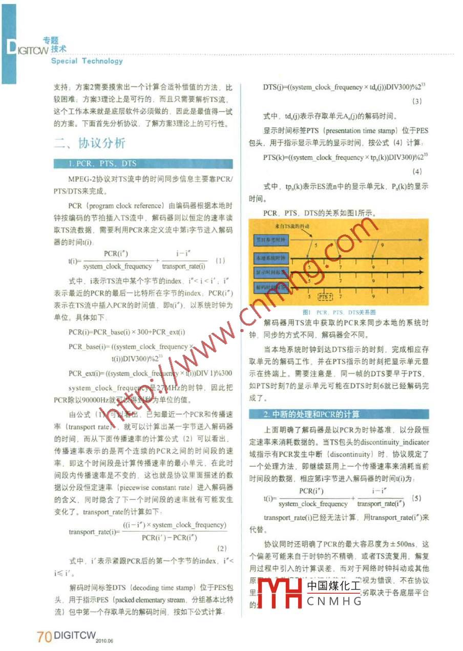 專題。IGTTCW技術(shù)Special Technology支持:方案2需要摸索出一個(gè)計(jì)算合適補(bǔ)償值的方法。比DTSQ)-(system. clock frequency x d.,))DIV300)%00較困難:方案3理論上是可行的.而且只需要解析TS流.3)這個(gè)工作本來(lái)就是底層軟件必須做的,因此是最值得- -試式中,td.()表示存取單元A.Q)的解碼時(shí)間。的方案。下面首先分析協(xié)議,了解方案3理論上的可行性。顯示時(shí)間標(biāo)簽PTS (presentation time stamp)位于PES協(xié)議分析包頭,用于指示顯示單元的顯示時(shí)間,按公式(4)計(jì)算:PTS()-((system_ clock. frequency x t:())DIV300)%21. PCR, PTS, DTS4)MPEG-2協(xié)議對(duì)TS流中的時(shí)間同步信息主要靠PCR/式中,tp,(k)表示ES流n中的顯示單元k. P。(k)的顯示PTS/DTS來(lái)完成。PCR (program clock reference)由編碼器根據(jù)本地時(shí)時(shí)間。PCR, PTS. DTS的關(guān)系如圖1所示。鐘按編碼的節(jié)拍插入TS流中,解碼器則以恒定的速率讀束1TS流的抖動(dòng)取TS流數(shù)據(jù),需要利用PCR來(lái)定義流中第字節(jié)進(jìn)入解碼器的時(shí)間(i):PCR(i")i-i"t(i)=system_ clock. frequency transport. rate()(1式中,i表示TS流中某個(gè)字節(jié)的index. i"