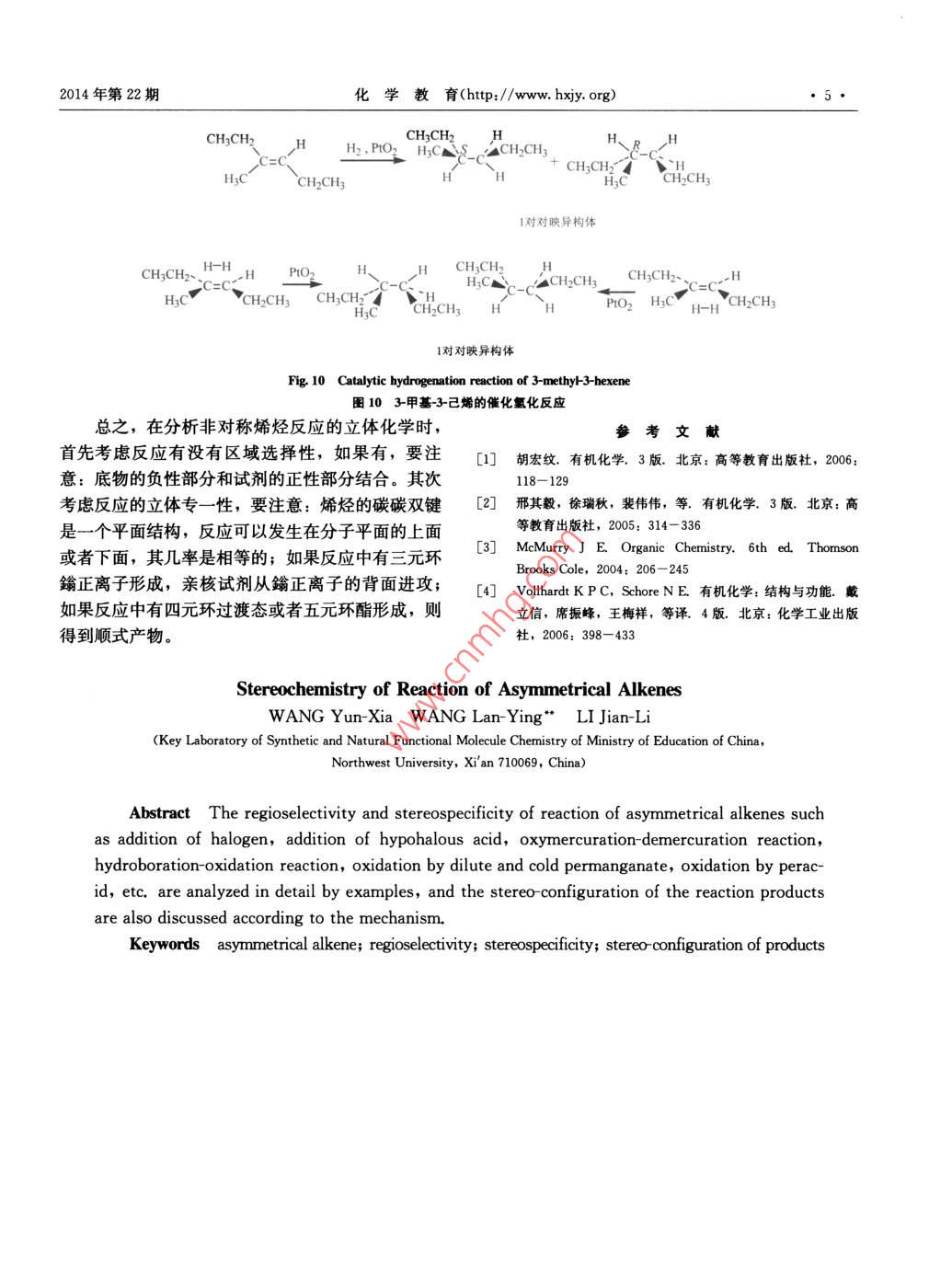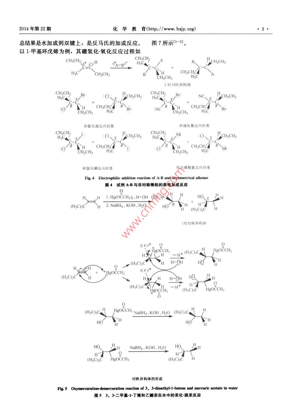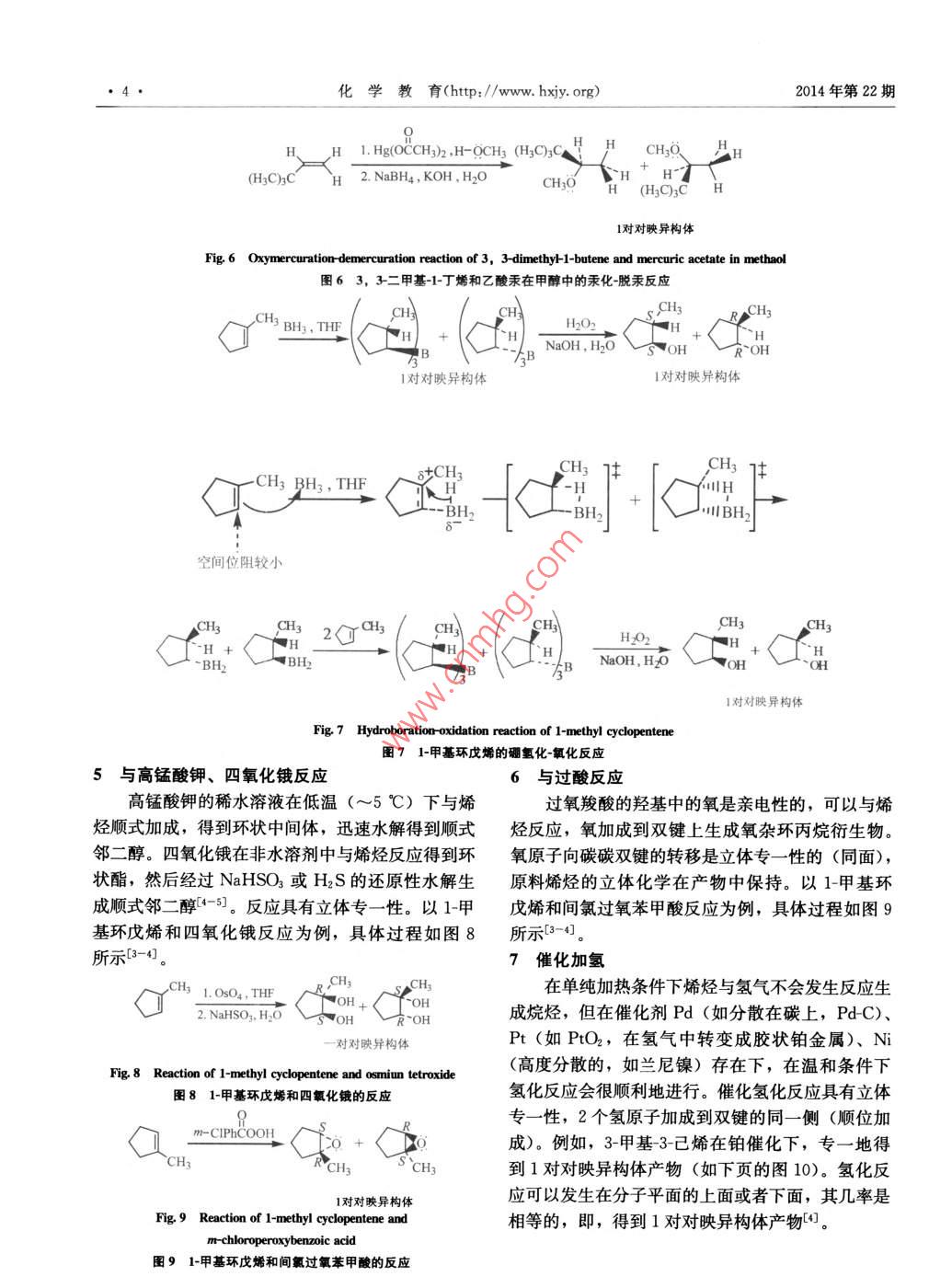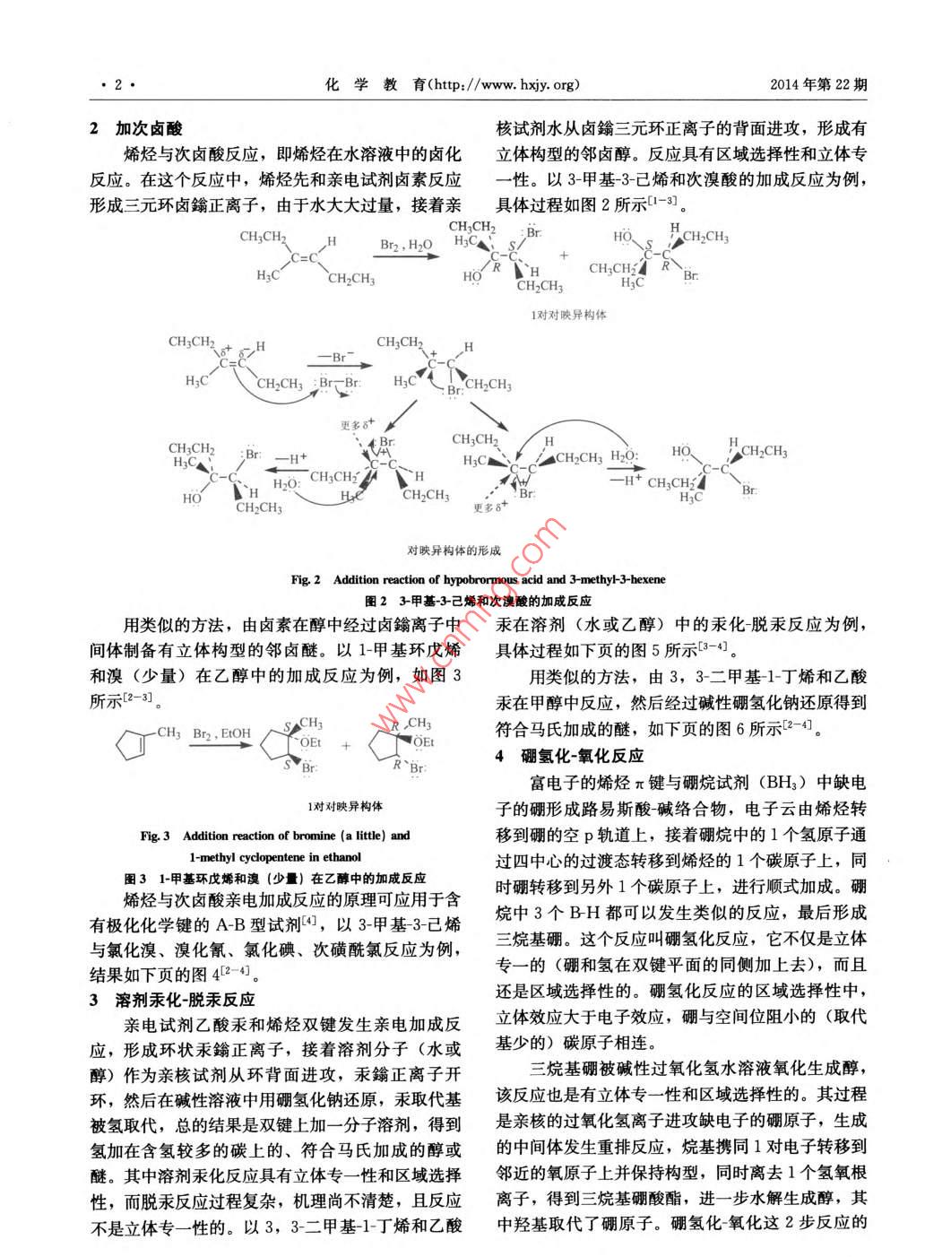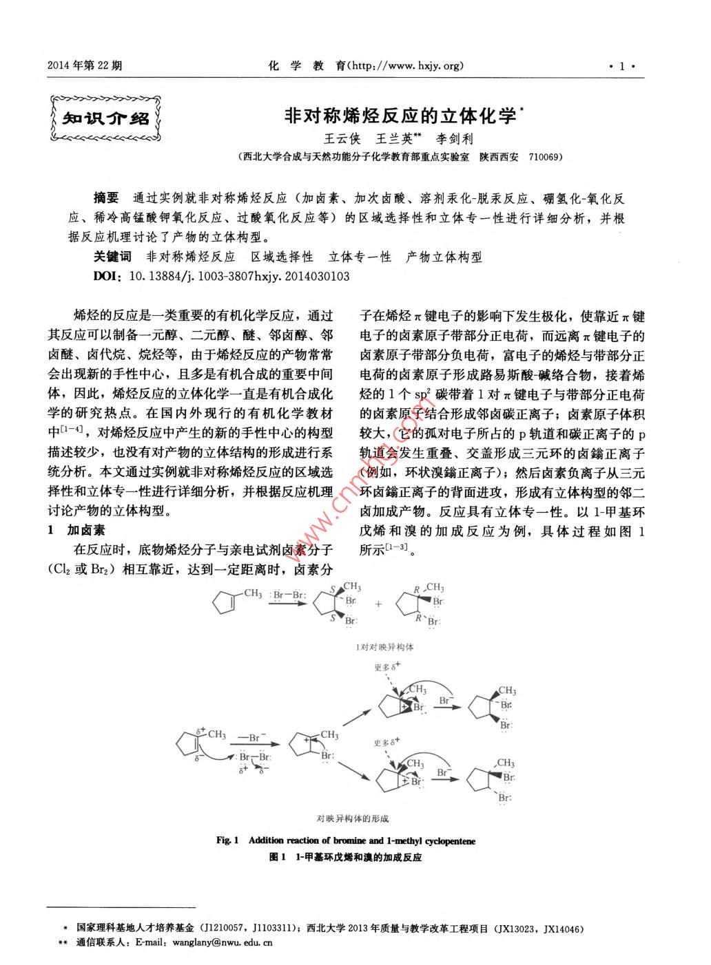 2014年第22期化學(xué)教育(http://www. hxjy. org)知識(shí)介紹非對(duì)稱(chēng)烯烴反應(yīng)的立體化學(xué)'王云俠王蘭英** 李劍利(西北大學(xué)合成與天然功能分子化學(xué)教育部重點(diǎn)實(shí)驗(yàn)室陜西西安710069)摘要通過(guò)實(shí)例就非對(duì)稱(chēng)烯烴反應(yīng) (加鹵素、加次鹵酸、溶劑汞化-脫汞反應(yīng)、硼氫化-氧化反應(yīng)、稀冷高錳酸鉀氧化反應(yīng)、過(guò)酸氧化反應(yīng)等)的區(qū)域選擇性和立體專(zhuān)一性進(jìn)行詳細(xì)分析,并根據(jù)反應(yīng)機(jī)理討論了產(chǎn)物的立體構(gòu)型。關(guān)鍵詞非對(duì)稱(chēng)烯烴反應(yīng) 區(qū)域選擇性 立體專(zhuān)一性 產(chǎn)物立體構(gòu) 型DOI: 10. 13884/j. 1003-3807hxjy. 2014030103烯烴的反應(yīng)是一-類(lèi)重要的有機(jī)化學(xué)反應(yīng),通過(guò)子在烯烴π鍵電子的影響下發(fā)生極化,使靠近π鍵其反應(yīng)可以制備-元醇、二元醇、醚、鄰鹵醇、鄰電子的鹵素原子帶部分正電荷,而遠(yuǎn)離π鍵電子的鹵醚、鹵代烷、烷烴等,由于烯烴反應(yīng)的產(chǎn)物常常鹵素原子帶部分負(fù)電荷,富電子的烯烴與帶部分正會(huì)出現(xiàn)新的手性中心,且多是有機(jī)合成的重要中間電荷的鹵素原子形成路易斯酸堿絡(luò)合物,接著烯體,因此,烯烴反應(yīng)的立體化學(xué)一直是有 機(jī)合成化烴的1個(gè)sp2碳帶著1對(duì)π鍵電子與帶部分正電荷學(xué)的研究熱點(diǎn)。在國(guó)內(nèi)外現(xiàn)行的有機(jī)化學(xué)教材的鹵素原子結(jié)合形成鄰鹵碳正離子;鹵素原子體積中1-4,對(duì)烯烴反應(yīng)中產(chǎn)生的新的手性中心的構(gòu)型較大,它的孤對(duì)電子所占的p軌道和碳正離子的p描述較少,也沒(méi)有對(duì)產(chǎn)物的立體結(jié)構(gòu)的形成進(jìn)行系軌道會(huì)發(fā)生重疊、交蓋形成三元環(huán)的鹵鑰正離子統(tǒng)分析。本文通過(guò)實(shí)例就非對(duì)稱(chēng)烯烴反應(yīng)的區(qū)域選(例如,環(huán)狀溴鑰正離子);然后鹵素負(fù)離子從三元擇性和立體專(zhuān)-性進(jìn)行詳細(xì)分析,并根據(jù)反應(yīng)機(jī)理環(huán)鹵鑰正離子的背面進(jìn)攻,形成有立體構(gòu)型的鄰討論產(chǎn)物的立體構(gòu)型。鹵加成產(chǎn)物。反應(yīng)具有立體專(zhuān)-性。以1-甲基環(huán)1加鹵素戊烯和溴的加成反應(yīng)為例,具體過(guò)程如圖1在反應(yīng)時(shí),底物烯烴分子與親電試劑鹵素分子所示[1-3]。(C2或Br2)相互靠近,達(dá)到- -定距離時(shí),鹵素分CH3R .CH3-CH;曲些Br +'BrBr:RBr:1對(duì)對(duì)映異構(gòu)體更多δ+ .VCH3<8.