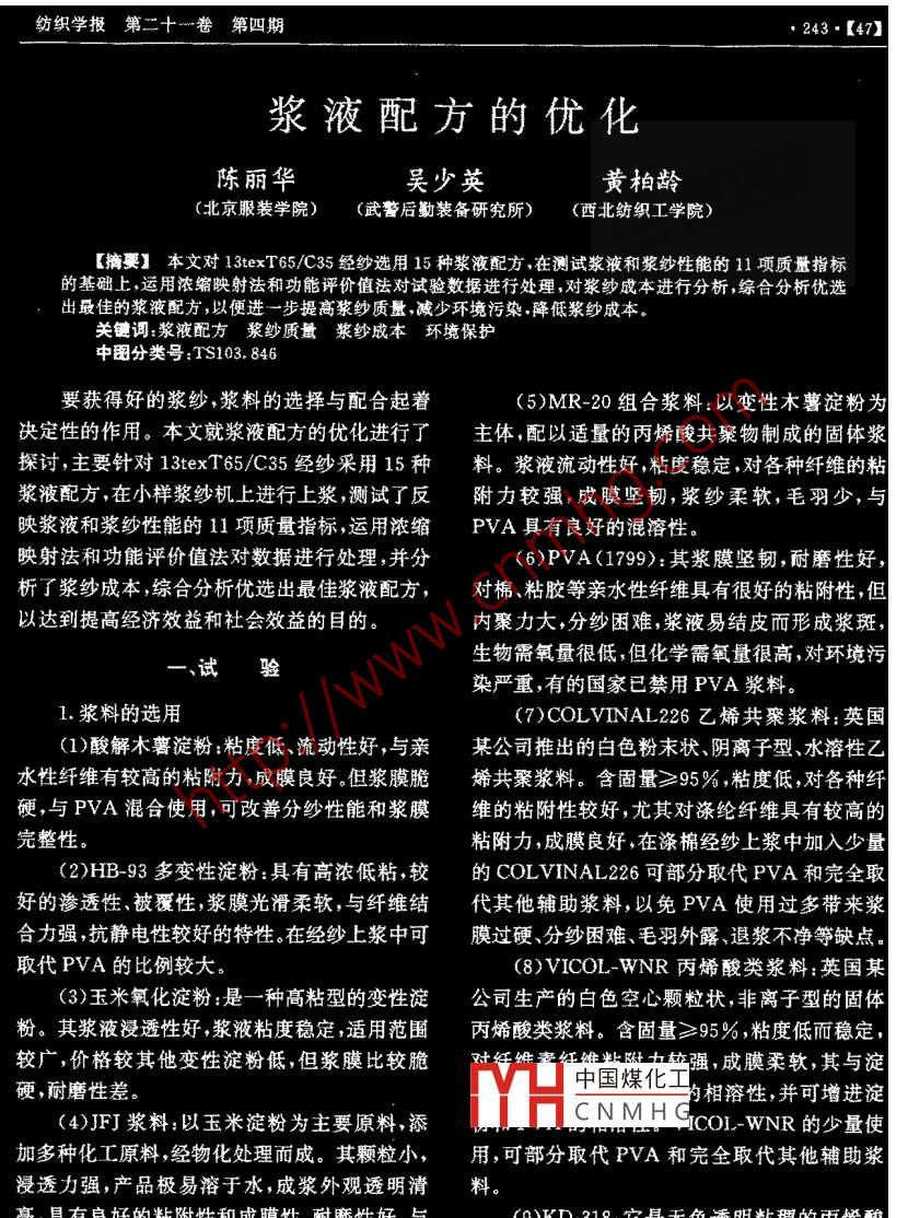 紡織學(xué)報(bào)第二十一卷 第四期243. [47] I漿液配方的優(yōu)化陳麗華吳少英黃柏齡(北京服裝學(xué)院)(武警后勤裝備研究所)(西北紡織工學(xué)院)[摘要本文對(duì) 13texT65/C35經(jīng)紗選用15種漿液配方,在測(cè)試漿液和漿紗性能的11項(xiàng)質(zhì)量指標(biāo)的基礎(chǔ)上運(yùn)用濃編映射法和功能評(píng)價(jià)值法對(duì)試驗(yàn)數(shù)據(jù)進(jìn)行處理,對(duì)漿紗成本進(jìn)行分析,綜合分析優(yōu)選出最佳的漿液配方,以便進(jìn)一步提高漿紗質(zhì)量,減少環(huán)境污染.降低漿紗成本,關(guān)鍵調(diào):漿液配方漿紗質(zhì)量漿紗成本 環(huán)境 保護(hù)中國(guó)分類號(hào)TS103.846要獲得好的漿紗,漿料的選擇與配合起著I(5)MR20組合漿料:以變性木薯淀粉為決定性的作用。本文就漿液配方的優(yōu)化進(jìn)行了主體,配以適量的丙烯酸共聚物制成的固體漿探討,主要針對(duì)13texT65/C35經(jīng)紗采用15種料。漿液流動(dòng)性好,粘度穩(wěn)定,對(duì)各種纖維的粘漿液配方,在小樣漿紗機(jī)上進(jìn)行上漿測(cè)試了反附力較強(qiáng),成膜堅(jiān)韌,漿紗柔軟,毛羽少,與映漿液和漿紗性能的11項(xiàng)質(zhì)量指標(biāo),運(yùn)用濃縮PVA具有良好的混溶性。映射法和功能評(píng)價(jià)值法對(duì)數(shù)據(jù)進(jìn)行處理,并分(6)PVA(1799):其漿膜堅(jiān)韌,耐磨性好,析了漿紗成本綜合分析優(yōu)選出最佳漿液配方,對(duì)棉、粘膠等親水性纖維具有很好的粘附性,但以達(dá)到提高經(jīng)濟(jì)效益和社會(huì)效益的目的。內(nèi)聚力大,分紗困難,漿液易結(jié)皮而形成漿斑,生物需氧量很低,但化學(xué)需氧量很高,對(duì)環(huán)境污一、試驗(yàn)染嚴(yán)重,有的國(guó)家已禁用PVA漿料。1.漿料的選用(7)COLVINAL226乙烯共聚漿料:英國(guó)(1)酸解木薯淀粉粘度低、流動(dòng)性好,與親某公司推出的白色粉末狀、陰離子型、水溶性乙水性纖維有較高的粘附力,成膜良好。但漿膜脆烯共聚漿料。含固量≥95%,粘度低,對(duì)各種纖硬,與PVA混合使用,可改善分紗性能和漿膜維的粘附性較好,尤其對(duì)滌綸纖維具有較高的完整性。粘附力,成膜良好,在滌棉經(jīng)紗上漿中加入少量(2)HB-93多變性淀粉:具有高濃低粘,較的COLVINAL226可部分取代PVA和完全取好的滲透性、被覆性,漿膜光滑柔軟,與纖維結(jié)代其他輔助漿料,以免PVA使用過(guò)多帶來(lái)漿合力強(qiáng),抗靜電性較好的特性。在經(jīng)紗上漿中可膜過(guò)硬、分紗困難、毛羽外露、退漿不凈等缺點(diǎn)。取代PVA的比例較大。(8) VICOL-WNR丙烯酸類漿料:英國(guó)某(3)玉米氧化淀粉:是一種高粘型的變性淀公司生產(chǎn)的白色空心顆粒狀,非離子型的固體粉。其漿液浸透性好,漿液粘度穩(wěn)定適用范圍丙烯酸類漿料。含固量≥95% ,粘度低而穩(wěn)定,較廣,價(jià)格較其他變性淀粉低但漿膜比較脆對(duì)纖維者征維當(dāng)網(wǎng)龍卒強(qiáng),成膜柔軟,其與淀中國(guó)煤化工硬耐磨性差。的相溶性,并可增進(jìn)淀(4)JFJ漿料:以玉米淀粉為主要原料,添MHCNMH GiCo WNR的少量使加多種化工原料,經(jīng)物化處理而成。其顆粒小,用,可部分取代PVA和完全取代其他輔助漿|浸透力強(qiáng),產(chǎn)品極易溶于水,成漿外觀透明清料。亮,具有良好的粘附性和成膜性,耐磨性好,與(9)KD-318:它是無(wú)色透明粘稠的丙烯酸PVA混溶性好,能部分取代PVA。類聚合物。含固量在30%左右,易溶于水,對(duì)[48].244.2000年8月棉、化纖具有較好的粘附性,耐磨性好,具有一保濕性及抗靜電性。定的吸濕性,與淀粉混用可完全取代PVA,也(12)SICO- 52D:精心配方之臘質(zhì)潤(rùn)滑劑及可與PVA共用,上漿效果良好。柔軟劑。有效成分可達(dá)100%,具有乳化、均勻(10)PT漿料:美國(guó)某公司生產(chǎn)的白色或分散漿液的作用??山档蜐{紗摩擦系數(shù),提高漿黃色固體粉末狀的聚丙烯酸類線性聚合物。有紗柔韌性。效成份為97%,它可增進(jìn)PVA和淀粉的混溶2.漿液配方性,流動(dòng)性及對(duì)紗線的粘附性,適用于純棉、滌本試驗(yàn)針對(duì)13texT65/C35 經(jīng)紗共設(shè)計(jì)出棉等混紡紗的上漿,它的少量使用可部分取代15種漿液配方,見(jiàn)表1。PVA和全部取代酰胺,甲酯及28#漿料等。3.試驗(yàn)結(jié)果(11)SA-100高效平滑劑:多種表面活性劑試驗(yàn)對(duì)15種漿液配方的漿液、漿紗性能的乳化而成,具有良好的乳化性、平滑性、柔軟性、11項(xiàng)質(zhì)量指標(biāo)進(jìn)行了測(cè)試結(jié)果見(jiàn)表2。表1漿液配方單位: (%)配方序號(hào)漿料1234569101112131415酸解木薯淀粉326050 |70 IHB-93生淀粉3360 |70玉米氧化淀粉60 I0JEJMR- 20PVA646462623535353535352525252525COLVINAL2265555|VICOL- WNRKD- 318PTSA-100(2.5)(2.5)(2) (2)| (2)] (2) (2) I (2)] (2) (2) (2)| (2) (2)S- 52D(3. 7)(3.7)注:括號(hào)中的數(shù)值為粘著劑重量的百分?jǐn)?shù)表2漿液漿 紗主要質(zhì)量指標(biāo)質(zhì)量指標(biāo)810 1114粘度(mPa .s)34.5 25 212224.5 30 5820 40.5 53 24 505313.5 | 23.5粘著力(N/cm2)0. 1470. 902|0. 3450. 692|0. 1180. 9411. 3723. 1240. 5002. 301 0. 153|2.6301. 5010, 2700. 127漿紗斷裂強(qiáng)力(N)0.376 0.364 0.3510.353|0. 3660.351 0.3580.3540.356 0.362|0. 363)0. 3500.3480.388 0353漿紗斷裂伸長(zhǎng)(%) 8.56 8.388.027.887.46 9.068.127.607.26 | 7.56 7.83 8.78 7.99 , 8. 63 8. 42增強(qiáng)率(%)| 63. 9058.3752.69|53. 7859. 43|52. 65|56. 03|54.3454. 99|57. 6757. 9152. 5551 6768.7553 84減