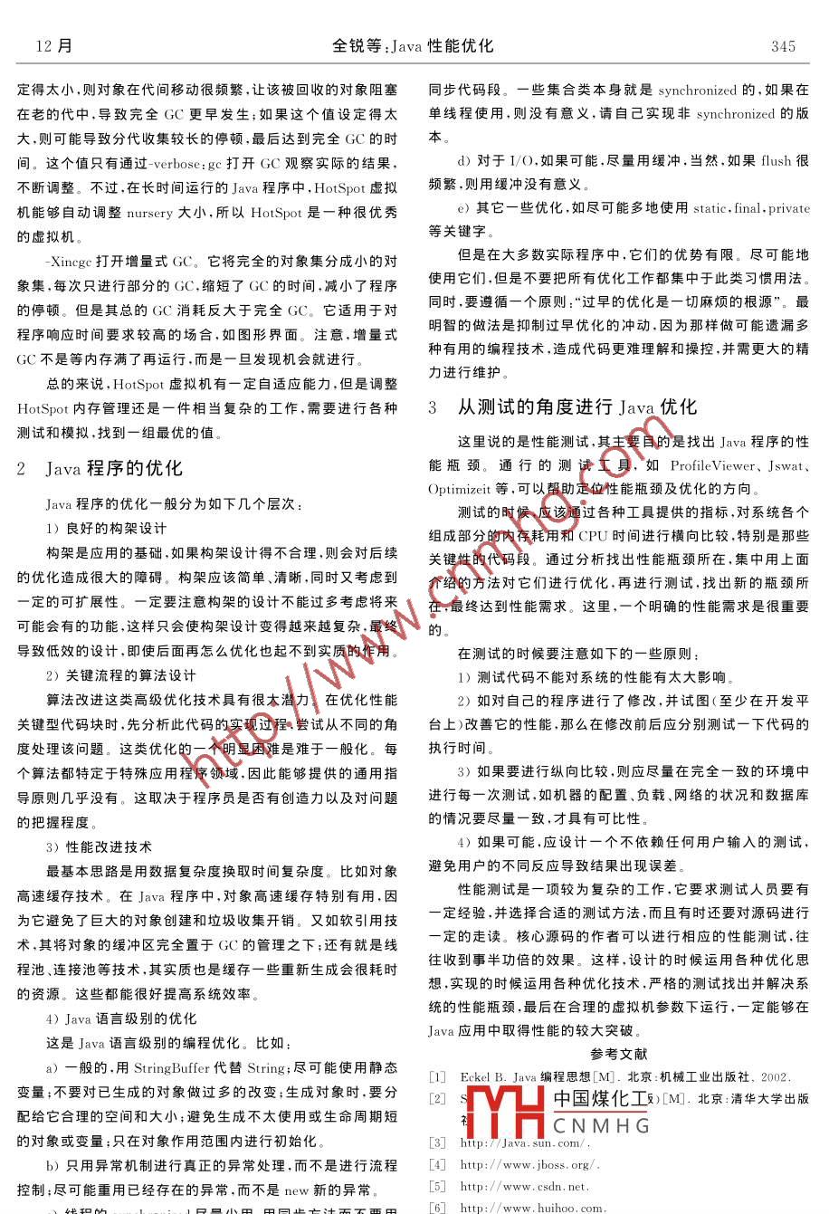 第23卷計算機應(yīng)用.Vol.232003年12月Computer ApplicationsDec., 2003文章編號:1001 - 9081(2003)12Z - 0344- 02Java性能優(yōu)化全銳,蘆東昕,謝世波,方 馬(中興通訊股份有限公司成都研究所,四川成都610041)摘要:性能問題一直是Java無法回避的一一個弱點。然而造成性能低下的原因除了Java本身的實現(xiàn)外,很多時候是由于應(yīng)用沒有優(yōu)化地使用Java造成的。從虛擬機、應(yīng)用編程和測試三方面分析如何進行Java優(yōu)化,指導(dǎo)進行高效的Java應(yīng)用設(shè)計。關(guān)鍵詞:Java;性能;優(yōu)化中圖分類號: TP311. 52文獻標識碼:A面向?qū)ο蟮木幊棠J胶驼Z言本身的優(yōu)秀特征使Java成多介入內(nèi)存管理,但是這種簡單性也導(dǎo)致了不可控性,所以唯為眾多應(yīng)用開發(fā)的首選。任何事務(wù)都有兩面性:簡單、跨平-能夠做到的就是通過調(diào)整Java內(nèi)存參數(shù)進行-定的控制。臺、垃圾收集等的確減少了程序員的許多工作;然而一個設(shè)計可以調(diào)整如下的參數(shù):良好的Java程序,其性能表現(xiàn)往往不如-個完成同樣功能的-Xms and -Xmx.控制虛擬機內(nèi)存使用量;C或C++程序。這幾乎成為Java最大的一個弱點。但是在-verbose: gc,觀測GC運行的具體情況;Java程序中,大部分的性能問題并不在Java語言本身,而在-XX: NewSize,控制“幼稚園"(GC中的nursery概念)開于使用這種語言的方式和設(shè)計人員對性能問題的弱化,沒有始大小;掌握優(yōu)化使用Java語言的方法。-Xincgc and -Xnoincgc ,打開或者關(guān)閉增量式回收。注意:某些-X參數(shù)不是標準選項,可能在虛擬機將來的1 Java虛擬機的優(yōu)化版本中改變。對于簡單的小型程序,-般用“Java 主類”的方式來運行-Xms控制了虛擬器初始內(nèi)存大小,-Xmx控制了虛擬機程序。但如果是大型程序,特別是服務(wù)器端程序,對各種資源最大內(nèi)存大小。虛擬機開始的時候分配Xms內(nèi)存給應(yīng)用程消耗都比較大,這時就應(yīng)該注意Java虛擬機的參數(shù)了,其對序使用,-旦內(nèi)存的使用超過了Xms,則自動擴展內(nèi)存,直到程序運行有著至關(guān)重要的影響。Xmx,如果這時還有新的內(nèi)存需要,則要拋OutOfMemeory異1.1 Java虛擬機的選擇常了。Xms的值并不是隨便設(shè)定的,雖然其設(shè)定得很小沒有Java虛擬機主要有Classic.HotSpot虛擬機,其中很大的影響,內(nèi)存如果不足,最終都會擴展上去的,但是這種HotSpot虛擬機又分為Java HotSpot Client VM和Java擴展總會耗用一定的虛擬機資源。所以Xms最佳的設(shè)定是HotSpot Server VM。Classic 虛擬機是老的虛擬機,一般情比程序進入穩(wěn)定狀態(tài)后的內(nèi)存使用值略大一點。HotSpot 虛況下不再使用。擬機的Xms默認為2M,Xmx默認為64M。對于-些大型的HotSpot虛擬機是Sun最新的Java虛擬機,其重點突破程序這遠遠不能滿足。另外Xmx的設(shè)定之和(多個虛擬機了幾個關(guān)鍵性的技術(shù),從而獲得了杰出的性能:1)“運行中適時)一般不能超過物理內(nèi)存的80%,否則得不到很好的性能。配”編譯;2)方法內(nèi)置;3)改進和重新設(shè)計的對象布局;4)快速-verbose:gc詳細觀測GC是如何起作用的,幫助進行各且完全精確的垃圾回收;5)超快速線程同步。這些杰出的技種參數(shù)的設(shè)定。術(shù)突破使Java虛擬機的效率成倍提高。-XX:NewSize用來控制nursery 的開始大小。一般情況Java HotSpot Client VM是默認的HotSpot虛擬機,其下,即使現(xiàn)在的內(nèi)存使用小于Xms,也會有一定的GC,因為.適用于-般的客戶端程序和小型程序。JavaHotSpotServerHotSpot使用分代式GC。其基于一種合理的假設(shè):大多數(shù)的.VM是Sun在企業(yè)服務(wù)器環(huán)境中提供的快速、可靠的Java虛對象都是剛生成不久就死亡了。所以它并不是收集所有的內(nèi).擬機。-般的大型服務(wù)器端應(yīng)用應(yīng)該選擇這個虛擬機。存,而是將內(nèi)存分成-些代,當最年輕的代(即“nursery")滿1.2Java內(nèi)存參數(shù)的調(diào)整了以后,就進行-次部分的GC來回收這些不再使用的對象。在機器配置和Java虛擬機版本-定的情況下,影響Java這種中國煤化工得多,也快得多,其大大降程序性能最大的就應(yīng)該是Java內(nèi)存參數(shù)配置了。低了YHCN MH C提高了虛擬機的吞吐量。GC(垃圾收集)無疑是Java的一大優(yōu)點,程序員無須過在默認的情況下nursery為640K(Intel平臺),這個值如果設(shè).收稿日期:2003-10-16作者簡介:全銳(1976-),男,四川成都人.碩土,主要研究方向:電信網(wǎng)絡(luò)管理、電子政務(wù)J2EE;蘆 東昕(1971-),男,黑龍江哈爾濱人,博士后,主要研究方向:電信網(wǎng)絡(luò)管理、嵌入式系統(tǒng)、信息安全;謝世波(1973-),男 ,四川成都人,碩士,主要研究方向:電信網(wǎng)絡(luò)管理、嵌入式系統(tǒng);方馬(1973-).男,四川成都人,碩士,主要研究方向:電信網(wǎng)絡(luò)管理、嵌入式系統(tǒng)J2EE.12月全銳等:Java性能優(yōu)化345定得太小,則對象在代間移動很頻繁,讓該被回收的對象阻塞同步代碼段。-些集合類本身就是synchronized的,如果在在老的代中,導(dǎo)致完全GC更早發(fā)生;如果這個值設(shè)定得太單線程使用,則沒有意義,請自己實現(xiàn)非synchronized 的版大.則可能導(dǎo)致分代收集較長的停頓,最后達到完全GC的時間。這個值只有通過-verbose:gc打開GC觀察實際的結(jié)果,d)對于I/O,如果可能,盡量用緩沖,當然,如果flush很不斷調(diào)整。
