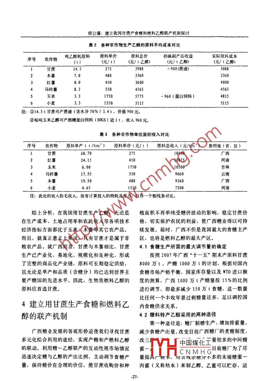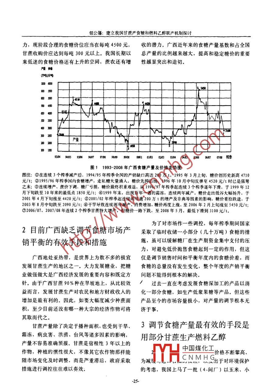 甘蔗糖業(yè)2008年第6期 Sugarcane and Canesugar2008年12建立我國甘蔗產(chǎn)食糖和燃料乙醇聯(lián)產(chǎn)機(jī)制探討鈕公藩(廣西糖業(yè)研究發(fā)展中心,南寧530001)摘要針對我國糖業(yè)長期存在糖價(jià)劇烈波動嚴(yán)重影響整個(gè)糖業(yè)健康有序發(fā)展這一重大的問題,提出廣西應(yīng)建立甘蔗產(chǎn)食糖和燃料乙醇聯(lián)產(chǎn)機(jī)制,自主調(diào)節(jié)食糖產(chǎn)量,控制糖價(jià)在一個(gè)合理的區(qū)間,使我國糖業(yè)發(fā)展實(shí)現(xiàn)長治久安。并提出了聯(lián)產(chǎn)方案、經(jīng)濟(jì)效益分析、相應(yīng)的政策措施和建議關(guān)鍵詞糖價(jià);調(diào)控;甘蔗;多元化利用;燃料乙醇經(jīng)常出現(xiàn)這樣的情況,廣西甘蔗豐產(chǎn),全國0前食糖增產(chǎn),糖價(jià)應(yīng)聲下跌。甘蔗稍一減產(chǎn),食糖供應(yīng)偏緊,糖價(jià)立即恢復(fù)至合理價(jià)位。如1999年近幾年來,廣西糖業(yè)的發(fā)展尤為迅猛,食糖12月22日-26日,我國南方甘蔗產(chǎn)區(qū)突遭大面產(chǎn)量已近全國總產(chǎn)量的三分之二,廣西的食糖產(chǎn)積霜凍災(zāi)害,帶來可預(yù)見的食糖減產(chǎn)達(dá)150萬t量不但左右廣西的糖價(jià),也極大地影響全國食糖糖價(jià)(每噸,下同)立即從一直低迷的1860元反市場。為了促使廣西蔗糖業(yè)的進(jìn)一步健康發(fā)展,彈至2500元,2個(gè)月后上升至3000元,到2000應(yīng)立即推進(jìn)甘蔗多元化利用,實(shí)施產(chǎn)糖和產(chǎn)燃料年8月底升至4100元,隨后,從2001/02年榨季乙醇的聯(lián)動機(jī)制,靈活、快速、自主調(diào)節(jié)食糖產(chǎn)起兩年增產(chǎn),糖價(jià)又重歸趺途,2003年8月中旬量,維護(hù)食糖市場的產(chǎn)銷平衡,恢復(fù)和穩(wěn)定合理跌至2000多元.到了2005/06年榨季,由于過去的糖價(jià),切實(shí)保護(hù)廣大農(nóng)民和制糖企業(yè)的利益,連續(xù)兩年干旱,以及消費(fèi)量的增加,在國際糖價(jià)使廣西糖業(yè)得以健康、協(xié)調(diào)、可持續(xù)發(fā)展的帶動下,糖價(jià)再度飚升,到2006年2月漲至5450元,隨后連續(xù)兩年甘蔗大增產(chǎn),廣西產(chǎn)糖從1調(diào)節(jié)食糖產(chǎn)量的重要性和緊迫年產(chǎn)50多萬噸躍至206107年榨季的100萬t,性糖價(jià)又跌至3785元,2007/08年榨季又劇增至900多萬噸,糖價(jià)最低跌到3100元(見圖1)自1991年我國食糖市場價(jià)格放開后,糖業(yè)存以2005/06年榨季為例,廣西產(chǎn)糖539萬t在的最大問題就是食糖產(chǎn)量無法調(diào)節(jié),產(chǎn)銷稍不這是糖價(jià)最高的一年,糖業(yè)的稅收為20億元,利平衡便使糖價(jià)波動很大。17年來,糖業(yè)發(fā)展幾經(jīng)潤為43億元,每噸糖的年均銷售價(jià)為4314元大起大落,糖價(jià)急劇波動。其間,白砂糖的年均而2006/207年榨季產(chǎn)糖708萬t,較之上一榨價(jià)格最低為毎噸1652元,最高為4814元,相差季增產(chǎn)近200萬t,稅利不增反降(稅為19.94竟達(dá)3倍。其中2000元以下有一年,2000-3000億元,利潤為42億元),每噸糖的銷售價(jià)為3785元有8年,300~400元有6年,4000元以上僅元,降低了530元。按708萬t糖量計(jì),銷售收有2年。糖價(jià)長期在低價(jià)位運(yùn)行,有5個(gè)榨季發(fā)人減少38億元如按2007/08年榨季的食糖產(chǎn)量生全行業(yè)虧損,出現(xiàn)大量蔗款白條,陷入了“糖及糖中國煤化工糖價(jià)的水平相比豐傷農(nóng)”的困境,極大地?fù)p害了蔗農(nóng),糖廠和地銷個(gè)CNMHG差額巨大方財(cái)政的利益。按照我國的物價(jià)總體水平和消費(fèi)者的承受能鈕公藩建立我國甘蔗產(chǎn)食糖和燃料乙醇聯(lián)產(chǎn)機(jī)制探討力,現(xiàn)階段合理的食糖價(jià)位應(yīng)當(dāng)在每噸4500元,收的潛力.廣西近年來的食糖產(chǎn)量基數(shù)和占全國甘蔗收購價(jià)應(yīng)達(dá)到每噸300元以上我國長期以總產(chǎn)量的比例越來越大,提高和穩(wěn)定糖價(jià)的重要來低迷的食糖價(jià)格還有上升的空間,蔗農(nóng)還有增性越顯突出和迫切09453996%胸9990001010000460500606m榨圖11993-2008年廣西食糖產(chǎn)量及價(jià)格走勢圖圖注:①在連續(xù)3個(gè)榨季減產(chǎn)后,1994/95年榨季全國的產(chǎn)銷缺口高達(dá)200萬t,1995年3月上旬,糖價(jià)創(chuàng)歷史新高470元/t;②1995/96年榨季國內(nèi)食糖增產(chǎn),走私糖大量涌人,糖價(jià)先抑后揚(yáng),1996年10月中旬反彈至4520元/t時(shí)已是強(qiáng)弩之末;③連續(xù)增產(chǎn)、蔗價(jià)下調(diào)、糖廠虧損,糖價(jià)最終積重難返,從1996/97年榨季起連續(xù)3個(gè)榨季逐年下滑,于1999年12月下旬跌至10年來的最低點(diǎn)1850元/t;④199年末,出現(xiàn)百年一遇的霜凍,連續(xù)兩年減產(chǎn),糖價(jià)走出低谷大幅揚(yáng)升,于2001年4月下旬漲至4420元/t;③2001/02年榨季起連續(xù)兩年逾200萬1的增產(chǎn)及非典等因素的影響,糖價(jià)重拾跌途,于2003年8月中旬跌至2090元/t;⑥干旱導(dǎo)致連續(xù)兩年減產(chǎn)、消費(fèi)增加,糖價(jià)再度上漲,至206年2月上旬漲至5450元/t;⑦2006/07、2007/08年連續(xù)2個(gè)榨季甘蔗特大增產(chǎn),但糖價(jià)一路下跌,至2008年5月,最低下滑到3100元/t為了對市場作一些調(diào)控,每年榨季期間國家2目前廣西缺乏調(diào)節(jié)食糖市場產(chǎn)采取了臨時(shí)收儲一小部分(幾十萬噸)食糖的措銷平衡的有效手段和措施施,雖可