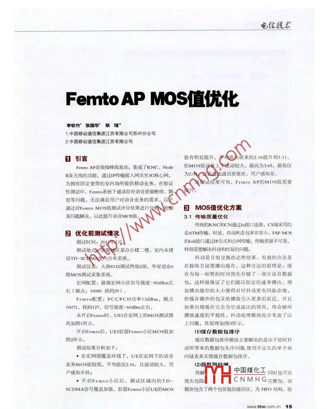 電信技術(shù)Femto AP MOS值優(yōu)化李欽竹’張國華’耿碹21.中國移動通信集團江蘇有限公司蘇州分公司2.中國移動通信集團江蘇有限公司0引言值有明顯提升,平均值由原來的2.16提升到3.11,Femto AP是微微蜂窩基站,集成了RNC、Node但MOS值評分上下波動較大,最高為3.65, 最低僅B及天線的功能,通過IP傳輸接入網(wǎng)關至3G核心網(wǎng),為2.08.這會造成通話質(zhì)量差,用戶感知差。為擁有固定寬帶的室內(nèi)場所提供移動業(yè)務。在驗證從測試結(jié)果可知,F(xiàn)emto AP的MOS值需要性測試中,F(xiàn)emto系統(tǒng)下通話存在語音質(zhì)量斷續(xù)、飄提升。忽等問題,無法滿足用戶對語音業(yè)務的需求。以下通過對Femto MOS值測試評分結(jié)果進行分析、挖掘3 MOS值優(yōu)化方案及問題解決,以此提升語音MOS值。3.1傳輸質(zhì)量優(yōu)化傳統(tǒng)的RNC和ICN通過1u接口連接,CS域采用的2優(yōu)化前測試情況是ATM傳輸,時延、抖動和丟包率非常小。FAP MOS測試時間: 2011年2月。的uh接口通過IP方式和公網(wǎng)傳輸,傳輸質(zhì)量不可靠,測試地點:密集城區(qū)某辦公樓二樓,室內(nèi)未建特別需要解決抖動和時延的問題。設TD- SCDMA室內(nèi)分布系統(tǒng)。抖動是分組交換的必然結(jié)果,有效的辦法是測試儀表:大唐8142測試終端2部,華星創(chuàng)業(yè)6在接收方設置播出緩存, 這種方法的原理是:緩路MOS測試采集系統(tǒng)。存為每一短暫的時間預先存儲了一部分語音數(shù)據(jù)宏網(wǎng)配置:最強宏網(wǎng)小區(qū)信號強度-90dBm左包,這樣就保證了它們能以恒定的速率播出。增右(頻點: 10080 擾碼29)。加播出緩存的大小使得對付抖動更有回旋余地,F(xiàn)emto配置: PCCPCH功率13dBm,頻點但緩 存額外的包又給播放引入更多的延遲,并且10071,擾碼127,信號強度- 60dBm左右。如果出現(xiàn)緩存完全為空或溢出的情況,將會破壞未開啟Femto時,UE1在宏網(wǎng)上的MOS測試情播放速度的平穩(wěn)性。抖動處理模塊綜合考慮了以況如圖1所示。上問題,其原理如圖3所示。開啟Femto后,UE1駐留Femto小區(qū)MOS值如(1)緩存數(shù)據(jù)包排序圖2所示。緩存數(shù)據(jù)包排序模塊主要解決的是由于延時抖測試結(jié)果分析如下:動所帶來的數(shù)據(jù)包失序問題,使用不定長的單個雙●在宏網(wǎng)弱覆蓋環(huán)境下,UE在宏網(wǎng)下的語音向鏈 表來實現(xiàn)緩存數(shù)據(jù)包排序。業(yè)務MOS值較低,平均值僅2.16, 且波動較大,用(2)靜默期檢洲戶感知不佳;●開啟Femto小區(qū)后,測試區(qū)域內(nèi)的TD - 現(xiàn)失包隱將解H中國煤化工同時也可實CNMHG完整包。該SCDMA信號覆蓋加強,駐留Femto小區(qū)UE的MOS模塊包含 了兩個包容量的緩存區(qū),為FIFO結(jié)構(gòu)。前www.ttm.com.cn 15