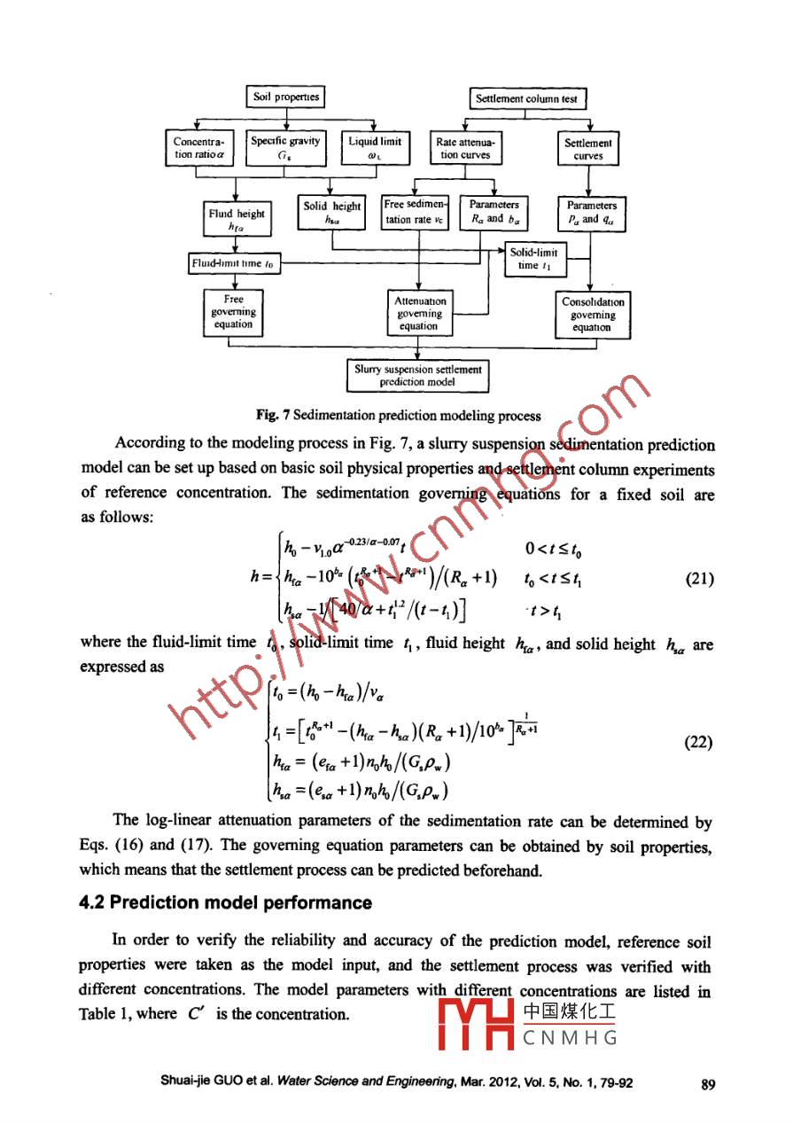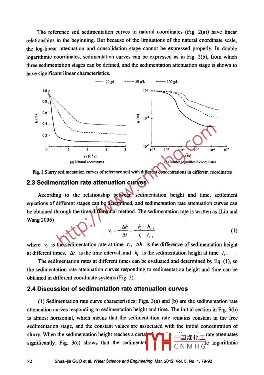 Water Science and Engineering, 2012. 5(1): 79-92doi:0882./.issn.1674-2370.2012.01.008http://www. waterjournal.cne-mail: wse2008@vip.163.comSettlement prediction model of slurry suspension based onsedimentation rate attenuationShuai-jie GUO*1l,2, Fu-hai ZHANG, Bao-tian WANGI',, Chao ZHANGI. Key Laboratory of Ministry of Education for Geomechanics and Embankment Engineering,Hohai University, Nanjing 210098, P. R. China2. Institute of Geotechnical Engineering, Hohai University, Nanjing 210098, P R. China3. Bureau of Hydrology, Changjiang Water Resources Commission, Wuhan 430012, P. R. ChinaAbstract: This paper introduces a slury suspension sttlement prediction model for cohesivesediment in a still water environment. With no sediment input and a still water environmentcondition, control forces between settling particles are significantly different in the process ofsedimentation rate attenuation, and the settlement process includes the free sedimentation stage,the log-linear attenuation stage, and the stable consolidation stage according to sedimentation rateattenuation. Setlement equations for sedimentation height and time were established based onsedimentation rate attenuation properties of different sedimentation stages. Finally, a slurrysuspension setlement prediction model based on slurry parameters was set up with a foundationbeing that the model parameters were determined by the basic parameters of slurry. The results ofhe settlement prediction model show good agreement with those of the settlement columnexperiment and reflect the main characteristics of cohesive sediment. The model can be applied tothe prediction of cohesive soil settlement in still water environments.Key words: cohesive sediment; sedimentation rate attenuation; slurry suspension; sttlementprediction model; settlement column experiment1 IntroductionSolid particles of slurry suspension in still water environments settle freely under gravity,forming a high-void ratio, high-water content, and high- compressibility soil (Yang and Zhang1997). The existence of a large amount of soil will cause serious bydraulic problems, such asriver and port deposition and dredging problems. The estuary and bay areas can be regarded asthe natural still water environment, which is favorable for the deposition of silt soil (Shi2004; Tsuneo et al. 2009). Pollutant enrichment in silt soil will also lead to seriousenvironmental problems. Therefore, research on the hydrostatic settlement process of solidparticles is urgently needed in bydraulic projects for flood control, dredging, andenvironmental protection.中國煤化工This work was supported by the Research Funds for the Cent.MHC N M H G9B13514) and theDoctoral Fund of the Ministry of Education of China (Grant No. 20100094110002).*Corresponding author (e-mail: 8sj@hhu.edu.cn)Received Feb.14, 2011; accepted Dec.28, 2011Sediment deposition in still water is classified as non-cohesive and cobesive settlementsaccording to the content of fine particles (Fei 1992). Interactions between particles are ignoredin non-cohesive settlement, and the settlement of particle obeys Stokes' law (Winterwerp 1998;Yang et al. 2003a). Due to the development of flocculation and influence of particle weight,different sedimentation stages can be defined in cohesive settlement, and the settlementprocess can be found by investigating the variation of interface. For the first stage, interactionscan be ignored as the particle settlement following Stokes' law due to the large distancebetween particles. When the particle distance reaches a certain limit, Stokes' law will not beapplicable due to the development of electrostatic forces and flocculation, which means thatflocculation needs to be introduced (Zhu et al. 2009; Yang et al. 2003b; Lin et al. 2007).Microstructure formation of flocs is subject to the law of fractal growth (Zhu et al. 2009; Maand Pierre 1998; Pierre and Ma 1999), and the attenuation of the interface sedimentation rateis log-linear. With the particle distance decreasing and effective stress coming into being, theconsolidation of soil begins (Xie and Leo 2004) and the sedimentation rate finally attenuatesto zero. .Numerous scholars have studied the sedimentation rate formula. Li et al. (2006)summarized current research on the interface sedimentation rate formula and concluded thatthe modified sedimentation rate formula for single particles and infiltration theory formula aretwo most meaningful ways. Li and Yang (2006) obtained fractal dimension values of flocsfrom microstructure pictures through laser scanning. Zhang and Xiong (1991) studied thesettlement and resistance characteristics of single particles with plastic sands of standard size.Yang et al. (2003a, 2003b) studied the influences of fine particle flocculation on the interfacesedimentation rate and provided a modified formula. Han (1997) conducted research on thedistribution of dry bulk density of soil along the sedimentation direction to predict the finalsedimentation height. Cook et al. (2004) developed a direct simulation equipment to test thesettlement characteristics of partial-fluid systems. Fox et al. (2005) and Fox (2007) researchedthe characteristics of mud soil based on the large strain consolidation theory and carried outmany experiments with a centrifuge.The research mentioned above mainly focuses on the initial free sedimentation stage orsome indicators of consolidation rather than the entire settlement process. Slurry settlement,from non-Newtonian fluid status to steady consolidation status, is a complete process.Therefore, it is necessary to determine the sedimentation rate attenuation of the wholesettlement process. Different sedimentation rate attenuation equations were established for thecorresponding sedimentation stages in this study. The time-integrated sedimentation rateequations are the control equations for the sedimentation stages, and the equation parametersare determined by the sedimentation rate attenuation paramet