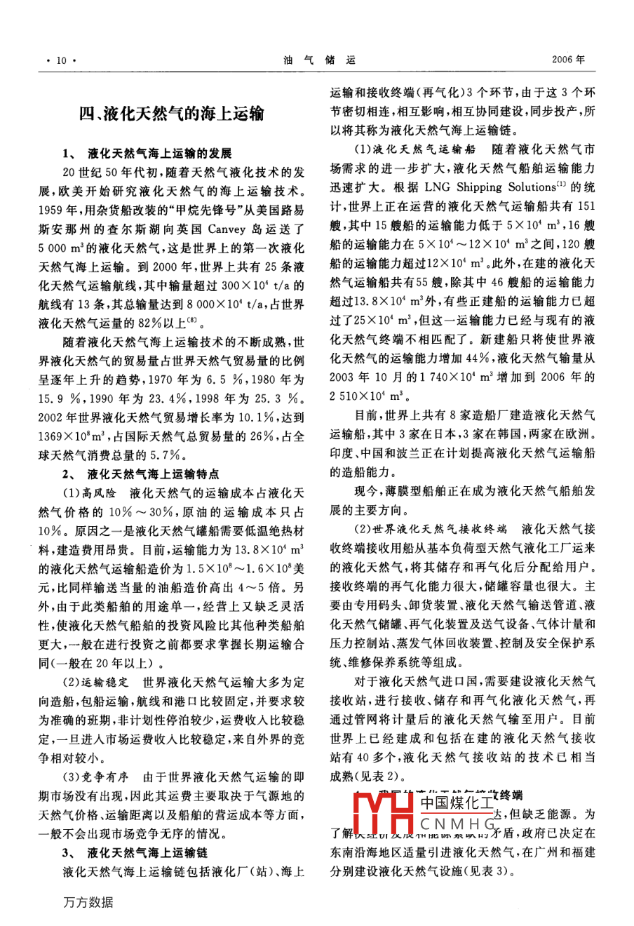 油氣儲(chǔ)運(yùn)液化天然氣的輸方式及其特點(diǎn)徐孝軒·陳維平余金懷(中國石油大學(xué)(北京))(中石化清江石油化工有限責(zé)任公司)徐孝軒陳維平等:液化天然氣的運(yùn)輸方式及其特點(diǎn),油氣儲(chǔ)運(yùn),2006,25(3)6~11摘要從液化天然氣產(chǎn)業(yè)供應(yīng)鏈的角度討論了液化天然氣的管道輸送、公路罐車運(yùn)輸和海上液化天然氣船舶運(yùn)輸?shù)募夹g(shù)特點(diǎn),首次提出了液化天然氣管道密相輸送工藝技術(shù)及其經(jīng)濟(jì)可行性。分析了液化天然氣公路運(yùn)輸鏈中液化、儲(chǔ)存、運(yùn)輸、再氣化等環(huán)節(jié)的關(guān)鍵技術(shù),以及國內(nèi)外海上液化天然氣運(yùn)輸鏈各個(gè)環(huán)節(jié)的技術(shù)特點(diǎn)。針對中國液化天然氣工業(yè)的發(fā)展現(xiàn)狀,指出中國液化天然氣工業(yè)發(fā)展的前提是建立完善的能源政策。隨著廣東、福建等東部沿海地區(qū)液化天然氣項(xiàng)目的逐步發(fā)展,中國液化天然氣工業(yè)發(fā)展前景廣闊主題詞液化天然氣運(yùn)輸方式液化天然氣占全球天然氣消費(fèi)量的6%,占國際天全球液化天然氣貿(mào)易現(xiàn)狀然氣貿(mào)易量的26%。預(yù)計(jì)到2007年,液化天然氣在天然氣市場的份額將上升到9.5‰液化天然氣在運(yùn)輸、儲(chǔ)存及調(diào)峰方面具有獨(dú)特目前,印度尼西亞是全球最大的液化天然氣出的優(yōu)越性,近年來,世界液化天然氣工業(yè)發(fā)展迅猛,口國,占世界液化天然氣出口總量的26%,日本則液化天然氣已成為世界上貿(mào)易量增長最快的一次能是世界最大的液化天然氣進(jìn)口國,其液化天然氣進(jìn)源。據(jù)BP公司2002年的統(tǒng)計(jì)數(shù)據(jù),世界液化天然口量超過720×10°m2/a,占世界液化天然氣進(jìn)口氣總貿(mào)易量已從1964年的8×10t上升到2001年總量的53%。中東和非洲的液化天然氣出口份的10.359×108t,年均增長率高達(dá)22%。過去額也在不斷增長,亞洲則是液化天然氣主要進(jìn)口地10年間,全球液化天然氣貿(mào)易量增長了80%。區(qū)(見表1)隨著我國能源戰(zhàn)略的調(diào)整,東南沿海液2002年全球共銷售液化天然氣1.24×10°t,全球化天然氣項(xiàng)目的不斷建設(shè),我國液化天然氣工業(yè)將液化天然氣的市場規(guī)模為250×108美元。2002年得到較快的發(fā)展23, Tronconi E t Prediction of slug frequency in horizontal two博士論文,2000phase slug flow, ALChEJ, 1990(36)29,劉磊周芳德:油氣水三相流中的復(fù)雜相態(tài)及壓力降的研24, Aziz K et al: Intermittent two phase flow in horizontal pipes究,工程熱物理學(xué)報(bào),2001,22(6)predictive models, Can, J. Chem. Eng, 1978(56)30, Bonizzi M, Issa R I: On the simulation of three- phase slug25, Taitel Y, Barnea D and Brill J P, Stratified three phase flow inflow in nearly horizontal pipes using the multi-fluid modelpipes, Int. J, Multiphase flow, 1995(21)Int. J, Multiphase flow, 2003(26).26,張西民郭烈錦等:水平圓管內(nèi)油氣水三相摩擦阻力的模型與32, Odori U A: Three-phase gas/ liquid/ liquid slug flow,PhD結(jié)構(gòu)關(guān)系式,西安交通大學(xué)學(xué)報(bào),1999,33(1)中國煤化工27,張西民郭烈錦等:水平圓管內(nèi)油氣水三相流摩擦阻力模型與結(jié)構(gòu)關(guān)系式,西安交通大學(xué)學(xué)報(bào),1999,33(3)CNMHG稿日期:20050413)28,章龍江:油氣水三相管流流型及水力計(jì)算方法研究,石油大學(xué)編輯:劉春陽102249,北京市昌平區(qū)中國石油大學(xué)(北京)石油天然氣工程學(xué)院油氣儲(chǔ)運(yùn)工程系多相流實(shí)驗(yàn)室;電話:(010)89733557第25卷第3期徐孝軒等:液化天然氣的運(yùn)輸方式及其特點(diǎn)表1進(jìn)口液化天然氣國家和地區(qū)的需求量預(yù)測需要建設(shè)液化天然氣加壓泵站和冷卻站。各進(jìn)口國家和地區(qū)對液化天然氣的需求量2進(jìn)入管道的是飽和液化天然氣液體,由于管道時(shí)間(104t)沿線溫度的影響,液化天然氣易受熱,其中一部分會(huì)日本韓國中國臺灣被氣化,使管道內(nèi)形成兩相流動(dòng),這不僅增大了沿線1995年43002000阻力,而且還會(huì)產(chǎn)生氣體段塞流動(dòng)現(xiàn)象,嚴(yán)重影響管2000年道的輸送能力和安全運(yùn)行。因此,對于低溫液體輸2005年59001800送管道,特別是長距離管道,要防止液體氣化,就必2010年640024001200須實(shí)現(xiàn)液體單相流動(dòng)。而防止液化天然氣氣化的方法需要采用密相輸送工藝,即將管道的操作壓力控液化天然氣產(chǎn)業(yè)鏈?zhǔn)且粋€(gè)資金龐大技術(shù)密集制在臨界冷凝壓力之上,管道內(nèi)流體溫度控制在臨的完整鏈系,包括上游天然氣的開采、液化、儲(chǔ)存、運(yùn)界冷凝溫度之下,使得管道運(yùn)行工況位于液相密相輸和裝卸、液化天然氣再氣化、銷售等環(huán)節(jié),產(chǎn)業(yè)鏈區(qū)(見圖2)。中任何一個(gè)環(huán)節(jié)的斷裂都將導(dǎo)致其他主要環(huán)節(jié)的連鎖反應(yīng)(見圖1)。液相密相區(qū)天然氣開采用戶天然氣氣化臨界點(diǎn)臨界冷凝壓力(陸上/海上天然氣液化天然氣氣液兩相區(qū)臨界冷凝溫度預(yù)處理/液化罐車運(yùn)輸儲(chǔ)存液七天然氣液化天然氣液化天然氣儲(chǔ)存液化天然氣裝卸管道運(yùn)輸溫度液化天然氣圖2典型的天然氣相包線圖圖1液化天然氣產(chǎn)業(yè)鏈原理流程此外,為降低因流動(dòng)摩擦和過泵剪切引起的
