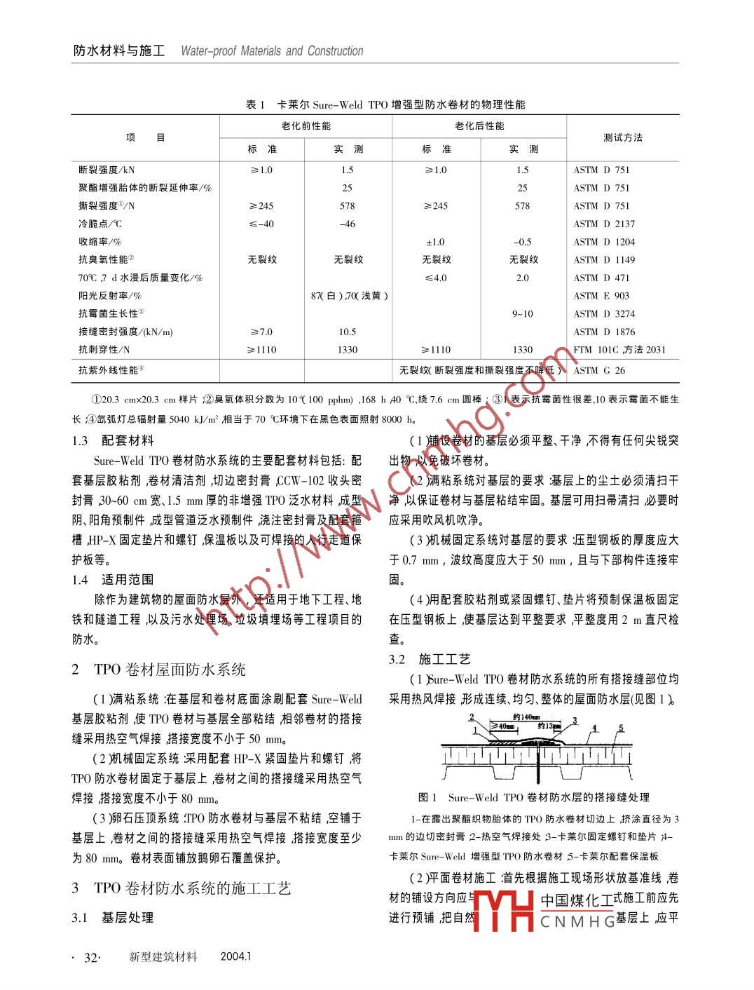 Water- proof Materials and Construction防水材料與施工熱塑性聚烯烴卷材屋面防水系統(tǒng)葉軍北京卡萊爾防水材料有限公司北京100076)摘要熱塱性聚烯烴防水卷材具有橡膠的柔性和塑料的可焊接性采用熱風(fēng)焊接方法施工不受氣候影響防水層整體密封性好。介紹該防水卷材的特性、適用范圍及其施工工藝特別介紹了該防水卷材在防水立面收頭、陰陽角和管道根部處的細(xì)部處理關(guān)鍵詞熱塑性聚烯烴防水卷材渥面防水系統(tǒng)施工中圖分類號(hào)TU573文獻(xiàn)標(biāo)識(shí)碼文章編號(hào):1001-702X(20041-0031-040概述1卡萊爾Sure- Weld tpo防水卷材熱塑性聚烯烴材料(以下簡(jiǎn)稱TPO)以特殊的聚合技術(shù)1.1特點(diǎn)為基礎(chǔ)使其同時(shí)具有乙丙橡膠的柔性和聚丙烯塑料的可焊(1≥多種規(guī)格。厚度10-2.5mm寬度205-4m長(zhǎng)度為接性綜合性能優(yōu)異。30.5自1989年起,人們開始利用TPO材料替代其它熱焊接2)有乙丙橡膠的物理性能和聚丙烯的可焊接性接類的屋面防水材料。由于TPO防水卷材中含有紫外線吸收縫采用熱風(fēng)焊接方法施工操作簡(jiǎn)便、快捷即便在寒冷的冬劑、著色劑、阻燃劑以及其它特種添加劑使得TPO防水卷材季也易于施工。剝離強(qiáng)度高(超過母材本身強(qiáng)度),保證了防表現(xiàn)出了優(yōu)異的物理性能,同時(shí)材料本身也不受動(dòng)物油、烴水層的整體性。油、植物油以及微生物的影響。TPO防水卷材的施工方法簡(jiǎn)(3饜酯織物增強(qiáng)胎體提供了高強(qiáng)度、高抗刺穿性、高撕?jiǎn)戊`活可采用卵石壓頂、滿粘或機(jī)械固定等多種方法固定裂強(qiáng)度及高尺寸穩(wěn)定性(收縮率小于05%于基層上加上有多種顏色可供選擇特別符合業(yè)主對(duì)屋面(4)高、低溫(-46℃下彎曲不裂)耐候性優(yōu)異顏色顏色的要求因此TPO防水卷材在歐、美、日等發(fā)達(dá)國家的使穩(wěn)定耐污染。用越來越普及。在美國TPO防水卷材已逐漸占領(lǐng)熱塑性防(5〕耐臭氧、化學(xué)物品、動(dòng)植物油、烴油以及耐微生物侵水材料的市場(chǎng)2002年TPO防水卷材在美國的使用量超過蝕3000萬■。根據(jù)美國屋面工程協(xié)會(huì)NRCA)新的屋面市場(chǎng)(6顏色多樣。常用的有白色、淺黃色、綠色和灰色等。統(tǒng)計(jì)2002~2003年度TPO卷材在平屋面防水系統(tǒng)中的使用(7不含氯和溴等酸性物質(zhì)是非鹵化環(huán)保型材料符合量(包括新建和翻修屋面尼占到12.4%。美國的vOC(有機(jī)揮發(fā)物含量)要求。全美最大的TPO防水卷材生產(chǎn)商一卡萊爾公司出品的(8)不含增塑劑不會(huì)出現(xiàn)類似PVC防水卷材因增塑劑Sure- Weld tpo卷材以先進(jìn)的聚合技術(shù)把乙丙(EP橡膠遷移而變脆的問題。的耐久性、耐候性與聚丙烯的可熱焊接性有機(jī)地結(jié)合在(9)與其它大多數(shù)廠家產(chǎn)品相比胎體以上表面的TPO起。Sure- Weld tpo防水卷材分為增強(qiáng)型和非增強(qiáng)型2種,厚度較大。增強(qiáng)型TPO防水卷材最為常用其面層和底層之間有一層高10)幅卷材(最寬可達(dá)4m)防水層接縫數(shù)量少大強(qiáng)度的聚酯織物作為胎體,聚酯織物與TPO的結(jié)合使TPO大降低滲漏水隱患而且節(jié)約勞動(dòng)力和材料防水卷材具有很高的斷裂強(qiáng)度、撕裂強(qiáng)度和抗刺穿性這些(11)卷材表面光滑陽光反射率高節(jié)能能有效減少城性能對(duì)于卵石壓頂和機(jī)楲固定屋面系統(tǒng)非常關(guān)鍵。市熱島效應(yīng)。(12)可回收利用既符合環(huán)保要求又不會(huì)對(duì)再生TPO收稿日期2003-11-20卷材的性能有任何影響作者簡(jiǎn)介葉軍男1968年生工程師。地址北京市豐臺(tái)區(qū)久敬莊1.2物理性能中國煤化工路甲1號(hào)電話⑩10-67964998-122卡萊爾SuHCNMHG性能見表1。NEW BUILDING MATERIALS31防水材料與施工Waer- proof Materials and Construction表1卡萊爾Sure- Weld TPo增強(qiáng)型防水卷材的物理性能老化前性能老化后性能斷裂強(qiáng)度/kNASTM D 751聚酯增強(qiáng)胎體的斷裂延伸率/%ASTM D 751撕裂強(qiáng)度①/N≥245≥24578ASTM D 751冷脆點(diǎn)/℃STM D 2137收縮率/%抗臭氧性能2無裂紋無裂紋無裂紋無裂紋ASTM D 114970℃7d水浸后質(zhì)量變化/%≤4.0陽光反射率/%87(白)70淺黃)ASTM E 903抗霉菌生長(zhǎng)性9-10ASTM D 3274接縫密封強(qiáng)度/kN/m)ASTM D 1876抗刺穿性/N≥l110≥II101330FTM101C方法2031抗紫外線性能無裂紋斷裂強(qiáng)度和撕裂強(qiáng)度不降低) ASTM G26①20.3cmx20.3cm樣片②2臭氧體積分?jǐn)?shù)為10(100pphm),168hA0℃繞76cm圓棒;③1表示抗霉菌性很差,10表示霉菌不能生長(zhǎng)④氙弧燈總輻射量5040kJ/m2相當(dāng)于70℃環(huán)境下在黑色表面照射8000h1.3配套材料(1)設(shè)卷材的基層必須平整、干凈不得有任何尖銳突Sure- Weld tpo卷材防水系統(tǒng)的主要配套材料包括:配出物,以免破壞卷材套基層膠粘劑,卷材清潔劑切邊密封膏CCW-102收頭密(2滿粘系統(tǒng)對(duì)基層的要求湛層上的塵士必須清掃干封膏30-60cm寬、1.5mm厚的非增強(qiáng)TPO泛水材料成型凈以保證卷材與基層粘結(jié)牢固。基層可用掃帚清掃必要時(shí)陰、陽角預(yù)制件成型管道泛水預(yù)制件澆注密封膏及配套箍應(yīng)采用吹風(fēng)機(jī)吹凈。槽HP-X固定墊片和螺釘保溫板以及可焊接的人行走道保(3械固定系統(tǒng)對(duì)基層的要求壓型鋼板的厚度應(yīng)大護(hù)板等。于0