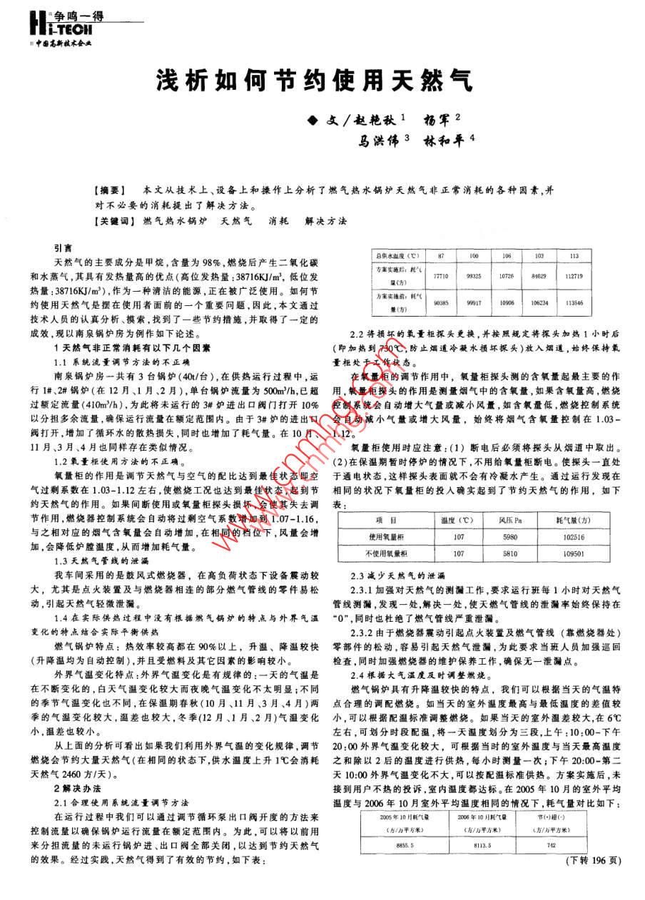 H需中高斷軾術(shù)會(huì)淺析如何節(jié)約使用天然氣◆文/趙艷秋1楊軍2馬洪偉3林和平4【擴(kuò)要】本文從技術(shù)上、設(shè)備上和操作上分析了燃?xì)鉄崴仩t天然氣非正常消耗的各種因素,并對(duì)不必要的消耗提出了解決方法【關(guān)鍵詞】燃?xì)鉄崴仩t天然氣消耗解決方法引言天然氣的主要成分是甲烷,含量為98%,燃燒后產(chǎn)生二氧化碳典水度(C和水蒸氣,其具有發(fā)熱量高的優(yōu)點(diǎn)(高位發(fā)熱量:38716KJ/m3,低位發(fā)方案實(shí)跑后:耗人0725112719熱量:38716KJ/m3),作為一種清潔的能源,正在被廣泛使用。如何節(jié)方案實(shí)前:耗氣約使用天然氣是擺在使用者面前的一個(gè)重要問(wèn)題,因此,本文通過(guò)技術(shù)人員的認(rèn)真分析、摸索,找到了一些節(jié)約措施,并取得了一定的成效,現(xiàn)以南泉鍋爐房為例作如下論述2.2將損壞的氧量柜探頭更換,并按照規(guī)定將探頭加熱1小時(shí)后1天然氣非正常消耗有以下幾個(gè)因素(即加熱到730℃,防止煙道冷凝水損壞探頭)放入煙道,始終保持氧1.1系統(tǒng)流量調(diào)節(jié)方法的不正確量柜處于工作狀態(tài)。南泉鍋爐房一共有3臺(tái)鍋爐(40/臺(tái)),在供熱運(yùn)行過(guò)程中,運(yùn)在氧量柜的調(diào)節(jié)作用中,氧量柜探頭測(cè)的含氧量起最主要的作行1#、2#鍋爐(在12月、1月、2月),單臺(tái)鍋爐流量為500m/h,已超用,氧量柜探頭的作用是測(cè)量煙氣中的含氧量,如果含氧量高,燃燒過(guò)額定流量(40m3/h),為此將未運(yùn)行的3#爐進(jìn)出口閥門(mén)打開(kāi)10%控制系統(tǒng)會(huì)自動(dòng)增大氣量或減小風(fēng)量,如含氧量低,燃燒控制系統(tǒng)以分擔(dān)多余流量,確保運(yùn)行流量在額定范圍內(nèi)。由于3#爐的進(jìn)出口會(huì)自動(dòng)減小氣量或增大風(fēng)量,始終將煙氣含氧量控制在1.03-閥打開(kāi),增加了循環(huán)水的散熱損失,同時(shí)也增加了耗氣量。在10月、1.12。11月、3月、4月也同樣存在類(lèi)似情況。氧量柜使用時(shí)應(yīng)注意:(1)斷電后必須將探頭從煙道中取出。1.2氧量柜使用方法的不正確。(2)在保溫期暫時(shí)停爐的情況下,不用給氧量柜斷電。使探頭一直處氧量柜的作用是調(diào)節(jié)天然氣與空氣的配比達(dá)到最佳狀態(tài)即空于通電狀態(tài),這樣探頭表面就不會(huì)有冷凝水產(chǎn)生。通過(guò)運(yùn)行發(fā)現(xiàn)在氣過(guò)剩系數(shù)在103-1.12左右,使燃燒工況也達(dá)到最佳狀態(tài),起到節(jié)相同的狀況下氧量柜的投入確實(shí)起到了節(jié)約天然氣的作用,如下約天然氣的作用。如果間斷使用或氧量柜探頭損壞,會(huì)使其失去調(diào)表節(jié)作用,燃燒器控制系統(tǒng)會(huì)自動(dòng)將過(guò)剩空氣系數(shù)增加到1.07-1.16溫度(℃)風(fēng)壓Pa耗氣量(方)與之相對(duì)應(yīng)的煙氣含氧量會(huì)自動(dòng)增加,在相同的檔位下,風(fēng)量會(huì)增使用氧量柜02516加,會(huì)降低爐膛溫度,從而增加耗氣量。不使用氧量柜l0950113天然氣管線的泄漏我車(chē)間采用的是鼓風(fēng)式燃燒器,在高負(fù)荷狀態(tài)下設(shè)備震動(dòng)較2.3減少天然氣的泄漏大,尤其是點(diǎn)火裝置及與燃燒器相連的部分燃?xì)夤芫€的零件易松23加強(qiáng)對(duì)天然氣的測(cè)漏工作,要求運(yùn)行班每1小時(shí)對(duì)天然氣動(dòng),引起天然氣輕微泄漏。管線測(cè)漏,發(fā)現(xiàn)一處解決一處,使天燃?xì)夤芫€的泄漏率始終保持在14在實(shí)際供熱過(guò)程中沒(méi)有根據(jù)然氣鍋爐的特點(diǎn)與外界氣溫“0”,同時(shí)也杜絕了燃?xì)夤芫€嚴(yán)重泄漏變化的特點(diǎn)結(jié)合實(shí)際平衡供熱2.3.2由于燃燒器震動(dòng)引起點(diǎn)火裝置及燃?xì)夤芫€(靠燃燒器處)燃?xì)忮仩t特點(diǎn):熱效率較高都在90%以上,升溫、降溫較快零部件的松動(dòng),容易引起天然氣泄漏,為此要求當(dāng)班人員加強(qiáng)巡回(升降溫均為自動(dòng)控制),并且受燃料及其它因素的影響較小。檢查,同時(shí)加強(qiáng)燃燒器的維護(hù)保養(yǎng)工作,確保無(wú)一泄漏點(diǎn)外界氣溫變化特點(diǎn):外界氣溫變化是有規(guī)律的:一天的氣溫是2.4根據(jù)大氣溫度及時(shí)調(diào)整熬燒。在不斷變化的,白天氣溫變化較大而夜晚氣溫變化不太明顯;不同燃?xì)忮仩t具有升降溫較快的特點(diǎn),我們可以根據(jù)當(dāng)天的氣溫特的季節(jié)氣溫變化也不同,在保溫期春秋(10月、11月、3月、4月)兩點(diǎn)合理的調(diào)配燃燒。如當(dāng)天的室外溫度最高與最低溫度的差值較季的氣溫變化較大,溫差也較大,冬季(12月、1月、2月)氣溫變化小,可以根據(jù)配溫標(biāo)準(zhǔn)調(diào)整燃燒。如果當(dāng)天的室外溫差較大在6℃小,溫差也較小。左右,可劃分時(shí)段配溫,將一天溫度劃分為三段,上午:10:00-下午從上面的分析可看出如果我們利用外界氣溫的變化規(guī)律,調(diào)節(jié)20:00外界氣溫變化較大,可根據(jù)當(dāng)時(shí)的室外溫度與當(dāng)天最高溫度燃燒會(huì)節(jié)約大量天然氣(在相同的狀態(tài)下供水溫度上升1℃會(huì)消耗之和除以2后的溫度進(jìn)行供熱,每小時(shí)測(cè)量一次;下午20.00-第二天然氣2460方/天)天10:00外界氣溫變化不大,可以按配溫標(biāo)準(zhǔn)供熱。方案實(shí)施后,未解決辦法接到用戶(hù)