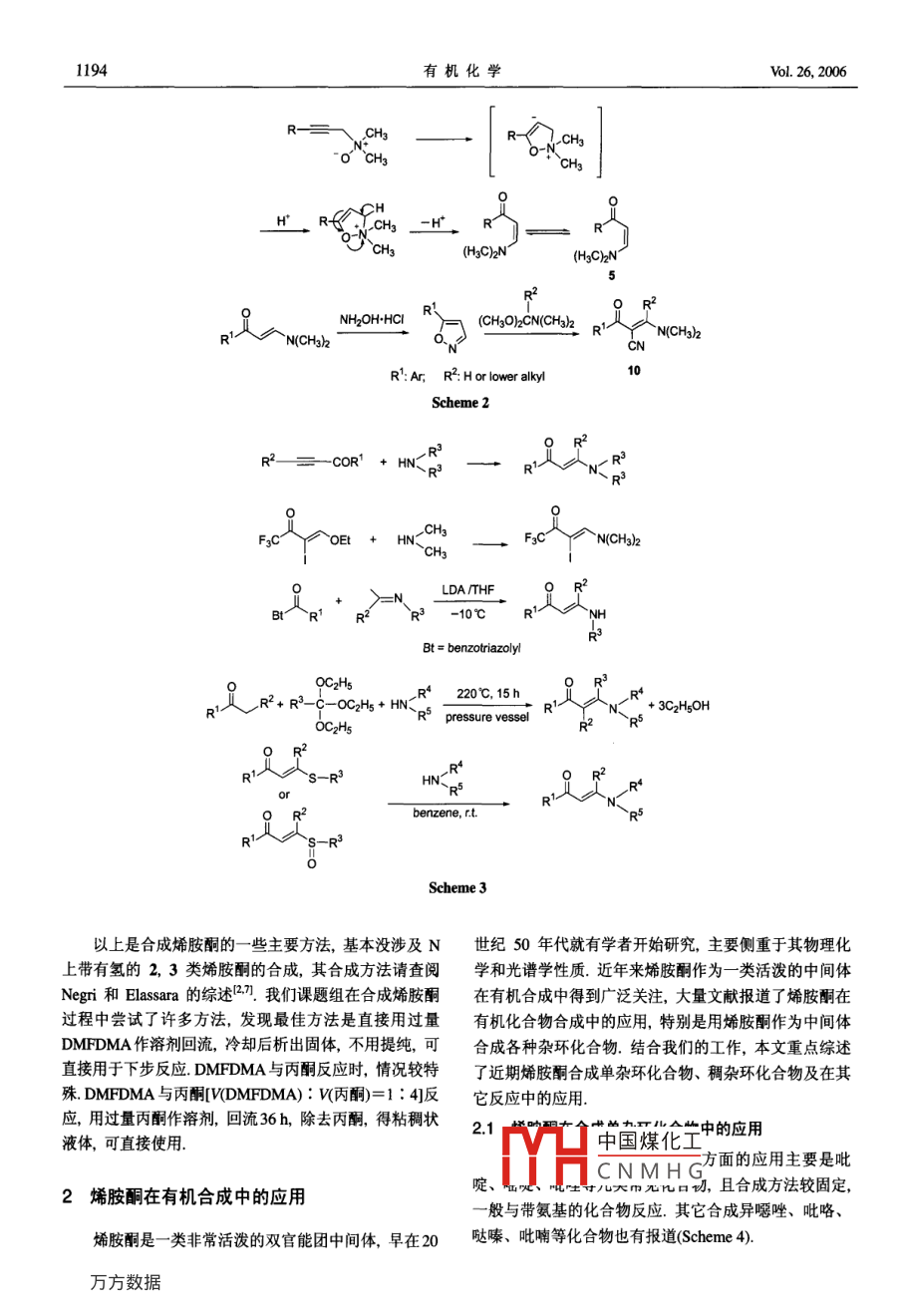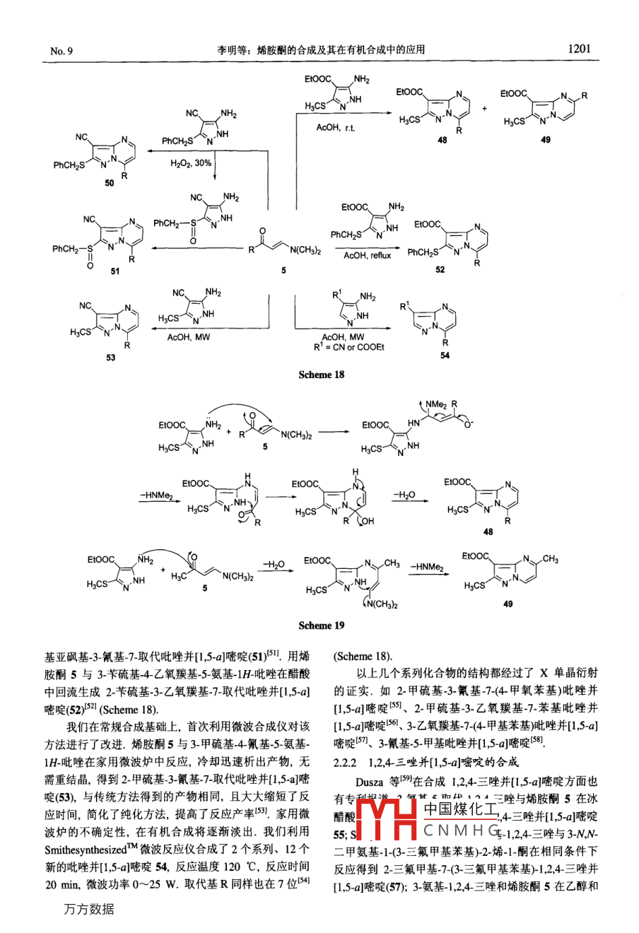 2006年第26卷有機化學Vol. 26, 2006第9期,1192~1207Chinese Jounal of Onganic ChemistryNo.9, 1192~1207.綜述與進展●烯胺酮的合成及其在有機合成中的應用李明*a郭維斯“文麗榮“楊華錚b("青島科技大學化學與分子工程學院青 島266042)(°南開大學元素有機化學國家重點實驗室天津300071)摘娶烯胺酮是 目前應用較為廣泛的有機合成中間體,對其合成及其作為中間體在有機化合物特別是雜環(huán)化合物的合成中的應用進行了綜述.關鍵詞烯胺酮; 合成;雜環(huán)化合物Synthesis of Enaminones and Their Utility in Organic SynthesisLl, Ming*GUO, Wei-Si°WEN, Li-Rong°YANG, Hua Zheng°( Cllege of Chemical and Molecular Technology, Qingdao University of Science and Technology, Qingdao 266042)( State Key Laboratory of Elemento-organic Chemistry, Nankai Universiy, Tanjin 30017Abstract Recently, the enaminones were widely used as intermediates, and the article mainly reviews thesynthesis of enaminones and the usage as intermediates in organic synthesis, epecilly heterocyclic synthe-sis.Keywords enaminone; synthesis; heterocyclic compound烯胺酮一詞由 Grenil首先提出,用于定義含N- C=C的1,3-二酮、B-酮酯或類似的1,3雙官能團化合物.廣義上講,就是含N- -C=C- C=0的化合物,t N(CH3)2CHLDA/THF0 R2-10C RNH3Bt = benzotriazolyl0CzHs,R220C, 15hR*.,R2+ R2-C-OCzHs+ HN<。5pressure vesselR1-+ 3C2HsOHOC2Hss-R3HN<"R4)rR1benzene, rt.R5Scheme 3以上是合成烯胺酮的一些主要方法, 基本沒涉及N世紀 50年代就有學者開始研究,主要側重于其物理化上帶有氫的2, 3類烯胺酮的合成,其合成方法請查閱學和光譜學性質.近年來烯胺酮作為-類活潑的中間體Negri和Elassara 的綜述27.我們課題組在合成烯胺酮在有機合成中得到廣泛關注,大量文獻報道了烯胺酮在過程中嘗試了許多方法,發(fā)現(xiàn)最佳方法是直接用過量有機化合物合成中的應用,特別是用烯胺酮作為中間體DMFDMA作溶劑回流,冷卻后析出固體,不用提純,可合成各種雜環(huán)化合物.結合我們的工作,本文重點綜述直接用于下步反應DMFDMA與丙酮反應時,情況較特了近期烯胺酮合成單雜環(huán)化合物、稠雜環(huán)化合物及在其殊. DMFDMA與丙酮[V(DMFDMA): V(丙酮)=1 :4]反它反應中的應用.應,用過量丙酮作溶劑,回流36 h,除去丙酮,得粘稠狀寧中的應用液體,可直接使用.中國煤化工方面的應用主要是吡dHCNMHG且合成方法較固定,啶、燦心、吡士寸兒大m無兒口切,2烯胺酮在有機合成中 的應用-般與帶氨基的化合物反應.其它合成異囈唑、吡咯、烯胺酮是一-類非?;顫姷碾p官能團中間體,早在20噠嗪、吡喃等化合物也有報道(Scheme 4).No. 9李明等:烯胺酮的合成及其在有機合成中的應用1195R4RR3^ NH2RNHNH2,R^R3pyridinespyrazolesN(CHghNH2OH R1CIl2C=C=0、R^ N(CHyhisoxazolesk2R1^ opyransR3R2 =NH,RNH .1)RN=NCHNH2.R3人N^R1(2) NCCH2R'pyrimidinespyridazinesScheme 42.1.1吡啶的合成Micheal 加成,二甲胺基離去,接著關環(huán),最后失水得產(chǎn)Troschitz等在烯胺酮合成吡啶方面做了大量工作.物,其余機理類似(Scheme 6).烯胺酮5與1,1-二氨基-2-硝基乙烯在氯苯中回流得2-氨烯胺酮在合成吡啶酮方面也有大量文獻報道.烯胺基-3-硝基-6-苯基吡啶(1)21,與1,1-二甲硫基-2-硝基乙酮5與醋酸胺于醋酸中回流0.5 h,就可二聚得到吡啶基烯或亞胺鹽酸鹽反應同樣得到2-氨基-3-硝基-6_取代吡酮158.早在1954年, KochetovI2)就報道了烯胺酮與氰啶(1)221.烯胺酮5與3~氨基-4,4-二乙氧基-2-丁烯酸酯基乙酰胺反應,生成2(1H)-吡啶酮16,取代基R為短鏈在乙醇和氯苯混合溶劑(體積比8: 2)中回流12 h得6-烴基,在吡啶環(huán)的6位; A1-Omran等切報道了類似反應,芳基-2二乙氧基-3~煙酸酯12)23),與1,3-二羰基化合物在醇鈉中得到R在6位的吡啶酮16,而在醋酸中則得到在蒙脫土K10催化下異丙醇中回流得2,3-二取代-6-芳基R在4位的吡啶酮17,取代基R為苯基或2~噻吩基;最吡啶13241.烯胺酮6與苯氧基磺?;┌吩谝掖贾谢亓鹘麷rasnayalzs]報道了另-方法, 2~取代-1-甲基烯胺酮與4 h生成2-氨基吡啶~-3~磺酸酯1425] (Scheme 5).氰基乙酸酯反應,迅速生成2(1H)-吡啶酮,甲基在6位以合成14為例,推測反應可能的歷程.首先發(fā)生(Scheme 7).,CooR?; .NO2COOR2EtO、EtO_NH2H2N'NH2R1~^ N0Et、C2HgOH, PhCl, refuxPhCl, refuxEt120R'^N(CH3)hNO2_NO2HzCs SCH3CoR?HgC員員R?^NH2~CH3 NH4OAc,.MKo. IPAHzCO^ NH213crNH3中國煤化工.MHCNMHGH2N^ NH2 + R'個^N(CHz)2reflux, 4hR1個N^ NH2614Scheme 51196有機化學VoL. 26, 2006_SOzPhH2N^ NiRRo。0^OPhR2_R-HN(CH3h~OPhNH2R'^N(CH>)kR'個N^ ^NH2RScheme 6NCCH2CONH2AcOHIAcONH4 R^> N(CH3)bR= lower alkyl5NCCH2CONH2, NaOEtNc-CH2~xCNR=Ph, 2-thienyAcOHX= CN or CONH217HgCN(CH3) + NCCH2COOR?40COR?1h18Scheme 7Alberola 等[2)用烯胺酮9和丙二腈反應,也得到了2(1H)-吡啶酮,但反應機理卻完全不同.首先丙二腈與(1)1-BuOK烯胺酮9發(fā)生共軛加成,脫去二甲胺基,接著環(huán)合成2-r .N(CHsh吡喃2-亞胺,最后經(jīng)開環(huán)得到不飽和酰胺,再關環(huán)得到o(2)AcOH/AcONH42(H)-吡啶酮19 (Scheme 8).一個非常有趣的合成線形 三吡啶配體20的方法是1)用吡啶基烯胺酮與2-乙酰吡啶在醋酸胺參與下反應[0(Eq. 1).2.1.2嘧啶的合成應得到的嘧啶23可作為ATP抗體CDK2的抑制劑3;,烯胺酮合成嘧啶類化合物主要是與各種胍類化合烯胺酮5與苯甲脒在吡啶中回流3h生成2-苯基嘧啶24,物反應。反應機理與上述關吡啶環(huán)相似,先發(fā)生取代基R為香豆素圖.Micheal加成,二甲胺基離去,然后關環(huán)失水得產(chǎn)物.烯胺酮6與(取代)硝酸胍反應,在甲醇和氫化鈉條烯胺酮5與4~硝基苯胍鹽酸鹽在氫氧化鈉和異丙醇件下室溫反應2h,得2.氨基