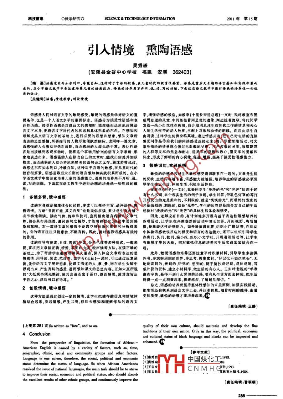 科技信息O外語論壇OSCIENCE & TECHNOLOGY INPORMATION2011年第15期The Analysis of African- American English楊明霞1唐秀峰2袁媛3(1.曲阜師范大學(xué)外國語學(xué)院山東曲阜273100;2. 曲阜師范大學(xué)外語教研部山東曲阜273100;3.泰山醫(yī)學(xué)院外國語學(xué)院山東泰安271000)[擠要]美國黑人英語作為英語中最重要的種族變體,以其獨(dú)特的語音 、詞匯、語法等特點(diǎn)與標(biāo)準(zhǔn)莢語存在較大的區(qū)別黑人英語的形成是由多種因素引起的,它受到時間、地域、種族.社會和社會集團(tuán)等因素的制約,形成了具有自己特色的一種語言形式.[關(guān)鍵詞]黑人英語;標(biāo)準(zhǔn)英語;種族變體1 Introduction3.1.2 Phonetic varistion on vowels(1)The confusion of lil and le: Blacks seldom make the diferenceAfrican-American English is a variant of English, users are mostlybetween 1i/ and lel. For example, "pin" /pin/ is read /pen/, "tin" /in/ islower African Americans living in the community. Looking the African-American English a8 inferior is a social concept based on nacialread /ten/. The pronunciationof the vowels is identical with each other,discrimination and this social concept is inconsistent with linguistics. Thewhich is pronounced as the sound between Iiv and lel.(2)In the dialect of African-American English, the double vowe!voice,morphologyntax and voceabulary eysem of African -Americanis the pure blending sound, not is the gliding sound. For example,English is significantly diferent from the charateristics of Standard"right"/rai/ is read as /ret, “my" /mai 1 is read as /maw.English, however it is consistent with principle of "language is a system.2 African- American English in Grammatical Variationof rule".The most obvious and fundamental difference between African -2 The Definition of African- American EnglishAmericanEnglish and StandardAmerican English is the granmarstructure. Grammar is the moet constant and most different part. TheThe words "African -American English" wereproduced in 1969. fllowing are the main features of African American English in granmerArican-American English usually refers to the English which is used inaspecl.the norhem cities, and it is aloo known a Blaeck Vemacular English,or 3.2.1 The replecement of adverbAfro-American Vemacular English. African-American English is not aIn the dialect of African-American English, some grammar featuresgeographical concept nor is the concept of race. Most of blaecks of are showm on the verb physical appearance. In Standard English, peoplemiddle -clags don't speak African - American English, and except 80usually use adverb to emphasize the action that took place at this time orpercent of African Americans speak African-American English, there ae the Continuous action. However, African-Ameican Englishuse "be" toalso some whites (especially the plantation owners in the Soutb), Puertoreplace the adverb. For example,Ricans in New York city and some Indians to speak African-AmericanAfrican-American EnglishStandard EnglishEnglish. Therefore, not all blacks speak Black English. But the peopleHe be studyingHe is studyingwho speak African-American English are majority blacks.3.2.2 The disappearance of“-g" inflection3 Features of Atrican- American Englishome blacks who live at the botton of society and have a loweconomic status omit“- a" sometimes, such as the plural noun, theThe voice, morphology, syntax and vocabulary systems of African- possessive noun and the third person singular verb. For example,American English are significantly diferent from the features of StandardMy mamma tlk all the time =My mamma tlks all the timeEngliah. However, it is consistent with the principle that "language is aHe dance well=He dances wellsystem of nules". African- American English is the result the cooperationWe see many student in the lasroom=We sce many students in theof language rules, there is clear system and self- regulation. The fllowing claesroomare the main features of Afnican- American English from the aspeet of the.2.3pronunciation, grammar and vocabulary.One very unique feature of African -American English is the3.1 African-American English in Phonetic Variationormission of linking verb or the auxiliary verb "be". If an action or state3.1.1 Phonetic variation on consonantsposesses a fixed time, or in the static situation, and nhot often oceurs or(1 )On the sound "“h"18/, Aincan-American English diferns from thereoccurs, then "be" in the sentence can be omitted. For example,Standard English in several aspects:African- American English Standard English(a)When Blacka speak the prefix voiceleas consonant“th" 10/, theyMary sick todayMary is sick todaypronounce“t" IHI. For example, the pronunciation of “thin" /0in/ is readThey walking nowThey are walking now齲/tin/, "thanks" /0exnks/ is read a /uegks/.This my sister- in-lawThis is my sister-in-law(b)In the blecks’ dilecl, the voiced consonant “h"/JwasYou too short for meYou are too short for mepronounced“d" ld. For example,“this" 1is/ is read as /dis,“that" 163.2.4 The use of "He"eV is reaed as /det.When African Americans use pronoun to stand for the gender, they(e)If the"th" is in the middle or end of the word, it was pronouncedusually use "he". "he" not only stand for positive gender, but also standuU. For example, "birthday" /b:0dei/ is read as /bafdei/, "nothing"/ n^Ofor the negative gender. For exarmple,in/ is read a8 /nAfig/, "mouth" /mau0/ is read as /maul/ ,"both" /bou0/ isHe a beautiful woman =She is a beautiful woman.read as /boud/.He my mother = She is my mother.(2)The oison of nv eound: Many Blackes often omit the middleor 33 Ani 1中國煤化工- riationending consonants nN. For example, "help" /help/ is read /hep/,“felt" 1GeneArican Americans is infelu is read Hietl, "tool" /tu:/ is read /tu:/,“coal" /kau/ is read kow/ and line withaction which is diferentso on.YHCNMHGetion”all 
