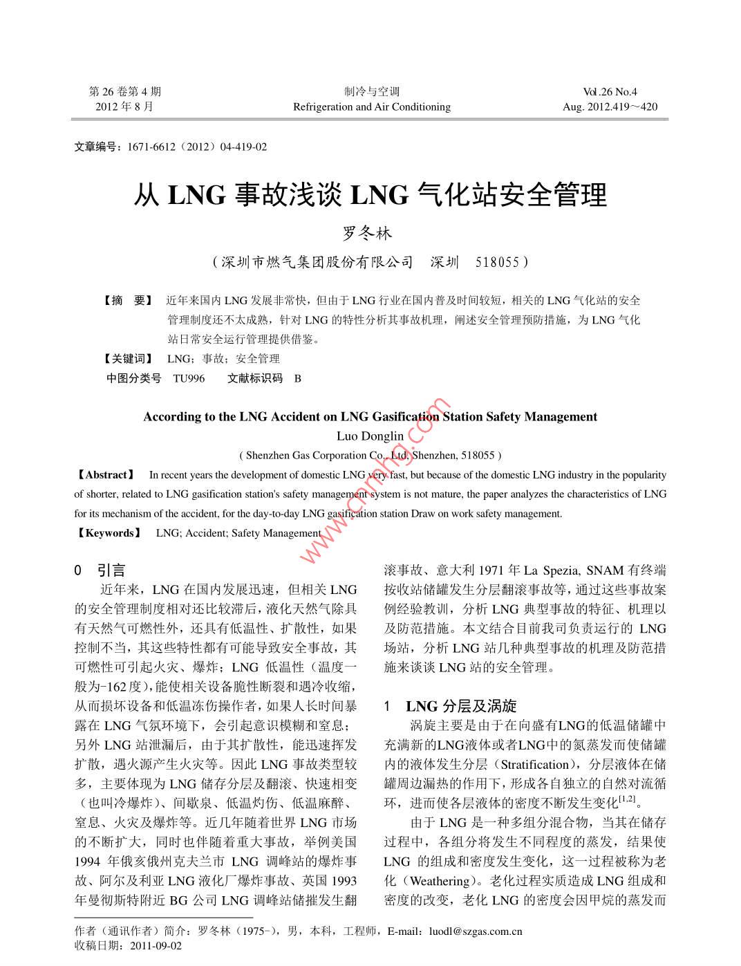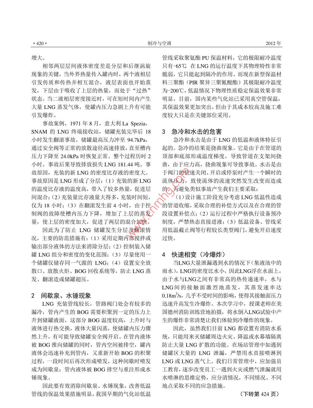 ●420.制冷與空調(diào)2012年增大。管線采取聚氨酯PU保溫材料,它的極限耐冷溫度相鄰兩層層間液體密度差是分層和后繼渦旋只有一-65°C在LNG的運(yùn)行溫度下其物理特性非?,F(xiàn)象的關(guān)鍵,當(dāng)外界熱量傳入罐內(nèi)時(shí),兩個(gè)液相層脆弱,它只能起到隔冷的作用。而現(xiàn)在新型保溫材引發(fā)傳質(zhì)和傳熱并相互混合,液層表面也開始蒸料三聚酯(PIR聚異三聚氰酸酯)其極限耐冷溫度發(fā),下層由于吸收了上層的熱量,而處于“過(guò)熱”為200"C,低溫情況下物理性質(zhì)穩(wěn)定保溫效果非常狀態(tài)。當(dāng)二液相層密度接近時(shí),可在短時(shí)間內(nèi)產(chǎn)生明顯。目前,國(guó)內(nèi)某些氣化站已采用真空管保溫,大量LNG蒸發(fā)氣體,使罐內(nèi)壓力急劇上升有可能其保溫效果更加突出,但由于其成本較高及施工難引發(fā)爆炸。度較大只是在關(guān)鍵部位采用。事故案例,1971年8月,意大利La Spezia,SNAM的LNG終端接收站,儲(chǔ)罐充裝完畢后18 3 急冷和水擊的危害小時(shí)發(fā)生翻滾事故。儲(chǔ)罐最高壓力沖至94.7kPa,急冷和水擊是由于LNG的低溫和液體特征引通過(guò)安全閥等正常的放散途徑高速排放,直至槽內(nèi)起的。急冷的結(jié)果是撓曲現(xiàn)象。它是由于在管道的壓力下降至24.0kPa時(shí)恢復(fù)正常。整個(gè)過(guò)程歷時(shí)2頂部和底部形成溫度梯度,導(dǎo)致管道在支架間撓小時(shí)。事故后果導(dǎo)致排放損失LNG 181.44噸。 事曲,由于應(yīng)力高,撓曲現(xiàn)象可導(dǎo)致事故。水擊是由故原因,充裝的新LNG的密度比存液的密度大。于閥門的快速關(guān)閉、開啟或停泵時(shí)產(chǎn)生一個(gè)瞬時(shí) 的事故原因是LNG形成了分層: (1) 充裝的新LNG流體壓力,致使流體的流速突然發(fā)生改變而造成的溫度比存液的溫度高,帶入了較多熱量,促進(jìn)層:的。為避免類似事故產(chǎn)生我們主要采取:間混合; (2)充裝量比存液量大得多,充裝時(shí)間短,(1)設(shè)計(jì)施工階段充分考慮LNG低溫性造成僅為18小時(shí); (3) 在翻滾發(fā)生前4小時(shí),由于控的管道收縮,采取合理的補(bǔ)償方式以及在合理的管制閥的故障使槽內(nèi)壓力下降,增加了上層的蒸發(fā)段設(shè)置補(bǔ)償點(diǎn); (2) 運(yùn)行過(guò)程中嚴(yán)格執(zhí)行設(shè)備預(yù)冷量,使上層的密度加大,促進(jìn)了兩層的混合加快。制度,嚴(yán)禁熱態(tài)直接進(jìn)液; (3) 低溫設(shè)備、管線采因此為了防止LNG儲(chǔ)罐發(fā)生分層及翻滾情用低溫截止閥等行程較長(zhǎng)類型閥門,避免開啟速度況,主要的防范措施有: (1)采用定期內(nèi)部攪拌或過(guò)快。輸出部分液體的方法來(lái)消除分層;(2)控制裝入儲(chǔ)罐LNG組分和密度的變化范圍; (3)盡量使用一4快速相變(冷爆炸)個(gè)儲(chǔ)罐僅儲(chǔ)存同- -氣源的LNG; (4) 設(shè)置安全放當(dāng)LNG大量泄漏遇到水的情況下(集液池中的散口、放散火炬、BOG回收系統(tǒng)等,防止LNG蒸雨水), LNG的密度比水小,因此LNG浮在水面上,發(fā)、翻滾造成儲(chǔ)罐超壓。由于水與LNG之間有非常高的熱傳遞速率,水與LNG間的接觸面激烈地蒸發(fā),其蒸發(fā)速率達(dá)2間歇泉、 水錘現(xiàn)象0.18m'/s,幾乎不受時(shí)間的影響,使得其接觸面壓力LNG充裝管線較長(zhǎng),管路閥門處會(huì)有較多的迅速升高發(fā)生冷爆炸。本次學(xué)習(xí)中,授課老師在美漏冷,管內(nèi)產(chǎn)生的BOG需要積聚到- -定的壓力上國(guó)德州消防訓(xùn)練營(yíng)地拍攝,將水倒入LNG試驗(yàn)中產(chǎn)升到儲(chǔ)罐液面,這部分BOG溫度較高,上升時(shí) 與生的爆炸非常清楚讓我們體驗(yàn)到冷爆炸的現(xiàn)象。液體進(jìn)行熱交換,液體大量閃蒸,使儲(chǔ)罐內(nèi)壓力驟因此,雖然我們目前LNG都設(shè)置有消防水系然上升,有可能導(dǎo)致儲(chǔ)罐安全閥開啟。在管內(nèi)液體統(tǒng),只能用來(lái)滅儲(chǔ)罐周邊火災(zāi)、降溫或水幕墻隔離被BOG推向儲(chǔ)罐的同時(shí),管內(nèi)空間被排空,罐內(nèi)防止大量LNG擴(kuò)散的功能。在場(chǎng)站管理中如遇到液體會(huì)迅速補(bǔ)充到管內(nèi),又重新開始BOG的積聚儲(chǔ)罐區(qū)大量的LNG泄漏,嚴(yán)禁用水直接噴淋到過(guò)程,- - -段時(shí)間后再次形成噴發(fā),這種間歇時(shí)噴發(fā)LNG或LNG蒸氣上。我們?nèi)粘9芾碇?,?yīng)加強(qiáng)員成為間歇泉;管內(nèi)液體被BOG排空與重注形成水工教育,逐步改變員工一-遇到火災(zāi)或燃?xì)庑孤┚陀缅N現(xiàn)象。水噴淋的思維定勢(shì),應(yīng)分清情況,不同情況、不同因此要有效消除間歇泉、水錘現(xiàn)象,改善低溫地點(diǎn)采取不同的應(yīng)急措施。管線的保溫效果措施明顯,我國(guó)早期的氣化站低溫(下轉(zhuǎn)第424頁(yè))●424.制冷與空調(diào)2012年有所降低。其中以普通玻璃和吸熱玻璃最為明顯,建筑工業(yè)出版社,2005.為單層玻璃時(shí)設(shè)計(jì)負(fù)荷的87%左右。5]董 智慧,劉凡,龐俊香.建筑窗墻比對(duì)辦公建筑冷(熱)負(fù)(3)在設(shè)計(jì)中應(yīng)綜合考慮窗戶的綜合遮陽(yáng)系荷的影響分析[J.建筑節(jié)能,2008,36(3):6 9.數(shù),靈活運(yùn)用內(nèi)、外遮陽(yáng)技術(shù),使冬、夏季空調(diào)耗6] 劉買花習(xí)蘭窗墻比對(duì)建筑空調(diào)能耗的影響[J].廣 西輕能量減少。工業(yè)2011.278):44 -48.7]