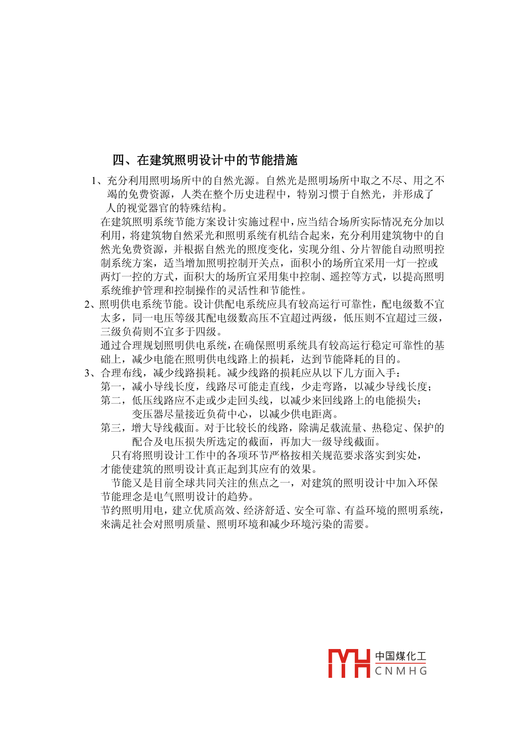 建筑照明與節(jié)能設計買買提依明·吾甫爾阿吉新疆建建筑科學研究院(有限責任公司)新疆烏魯木齊市830000摘要:電氣照明是電氣工程中一項主要的工作,尤其是對建筑來說,安全、經濟、適用的照明環(huán)境對人們的生活和生產都有著重要的作用,本文對建筑電氣工程中的照明設計和節(jié)能措施進行了探討關鍵詞:電氣工程建筑照明設計節(jié)能措施Abstract: The electric lighting is a main job in electrical engineering, especially for thepeople's life and production. This paper discussed the lighting design and energy saving measuresin the construction of electrical engineeringKeywords: Electrical Engineering; construction; lighting design; energy saving measures中圖分類號:TU113.6+4建筑照明工程是電氣工程中的重要組成部分,人們對建筑物使用的安全、經濟與適宜提出了更高的要求,建筑照明的環(huán)境與使用性質,選擇合適的光源、燈具等照明設備,并對照明設備的進行合理布局,在滿足照明空間的使用功能要求基礎上,設計出滿足現代人的建筑照明燈光效果的節(jié)能照明方案,有效降低建筑照明系統(tǒng)能源消耗,提髙建筑電氣照明系統(tǒng)設計的可靠性和經濟性為此,本文就建筑電氣照明設計質量要求進行了簡要的分析,在此基礎上重點討論了建筑照明設計和節(jié)能措施。照明設計質量要求、照度水平與均勻度。照明設計最基本的要求是建筑照明空間的照度滿足規(guī)定的要求,照度間接地反映了照明空間的光亮程度。照度太低容易造成視覺疲勞,影響視力健康;照度太高則容易刺激視覺感官而且會增加能耗另外還要考慮照度的均勻度,照度的均勻度定義為參考平面上的最小照度與平均照度之比。公共建筑的工作房間和工業(yè)建筑作業(yè)區(qū)域內的一般照明的照度均勻度不應小于0.7,而作業(yè)面鄰近周圍的照度均勻度不應小于0.5,房間或場所內的通道和其他非作業(yè)區(qū)域的一般照明的照度值不宜低于作業(yè)區(qū)域一般照明的照度位的1/3。、眩光要求。眩光是一種不舒服的視覺現象,會導致不舒服的生理和心理感覺,因此眩光是評價照明質量的指標之眩光用眩光值描述,對公共建筑和工業(yè)建筑,一般采用國際照明委員會(ClE)規(guī)定的統(tǒng)一眩光值來評價,對室外體育場所的不舒適眩光,常采用眩光值來進行評價。3、能耗指標節(jié)能是社會可持續(xù)發(fā)展的要求,在照明設計和評價中,要始終貫徹節(jié)能要求,必須嚴格執(zhí)行各類建筑的照明功率密度值,將能耗搗評價昭田設計的指標。中國煤化工CNMHG二、照明光源及燈具的選擇在作具體照明設計時,按照照明設計的質量要求,照明光源和燈具選擇應是重要的環(huán)節(jié)。設計時,在滿足顯色性、啟動時間等的要求下,應優(yōu)先用高光效光源節(jié)能燈。按照不同的工作場所的要求,采用不同種類的高效光源,達到節(jié)約能源的目的。燈具的主要功能是合理分配光源輻射的光通量,滿足環(huán)境和作業(yè)的配光要求并且不產生眩光和嚴重的光幕反射選擇燈具時,除考慮環(huán)境光分布和限制眩目的要求外,還應考慮燈具的效率,選擇高光效燈具。般公共建筑物內多采用半直接型,均勻擴散型燈具或熒光燈,使頂棚和墻壁均有一定的亮度,整個室內空間照度分布較均勻要求垂直照度時,可采用傾斜安裝的燈具,或選用不對稱配光的燈具,如教室黑板照明等。它具有減弱工作區(qū)反射眩光的特點,在一定的照度下,能夠大大改善視覺條件,獲得較高的效能三、選擇照度與照明方式1、照度的選擇。選擇照度是照明設計的重要問題,照度太低會損害工作人員的視力,高照度則浪費電力照度的計算是照明設計中不可或缺的環(huán)節(jié),其任務是依據所需照度值和其他條件來確定照明裝置類型及其布置、安裝場所各個面反射的條件及燈具污染等,最后正確估算出光源容量或是數量。室內的照度計算一般采用光通法和逐點法。在滿足標準照度的條件下為節(jié)約電力,應恰當地選用一般照明、局部照明和混合照明三種方式,種光源不能滿足顯色性要求時,可采用兩種以上光源混合照明的方式這樣既可提高光效,又能改善顯色性2、照明方式的選擇。如前文所述,照明方式可分為一般照明,局部照明和混合照明。在同一建筑場所內,其某部分工作區(qū)或某幾部分較大面積需要高照度時,常采用分區(qū)一般照明,以避免使其他工作區(qū)的照度提高,造成不必要的電能消耗。局部照明是在某個局部需要有較高的照度或由于遮擋的原因而使一般照明無法照射到的某些范圍內裝設。當需要減小工作區(qū)內的反射眩光成為加強某方增品質成時亦采取局部照明解決。中國煤化工CNMHG四、在建筑照明設計中的節(jié)能措施、充分利用照明場所中的自然光源。自然光是照明場所中取之不盡、用之不竭的免費資源,人類在整個歷史進程中,特別習慣于自然光,并形成了人的視覺器官的特殊結構。在建筑照明系統(tǒng)節(jié)能方案設計實施過程中,應當結合場所實際情況充分加以利用,將建筑物自然采光和照明系統(tǒng)有機結合起來,充分利用建筑物中的自然光免費資源,并根據自然光的照度變化,實現分組、分片智能自動照明控制系統(tǒng)方案,適當增加照明控制開關點,面積小的場所宜采用一燈一控或兩燈一控的方式,面積大的場所宜采用集中控制、遙控