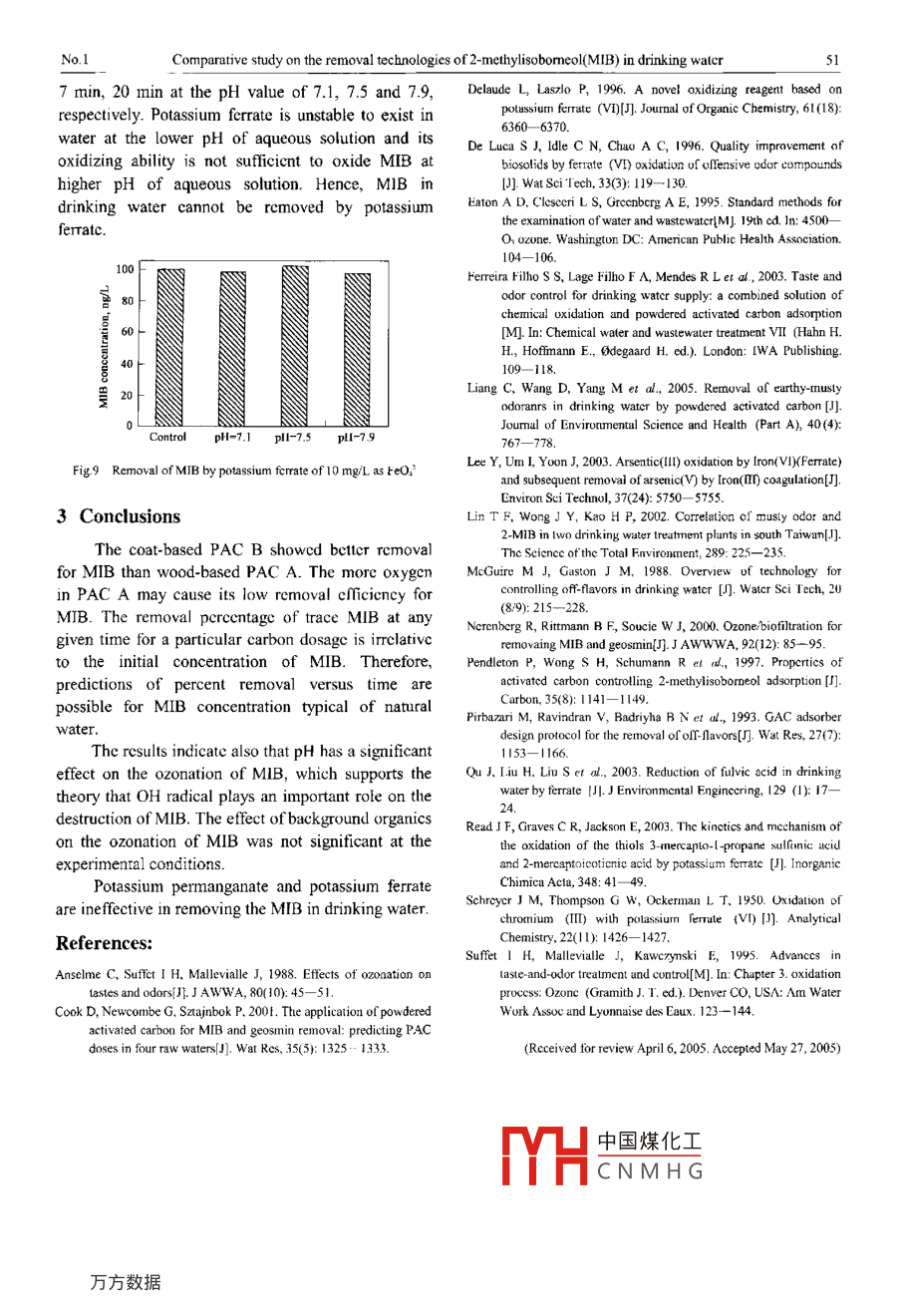 ISSN 1001- 0742Journal of Environmentad Sciences Vol. 18. No. l, pp. 47- -S1, 2006CNI!- 2629/XArticle ID: 1001-0742(2006)01-0047-05CLC number: 131.2Document code:AComparative study on the removal technologies of 2 methylisoborneol(MIB) in drinking waterLIANG Cun-zhen+2, WANG Dong sheng'", GE Xiao-peng', Y ANG Min', SUN Weil(1. State Key Laboratory of Environmental Aquatic Chemistry, Research Centcr for Eco-Environmental Sciences, Bejjing 100085, China. E-mail:sunwds@yaboo.com; 2. Department of Environmental Engineering, Beijing Institute of Pctrochenical Techinology, Beijing 102617, China)Abstract: Removal of 2-methylisobomeol (MIB) in drnking water by ozonc, powdered activated carbon (PAC), potassiumpemanganate and potassium ferrate was investigated. The adsorption kinetics of MIB by both wood-based and coat-based PACS showthat main removal of MIB occurs within contact time of 1 h. Compared with the wood-based PAC, the coat-bascd PAC evidentlyimproved the removal eficiency of MIB. The removal percentage of tracc MIB at any given time for a particular carbon dosagc wasirrelative to the initial concentration of MIB. A series of experiments wcre perfomed to determine the efect of 'pH on the ozonation ofMIB. The resuits show that pH has a significant eftet on the ozonation of MIB. It is conclusive that poassium pemanganatc andpotassium ferrate are ineffectivc in removing the MIB in drink ing water.Keywords: odor, MIB, ozonation; powdered activaled carbon; potassium permanganate; potassiumn ferratetechnologies of MIB,including PAC adsorption,Introductionozonation, potassium permanganate (KMnO4) oxid-Removing taste and odor compounds fromation and potassium ferrate (K2FeO4) oxidation, weredrinking water is a significant challenge for waterinvestigated.authorities worldwide. 2-Methylisobormeol(MIB) is an1 Materials and methodsimportant earthy-musty odorant in drinking water. Theodor threshold of MIB is as low as a few ng/L1.1 Reagents and materials(Pirbazari el ul.,, 1993). The conventional waterMIB was purchascd from Sigma- Aldrich Cotreatment process (coagulation, chlorination and sandUSA, and MIB stock solution of l mg/L was obtainedflration) is not effective to remove MIB (Anselme elby diluting the MIB solution with pure water. PAC A .al, 1988). The removal of MIB by powdered activatedand PAC B (Shanghai Activatcd Carbon Company,carbon (PAC) and ozone is applied in some waterChina) were wood-based and coat-bascd powderedplants (Lin el ul., 2002; Cook el al., 2001; Nerenbergactivated carbon, respectively. Potassium indigoel al, 2000). PAC has the flexibility to be applied astrisulfonate employed for dctermining the aqueousnceded, but it causes sludge removal and disposalozone concentration (Co) was purchased from Acrosproblem, the odor problem caused by MIB cannot be :Organics,Belgium. Potassium permanganate was offully resolved by PAC(Ferreira et al, 2003). The con-analytical grade. Potassium ferrate(K:FeO) was prep-cem of disinfection by-products (DBPs) has promptedared by hypochloritc oxidation of ferric nitratewater plants to consider the use of ozone as alternativeaccording to the method of Delaude and Laszlodisinfectant. The autodecomposition of ozone results(Delaude and Laszlo, 1996), giving a purity over 90%in the formation of OH radical. MIB is considered tofor thc recrystallized product. The purity wasbe susccptible to the attack by OH radical (Suffct et al,dctermincd by the chromite titration method(Schreyer1995). Hence, ozonation will be one of promisingel aul., 1950). The characteristics of the raw waterprocesses for the removal of MIB in drinking water,employed in the cxpcriments are shown in Table I.the study of interaction mechanism is of importance.1.2 Experimental methodsDrinking water quality in Xicun Water Plant,1.2.1 PAC adsorptionGuangzhou, has received complaints from customersA carbon slurry of 10 mg/ml prepared by mixingfor a long time for its unpleasant odors, however, no10 g of the oven-dried PAC in 1 L purc water wasevaluation of odor removal efficicncy for possiblyused中國煤化工。The adsoptionapplied processcs was conducted. MIB with aexpeshaker. In 500 mlconcentration up to 40 ng/L in raw watcr was found inbottleMYHC N M H Gth stock solution toXicun Water Plant. In this study, four kind of removalthe desired initial concentration. Cartbon was added byFoundation item: The Nutional Natural Science Foundation of China (No. 20577060) and the Hi- Tech Rescarch and Development Program (863) ofChina (No. 2002AA601 I20; 2002AA601140); * Corresponding author48LIANG Cun- zthen et al.Vol.18Table 1Characteristic of row waterwater with 2.5 mgL polyaluminum chloride(PACI) asAlkalinity, Hardness, Total organic Turbidiy,Al2O3. TOC of raw water and settled water was 4.61pHmg/L CaCO, mg/L CaCO3 carbon, mg/LNTUand 2.87 mg/L, respectively. Ozone stock solution was71-7.252-60110-130 4.5-4.9- 3.2-3.6_first obtained by bubbling ozone gas into pure water.aliquots of carbon slury. The bottle without theOzone was introduced by adding aliquots of the ozoneintroduction of carbon was used to determine thestock solution to obtain the desired ozone doses.initial concentration. These bottles were covcred withExperiments were conduced at 20C and pH 7. Thea PTFE-faced silicone septum and a screw cappH was stabilized with 50 mmol/L sodium phosphateSamples were then withdrawn at the predeterminedbuffer. After a 10-min O3 contact time, a part oftime intervals up to 240 min and were filtercd withsample was qucnched with Indigo reagent for theglass microfiber filters. The remaining concentrationmeasurement of the O3 residuai and the other sarmpleof MIB was determined immediately.was quenched by sodium sulfite for MIB analysis.1.2.2 Ozonation of MIB1.2.3 Potassium permanganate oxidationA series of experiments were performed toA stock solution of KMnO4 was prepared bydetermine the effect of pH on the ozonation of MIB indissolving crystal permanganate in pure water.a stainless-steel reactor(Fig. 