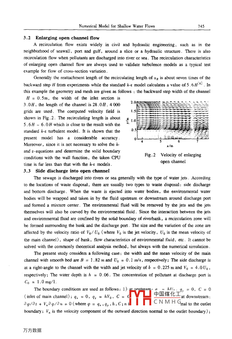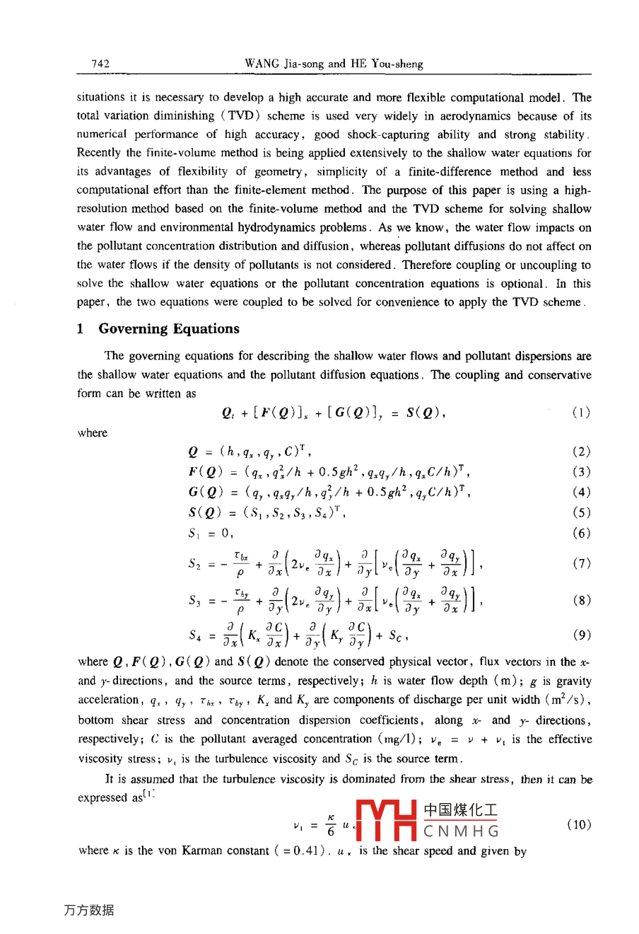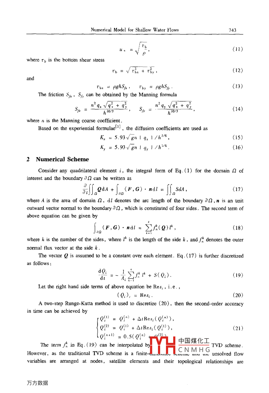 Applicd Mathemaiss and MechanicsPublished by Shanghai University,( English Edition, Vol 23,No 7, Jul 2002)Shanghai,ChinaArticle ID: 0253-4827(2002)07-0741-07HIGH-RESOLUTION NUMERICAL MODEL FOR SHALLOWWATER FLOWS AND POLLUTANT DIFFUSIONSWANG Jia-scng (王嘉松)',HE You-sheng (何友聲)2(1. School of Mechanic Engineering, Shanghai Jiaotong University,Shanghai 200030, P R China;2. Department of Engineering Mechanics , Shanghai Jiaotong University,Shanghai 200030, P R China)(Contributed by HE You-sheng)Abstract: A finite- volume high resolution numerical model for coupling the shallow waterflows and pollutant diffusions was presented based on using a hybrid TVD scheme in spacediscretization and a Runge- Kutta method in time discretization. Numerical simulations formodelling dam break,enlarging open channel flow and pollutant dispersion were implementedand compared with experimental data or other published computations . The validation of thismethod shows that it can not only deal with the problem involving discontinuities and wnsteadyflows,but also solve the general shallow water flows and pollutant diffusions.Key words: shallow water flow; pollutant diffusion; TVD scheme ; finite-volume method;numerical simulationCLC numbers: 035; TV131.4Document code: AIntroductionShallow water flow exists very widely in hydraulic engineering ,Polutant diffusion that ismainly controlled by the shallow water flow has brought increasingly attention in environmentalengineering. The two- dimensional model for describing the flow characteristics has been usedextensively in engineering and the three- dimensional model has been greatly developed. But thetwo- dimensional model would continue to be widely applied in engineering considering the statusin engineering application and quality of computer. However, both the computations of theshallow water flow and the pollutant diffusion are necessary to be further developed. Forexample, the tidal flow and the pollutant dispersion at an estuary with strong upsurge require moreeffective scheme to simulate them than the conventional method. Natural water field with arbitrarycomplex boundaries requires the computational model having a flexibility to treat the complextopology of boundaries . Sewage emissions of large area demand a uniform model to describe theflow so as not to differentiate the computational domain as a near- and a far-filed. In these+ Received date: 2001-06-08; Revised date: 200中國煤化工、Foundation item: the National Natural Science FBiographies: WANG Jia song (1909-), Asscciate ProYHcNMHG@st.cdu.cn);IE You sheng (1931 - ), Professor , Academician of Chinese Academy of Engineering741742WANG Jia-song and HE You- shengsituations it is necessary to develop a high accurate and more flexible computational model. Thetotal variation diminishing (TVD) scheme is used very widely in aerodynamics because of itsnumerical performance of high accuracy, good shock capturing ability and strong stability .Recently the finite- volume method is being applied extensively to the shallow water equations forits advantages of flexibility of geometry, simplicity of a finite-difference method and lesscomputational effort than the finite-element method. The purpose of this paper is using a high-resolution method based on the finite- volume method and the TVD scheme for solving shallowwater flow and environmental hydrodynamics problems. As we know, the water flow impacts onthe pollutant concentration distribution and diffusion, whereas pollutant diffusions do not affect onthe water flows if the density of pollutants is not considered . Therefore coupling or uncoupling tosolve the shallow water equations or the pollutant concentration equations is optional. In thispaper,the two equations were coupled to be solved for convenience to apply the TVD scheme1 Governing EquationsThe governing equations for describing the shallow water flows and pollutant dispersions arethe shallow water equations and the pollutant diffusion equations . The coupling and conservativeform can be written asQ: + [r(Q)], + [G(Q)], = s(Q),(1)whereQ = (h,q,q,C)",(2)F(Q) = (q。,q驗/h + 0.5gh2 ,qxg,/h,qC/h)",(3)G(Q) = (g,,9xg,/h,q;/h + 0.5gh2 ,q,C/h)",4)s(Q) = (S,S2,Sg,S4)",5)Si=0,(6Sz =--(2v。(7)pS3 =-520,影)+(。.(”號; +器)小(8)S4=二(K.)+元(K,)+ Se,(9)where Q,F(Q),G(Q) and S( Q) denote the conserved physical vector, flux vectors in the 必and r- directions, and the source terms, respectively; h is water flow depth (m); g is gravityacceleration, qr,qy,, Thx, Tby,K, and K, are components of discharge per unit width (m2 /s),bottom shear stress and concentration dispersion coefficients, along 第and y- directions ,respectively; C is the pollutant averaged concentration (mg/1); v。= v + v is the effectiveviscosity stress; u is the turbulence viscosity and Sc is the source term .It is assumed that the turbulence viscosity is dominated from the shear stress, then it can beexpressed as!:中國煤化工以=6(10)MHCNMHG.where K is the von Karman constant ( =0.41). u. is the shear speed and given byNumerical Model for Shallow Water Flows743(11)where Tb is the bottom shear stressTb=√壇+壇,,(12)andTby = pghSg(13)The friction Sgx,Sjy can be obtained by the Manning formula_n2qa√q: + q_n2q,√q+qSfx =h 10/3Sp =(14)where n is the Manning coarse coefficient.Based on the experiential formulael11 ,the diffusion coefficients are used asKz = 5.93↓gn1 qx 1/hl/6,(15)K, = 5.93Vgn 1 q, 1/hV6.(16)2 Numerical SchemeConsider any quadrilateral element i, the integral form of Eg.(1) for the domain Q2 ofinterest and the boundary an can be written asedA+jao(F,G). ndl =Jf。_SdA,(17)。J0where A is the area of domain Q,dl denotes the arc length of the boundary日∩,n is an unitoutward vector normal to the boundary a0, which is constituted of four sides . The second term ofabove equation can be given by(F,G). ndl = 2/(Q)t*,(18)where k is the number of the sides, where * is the length of the side h, and fk denotes the ou