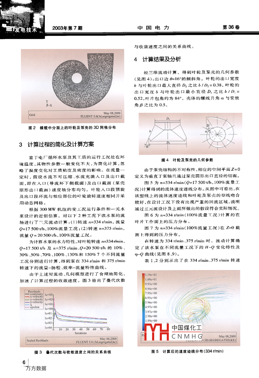 第36卷第7期中國電力vo.36,No.72003年7月ELECTRIC POWERJuL,2003發(fā)電技術(shù)300Mw機(jī)組斜流式循環(huán)水泵三繼流場計算梁雙印,李興平2,胡三高’,張志明,康志忠,徐鴻(1.華北電力大學(xué)(北京),北京102206;2.山東電力科學(xué)研究院,山東濟(jì)南25000)摘要:針對國產(chǎn)300MW機(jī)組循環(huán)水泵現(xiàn)場運行效率低的問題,對循環(huán)水泵進(jìn)行改進(jìn)設(shè)計。通過改進(jìn)設(shè)計和制造的300MW機(jī)組斜流式循環(huán)水泵在額定工況下效率可達(dá)90%左右。為了解其變工況特性,采用商業(yè)軟件 FLUENT對其新的葉輪及泵殼型線進(jìn)行三維流場計算和分析,并對其在不同流量工況的流體狀態(tài)分布進(jìn)行模擬,為改進(jìn)設(shè)計以滿足變工況要求提供了理論依據(jù)。關(guān)鍵詞:火電廠;斜流式循環(huán)水泵;三維模型中圖分類號:TK264.1文獻(xiàn)標(biāo)識碼:A文章編號:10049649(2003)07-000504由于電網(wǎng)調(diào)峰的需要,300MW及以上機(jī)組參度等物性參數(shù)變化時流體控制方程;還包括流體能與調(diào)峰已成為必然。日前我國300MW機(jī)組的設(shè)計量守恒的能量方程主要以帶基本負(fù)荷考慮,其變工況運行經(jīng)濟(jì)性較差。因此,提尚機(jī)組調(diào)峰過程變工況運行經(jīng)濟(jì)性是當(dāng)前2葉輪及泵殼幾何模型的建立火電廠節(jié)能降耗的重要任務(wù)之一。鑒于電廠絕大部分輔機(jī)如循環(huán)水泵在設(shè)計時未考慮變速運行,所以借助混流式水泵的一元流動設(shè)計方法,首先確機(jī)組在變工況下循環(huán)水泵的運行工況與實際τ況偏定水泵葉輪和泵殼近似外形尺寸、葉輪進(jìn)出口的幾離較大,使能耗增加。為改善這一狀況,對循環(huán)水泵何參數(shù),通過三維CAD軟件包和HENT的前處理的電機(jī)進(jìn)行了單速變雙速的改造,同時對泵的葉輪功能產(chǎn)生計算的初始幾何模型,同時進(jìn)行幾何模艱和泵殼型線進(jìn)行了改進(jìn)設(shè)計,使新泵的實際運行性的網(wǎng)格剖分,并將沿流動方向葉輪和泉殼的通流部能得到很大提高,效率達(dá)到90%左右。因此,從理論分的坐標(biāo)尺寸作為計算的目標(biāo)。該幾何模型經(jīng)上進(jìn)行流場分析和計算,分析新泵在變工況下的運 FLUENT軟件包的流動計算后,將不符合流線和有行特性為進(jìn)一步改進(jìn)設(shè)計有重要現(xiàn)實意義和工程應(yīng)回流區(qū)附近的尺寸修改后重新進(jìn)行計算。本計算所用價值使用的軟件版本還不能達(dá)到完全自動的趨勢辯識通流部分的流動計算在國際通用的大型計算流有時還需人為干預(yù)并進(jìn)行最趨勢調(diào)整。圖1示出體力學(xué)、燃燒和傳熱商業(yè)軟件包 FLUENT-3D上完了葉輪工作面的網(wǎng)格分布。泵殼和葉輪橫截中分面成。該軟件包和其它同類型商業(yè)軟件包如 Phoenix的網(wǎng)格劃分見圖2和Flow3D等相比,采用非結(jié)構(gòu)化單元網(wǎng)格,復(fù)雜工程問題的流動邊界網(wǎng)格剖分和前后處理吏加簡單方便。在理論計算的基礎(chǔ)上,對新泵的水力特性和汽蝕性能進(jìn)行了定量分析,提出了進(jìn)一步提高該泵流動性能和可靠性的理論建議,為完善其設(shè)計和提高運行的經(jīng)濟(jì)性提供了理論依據(jù)。1理論模型流動、燃燒及傳熱商業(yè)軟件包 FLUENT-3D算流體流動主要應(yīng)用流體動量守恒的運動方程(納FLUENT 5.0(d, segregated, k維?!雇锌怂狗匠?,相應(yīng)的其它控制方程包中國煤化工括:流體質(zhì)量守恒的連續(xù)性方程;考慮流體密度、粘格分布CNMHG收稿日期:200209-03;修回日期:2003-0426作者簡介;梁雙印(1963-),河北井陘人,副教授,從事發(fā)電廠熱經(jīng)濟(jì)性分析研究。E- mail: liangshuangyin@263nmet發(fā)電技術(shù)2003年第7期中國電力第36卷與收斂速度之間的關(guān)系曲線。4計算結(jié)果及分析經(jīng)三維流動計算,得到葉輪及泵殼的幾何參數(shù)(見圖4):出口邊=16°的傾斜角。葉輪的出口寬度b與葉輪出口最人直徑D2之比b/D2=0.38,葉輪的出口寬度b與葉輪出口最小直徑D1之比b/D0.52,葉片包角約為84°。殼體的螺線升角α與安放角B之比為0.5May08200FLUENT 5.00d segregated, ke圖2橫截中分面上的葉輪及泵殼的3D網(wǎng)格分布3計算過程的簡化及計算方案鑒丁電廠循環(huán)水泵及其T質(zhì)的運行工況處在環(huán)圖4葉輪及泵殼的幾何參數(shù)境溫度,其物性參數(shù)一般變化不大,為簡化計算,略了溫度變化對工質(zhì)粘度及密度的影響。在流量由于泵殼結(jié)構(gòu)的不對稱性,相應(yīng)的空間平面Z=0定時,假設(shè)水流不可壓縮、水流充滿入口及出口截定義為垂直于泵軸凡通過泵殼圓形出口直徑的切面。面,即在入口(導(dǎo)流環(huán)下側(cè)截面)及出口截面(泵殼圖5為n=334rmin(Q=17500t/h,100%流量工原形出I截面)速度場分布均勻。葉輪入口段預(yù)旋況)計算得到的流體速度跡線分布。從圖中可看出,在及出口段環(huán)流與相應(yīng)部位的葉輪旋轉(zhuǎn)速度相同并采該型線上的流體速度跡線和葉輪及泵殼的型線吻合用動態(tài)網(wǎng)格。較好,在設(shè)計工況下沒有出現(xiàn)嚴(yán)重的回流區(qū)域。說明根據(jù)300MW機(jī)組的變上況運行條件和一元水通過三元流設(shè)計及上面所做出的假設(shè)符合實際情況泵設(shè)計的近似估算,對以下2種工況下該水泵的流圖6為n=334r/min(100%流