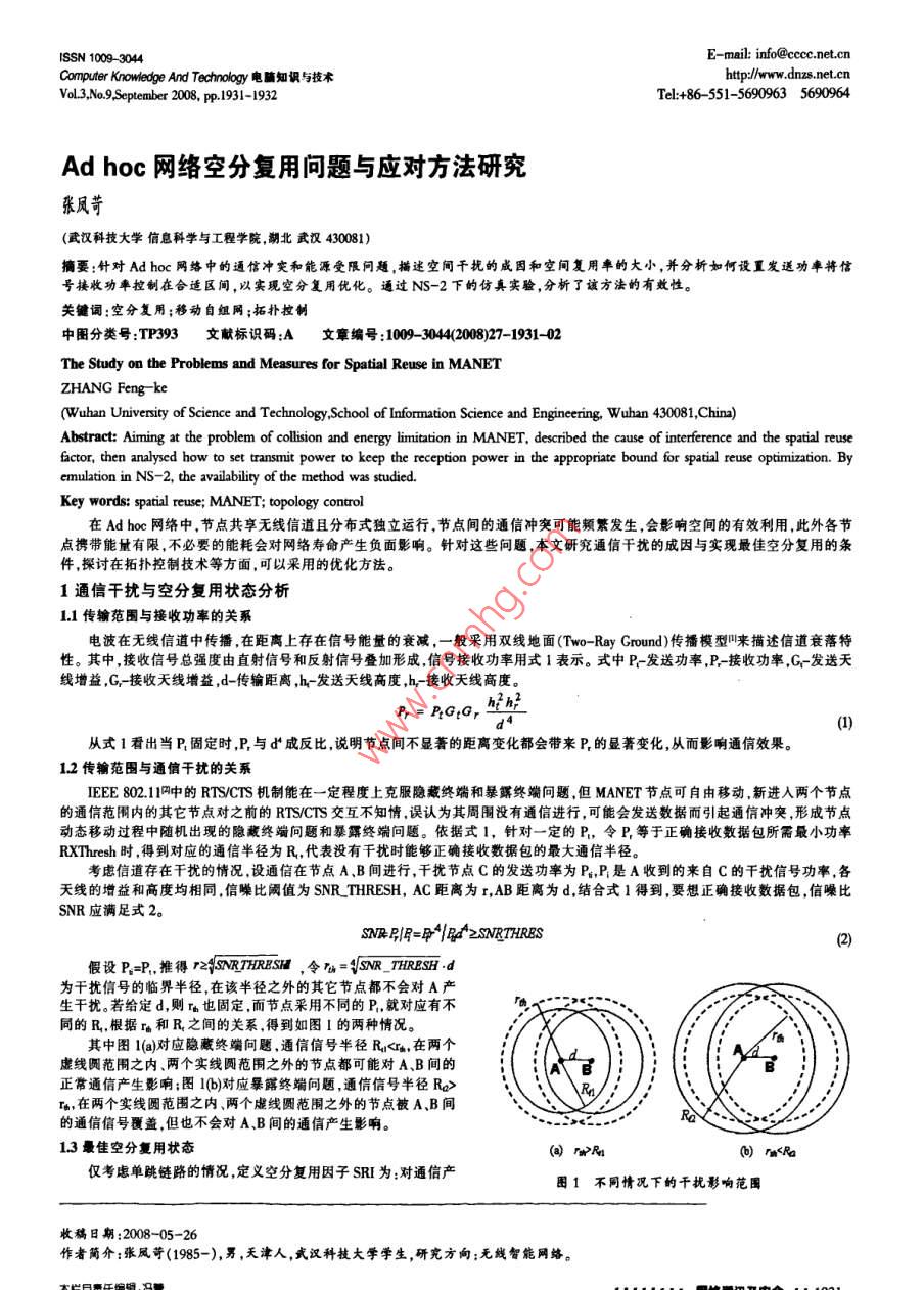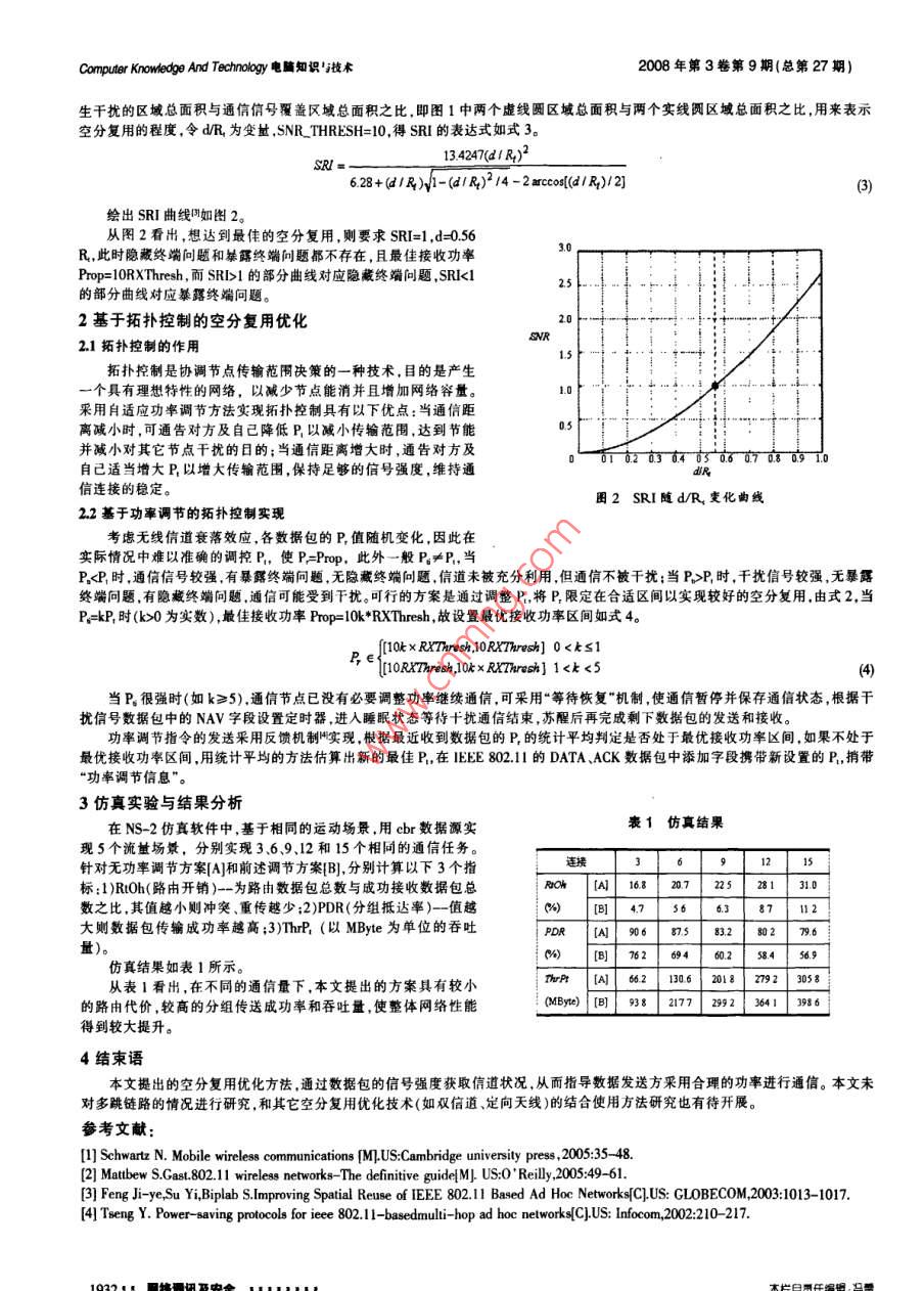 ssN10093044And Technology電腦知識(shí)與技術(shù)http://www.dnzs.net.cnVol3, No 9 September 2008, pp 1931-1932Tel+86-551-56909635690964Ad hoc網(wǎng)絡(luò)空分復(fù)用問題與應(yīng)對(duì)方法研究張鳳苛(武漢科技大學(xué)信息科學(xué)與工程學(xué)院湖北武漢430081)摘要:針對(duì) Ad hoc網(wǎng)絡(luò)中的通信沖突和能源受限問題,描逑空間干擾的成因和空間復(fù)用率的大小,并分析如何設(shè)重發(fā)送功率將信號(hào)換收功率控制在合適區(qū)間,以實(shí)現(xiàn)空分復(fù)用優(yōu)化。通過NS-2下的仿真實(shí)驗(yàn),分析了該方法的有效性。關(guān)鍵詞:空分復(fù)用;移動(dòng)自組網(wǎng);拓?fù)淇刂浦袌D分類號(hào):TP393文獻(xiàn)標(biāo)識(shí)碼:A文章編號(hào):1009-304420083)27-1931-02The Study on the Problems and Measures for Spatial Reuse in MANETZHANG Fengke(Wuhan University of Science and Technology School of Information Science and Engineering, Wuhan 430081, China)Abstract: Aiming at the problem of collision and energy limitation in MANET, described the cause of interference and the spatial reusefactor, then analysed how to set transmit power to keep the reception power in the appropriate bound for spatial reuse optimization. Byemulation in NS-2, the availability of the method was studiedKey words: spatial reuse; MANET; topology control在 Ad hoc網(wǎng)絡(luò)中,節(jié)點(diǎn)共享無線信道且分布式獨(dú)立運(yùn)行,節(jié)點(diǎn)間的通信沖突可能頻繁發(fā)生,會(huì)影響空間的有效利用,此外各節(jié)點(diǎn)攜帶能量有限,不必要的能耗會(huì)對(duì)網(wǎng)絡(luò)壽命產(chǎn)生負(fù)面影響。針對(duì)這些問題,本文研究通信干擾的成因與實(shí)現(xiàn)最佳空分復(fù)用的條件探討在拓?fù)淇刂萍夹g(shù)等方面,可以采用的優(yōu)化方法。1通信干擾與空分復(fù)用狀態(tài)分析L1傳輸范圍與接收功率的關(guān)系電波在無線信道中傳播,在距離上存在信號(hào)能量的衰減,一般采用雙線地面(Two- Ray ground)傳播模型叫來描述信道衰落特性。其中,接收信號(hào)總強(qiáng)度由直射信號(hào)和反射信號(hào)疊加形成信號(hào)接收功率用式1表示。式中P-發(fā)送功率P-接收功率G-發(fā)送天線增益,G-接收天線增益,d-傳輸距離,h-發(fā)送天線高度,h-接收天線高度Pr=PGro, h2n?從式1看出當(dāng)P固定時(shí)P,與d成反比,說明節(jié)點(diǎn)間不顯著的距離變化都會(huì)帶來P的顯著變化,從而影響通信效果。12傳輸范圍與通信干擾的關(guān)系IEEE80211四中的 RTS/CTS機(jī)制能在一定程度上克服隱藏終端和暴露終端問題但 MANET節(jié)點(diǎn)可自由移動(dòng)新進(jìn)入兩個(gè)節(jié)點(diǎn)的通信范圍內(nèi)的其它節(jié)點(diǎn)對(duì)之前的 RTS/CTS交互不知情誤認(rèn)為其周圍沒有通信進(jìn)行,可能會(huì)發(fā)送數(shù)據(jù)而引起通信沖突,形成節(jié)點(diǎn)動(dòng)態(tài)移動(dòng)過程中隨機(jī)出現(xiàn)的隱藏終端問題和暴露終端問題。依據(jù)式1,針對(duì)一定的P,令P等于正確接收數(shù)據(jù)包所需最小功率RXThresh時(shí),得到對(duì)應(yīng)的通信半徑為R,代表沒有干擾時(shí)能夠正確接收數(shù)據(jù)包的最大通信半徑考慮信道存在干擾的情況設(shè)通信在節(jié)點(diǎn)A,B間進(jìn)行,干擾節(jié)點(diǎn)C的發(fā)送功率為P,P是A收到的來自C的干擾信號(hào)功率,各天線的增益和高度均相同,信噪比閾值為 SNR THRESH,AC距離為r,AB距離為d結(jié)合式1得到,要想正確接收數(shù)據(jù)包,信噪比SNR應(yīng)滿足式2SNRB/R=P/R 2SNRTHRES假設(shè)PP,推得mREH,令l= SNR_THRESH.d為干擾信號(hào)的臨界半徑,在該半徑之外的其它節(jié)點(diǎn)都不會(huì)對(duì)A生干擾。若給定d則r也固定,而節(jié)點(diǎn)采用不同的P,就對(duì)應(yīng)有不同的R,根據(jù)r和R之間的關(guān)系,得到如圖I的兩種情況。其中圖1(a)對(duì)應(yīng)隱藏終端問題,通信信號(hào)半徑R<,在兩個(gè)虛線圓范圍之內(nèi)、兩個(gè)實(shí)線圓范圍之外的節(jié)點(diǎn)都可能對(duì)AB間的正常通信產(chǎn)生影響;圖1(b)對(duì)應(yīng)暴露終端問題,通信信號(hào)半徑Ra>r,在兩個(gè)實(shí)線圓范圍之內(nèi)、兩個(gè)虛線圓范圍之外的節(jié)點(diǎn)被AB間的通信信號(hào)覆蓋但也不會(huì)對(duì)A、B間的通信產(chǎn)生影響。13最佳空分復(fù)用狀態(tài)0r a P,時(shí),干擾信號(hào)較強(qiáng),無暴露終端問題,有隱藏終端問題,通信可能受到干擾。可行的方案是通過調(diào)整P將P限定在合適區(qū)間以實(shí)現(xiàn)較好的空分復(fù)用,由式2,當(dāng)P=kP時(shí)(k0為實(shí)數(shù))最佳接收功率Pop=10k* RXThresh,故設(shè)置最優(yōu)接收功率區(qū)間如式4B eJ10kx RXTaresh, 10RXTresh]0