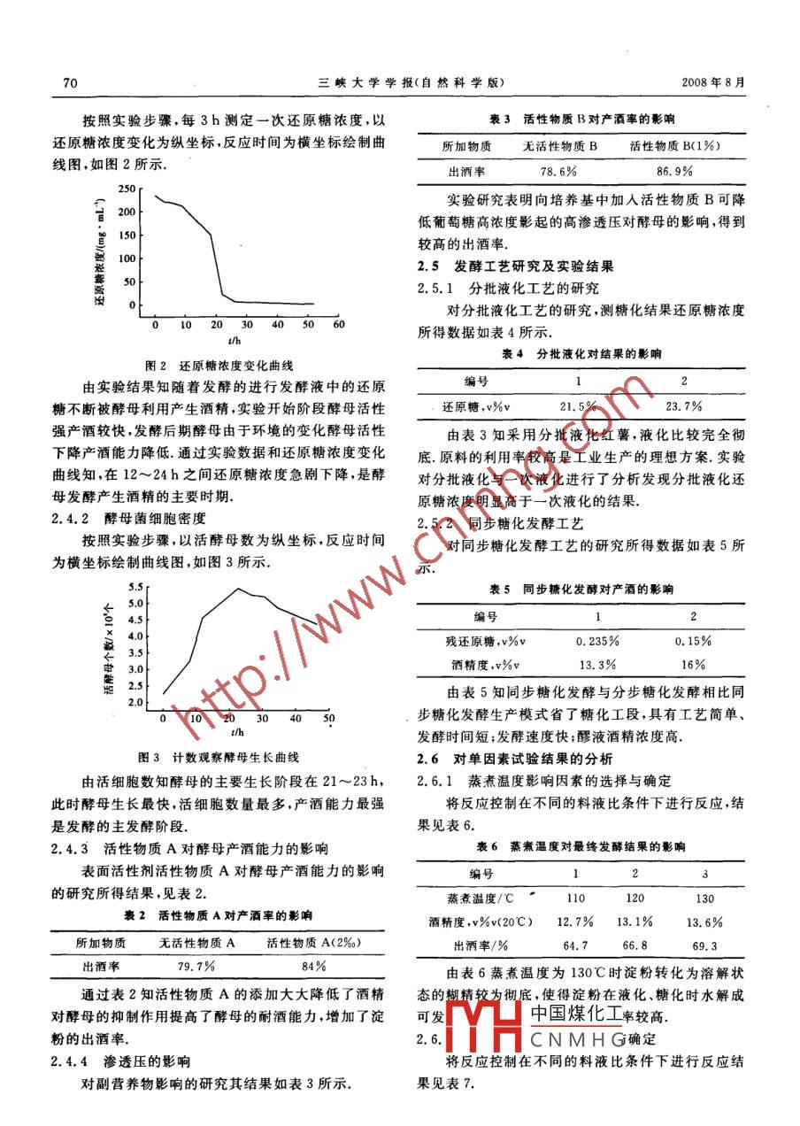 第30卷第4期三峽大學學報(自然科學版)Vol 30 No 42008年8月J of China Three Gorges Univ( Natural Sciences)高濃度發(fā)酵制備紅薯燃料乙醇的研究何華坤劉莉王紅霞晏濤羅希三峽大學化學與生命科學學院,湖北宜昌443002)摘要:以紅薯為原料髙濃度發(fā)酵制備燃料乙醇,對各種影響因素進行了實驗研究.通過單因素分析和正交實驗確定出實驗最佳工藝條件為:蒸煮條件:在130℃時蒸煮30min,加水比為水:鮮紅薯1:2;液化條件:加入a淀粉酶2%,70℃下液化2h;糖化條件:加糖化酶量2%,60℃下糖化4h;發(fā)酵條件:發(fā)酵液中KH2PO40.5%、MgSO40.2%、NaCl0.1%、CaCl20.2%、活性物質A2%、活性物質B1%,酵母接種量4%,在32℃發(fā)酵20h,34℃發(fā)酵52h.關鍵詞:紅薯;燃料乙醇;高濃度發(fā)酵;酵母中圖分類號:TQ517.2文獻標識碼:A文章編號:1672-948X(2008)04-0067-05Study of Technology of Fermentation of Producing HighConcentration Fuel Alcohol with Fresh Sweet PotatoHe Huakun Liu Li Wang Hongxia Yan Tao Luo XiCollege of Chemistry Life Science, China Three Gorges Univ, Yichang, 443002, China)Abstract The influential factors on fermentation of high concentration alcohol using sweet potatoes as mateal are studied. The optimum conditions are obtained. The optimal cooking condition is the cooking tempera-ture of 130C under the mixed rate 1 :2 between water and fresh sweet potatoes; the optimal liquefying con-dition is the temperature of 70C for 2hr adding 2% liquefying enzyme; the optimal saccharification conditionis the temperature of 60C for 4hr adding 2% saccharifying enzyme; the fermentation condition is the temperature of 32C for 20hr and the temperature of 34 C for 52 hr under the additives KH, PO 0. 5%, MgSO,0. 2%, NaCI 0. 1%, CaC1, 0.2%, active matter A 2%, active matter B 1% with 4% yeastKeywords sweet potato; fuel alcohol; high concentration fermentation; yeast石油是當今世界的主要能源,是一種不可再生的海等城市已全部改用無鉛汽油化石燃料.一旦地球的石油儲存量被開采及消耗完燃料乙醇是一種可再生的生物能源,在我國主要了,而現代工業(yè)技術一時又不能生產替代石油新產品用糧食作物玉米、小麥生產,原料緊缺,因此拓展生物時,其后果是不堪設想的.尋找可再生性的替代能源,質原料,利用非糧食的淀粉生物質或非淀粉的纖維素特別是新的液態(tài)燃料,已成為維持人類社會可持續(xù)發(fā)生物質作為原料,生產燃料乙醇,意義重大高淀粉紅展的緊迫任務特別是中國,開發(fā)可再生的替代燃料,薯是一種工業(yè)用的能源作物,其淀粉含量在30%左減少對進口的依賴,以保障石油安全,維持可持續(xù)發(fā)右,用于制備燃料乙醇是南方地區(qū)的好選擇.但其工展,已成為當務之急(2藝主要采用玉米乙醇工藝,存在廢水排放大,分離能乙醇是來自可再生資源的最有發(fā)展前景的液態(tài)耗高等問題燃料.在汽油中添加10%~15%酒精組成的復合燃實驗是在鮮紅薯制備燃料乙醇的專利技術(專料,稱為汽油醇,為“無鉛汽油”之一種,近來,北京、上利:申請?zhí)?065101249801公開號CN19666A)基中國煤化工收稿日期:2007-12CNMHG聯系人:龔大春(1968—),男,副教授,博士研究生,主要研究方向為生物化工三峽大學學報(自然科學版)2008年8月礎上,通過解決紅薯燃料乙醇的濃醪發(fā)酵系列關鍵問調加水比.液化:取一定量的淀粉酶在一定時間下對題,構建髙濃度發(fā)酵制備紅薯燃料乙醇新技術.通過紅薯進行糊化和液化.糖化:在一定溫度下糖化一定添加活性物質,減小酒精抑制,緩解髙滲透壓對酵母時間酵母活化:稱取一定的酵母用2%葡萄糖溶液產酒的影響,最終實現紅薯的高濃度發(fā)酵進行活化.發(fā)酵:將發(fā)酵醪裝入三角瓶,接種發(fā)酵,包扎好放入培養(yǎng)箱培養(yǎng)發(fā)酵72~96h.蒸出酒精,記錄1實驗材料與方法蒸出酒精的體積,溫度和酒精度,計算出酒率1.4分析檢測方法1.1材料和實驗設備(1)還原糖:DNS法測定(1)原料.紅薯:產地湖北宜昌,DNS法檢測得淀(2)pH值:酸度計測定粉含量20%以上,選擇成熟好,淀粉含量高、無霉爛、(3)酒度的測定.采用比重法.取出成熟發(fā)酵醪無病蟲害的鮮紅薯100mL,置于250mL蒸餾燒瓶中,并用50mL水沖洗(2)酶制劑耐高溫α淀粉酶(不小于4000單位/量桶,加入圓底燒瓶中,常規(guī)蒸餾,收集100mL的蒸g):北京奧博星生物技術有限責任公司;糖化酶餾液,用酒精計溫度計讀取酒度和溫度,計算出醪液(500單位/g);湖南省津市市新型發(fā)酵有限責任公在20℃下的酒精度(4)紅薯中淀粉含量的測定.取試樣1.5~2g研3)實驗試劑.DNS試劑,硫酸銨,硫酸鎂,蛋白碎轉入250mL三角瓶加100mL的2%鹽酸溶液胨酵母抽提物,磷酸二氫鉀,活性物質A,活性物質瓶口上安回流冷凝器或長玻璃管沸水浴3h.取出迅B活性干酵母,維生素B12,維生素C,氯化鈣速冷卻用20%氫氧化鈉溶液中和至中性或微酸性(4)實驗設備. Model Spx250B-z型生化培養(yǎng)箱,濾紙過濾,濾液用500mL容量瓶接收,用水充分洗滌L203電子天平,紫外/可見光分光光度儀,架盤藥物殘渣,然后用水定容,用DNS測溶液中糖含量,從而天平,DHG9140A型電熱恒溫干燥箱,氣相色譜儀.可轉算出紅薯原料中淀粉含量1.2實驗溶液的配制(5)水分測定0.將紅薯洗凈切碎,取10g放入(1)2%葡萄糖溶液的配制:準確稱取2g無水葡蒸發(fā)皿中,于干燥箱中105℃溫度下干燥約4h.直到萄糖粉末(預先于100~105℃烘干),用水溶解,加5恒重為止衡重后測干重最后按以下公式計算:水分mL濃HCl,用水定容至100含量=(10-最后干重)/10(2)DNS溶液的配制:取6.3g的3,5-二硝基(6)出酒率的計算.計算公式如