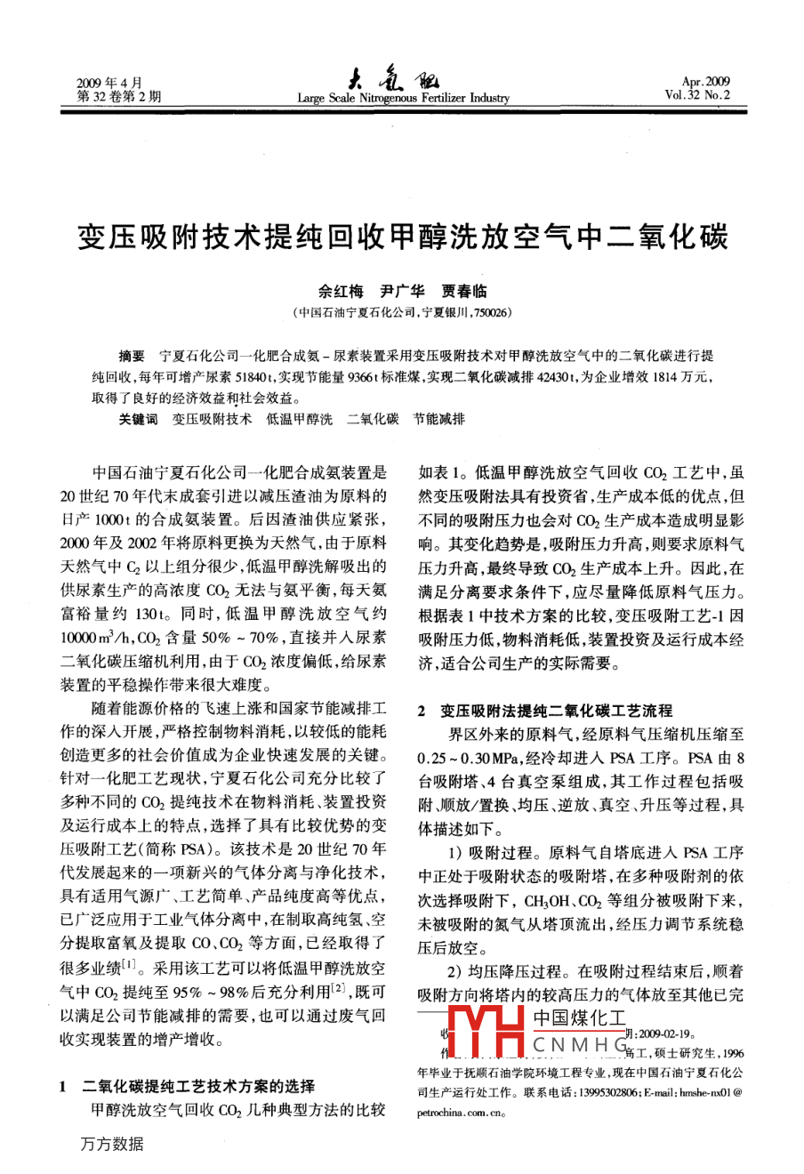 2009第32卷第2期Large Scale Nitrogenous Fertilizer IndustryVol 32 No. 2變壓吸附技術(shù)提純回收甲醇洗放空氣中二氧化碳佘紅梅尹廣華賈春臨(中國石油寧夏石化公司,寧夏銀川,750026)摘要寧夏石化公司一化肥合成氨-尿素裝置采用變壓吸附技術(shù)對甲醇洗放空氣中的二氧化碳進(jìn)行提純回收,每年可增產(chǎn)尿素51840t,實(shí)現(xiàn)節(jié)能量936t標(biāo)準(zhǔn)煤,實(shí)現(xiàn)二氧化碳減排42430t,為企業(yè)增效1814萬元,取得了良好的經(jīng)濟(jì)效益和社會效益。關(guān)鍵詞變壓吸附技術(shù)低溫甲醇洗二氧化碳節(jié)能減排中國石油寧夏石化公司一化肥合成氨裝置是如表1。低溫甲醇洗放空氣回收CO2工藝中,雖20世紀(jì)70年代末成套引進(jìn)以減壓渣油為原料的然變壓吸附法具有投資省,生產(chǎn)成本低的優(yōu)點(diǎn),但日產(chǎn)100t的合成氨裝置。后因渣油供應(yīng)緊張,不同的吸附壓力也會對CO2生產(chǎn)成本造成明顯影2000年及2002年將原料更換為天然氣,由于原料響。其變化趨勢是,吸附壓力升高,則要求原料氣天然氣中C2以上組分很少,低溫甲醇洗解吸出的壓力升高,最終導(dǎo)致CO2生產(chǎn)成本上升。因此,在供尿素生產(chǎn)的高濃度CO2無法與氨平衡,每天氨滿足分離要求條件下,應(yīng)盡量降低原料氣壓力富裕量約130t。同時(shí),低溫甲醇洗放空氣約根據(jù)表1中技術(shù)方案的比較,變壓吸附工藝1因1000mh,CO2含量50%-70%,直接并入尿素吸附壓力低,物料消耗低裝置投資及運(yùn)行成本經(jīng)二氧化碳壓縮機(jī)利用,由于CO2濃度偏低給尿素濟(jì)適合公司生產(chǎn)的實(shí)際需要。裝置的平穩(wěn)操作帶來很大難度。隨著能源價(jià)格的飛速上漲和國家節(jié)能減排工2變壓吸附法提純二氧化磯工藝流程作的深入開展,嚴(yán)格控制物料消耗,以較低的能耗界區(qū)外來的原料氣,經(jīng)原料氣壓縮機(jī)壓縮至創(chuàng)造更多的社會價(jià)值成為企業(yè)快速發(fā)展的關(guān)鍵。0.25~0.30MPa,經(jīng)冷卻進(jìn)入PSA工序。PSA由8對一化肥工藝現(xiàn)狀,寧夏石化公司充分比較了臺吸附塔、4臺真空泵組成,其工作過程包括吸多種不同的CO2提純技術(shù)在物料消耗、裝置投資附順放/置換、均壓、逆放真空、升壓等過程,具及運(yùn)行成本上的特點(diǎn),選擇了具有比較優(yōu)勢的變體描述如下。吸附工藝(簡稱A)。該技術(shù)是20世紀(jì)70年1)吸附過程。原料氣自塔底進(jìn)人KA工序代發(fā)展起來的一項(xiàng)新興的氣體分離與凈化技術(shù),中正處于吸附狀態(tài)的吸附塔,在多種吸附劑的依具有適用氣源廣、工藝簡單、產(chǎn)品純度高等優(yōu)點(diǎn),次選擇吸附下,CHOH、CO2等組分被吸附下來,已廣泛應(yīng)用于工業(yè)氣體分離中,在制取高純氫、空未被吸附的氮?dú)鈴乃斄鞒?經(jīng)壓力調(diào)節(jié)系統(tǒng)穩(wěn)分提取富氧及提取CO、CO2等方面,已經(jīng)取得了壓后放空。很多業(yè)績。采用該工藝可以將低溫甲醇洗放空2)均壓降壓過程。在吸附過程結(jié)束后,順著氣中CO2提純至95%~98%后充分利用2,既可吸附方向?qū)⑺?nèi)的較高壓力的氣體放至其他已完以滿足公司節(jié)能減排的需要,也可以通過廢氣回中國煤化工收實(shí)現(xiàn)裝置的增產(chǎn)增收。CNMHGET,碩士研究生,D6年畢業(yè)于撫順石油學(xué)院環(huán)境工程專業(yè),現(xiàn)在中國石油寧夏石化公1二氧化碳提純工藝技術(shù)方案的選擇司生產(chǎn)運(yùn)行處工作。聯(lián)系電話:13995302806;Emsl: hrmshe-nxoI@甲醇洗放空氣回收CO2幾種典型方法的比較13000年第32卷成再生的較低壓力吸附塔,該過程不僅是降壓過程,又是提高吸附塔內(nèi)二氧化碳濃度的過程表1甲醇洗放空氣回收CO2技術(shù)方案比較項(xiàng)目改良MEA工藝變壓吸附工藝1變壓吸附工藝220%MEA+活化劑、緩蝕劑專用吸附劑專用吸附劑處理原料氣/m3h110000原料氣溫度/℃35~4原料中CO2含量,%提純后CO2含量,%CO2產(chǎn)量/m3h-1≥4000≥4000吸收/吸附類型物理化學(xué)吸收物理吸附里吸附再生方法蒸汽汽提降壓再生流程段再生抽真空抽真空吸收(吸附)壓力/MPa常壓(6~10kPa)0.25~0.3吸收(吸附)溫度/℃35-4035~40再生壓力/MPa0.030.0750.075提純后CO2壓力MPa0.080.08再生溫度/℃35-4035-40設(shè)備腐蝕有腐蝕沒有腐蝕沒有腐蝕100onCO2運(yùn)行費(fèi)用/元219.4125.396裝置投資/方元14003)順放/置換過程。由于工藝中原料氣CO2再生效果更好,動力設(shè)備能量利用充分,節(jié)能效果濃度變化較大,經(jīng)均壓置換后,吸附塔內(nèi)CO2純度好:④吸附劑采用密相裝填技術(shù),可進(jìn)一步減小床可能無法滿足產(chǎn)品純度要求,在均壓降壓過程結(jié)層死空間,提高有效組分回收率。束后設(shè)置置換步驟,采用合格CO2置換吸附床層由于置換氣CO2含量較高,經(jīng)鼓風(fēng)機(jī)升壓后返回3經(jīng)濟(jì)效益分析原料壓縮機(jī)進(jìn)口1)提純CO2指標(biāo)見表2,消耗指標(biāo)見表3。4)逆放過程。在均壓降壓過程結(jié)束后,逆著表2提純CO2指標(biāo)吸附方向進(jìn)行減壓,使被吸附的CO2減壓解吸出項(xiàng)目指標(biāo)來的過程。逆放解吸出來的CO2放入產(chǎn)品二氧化二氧化碳純度,%碳緩沖罐。原料氣出口壓力/MPa3000-35005)抽真空過程。在逆放過程結(jié)束后,逆著吸附方向?qū)ξ剿檎婵?進(jìn)一步降低壓力,使被吸表3每1000rCO2(100%)消耗定額附的CO2完全