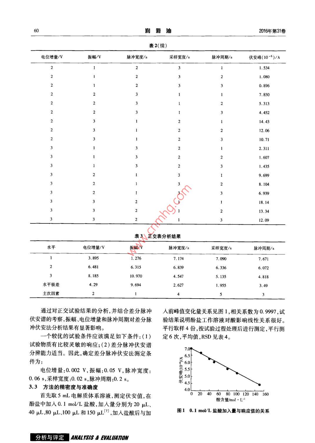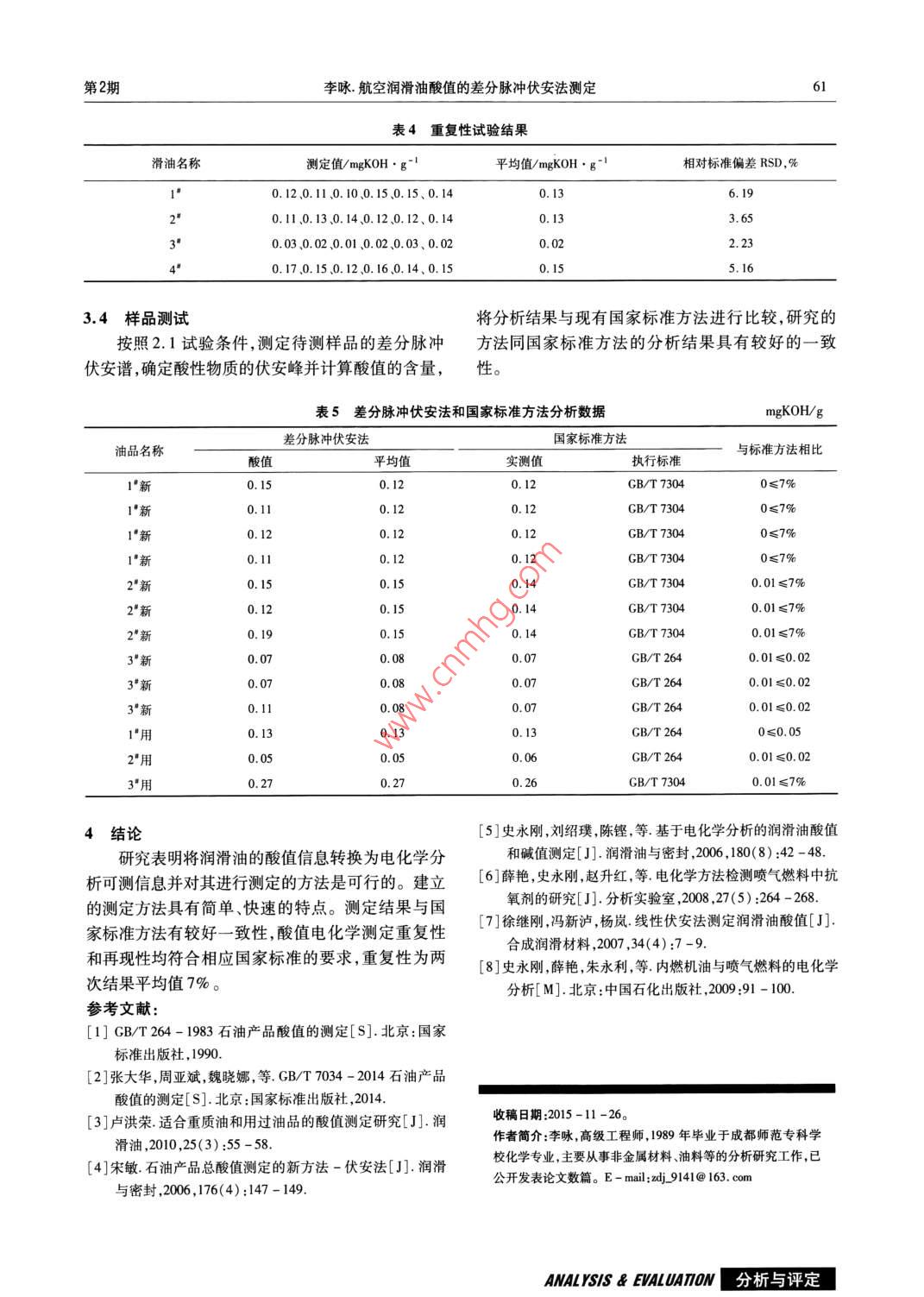 2016年4月潤滑油第31卷第2期Apr 2016LUBRICATING OILVolt, No.2文章編號(hào):10023119(2016)02005804航空潤滑油酸值的差分脈沖伏安法測定李詠(成都航利(集團(tuán))實(shí)業(yè)有限公司,四川成都611937)摘要:研究了航空潤滑油酸值的差分脈沖伏安法測定方法,并對(duì)其測定條件、測定參數(shù)、方法的精密度和準(zhǔn)確度以及影響測定結(jié)果的因素進(jìn)行了討論。研究表明:將潤滑油的酸值信息轉(zhuǎn)換為電化學(xué)分析可測信息并對(duì)其進(jìn)行測定的方法是可行的。建立的測定方法具有簡單、快速的特點(diǎn),測定結(jié)果與國家標(biāo)準(zhǔn)方法有較好一致性關(guān)鍵詞:潤滑油;差分脈沖伏安法;酸值中圖分類號(hào):TE62.5文獻(xiàn)標(biāo)識(shí)碼:AAcid Number Determination of Aviation Lubricating Oil by Differential Pulse VoltammetryLI YongChengdu Holy Industry Commerce Corp, Ltd(GROUP), Chengdu 611937, China)Abstract: The acid value of aviation lubricating oil was determined by using differential pulse voltammetry method. the tes-ting conditions and parameters as well as the accuracy and the precision of the method were studied and the factors influencing the determination results were discussed. The result showed that differential pulse voltammetry method is feasible byransforming the acid value of lubricating oil into the measurable electrochemical information. The established method is sim-ple and rapid, and the results have good consistency with that of national standard methoKey words: lubricating oil; differential pulse voltammetry acid number0引言復(fù)雜,而且有效期短3,因此,有必要研究更快、更航空潤滑油中有機(jī)酸總含量(酸值)是表征航準(zhǔn)、更可靠的酸值測定方法,以克服現(xiàn)有方法存在空潤滑油質(zhì)量的指標(biāo),通過對(duì)航空潤滑油酸值的測不足。定,可以檢測航空潤滑油是否符合規(guī)定標(biāo)準(zhǔn),以防止本文研究了基于差分脈沖伏安法分析航空潤滑可能出現(xiàn)的對(duì)金屬零部件的腐蝕。酸值定義為中和油酸值的測定方法,并與國家標(biāo)準(zhǔn)方法的測定結(jié)果1克潤滑油中酸性物質(zhì)所需的KOH毫克數(shù),單位是進(jìn)行了比較。mgKoH/go1試驗(yàn)原理目前航空潤滑油酸值的測定方法主要包括顏電化學(xué)測定酸值的原理就是采用差分脈沖伏安色指示劑滴定法(GB/T2641)和電位滴定法法將溶劑和電解液混合,置人一個(gè)電解槽中,插入三(GB/T70342)。顏色指示劑滴定法是根據(jù)所用電極系統(tǒng)讓工作電極以一定的速率掃描。當(dāng)工作的酸堿指示劑顏色變化來確定滴定終點(diǎn);電位滴定電極達(dá)到某一峰值時(shí),該溶液中的電化學(xué)活性物質(zhì)法是根據(jù)電位的變化來確定滴定終點(diǎn)。但顏色指就瞬間氧化溶液中電流增大,產(chǎn)生強(qiáng)的伏安峰。伏示劑滴定法在測定深色石油產(chǎn)品酸值時(shí),常遇到終安法測定潤滑油酸值是將伏安法中有電活性的化合點(diǎn)難以判斷的缺陷;電位滴定法在測定石油產(chǎn)品酸物(即在伏安檢測中有響應(yīng))與潤滑油中酸反應(yīng),轉(zhuǎn)值時(shí),常會(huì)遇到滴定曲線無明顯突躍點(diǎn)的樣品,滴變?yōu)榉请娀钚曰衔?即在伏安檢測中無響應(yīng)),通定終點(diǎn)很難確定,必須參考非水緩沖溶液的電極電過伏安法測定電活性化合物與酸反應(yīng)后電活性化合位來確定終點(diǎn)。但非水緩沖溶液毒性大配制過程物的減少量來計(jì)算樣品的酸值。分析與評(píng)定| ANALSis Eluant第2期李詠航空潤滑油酸值的差分脈沖伏安法測定2試驗(yàn)部分3結(jié)果與討論2.1儀器和工作條件3.1試驗(yàn)結(jié)果影響因素的考察與參數(shù)的選擇試驗(yàn)所用的儀器為電化學(xué)分析儀CHB830,電為確定最優(yōu)的電化學(xué)分析電解質(zhì)溶液體系,根極為復(fù)合電極5(工作電極為3mm的玻碳電極,據(jù)酚鹽的水/乙醇形成的電解質(zhì)體系,對(duì)體積比為參比電極和輔助電極均為0.5mm的鉑絲電極);20%、40%、50%、70%、90%乙醇-水體系對(duì)同一樣儀器參數(shù)設(shè)定為:電位增量:0.002V、振幅:0.05品的差分脈沖伏安峰譜進(jìn)行研究6。表1是在相同V、脈沖寬度:0.06s、采樣寬度:0.02s、脈沖周期:條件下,相同濃度的苯酚鈉電解體系的伏安峰測定0.2s。結(jié)果。最好的電化學(xué)分析的溶劑體系,應(yīng)具有足夠22試劑與標(biāo)準(zhǔn)溶液電解質(zhì)離散的介電常數(shù)、小的黏度、蒸汽壓和毒性,試樣所用的試劑為分析純的無水乙醇、苯酚鈉并且具有較大的電位窗口,對(duì)潤滑油中酸性物質(zhì)溶和0.1mo/L鹽酸,水為去離子水。解性較好等條件。因此最終選擇50%乙醇-水體2.3試驗(yàn)方法系為實(shí)驗(yàn)用電解質(zhì)溶劑體系。待測樣品酸性乙醇溶液的準(zhǔn)備:取一定體積的表1電解質(zhì)溶劑體系測試數(shù)據(jù)待測樣品,加入一定體積的不含二氧化碳的無水乙醇,煮沸(5~10)min,靜置放置。試驗(yàn)條件水-乙醇溶液,濃度伏安峰mol·L1(10-6)/A取等體積的酚鹽水溶液和不含二氧化碳的無位增量:0.00200.12416水乙醇并搖動(dòng)1min,采用差分脈沖伏安法測得伏振幅0.05V安法電流峰為H;取等體積的酚鹽水溶液和不含脈沖寬度:0.s0.17.309二氧化碳的無水乙醇,加入0.1moL的鹽酸30采樣寬度:0.02s0000.15.861μL,搖動(dòng)1min,采用差分脈沖伏安法測得伏安法脈沖周期:0.2s電流峰為H;取等體積的酚鹽水溶液和待測樣品靜止時(shí)間:2s酸