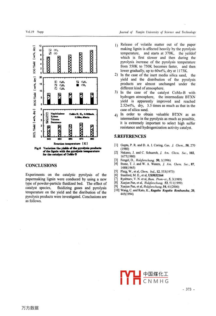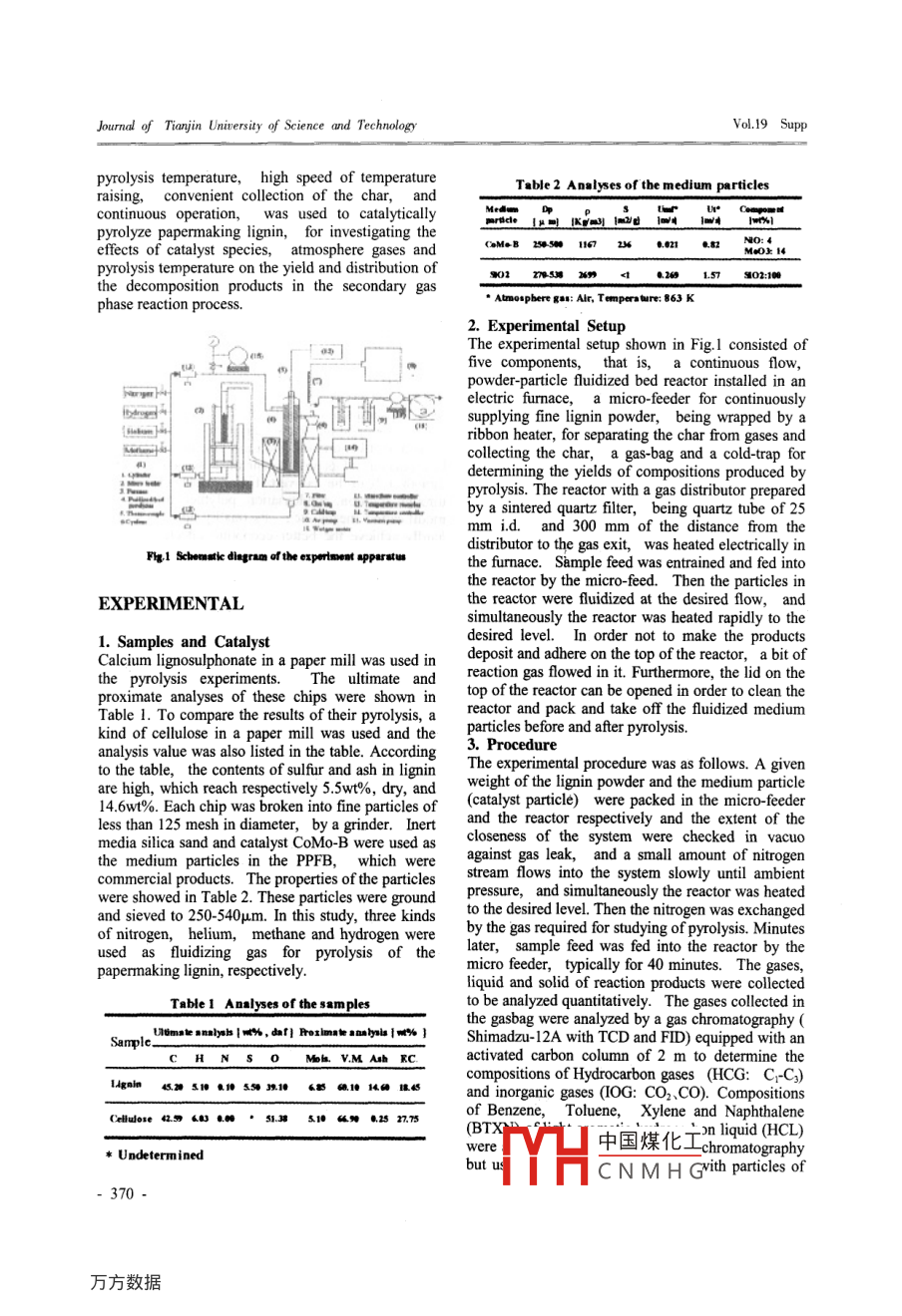 JOURNAL OF .2004 AprilTIANJIN UNIVERSITY OF SCIENCE AND TECHNOLOGYVol.19 SuppRESEARCH ON REUSE OFstraw and wheat straw are used for papermaking,PAPERMA KING LIGNINwhich occupy 70-80% of the raw material. However,-CONVERSION OF LIGNIN TO BTXit is the difficulty in papermaking waste liquidtreatment as well as the lack of capital,technologyBY CATALYTIC PYROLYSIS IN Aand environmental protecting consciousness. etc. thatPOWDER PARTICLE FLUIDIZED BEDmakes the sulphonate in papermaking lignininsufficiently utilized but a pollution source.Chang Wang, Chongwo Li, Qingzhu JiaTherefore, in order to effectively utilize the resourcesor to solve environment pollution problem, it isCollege of Material Science & Chemicalextremely important to efficiently utilize lignin.Engineering,Tianjin University of Science &There are many researches and discoveries on theTechnologyutilization of lignin domestic and abroad1-4),the1038 Dagunan Road, Tianjin City, 300222, P.R.regions of which are very wide. As yet, most of theChinaresearches are still on the laboratory stage. BecauseE-mail:wangc88@163.comof the competition from petroleum products andeconomic effect on utilization of lignin as well as theABSTRACTheterogeneity of its physico-chemical property, eventhough it can be converted to variant chemicalsExperiments on the catalytic pyrolysis of thethrough adition, condensation, polymerization, andpapermaking lignin were conduced by using a newmodification means etc., its quality and costs cantype of powder-particle fluidized bed to improve thehardly achieve the better economic effect, whichyield of the light aromatic hydrocarbon, ie. benzene,increases the difficulty of practical usage. Accordingtoluene, xylene and naphthalene (BTXN), in whichto its structure, pyrolysis conversion can decomposethe primary decomposition and secondary catalyticthe lignin polyaromatic hydrocarbon into lightreaction occur simultaneously at ambient pressure.aromatic hydrocarbon as fundamental chemical stockThe effect of catalyst species, fuidizing gases andfeed. With the economic development of china inpyrolysis temperature on the yield of the BTXN wererecent years, the demands of these chemical stockinvestigated. The content of sulfur is high in thefeed have increased gradually, the growth rate ofpapermaking lignin,and the volatile matter iswhich reaches 21.9% However, 95% of the existingeffected by the temperature. In the case of the inertstock feed comes from petroleum chemicals. ifmedia silica sand, the yield and the distribution of thelignin, byproducts of paper making,can be utilized,pyrolysis products were almost unchanged under thedevelopment of pyrolysis conversion can not onlydifferent kind of atmosphere. In the case of thereduce the dependence to petroleum,but alsocatalyst CoMo-B with hydrogen atmosphere, thereplace or make up the shortage of petroleum, andintermediate BTXN yield reached 2.52wt%, dry, 3.3promote sustainable economic developmenttimes as much as that in the case of silica sand.efficiently.Gasification and pyrolysis are two main means ofTherefore, in order to obtain valuable BTXN as anintermediate in the pyrolysis as much as possible, it isutilizing clean biomass. papermaking lignin and plantextremely important to select high sulfur resistancebiomass have similar properties: low pyrolysistemperature and large yield of volatile matter.and hydrogenization activity catalyst.Generally, the volatile matter is polyaromaticKEYWORDS: Lignin, Biomass, Catalytichydrocarbon, the secondary decomposition of whichcan be controlled through different reaction conditionPyrolysis, BTX, Fluidized Bedin order to obtain the different desired pyrolysisproducts. Therefore, authors are aiming at trying forArticle ID:1672- -6510 (2004) supp- -0369- -05the development of a process, in which the valuablechemicals, ie. the light aromatic hydrocarbonsINTRODUCTIONBTXN are first obtained from biomass as much asPlant consists essentially of three main polymers:possible through the catalytic pyrolysis by using alignin, cellulose, and hemicellulose, which are thenew type of powder-particle fluidized bed proposedmost abundant and renewable hydrocarbon resourcesby our group5. Then chars collected from the systemon the earth. The annual yield of rice straw, wheatare further used as gasification or combustion sourcestraw, bagasse, reed, and bamboo in our country hastocon-y. In this work, a中國煤化工ed bed reata,exceeded 1 billion tons. 30% of the yield of riceY片C NM H G: easy control of-369-Journal of Tianjin University of Science and TechnologyVol.19 Supppyrolysis temperature, high speed of temperatureTable 2 Analyses of the medium particlesraising, convenient collection of the char, andcontinuous operation, was used to catalyticallyMedupyrolyze papermaking lignin, for investigating theCMeB 2545 1140.021NOi4 ,effects of catalyst species, atmosphere gases andpyrolysis temperature on the yield and distribution of301278-53 260.2691.57S02:100the decomposition products in the secondary gas●Atmospbert g#: Alr, Tmperoure: 863 Kphase reaction process.2. Experimental SetupThe experimental setup shown in Fig.l consisted offive components,that iscontinuous flow,powder-particle fluidized bed reactor installed in anelectric furmnace, a micro-feeder for continuouslyatsupplying fine lignin powder,being wrapped by aribbon heater, for separating the char from gases and]collecting the char, a gas-bag and a cold-trap fordetermining the yields of compositions produced bypyrolysis. The reactor with a gas distributor preparedby a sintered quartz filter, being quartz tube of 25mm i.d.and 300 mm of the distance from thedistributor to the gas exit, was heated electrically inFg.1 Schematke diegrom of the experinent apparstusthe furnace. Sample feed was entrained and fed intothe reactor by the micro-feed. Then the particles inEXPERIMENTALthe reactor were fluidized at the desired flow,andsimultaneously the reactor was heated rapidly to the1. Samples and Catalystdesir