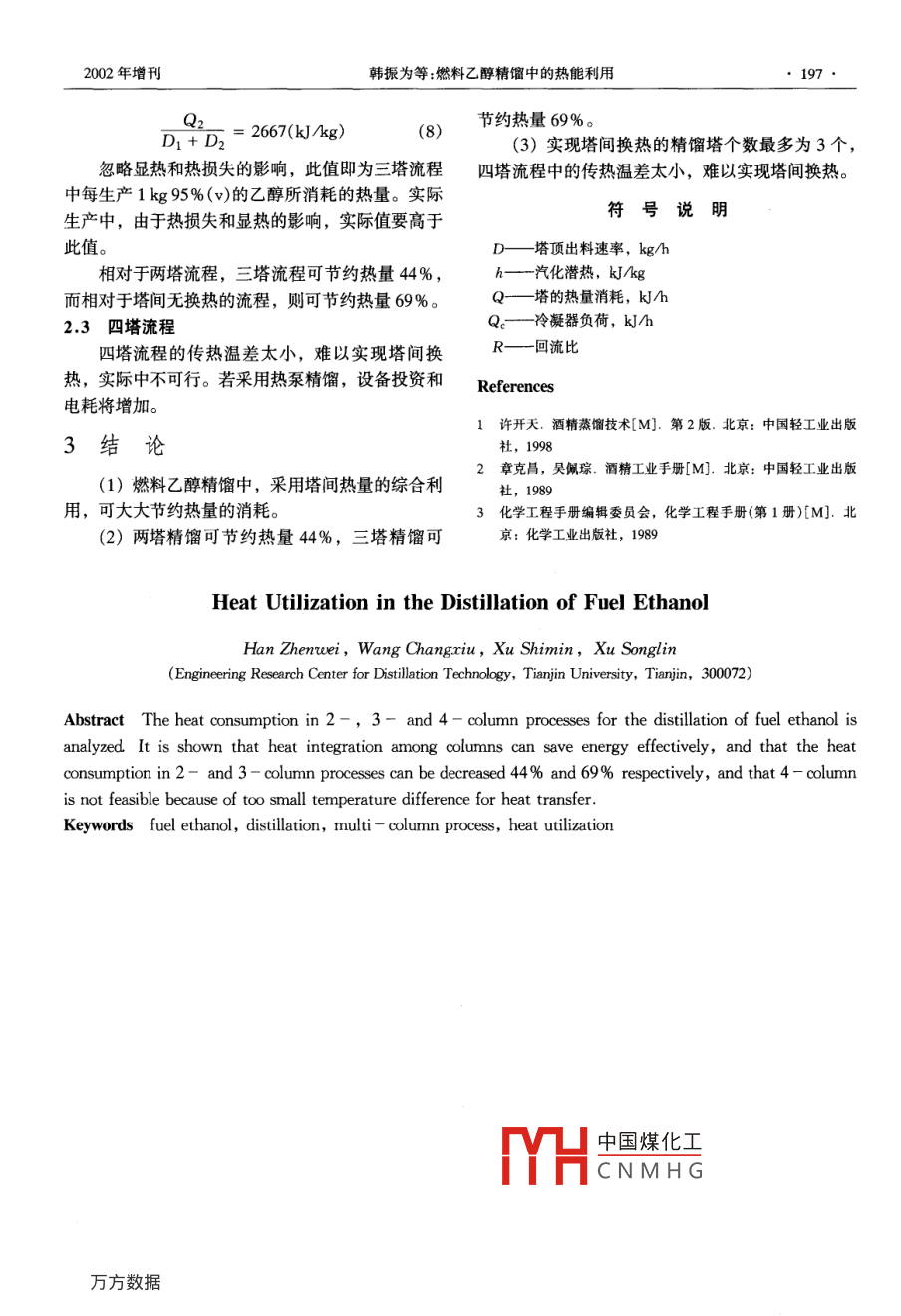 194·CHEMICAL INDUSTRY AND ENGINEERING PROGRESS2002年增刊燃料乙醇精餾中的熱能利用韓振為王昌秀徐世民許松林(天津大學(xué)精餾技術(shù)工程研究中心,天津,300072)摘要對于燃料乙醇精餾中的兩塔、三塔和四塔流程的熱量消耗和存在的問題進行了分析。結(jié)果表明,塔間熱量的綜合利用是一項有效的節(jié)能技術(shù),采用兩塔流程可節(jié)約熱量44%,三塔流程可節(jié)約熱量69%,四塔流程傳熱溫差過小,難以實現(xiàn)塔間的換熱。關(guān)鍵詞燃料乙醇,精餾,多塔流程,熱能利用中圖分類號TQ028文獻標(biāo)識碼A引言此,合理利用能量,降低精餾過程的熱量消耗對降低燃料乙醇的生產(chǎn)成本有重要意義。臨枯竭,同時,石油作為能源的大量使用,給環(huán)境1燃料乙醇精餾的工藝流程造成了嚴重污染。目前,各國都在競相研究和開發(fā)精餾工段的作用是對發(fā)酵工段過來的成熟醪液新型低污染的可再生能源,以替代當(dāng)前的石油能進行精餾,使乙醇濃度提高到95%(v)以上。根源。燃料乙醇即是一種非常理想的石油能源替代品。在汽油中加入適量的燃料乙醇,不但可以節(jié)省據(jù)精餾分離理論,對于乙醇一水體系的分離,采用石油能源,而且可以有效地降低排放污染。個精餾塔即可滿足要求,但由于醪液中僅含約發(fā)酵法生產(chǎn)燃料乙醇的過程包括原料的液化、10%的乙醇,濃度較低,且含有部分固體雜質(zhì),因糖化、發(fā)酵、精餾、脫水等過程,其中精餾過程的此乙醇精餾中通常采用粗餾塔和精餾塔兩個塔完成蒸汽消耗約占其生產(chǎn)總熱量消耗的一半左右,因乙醇-水的分離,如圖1所示。95%(V)乙醇成熟醪液粗餾塔h中國煤化工CNMHGFig 1 Schematic diagram for the distillation of fuel ethanol第一作者簡介韓振為,男,38歲,副研究員。E- mail whan@eyou.cm2002年增刊韓振為等燃料乙醇精餾中的熱能利用195降低精餾工段熱量消耗的最有效方法就是塔間熱量以利用其塔頂?shù)恼羝鳛槠渌臒嵩础5魤毫Φ木C合利用。在圖1所示的兩塔流程中,如果將精過高,其加熱介質(zhì)的成本就會增加。同時,乙醇餾塔塔頂?shù)睦淠饔米鞔逐s塔塔釜的再沸器,可節(jié)水體系的共沸組成隨著壓力的增加而降低,當(dāng)壓力約熱量消耗近一倍達到0.5066MPa時,共沸物的乙醇濃度為95%為了進一步節(jié)約蒸汽消耗,可采用三塔、四塔(wt)2),若再增加壓力,將得不到95%(wt)的乙或更多的塔組成的流程,但因為受冷卻介質(zhì)溫度和醇。此壓力下水的飽和溫度約為152℃13,若采用塔操作壓力的限制,精餾塔的數(shù)目不可能太多。本水蒸氣作為加熱介質(zhì),其壓力應(yīng)在0.6MPa(絕文分析了兩塔、三塔和四塔流程的節(jié)能效果和存在壓)以上,若再增加壓力,加熱蒸汽的壓力也要相的問題。應(yīng)增加。對于燃料乙醇的精餾,脫水工段要求的乙1.1各塔操作壓力的確定醇濃度一般為不低于95%(v),相當(dāng)于92.4%為了實現(xiàn)塔間熱量的充分利用,各塔需在不同(wt),考慮設(shè)計余量后,塔的操作壓力可增加至的壓力下操作。操作壓力最高的塔與操作壓力最低0.55MPa(塔頂)。的塔之間的壓差越大,塔間熱量的利用越容易實1.2多塔流程中精餾塔的個數(shù)現(xiàn)。對于操作壓力最低的塔,應(yīng)選擇較低的壓力,通過以上分析,燃料乙醇精餾中,最高操作壓但若壓力過低,該塔塔頂冷凝器冷介質(zhì)的成本就會力的塔壓力約為0.55MPa(塔頂絕壓),最低操作增加。粗餾塔的原料固含量較高,不宜在髙溫下操壓力的塔壓力約為0.04MPa(塔頂絕壓)。若選擇作,且塔頂可利用的熱量較少,因此,選擇粗餾塔粗餾塔在最低壓力下操作,其壓力降按0.00MPa在最低壓力下操作較為合理。粗餾塔塔頂蒸汽含乙計算,其余各塔壓力降均按0.029MPa計算,塔醇約40%(wt)(1,經(jīng)熱力學(xué)平衡計算可知,在頂乙醇蒸汽按92.4%(wt)計算,則可計算出兩塔0.04kPa壓力下的泡點溫度約70℃。若再降低壓流程中平均傳熱溫差約為48℃,三塔流程中的平力,冷凝的成本可能會增加,實際上,除乙醇和水均傳熱溫差約為10℃,四塔流程在上述塔壓降條外,發(fā)酵過程中還會產(chǎn)生一些乙醛、甲醇等輕組件下無法實現(xiàn)塔間換熱。即使各塔壓降為零,平均分,使冷凝成本會進一步增加。傳熱溫差也不到1℃。因此,實際生產(chǎn)中能夠?qū)崿F(xiàn)對于操作壓力最高的塔,應(yīng)選擇較高的壓力,塔間換熱的精餾塔個數(shù)最多為3個。95%(v)乙醇成熟醪液中國煤化工CNMHG粗餾塔Fig 2 Schematic diagram of 2-column process196化工進展002年增刊95%(v)乙醇95%(v)乙醇成熟醪液粗餾塔第一精餾塔第二精餾塔2不同工藝流程的熱量消耗頂蒸汽作為第一精餾塔的加熱介質(zhì),第一精餾塔的塔頂蒸汽作為粗餾塔的加熱介質(zhì)。2.1兩塔流程第一個精餾塔所需熱量為:如圖2所示,將精餾塔塔頂?shù)睦淠髯鳛榇逐sQ1=(R+1)D1h(1)塔塔釜的再沸器,所需熱量可由精餾塔的冷凝負荷第二個精餾塔冷凝器負荷為(氣相出料):近似計算。乙醇蒸汽的潛熱用常壓下含乙醇Q 3= RD2h292.4%(wt)的乙醇蒸汽潛熱(約為960kJ/kg{2)將第二個精餾塔的冷凝器作為第一個精餾塔的近似計算,回流比取為4,則可計算出精餾塔每生再沸器,因此有:產(chǎn)1kg產(chǎn)品所消耗的熱量為:=(4+1)×960=4800(kJ/kg)近似認為忽略顯熱和熱損失的影響,此值即為每生產(chǎn)hI =h2=h(4)1kg95%(v)的乙醇所消耗的熱量。實際生產(chǎn)中,由式(1)~(4)可以得到由于熱損失和顯熱的影