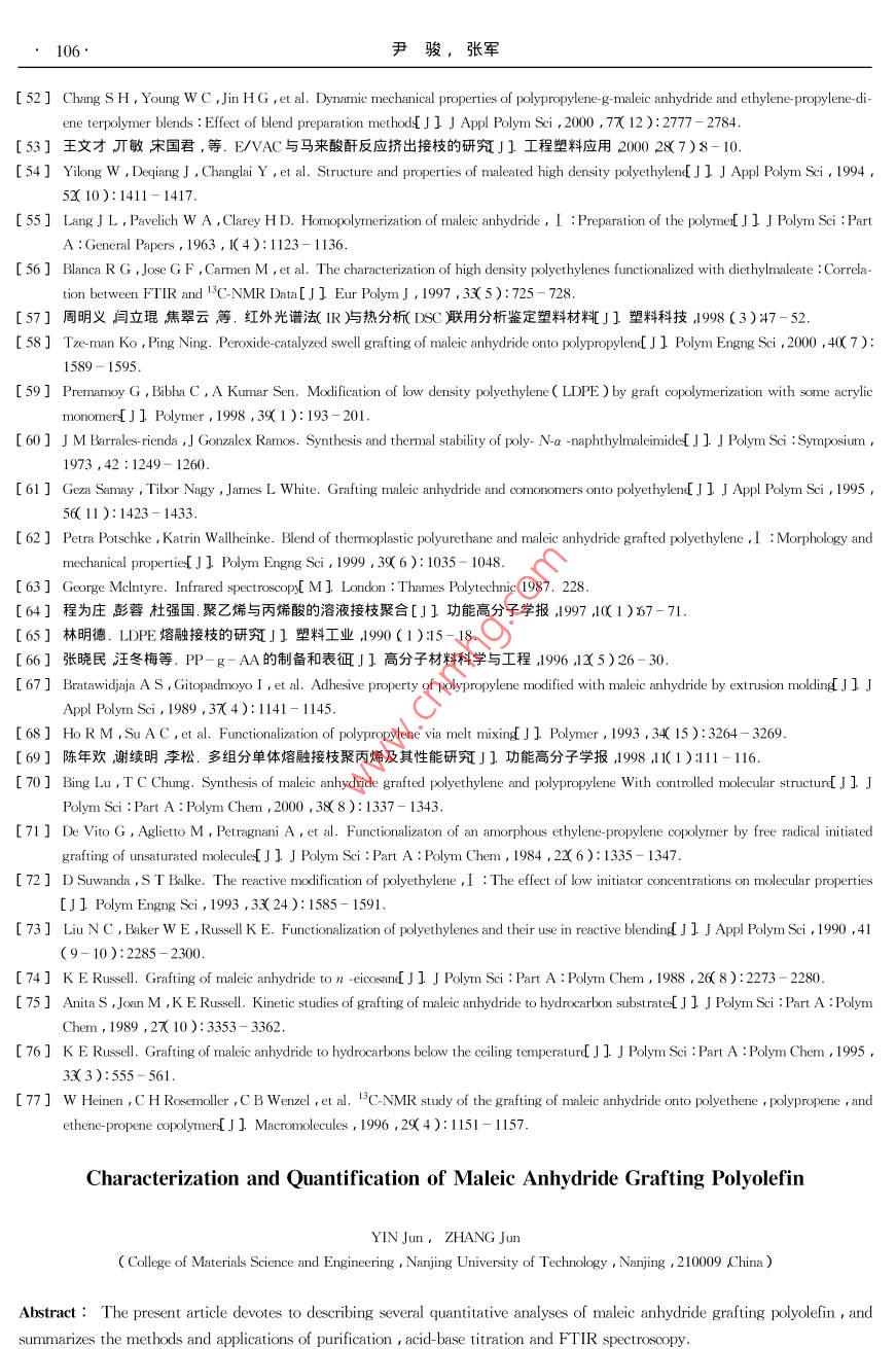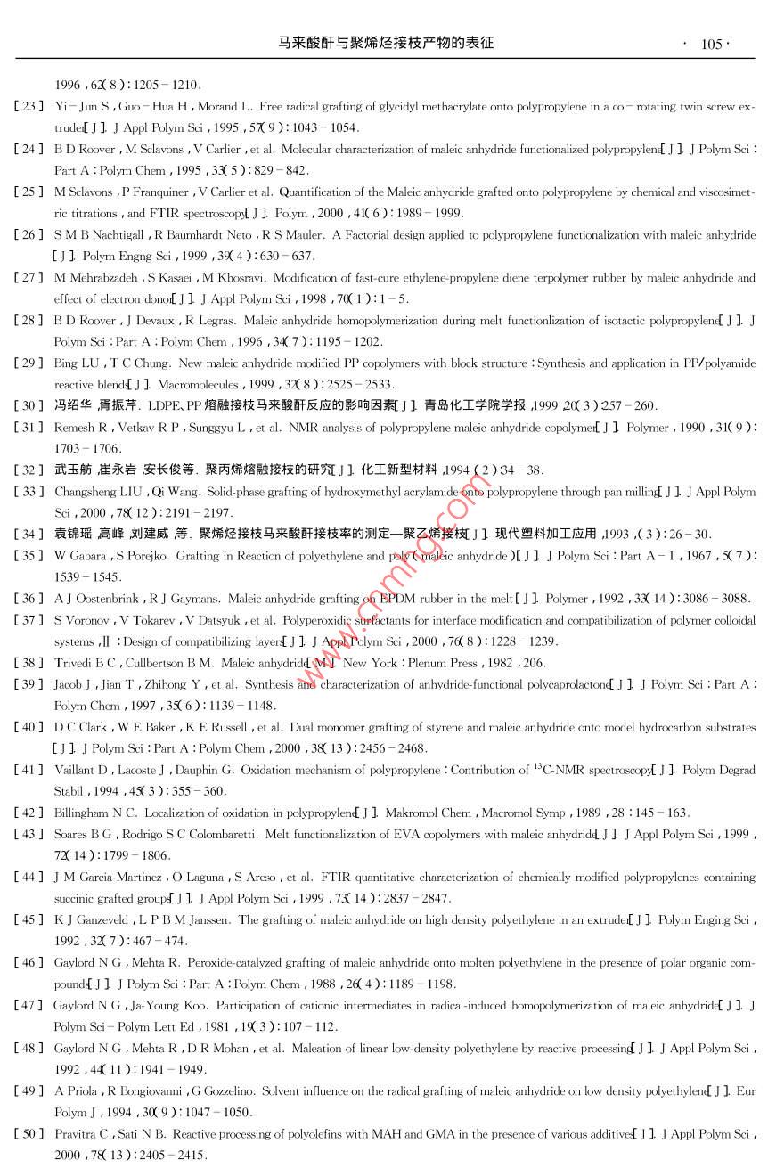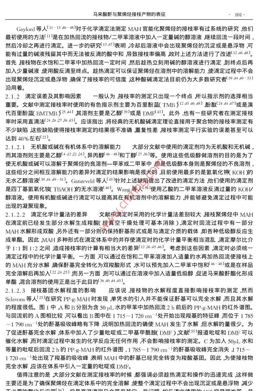 Vol. 15功能高分子學報No.12002年3月Journal of Functional PolymersMar. 2002綜述”馬來酸酐與聚烯烴接枝產物的表征尹駿,張軍**(南京工業(yè)大學材料科學與工程學院南京210009)摘要:綜述了馬來酸酐與聚烯烴接枝產物的多種表征手段重點分析了純化處理、化學滴定以及紅外分析方法的表征原理、應用和改進方法。關鍵詞:聚烯烴;馮來酸酐接枝中圖分類號:063 .文獻標識碼: A文章編號: 1008 - 9357( 2002 )1 - 0099- 08馬來酸酐( MAH )接枝改性聚烯烴是聚烯烴化學改性的重要途徑之- -(12。聚乙烯( PE )聚丙烯(PP和乙丙橡膠(EPDM)經由MAH改性后可以顯著地提高聚合物的粘結能力和親水性,及其與極性高分子的相容性(3。這些性能在很大程度上與接枝產物的接枝率、接枝位置及結構等各種因素密切相關,因此對接枝物的表征也就顯得極為重要。然而,由于聚烯烴官能化反應本身比較復雜反應所得到的產物實際上是含有多種組分的混合物,而且,MAH在聚烯烴上的接枝量非常少,所以對于接枝產物的純化處理以及表征-直是接枝改性研究中的重點與難點。近年來,各種用于高分子改性引入的特定反應型官能團的表征手段得到了迅速發(fā)展其中使用最多的是傅立葉紅外光譜核磁共振凝膠滲透色譜法以及化學滴定法等這些表征方法的引入對于認識和了解接枝反應發(fā)生的機理以及產物的結構有極大的幫助。1接枝產物的純化1.1純化的目的MAH接枝聚烯烴通常是由MAH與相應的聚烯烴在有機過氧化物引發(fā)劑存在下經自由基接枝反應制得反應可在溶液中(4-7)或是熔融狀態(tài)[8- 10]下進行。由于溶液法中需要引入大量的溶劑,而熔融法中的副反應又很嚴重故而對接枝產物的后處理比較困難。引發(fā)劑分解產生的初級自由基使聚烯烴脫氫產生聚烯烴自由基生成的聚烯烴自由基除與MAH發(fā)生接枝反應外,也會帶來PE的交聯(lián)11.12)、PP的降解13)以及EPDM中上述兩種副反應的同時出現(xiàn)14)這些副產物都需要通過純化處理與接枝物分離,否則會直接影響表征結果。還需要指出的是盡管MAH的-C=C-雙鍵上的1 2-雙取代作用產生立體位阻及強烈的吸電子性,以至于-些文獻中( I5- 18)在研究MAH的接枝反應時都不考慮MAH的均聚反應或以其反應甚微而忽略不計,但事實上還是有很多研究11-14.1920)證實了MAH的均聚反應在接枝反應中的確存在并且因發(fā)現(xiàn)其對反應機理有著很大的影響而做了很多的工作所以對于MAH在反應中由引發(fā)劑的分解發(fā)生均聚反應而產生的聚馬來酸酐(PMAH)不能忽略,而且在純化處理中必須加以考慮。此外在熔融接枝時,由于反應時間較短,體系中還會殘留未完全反應的剩余物,如MAH單體、引發(fā)劑及各種穩(wěn)定劑等需要通過純化處理予以除去。1.2 純化方法為得到純度比較高的接枝產物,-般采用的方法是溶劑選擇性分離11-14.160。首先應對未純化接枝物預先進行真空干燥產物表層的部分未反應的MAH單體因升華被除去。將經干燥處理的接枝物收稿日期:2001-09 -20**作者簡介:尹駿( 1978- )男江蘇南京人碩士研究生研究方向:聚烯烴的官能化接枝改性及應用。E mail : cupidyin@263. net*** 通訊聯(lián)系人:張軍( 1964- )男江蘇姜堰人副教授研究方向:高分子材料改性及功能高分子。E - mail : zhangjun@ njuct. edu.100 .尹駿,張軍倒入溶劑甲苯或二甲苯)中加熱回流使其完全溶解此時溶液中所含的組分應該包括聚烯烴的接枝物、MAH單體以及均聚物和一些低分 子物質等而不溶物質則主要是聚烯烴的交聯(lián)物( PE等。然后再把熱溶液立刻濾入未加熱的大量丙酮中過濾時所得不溶物質回收后真空干燥計算凝膠含量。濾液在丙酮中出現(xiàn)絮狀沉淀,由 于丙酮是MAH及其均聚物的良溶劑故通過這樣的處理可以將MAH及其均聚物完全除去將沉淀濾出后再用丙酮清洗數(shù)遍并干燥后,即得到精制接枝產物。為精確計,-般文獻中將純化過程重復數(shù)次而Clark等人(21)對PE的接枝物分別進行- -次和多次純化后發(fā)現(xiàn)其接枝率并沒有發(fā)生變化,因此認為多次重復并沒有必要。Sclavons等人22]對PP與MAH的未純化接枝物、經100 h、120 C真空干燥的接枝物以及經過純化處理的精制接枝物等三種產物分別測定其接枝率發(fā)現(xiàn)接枝率依次降低,這說明在干燥過程殘留的MAH單體發(fā)生了升華,由于PP在接枝反應中只發(fā)生降解而不發(fā)生交聯(lián)故純化處理前后接枝率的差值基本.上可以認為是MAH的均聚物和低分子量的PP接枝物被純化洗滌除去的依據(jù),同時也證明在聚烯烴與MAH的接枝反應中的確存在著MAH的均聚反應。Sun 等人(23將回流結束的PP接枝物分別倒入甲醇和丙酮中沉析前者可以沉析改性PP和反應中產生的其它均聚物,而后者僅對PP接枝物起沉淀作用通過這兩種不同的沉淀法可以對接枝反應中可能發(fā)生的均聚、共聚反應之間的關系以及其對接枝反應本身的影響加以研究。此外在對PP接枝MAH的研究中也可以對試樣的FTIR譜圖進行分析若譜圖中在720cm-1處的表征MAH中碳碳雙鍵特征吸收峰完全消失即可以確認體系中未反應MAH單體經純化處理完全除去(2425。關于純化處理的方法,也有人(1726- 30]提出先將接枝物高溫下壓成-定厚度的薄片剪碎后使用索氏抽提器在丙酮中萃取10~48h抽提出未接枝的MAH以及剩余的引發(fā)劑等或是對接枝物直接進行熱風或熱水處理(31 - 331使MAH轉化為相應的酸再加以除去。這