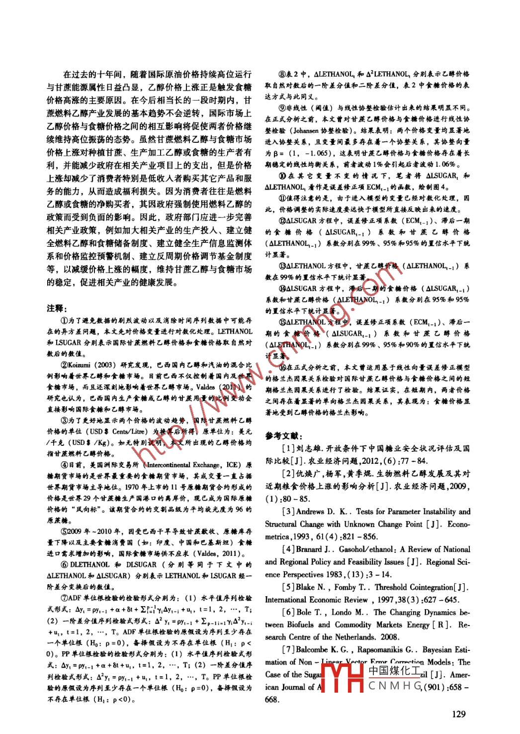 《經(jīng)濟(jì)問題探索》2014年第2期國際甘蔗燃料乙醇與食糖市場間的非對(duì)稱價(jià)格傳導(dǎo)效應(yīng)黃春全,司偉(中國農(nóng)業(yè)大學(xué),北京100083)摘要:為了探究國際甘蔗燃料乙醇與食糖市場間價(jià)格聯(lián)系的內(nèi)在規(guī)律,本文運(yùn)用值向量誤差修正模型對(duì)兩者價(jià)格間的動(dòng)態(tài)傳導(dǎo)效應(yīng)進(jìn)行了研究。研究證實(shí):在長期內(nèi),甘蔗燃料乙醇價(jià)格與食糖價(jià)格之間存在非線性的闊值均衡關(guān)系,且相互之間產(chǎn)生雙向格蘭杰因果影響。在短期內(nèi),價(jià)格對(duì)偏離長期均衡的短期調(diào)整則呈現(xiàn)出非對(duì)稱性,其調(diào)整方向與速度在不同的價(jià)格水平上存在著明顯的差異。當(dāng)價(jià)格系統(tǒng)偏離均衡且乙醇價(jià)格較低時(shí),乙醇價(jià)格會(huì)向上微調(diào),而食糖價(jià)格則快速下調(diào);此時(shí),食糖價(jià)格受到乙醇價(jià)格的顯著格蘭杰影響,較低的乙醇價(jià)格有力地遁制了食糖價(jià)格的上漲。當(dāng)乙醇與食糖的價(jià)差拉大且乙醇價(jià)格較高時(shí),乙醇價(jià)格和食糖價(jià)格都向上調(diào)整,但乙醇價(jià)格調(diào)整速度明顯更快;此時(shí),價(jià)格之間存在雙向格蘭杰因果關(guān)系,不斷葶升的乙醇價(jià)格帶動(dòng)食糖價(jià)格持續(xù)上揚(yáng),同時(shí),不斷上漲的食糖價(jià)格又反過來正向推動(dòng)乙醇價(jià)格上升。隨著近年來甘蔗能源屬性的不斷強(qiáng)化,甘蔗乙醇價(jià)格對(duì)食糖價(jià)格的彩響正在不斷加強(qiáng)。最后,本文針對(duì)性地提出了維護(hù)甘蔗乙醇和食糖價(jià)格穩(wěn)定的相關(guān)政策建議。關(guān)鍵詞:甘蔗燃料乙醇;食糖;價(jià)格傳導(dǎo);闔值協(xié)整;非對(duì)稱調(diào)整引言價(jià)格之間的聯(lián)系正在強(qiáng)化已是不爭的事實(shí)。已有大量研隨著世界經(jīng)濟(jì)的高速發(fā)展,經(jīng)濟(jì)對(duì)能源的依賴不斷究表明生物能源發(fā)展正是近期全球農(nóng)產(chǎn)品價(jià)格(玉米增強(qiáng),從而使能源安全、環(huán)境保護(hù)與經(jīng)濟(jì)發(fā)展之間的矛食糖、小麥、大豆、油菜籽等)快速上漲的重要原因盾日益突出。此時(shí),生物能源的興起無疑給世界帶來了(例如:仇煥廣等,2009;劉志雄,2012; Elobeid et aL,希望。目前已有許多國家將對(duì)生物能源的開發(fā)與利用作206; Schmidhuber,2006; Von braun,2007a,2007b為解決問題的突破口。然而,生物能源既是問題的解決 Tokgoz and El007; Wagner, 2009; Serra et al.者又是問題的制造者( Gardner and Tyner,2007)。與食2010,201l,20b; Monteiro et al.,2012; Elmarzougui用和飼用農(nóng)產(chǎn)品消費(fèi)需求相比,生物能源對(duì)農(nóng)產(chǎn)品的需 and Larue,2013),甚至更有部分學(xué)者將農(nóng)產(chǎn)品價(jià)格的求不僅增長迅速,而且潛在需求量也十分巨大。目前,高漲主要或全部歸咎于生物燃料產(chǎn)業(yè)的快速發(fā)展越來越多的甘蔗、玉米、植物油和動(dòng)物脂肪正被用來生( Mitchel,2008; Rosegrant,2008; Chakravorty,2009)。產(chǎn)燃料乙醇或生物柴油,以替代石油用作汽車燃料,以可見,學(xué)界普遍認(rèn)同,生物能源產(chǎn)業(yè)的發(fā)展緊密了能源致生物能源在農(nóng)產(chǎn)品價(jià)格上漲中所扮演的角色飽受爭價(jià)格與農(nóng)產(chǎn)品價(jià)格之間的聯(lián)系,并且開始影響甚至主導(dǎo)議農(nóng)產(chǎn)品價(jià)格的走向。目前,有關(guān)生物能源產(chǎn)業(yè)發(fā)展對(duì)農(nóng)產(chǎn)品價(jià)格影響的甘蔗燃料乙醇與食糖市場是觀察生物能源與農(nóng)產(chǎn)品命題已經(jīng)引起了學(xué)界的廣泛關(guān)注( silberman et al.,市場價(jià)格聯(lián)系的典型案例。 Rapsomanikis和Hlam2013)。從現(xiàn)有研究文獻(xiàn)來看,雖有部分學(xué)者認(rèn)為,生(2006)研究發(fā)現(xiàn),巴西國內(nèi)原油價(jià)格、甘蔗乙醇價(jià)格物能源產(chǎn)業(yè)發(fā)展對(duì)農(nóng)產(chǎn)品價(jià)格的正向推動(dòng)作用并不大和食糖價(jià)格之間存在長期協(xié)整關(guān)系,外生于該經(jīng)濟(jì)系統(tǒng)(例如:Dawe,2008; Bole and Londo,2008; Zhang et的石油價(jià)格是乙醇價(jià)格和食糖價(jià)格的長期驅(qū)動(dòng)因素;乙al.,2009,2010;Sema,2011)。然而,早在30年前就醇價(jià)格與食糖價(jià)格之間呈現(xiàn)出了線性調(diào)整過程,并未發(fā)有學(xué)者研究指出,在隨后的十年內(nèi),乙醇燃料的生產(chǎn)極現(xiàn)兩者之間存在非線性關(guān)系;食糖價(jià)格對(duì)乙醇價(jià)格產(chǎn)生有可能干擾國際農(nóng)產(chǎn)品市場的價(jià)格體系(例如:Bar-格蘭杰影響,其因果關(guān)系層次是原油價(jià)格通過食糖價(jià)格nard,1983)。尤其是近幾年來,生物能源價(jià)格與農(nóng)產(chǎn)品影響乙醇價(jià)格,而并非是最初預(yù)計(jì)的原油價(jià)格通過乙醇作者簡介:黃春仝(1981-),男,廣東省高州人,中國農(nóng)業(yè)大學(xué)經(jīng)濟(jì)管理學(xué)院博士研究生(經(jīng)濟(jì)師),研究方向?yàn)檗r(nóng)產(chǎn)品市場與貿(mào)易及產(chǎn)業(yè)經(jīng)濟(jì);司偉(1978-),男,安徽省太和縣人,中國農(nóng)業(yè)大學(xué)經(jīng)濟(jì)管理學(xué)中國煤化工向?yàn)橐庐a(chǎn)品貿(mào)易與產(chǎn)業(yè)經(jīng)濟(jì)基金項(xiàng)目: