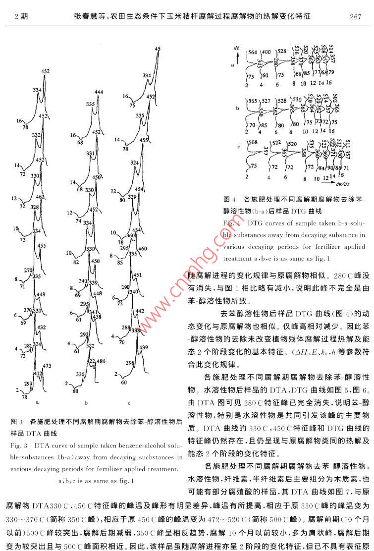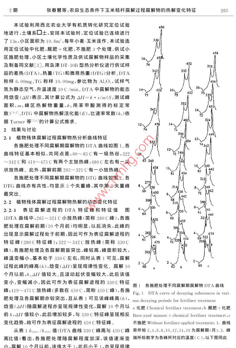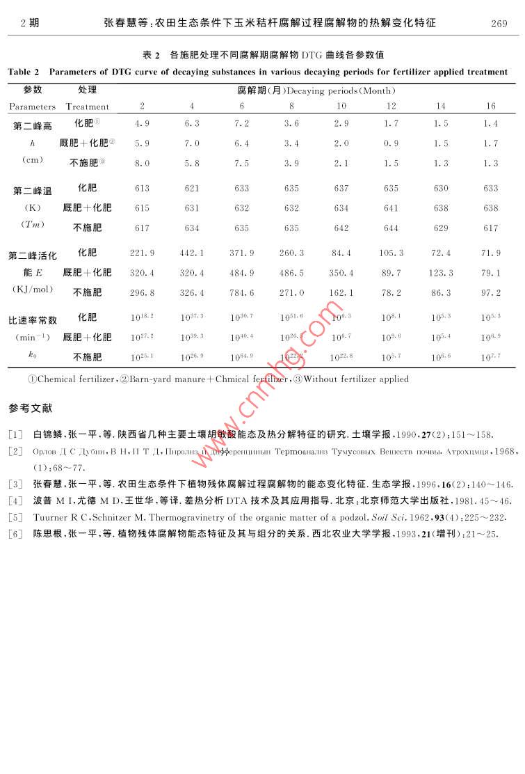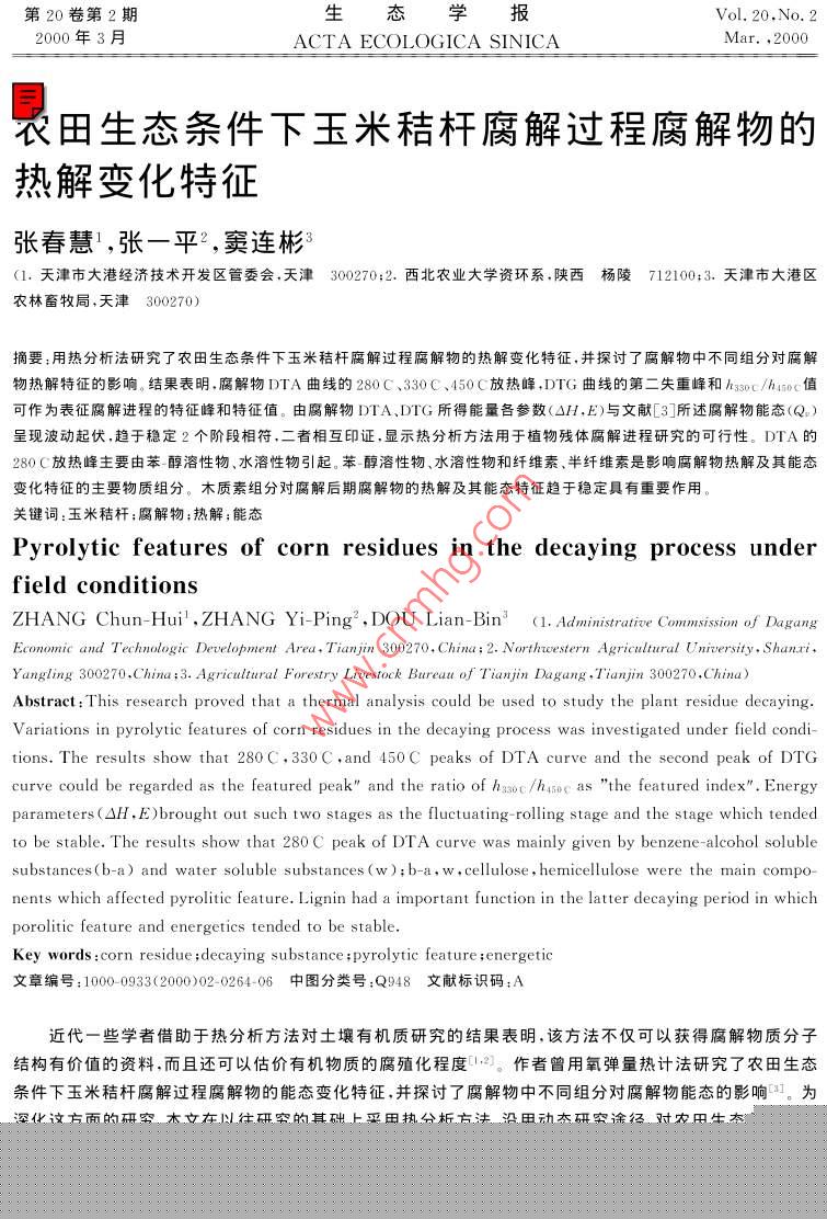 第20卷第2期生態(tài)學(xué)報Vol. 20.No. 22000年3月ACTA ECOLOGICA SINICAMar. ,2000衣田生態(tài)條件下玉米秸桿腐解過程腐解物的熱解變化特征張春慧',張一平2 ,竇連彬3(1.天津市大港經(jīng)濟(jì)技術(shù)開發(fā)區(qū)管委會.天津300270;2. 西北農(nóng)業(yè)大學(xué)資環(huán)系,陜西楊陵712100;3. 天津市大港區(qū)農(nóng)林畜牧局,天津300270)摘要:用熱分析法研究了農(nóng)田生態(tài)條件下玉米秸桿腐解過程腐解物的熱解變化特征,并探討了腐解物中不同組分對腐解物熱解特征的影響,結(jié)果表明.腐解物DTA曲線的280C、330C、450C放熱峰,DTG曲線的第二失重峰和h33o0c/husoc值可作為表征腐解進(jìn)程的特征峰和特征值。由腐解物DTA、DTG所得能量各參數(shù)(OH,E)與文獻(xiàn)[3]所述腐解物能態(tài)(Q呈現(xiàn)波動起伏,趨于穩(wěn)定2個階段相符.二者相互印證,顯示熱分析方法用于植物殘體腐解進(jìn)程研究的可行性。DTA的280C放熱峰主要由苯醇溶性物、水溶性物引起。苯醇溶性物、水溶性物和纖維素、半纖維素是影響腐解物熱解及其能態(tài)變化特征的主要物質(zhì)組分。木質(zhì)素組分對腐解后期腐解物的熱解及其能態(tài)特征趨于穩(wěn)定具有重要作用。關(guān)鍵詞:玉米秸桿;腐解物;熱解;能態(tài)Pyrolytic features of corn residues in the decaying process underfield conditionsZHANG Chun-Hui' ,ZHANG Yi- Ping2 ,DOU Lian-Bin'(1. Administrative Compmisso of DagangEcomomic and Technologic Development Area , Tianjin 300270, Chinc; 2. Northrvestern Agricultural University . Shanti,Yangling 300270. hina ;3. Agricultural Forestry Livestock Bureau of Tianjin Dagang .Tianjin 300270.China)Abstract: This research proved that a thermal analysis could be used to study the plant residue decaying.Variations in pyrolytic features of corn residues in the decaying process was investigated under field condi-tions. The results show that 280C,330C ,and 450C peaks of DTA curve and the second peak of DTGcurve could be regarded as the featured peak" and the ratio of hssoc /hasoc as "the featured index" . Energyparameters (OH . E)brought out such two stages as the fluctuating- rolling stage and the stage which tendedto be stable. The results show that 280C peak of DTA curve was mainly given by benzene- alcohol solublesubstances(b-a) and water soluble substances (w); b-a, w,cellulose , hemicellulose were the main compo-nents which aected pyrolitic feature. Lignin had a important function in the latter decaying period in whichporolitic feature and energetics tended to be stable.Key words :corn residue ;decaying subs tance ;pyrolytic feature ;energetic文章編號:1000 -0933(2000>02 0264-06中圖分類號 :Q948文獻(xiàn)標(biāo)識碼:A近代一些學(xué)者借助于熱分析方法對土壤有機(jī)質(zhì)研究的結(jié)果表明,該方法不僅可以獲得腐解物質(zhì)分子結(jié)構(gòu)有價值的資料,而且還可以估價有機(jī)物質(zhì)的腐殖化程度[.2)。作者曾用氧彈量熱計法研究了農(nóng)田生態(tài):條件下玉米秸桿腐解過程腐解物的能態(tài)變化特征,并探討了腐解物中不同組分對腐解物能態(tài)的影響。為深化這方面的研究,本文在以往研究的基礎(chǔ)上采用熱分析方法、沿用動態(tài)研究途徑,對農(nóng)田生態(tài)條件下植物殘體腐解過程腐解物的熱分解(熱解)特征進(jìn)行探討,為植物殘體腐解過程能態(tài)變化研究探索新的途徑和累積新的資料。1材料與方法2期張春慧等:農(nóng)田生態(tài)條件下玉米秸桿腐解過程腐解物的熱解變化特征265本試驗利用西北農(nóng)業(yè)大學(xué)有機(jī)質(zhì)轉(zhuǎn)化研究定位試驗450地進(jìn)行,土壤系口土,安排本試驗時,定位試驗已連續(xù)進(jìn)行了13a.小區(qū)面積為19.8m2,每年小麥玉米連作。本試驗選330用定位試驗中化肥,廄肥+化肥,不施肥3個處理,供試小區(qū)施肥處理,小區(qū)土壤化學(xué)性質(zhì)及供試腐解物樣品的采集16<、45及制備同文獻(xiàn)[3]。用島津DT-30B型熱分析儀進(jìn)行供試樣¥$2335332品的差熱(DTA),熱重(TG )和微商熱重(DTG)分析。DTAM\稱樣6. 00mg.TG稱樣10. 00mg,參比物為AlO,試樣氣456氛為靜態(tài)空氣,升溫速度10C/min. DTA中腐解物的能態(tài)1m ) 4s5 16160用焓變(0H)表示,其計算公式為0H=k●s/m(S:測試峰75s2 7面積.m:峰區(qū)熱解物重量,k:用苯甲酸測得的標(biāo)定常3314.數(shù))+[1.DTG中腐解物熱解活化能(E),比速率常數(shù)(ke)依據(jù)Turner等C5.1的計算公式推求。322結(jié)果與討論7474492.1植物殘體腐解過程腐解物熱分析曲線特征12333各施肥處理不同腐解期腐解物的DTA曲線如圖1。各7434212~曲線特征基本相似,共同點(diǎn)是.60~85C有-吸熱谷,32210、~342C和419~475C有兩個主放熱峰,480C左右有' -尖85 34010 340狀放熱峰。此外,腐解前期265~321C有-小放熱峰。58104281 I 454各施肥處理不同腐解期腐解物的DTG曲線如圖2。各270 \DTG曲線亦有共性,均顯示3個失重峰,其中第2失重峰Bi 238314最突出。59 4502.2植物殘體腐解過程腐解物熱解的動態(tài)變化特征308)683102.2.1表征腐解進(jìn)程的DTA特征峰和特征值圖6-50661321401DTA曲線中.265~321C小放熱峰(簡稱280C峰),各施420435肥處理在腐解前期(10個月前)均明顯,以后消失,此峰的306出現(xiàn)顯示腐解過程處于前期,因此可作為表征腐解進(jìn)程的330 4-47432654特征峰(280C特征峰);322~342C放熱峰(簡稱330C.475‘ 613201峰),各施肥處理及各腐解期皆突出,峰較高,峰面積較大,305|峰溫變幅小,基本處于330C 左右,同時從表1可見,腐解過程此峰的峰高(h),焓變(0H)呈現(xiàn