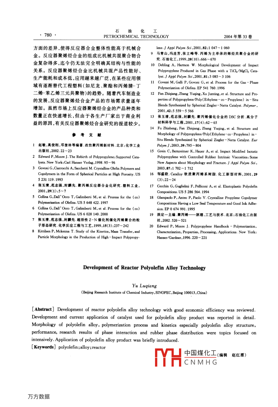 石油化004年第33卷第8期PETROCHEMICAL TECHNOLOGY777進展與述評反應(yīng)器聚烯烴合金技術(shù)的進展于魯強國石化集團北京化工研究院,北京100013)[摘要]綜述了反應(yīng)器聚烯烴合金技術(shù)的進展情況,介紹了反應(yīng)器聚烯烴合金的催化劑及最新應(yīng)用的發(fā)展方向;介紹了反應(yīng)器聚烯烴合金的聚合物顆粒形態(tài)、聚合動力學(xué)及聚合工藝特點;在反應(yīng)器聚烯烴合金結(jié)構(gòu)與性能表征方面,介紹了相界面相容性和橡膠相顆粒分散的研究成果;介紹了目前反應(yīng)器聚烯烴合金產(chǎn)品及其應(yīng)用情況[關(guān)鑣詞]聚烯烴;合金;反應(yīng)器[文章端號]1000-8144(2004)08-0777-04[中圈分類號]TQ052文獻標(biāo)識碼]A聚烯烴合金是指含有多種烯烴均聚物或共聚物高孔隙度的均聚物顆粒,在共聚反應(yīng)過程中才能容組分的聚烯烴多相混合物。反應(yīng)器聚烯烴合金是指納更多烯烴共聚物。1983年, Himont公司在研究在反應(yīng)器中直接反應(yīng)生成的聚烯烴多相共聚物。由“低白點”聚丙烯抗沖共聚物過程中發(fā)現(xiàn),加入一定于 Ziegler-Natt“第四代”聚烯烴催化劑在催化劑量的高密度聚乙烯(HDPE)能夠有效地減少抗沖聚微觀孔結(jié)構(gòu)控制方面取得了突破,從而奠定了烯烴丙烯應(yīng)力變白的現(xiàn)象。根據(jù)上述結(jié)論,他們進行了聚合的“反應(yīng)器顆粒技術(shù)”( Reactor Granule Tech中試聚合試驗:在丙烯均聚、乙烯丙烯多相共聚產(chǎn)生nology)基礎(chǔ)“反應(yīng)器顆粒技術(shù)”為生產(chǎn)反應(yīng)器聚烯乙烯丙烯無規(guī)共聚物(EPR)之后,再串聯(lián)上一個氣烴合金提供了基本保證。相反應(yīng)器用于生成HDPE,但實驗結(jié)果并沒有得到烯烴聚合“反應(yīng)器顆粒技術(shù)”是指烯烴單體在以HDPEMgC2為載體的催化劑上進行可控復(fù)形聚合,逐漸研究發(fā)現(xiàn),經(jīng)過多相共聚以后,聚合物顆粒內(nèi)部生成一個多孔的球形顆粒,其后可以引入其它單體已被EPR“填滿”,乙烯單體無法擴散到活性中心繼進行聚合形成聚合物合金。續(xù)反應(yīng)生成HDPE。后來, Himont公司運用催化劑本工作跟蹤了反應(yīng)器聚烯烴合金技術(shù)近期的進載體高度脫醇技術(shù)制備出高孔隙率的催化劑解展,分別從反應(yīng)器聚烯烴合金催化劑聚烯烴合金聚決了這個問題。隨后 Himont公司對催化劑進一步合動力學(xué)和聚合工藝特點、聚烯烴合金產(chǎn)品的結(jié)構(gòu)改進,使得聚合物顆粒中可以容納更多的橡膠和其與性能及聚烯烴合金的產(chǎn)品應(yīng)用等方面進行了它特殊的添加劑3綜述。目前商業(yè)化的以MgCl2為載體的高孔隙率的Ziegler-Na“第四代”球形聚丙烯催化劑可以用來1用于反應(yīng)器聚烯烴合金的催化劑生產(chǎn)聚烯烴合金。用于生產(chǎn)反應(yīng)器聚烯烴合金的催化劑必須具備文獻4報道,北京化工研究院的DQ系列催化以下5個條件1:(1)大的比表面積;(2)高的空原劑生成的聚丙烯合金中乙烯質(zhì)量分?jǐn)?shù)高達27%時率,孔徑分布均勻;(3)催化劑活性中心分布均勻;聚合物顆粒仍具有很好的流動性能(4)催化劑的機械強度足以承受機械變化過程,但又均相茂金屬催化劑雖具有很好的均聚和共聚性能夠讓聚合物增長時產(chǎn)生的壓力將內(nèi)部結(jié)構(gòu)破碎成能,但由于很難控制生成聚合物的顆粒形態(tài),所以限制了其應(yīng)用的范圍。將茂金屬催化劑負(fù)載到多孔的較小顆粒,并均勻地分布在膨脹著的聚合物內(nèi)部;(5)單體可以自由地擴散到催化劑內(nèi)部而發(fā)生聚合聚合物顆粒上后,可以得到等規(guī)、間規(guī)、無規(guī)、EPR反應(yīng)。等所有茂金屬催化劑能夠得到的聚合物并且可中國煤化工反應(yīng)器聚烯烴合金的催化劑具有高孔隙率是稿日別于以往催化劑最主要的特點之一。高孔隙率的催作著簡介手(0),男,山東省煙臺市人,士,高級工程化劑可以使反應(yīng)生成高孔隙度的均聚物顆粒,具有師電話010-64273136電郵yq@bri.ae.cm石778PETROCHEMICAL TECHNOLOGY2004年第33卷控制聚合物顆粒的形態(tài)。了樹脂產(chǎn)品的范圍。然而,在無規(guī)共聚物方面液相具體方法是用高孔隙率 Ziegler- Natta催化劑本體聚合工藝(如 Spheripol工藝),即使采用高孔隙進行丙烯均聚后,使殘余的催化劑失活,然后在聚合率催化劑,也達不到增加無規(guī)共聚物含量的目的物上負(fù)載茂金屬催化劑進行二段共聚反應(yīng)56。與因為當(dāng)無規(guī)共聚物乙烯質(zhì)量分?jǐn)?shù)達到4%時,無規(guī)傳統(tǒng)的 Ziegler-Nat催化劑相比,茂金屬共聚物結(jié)共聚物會大量溶解在液相單體中而出現(xiàn)粘釜現(xiàn)象,構(gòu)均勻,尤其是通過改變茂金屬的結(jié)構(gòu),可在很大范聚合反應(yīng)之后經(jīng)過閃蒸脫出未反應(yīng)的單體時,溶解圍內(nèi)調(diào)控聚合物的微觀結(jié)構(gòu),合成出具有新型鏈結(jié)在單體中的無規(guī)共聚物會沉積在聚合物顆粒的表構(gòu)的共聚物。面,聚合物顆粒容易相互粘連造成結(jié)塊。通常情況“反應(yīng)器顆粒技術(shù)”的另外一個引人矚目的應(yīng)用下,乙烯質(zhì)量分?jǐn)?shù)為4%的聚丙烯無規(guī)共聚物的起是引人非烯烴聚合物,即不同種類的聚合催化劑負(fù)始軟化溫度大約在120℃左右,因此采用本體淤漿載到多孔的聚丙烯顆粒上,引人液相或氣相的