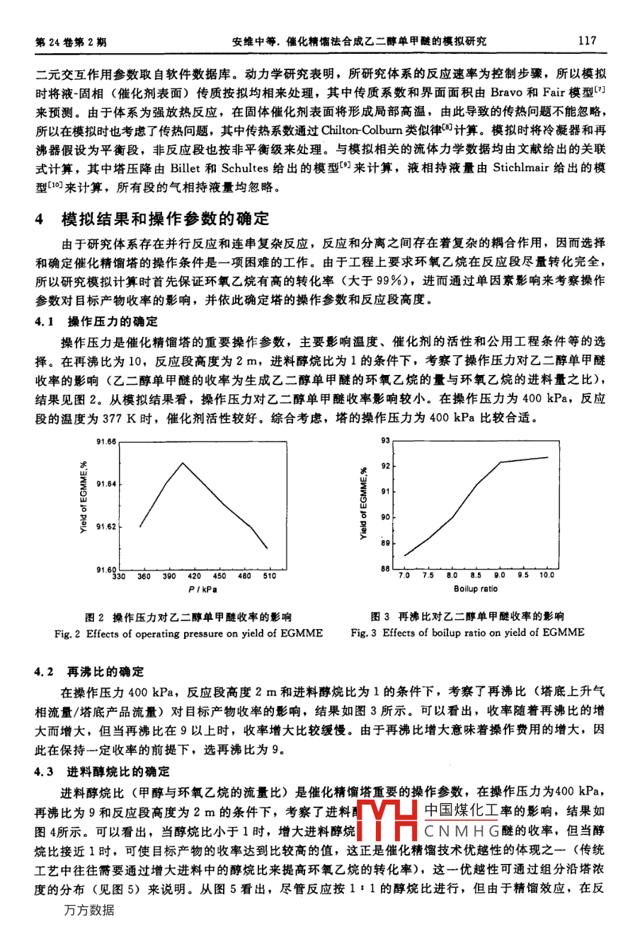 第24卷第2期化學(xué)反應(yīng)工程與工藝Vol 24, No 22008年4月Chemical Reaction Engineering and TechnologyApr.2008文章編號(hào):1001-7631(2008)02-0115-06催化精餾法合成乙二醇單甲醚的模擬研究安維中1董鳳蕾1國(guó)洪超劉兆濱2朱建民(1.中國(guó)海洋大學(xué)化學(xué)化工學(xué)院,山東青島266100;2.遼寧奧克化學(xué)集團(tuán),遼寧遼陽(yáng)11003摘要:提出以環(huán)氧乙烷和甲醇為原料,應(yīng)用催化精餾技術(shù)合成乙二醇單甲醚的工藝方法。采用基于非平衡級(jí)模型的模擬方法,考察關(guān)鍵操作參數(shù)對(duì)目的產(chǎn)物選擇性和收率的影響,并得到優(yōu)化的操作條件為400kPa,377K,甲醇和環(huán)氧乙烷流量均為0.078mo/s,再沸比9,反應(yīng)段高度1.8m,提餾段高度3.2m建立了中試規(guī)模的催化精餾塔對(duì)模擬結(jié)果進(jìn)行了驗(yàn)證。結(jié)果表明,采用催化精餾法合成乙二醇單甲醚,在優(yōu)化條件下乙二醇單甲醚收率達(dá)到93%以上,實(shí)驗(yàn)結(jié)果與模擬結(jié)果吻合良好,表明模擬方法可靠關(guān)鍵詞:乙二醇單甲醚;催化精餾;模擬;非平衡級(jí)模型中圖分類號(hào):TQ223.2+4Q203.2TQ0文獻(xiàn)標(biāo)識(shí)碼:A乙二醇單甲醚( ethylene glycol monomethyl ether, EGMME)是環(huán)氧乙烷的重要衍生物之是優(yōu)良的溶劑和有機(jī)合成中間體,廣泛應(yīng)用于印染、涂料及油墨等工業(yè)領(lǐng)域1。傳統(tǒng)的乙二醇單甲醚生產(chǎn)主要采用間歇釜式反應(yīng)工藝和連續(xù)管式反應(yīng)工藝2,但這些工藝存在諸多問題,如目標(biāo)產(chǎn)物的收率低、能耗高、均相催化劑分離困難且對(duì)設(shè)備的腐蝕嚴(yán)重等。催化精餾是將化學(xué)反應(yīng)與精餾分離結(jié)合在同一設(shè)備中進(jìn)行的一種耦合過程,因其顯著的優(yōu)點(diǎn)而備受關(guān)注。迄今,催化精餾技術(shù)已成功應(yīng)用于甲基叔丁基醚、乙基叔丁基醚和甲酸乙酯等的工業(yè)化生產(chǎn)3。許錫恩等用催化精餾技術(shù)合成乙二醇乙醚,為該類產(chǎn)品的生產(chǎn)提供了一種新的工藝方法。本研究以 ASPEN PLUS軟件為工具,采用非平衡級(jí)模型對(duì)乙二醇單甲醚中試催化精餾塔進(jìn)行了模擬與分析,為催化精餾法合成乙二醇單甲醚工業(yè)化提供技術(shù)支撐化學(xué)體系和反應(yīng)動(dòng)力學(xué)乙二醇單甲醚由環(huán)氧乙烷(EO)和甲醇在催化劑作用下合成,反應(yīng)為典型的競(jìng)爭(zhēng)不可逆反應(yīng)反應(yīng)方程式如下:CHO+ CHO- CHo(1)反應(yīng)生成的乙二醇單甲醚繼續(xù)和環(huán)氧乙烷反應(yīng),生成副產(chǎn)物二乙二醇甲醚,反應(yīng)方程式如下C2H4O+ C3HsOCs Hlz o3副產(chǎn)物二乙二醇甲醚還可以與環(huán)氧乙烷繼續(xù)反應(yīng),生成一系列的環(huán)氧乙烷加成產(chǎn)物。動(dòng)力學(xué)研究發(fā)現(xiàn),在實(shí)驗(yàn)條件下,這些加成產(chǎn)物的生成量很少,因此本研究只考慮上述兩個(gè)反應(yīng)。另外,兩個(gè)反應(yīng)均為放熱反應(yīng),其反應(yīng)熱(373K條件)分別為每摩爾EO反應(yīng)完全后產(chǎn)生熱量104.44kJ和100.61kJ/mol(通過 ASPEN PLUS軟件模擬計(jì)算得出)。該體系的本征動(dòng)力學(xué)實(shí)驗(yàn)在遼寧奧克化學(xué)集團(tuán)完成應(yīng)機(jī)理,可認(rèn)為兩個(gè)反應(yīng)的反應(yīng)速率常數(shù)近似相等,研H中國(guó)煤化工。依據(jù)乙氧基化反CNMHG收稿日期:2007-12-29;修訂日期:2008-03-04作者簡(jiǎn)介:安維中(1968-),男副教授,博士。Email,azhong@ouc.edu.cn基金項(xiàng)目:遼寧省科學(xué)技術(shù)攻關(guān)計(jì)劃項(xiàng)目(JH2/01-z110204116化學(xué)反應(yīng)工程與工藝2008年4月r1=5.232×10exp(-60161/RT) CEO CCH,o(3)n2=5.232×10exp(-60161/RT) CEo CC, Ha2(4)其中,n1和n2分別為主反應(yīng)和副反應(yīng)的反應(yīng)速率,mol/s;R為氣體常數(shù),J/(mol·K);T為反應(yīng)溫度,K;C為組分的濃度,mol/m3。2催化精餾塔結(jié)構(gòu)本研究催化精餾塔基本結(jié)構(gòu)如圖1所示,塔bursting disk l Cor徑0.1m,塔高5.0m,乙二醇單甲醚產(chǎn)品生產(chǎn)能力20.0kg/h,循環(huán)水冷卻,導(dǎo)熱油加熱。整個(gè)塔分為兩部分,一部分為反應(yīng)段(裝有負(fù)載催reaction zone化劑的規(guī)整填料,稱為催化填料),另一部分為ethylene oxide提餾段(裝有普通規(guī)整填料,稱為非催化填料)兩段填料均為整體泡沫陶瓷填料,其幾何特性數(shù)strpping zone據(jù)見表1。塔設(shè)置多個(gè)進(jìn)料口,反應(yīng)段和提餾段的高度可以調(diào)整,塔上設(shè)有6個(gè)測(cè)溫點(diǎn)。實(shí)驗(yàn)bottom products時(shí),甲醇在反應(yīng)段的頂部進(jìn)料,環(huán)氧乙烷在反應(yīng)boiler段的底部進(jìn)料。同常見的催化精餾塔比較,該裝置沒有設(shè)置ri1 hematic drawing of catalytic distillation column精餾段,其理由為:(1)目的產(chǎn)物單醚和二醚均為重組分,由塔底采出,塔頂不需要采出輕組分產(chǎn)品;(2)該裝置在設(shè)計(jì)和操作時(shí)盡量讓環(huán)氧乙烷在反應(yīng)段轉(zhuǎn)化完全,故不需要設(shè)置精餾段來提純輕組分環(huán)氧乙烷;(3)由于組分之間的沸點(diǎn)差很大,反應(yīng)生成的重組分在反應(yīng)段即可實(shí)現(xiàn)分離(不進(jìn)人冷凝器),故不需要設(shè)置精餾段。依此設(shè)計(jì),塔釆用全回流操作,回流液主要為未反應(yīng)的甲醇。另外,考慮環(huán)氧
