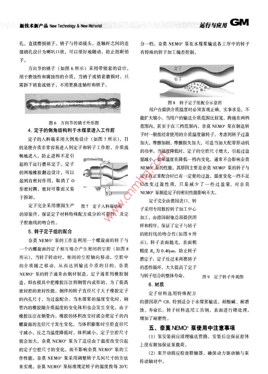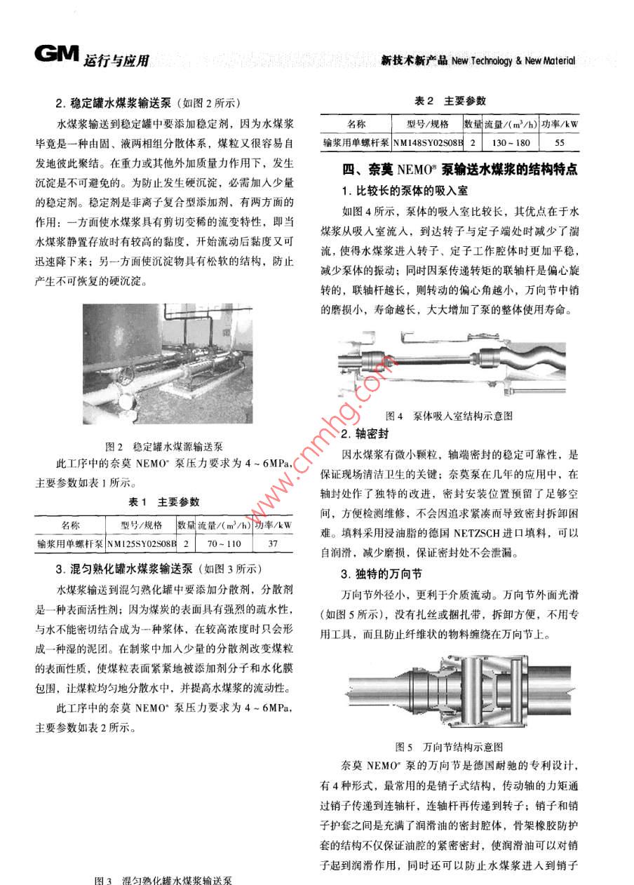 新技術(shù)新產(chǎn)品 New Technology& New Material運行5應(yīng)GM奈莫NEMO"泵在水媒漿生產(chǎn)線應(yīng)用的探討德國耐馳(蘭州)泵業(yè)有限公司(甘肅730000)魏建勝【摘要】主要介紹了水煤漿的技術(shù)特性、制備工藝,奈莫泵的結(jié)構(gòu)特征和結(jié)構(gòu)特點,輸送水煤漿的安全性、可靠性、穩(wěn)定性的比較和論述。奈莫NEMO°泵是近年來水煤漿生產(chǎn)線實現(xiàn)連續(xù)化,微機控制自動化生產(chǎn)的可靠輸送設(shè)備?!娟P(guān)鍵詞】水煤漿輸送設(shè)備特點應(yīng)用優(yōu)勢、引言、水煤漿的制備工藝中使用奈莫NEMO水煤漿是20世紀(jì)70年代中期發(fā)展起來的一種新型泵的典型工序煤基流體潔凈環(huán)保燃料,既保留了煤的燃燒特性,又具水煤漿制漿工藝通常包括破碎、磨礦、攪拌與剪備了類似重油的液態(tài)燃燒應(yīng)用特點。它是以70%左右的切,以及為別除最終產(chǎn)品中的超粒與雜物的濾漿等環(huán)煤,30%左右的水,1%的化學(xué)添加劑經(jīng)過一定的加工節(jié)。磨煤是水煤漿制備過程中的關(guān)鍵環(huán)節(jié),一般水煤漿工藝混合而成,具有石油一樣的流動性和穩(wěn)定性,可以生產(chǎn)線采用的濕法球磨機工藝,從最初的球磨機出來的用泵輸送。奈莫NEMO泵是德國耐馳公司生產(chǎn)的容積原料水煤漿一直到穩(wěn)定處理,均勻熟化再到儲漿罐都要式單螺桿泵,其在世界上的注冊商標(biāo)為奈莫NEMO"泵使用奈莫NEMO泵輸送,而在各工序中奈莫NEMO在歐洲的水煤漿生產(chǎn)線已成功應(yīng)用多年。其全資子公司泵的選型又有其特點。耐馳(蘭州)泵業(yè)有限公司于1993年開始在中國生產(chǎn)1.緩沖桶水煤漿輸送泵(如圖1所示)銷售奈莫NEMO泵;195年開始在我國水煤漿生產(chǎn)廠從球磨機出來的水煤漿經(jīng)緩沖桶中緩沖,然后泵送及發(fā)電廠生產(chǎn)線中使用,經(jīng)過近幾年的研究探索和不斷到穩(wěn)定罐,緩沖桶中的水煤漿基本沒有添加劑,很容易的改進(jìn),奈莫泵在水煤漿生產(chǎn)線的使用日趨穩(wěn)定,安沉淀;所以在泵的選型中應(yīng)多考慮泵的超壓問題,通常全、長壽命的特點使奈莫NEMO·泵成為水煤漿生產(chǎn)泵的設(shè)計出口壓力為0.3~0.6MPa,但在實際應(yīng)用中泵廠、發(fā)電廠連續(xù)化、自動化生產(chǎn)的首選輸送設(shè)備。在起動的前50s要達(dá)到0.8MPa;所以泵選型時要保證二、奈莫NEMO”泵輸送的水煤漿的主要泵的出口壓力,功率滿足0.8M的要求。技術(shù)指標(biāo)項目質(zhì)量濃度(%)66±2黏度/mPa·s(100s)1200±200粒度上限/m平均粒度38-45灰分Ad(%)<10.0硫分Std(%)揮發(fā)分vdaf(%)28發(fā)熱量Qaet,ar/(MJk8.84-19.26灰熔點ST/℃1270-1300急定期/d圖1緩沖桶水煤漿輸送泵運行與應(yīng)用新技術(shù)新產(chǎn)品 New Technology& New Material2.穩(wěn)定罐水煤漿輸送泵(如圖2所示)表2主要參數(shù)水煤漿輸送到穩(wěn)定罐中要添加穩(wěn)定劑,因為水煤漿名稱型號/規(guī)格數(shù)量流量(m3/h)功率kW畢竟是一種由固、液兩相組分散體系,煤粒又很容易自輸漿用單螺桿NM14332101815發(fā)地彼此聚結(jié)。在重力或其他外加質(zhì)量力作用下,發(fā)生四、奈莫NEMO泵輸送水煤漿的結(jié)構(gòu)特點沉淀是不可避免的。為防止發(fā)生硬沉淀,必需加入少量比較長的泵體的吸入室的穩(wěn)定劑。穩(wěn)定劑是非離子復(fù)合型添加劑,有兩方面的作用:一方面使水煤漿具有剪切變稀的流變特性,即當(dāng)如圖4所示,泵體的吸入室比較長,其優(yōu)點在于水煤漿從吸入室流入,到達(dá)轉(zhuǎn)子與定子端處時減少了湍水煤漿靜置存放時有較高的黏度,開始流動后黏度又可流,使得水煤漿進(jìn)入轉(zhuǎn)子、定子工作腔體時更加平穩(wěn),迅速降下來;另一方面使沉淀物具有松軟的結(jié)構(gòu),防止減少泵體的振動;同時因泵傳遞轉(zhuǎn)矩的聯(lián)軸桿是偏心旋產(chǎn)生不可恢復(fù)的硬沉淀。轉(zhuǎn)的,聯(lián)軸桿越長,則轉(zhuǎn)動的偏心角越小,萬向節(jié)中銷的磨損小,壽命越長,大大增加了泵的整體使用壽命。圖4泵體吸入室結(jié)構(gòu)示意圖2.軸密封圖2穩(wěn)定罐水煤源輸送泵因水煤漿有微小顆粒,軸端密封的穩(wěn)定可靠性,是此工序中的奈莫NEMO”泵壓力要求為4-6MPa保證現(xiàn)場清潔衛(wèi)生的關(guān)鍵;奈奠泵在幾年的應(yīng)用中,在主要參數(shù)如表1所示。表1主要參數(shù)軸封處作了獨特的改進(jìn),密封安裝位置預(yù)留了足夠空間,方便檢測維修,不會因追求緊湊而導(dǎo)致密封拆卸困型號/規(guī)格數(shù)量流量/(m3/h)功率/kW難。填料采用浸油脂的德囯 NETZSCH進(jìn)口填料,可以漿用單螺桿泵NM125502s08B自潤滑,減少磨損,保證密封處不會泄漏。3.混勻熟化罐水煤漿輸送泵(如圖3所示)3.獨特的萬向節(jié)水煤漿輸送到混勻熟化罐中要添加分散劑,分散劑萬向節(jié)外徑小,更利于介質(zhì)流動。萬向節(jié)外面光滑是一種表面活性劑;因為煤炭的表面具有強烈的疏水性,(如圖5所示),沒有扎絲或捆扎帶,拆卸方便,不用專與水不能密切結(jié)合成為一種漿體,在較商濃度時只會形用工具,而且防止纖維狀的物料纏繞在萬向節(jié)上。成一種混的泥團(tuán)。在制漿中加入少量的分散劑改變煤粒的表面性質(zhì),使煤粒表面緊緊地被添加劑分子和水化膜包圍,讓煤粒均勻地分散水中,并提高水煤漿的流動性此工序中的奈莫NEMO