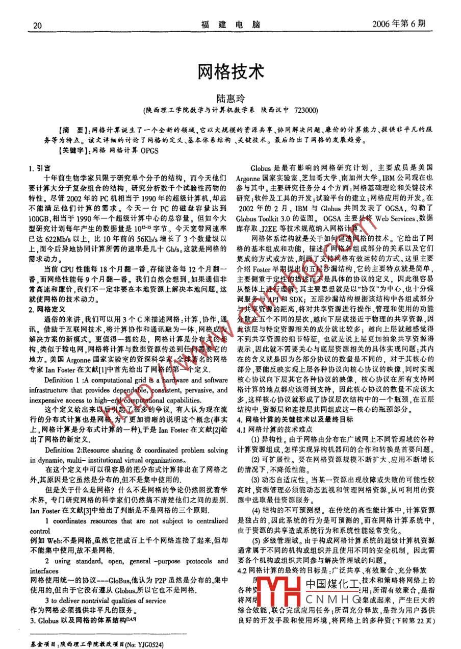 _20福建電腦2006年第6期網(wǎng)格技術(shù)陸惠玲(陜西理工學(xué)院數(shù)學(xué)與計(jì)算機(jī)數(shù)學(xué)系陜西漢中723000){摘要]:網(wǎng)格計(jì)算誕生了一個(gè)全新的領(lǐng)城,它以大規(guī)模的資源共享 、協(xié)同解決問題、廉價(jià)的計(jì)算能力、提供非平凡的服務(wù)等為特點(diǎn)。該文詳細(xì)的討論了網(wǎng)格的定義、基本體系結(jié)構(gòu)、關(guān)鍵技術(shù)。最后給出了網(wǎng)格的發(fā)展趨勢。[關(guān)鍵字]:網(wǎng)格網(wǎng)格計(jì)算OPGS1.引言Globus是最有影響的網(wǎng)格研究計(jì)劃,主要成員是美國十年前生物學(xué)家只限于研究單個(gè)分子的結(jié)構(gòu),而今天他們 Argonne國家實(shí)驗(yàn)室芝加哥大學(xué)、南加州大學(xué)。IBM公司現(xiàn)在也要計(jì)算大分子復(fù)雜組合的結(jié)構(gòu),研究分析數(shù)千個(gè)試驗(yàn)性藥物的參 與其中。主要研究任務(wù)分4個(gè)方面:網(wǎng)格基礎(chǔ)理論和關(guān)鍵技術(shù)特性。盡管2002年的PC機(jī)相當(dāng)于1990年的超級(jí)計(jì)算機(jī),卻遠(yuǎn)研究;軟件及工具的開發(fā);試驗(yàn)平臺(tái)的建立;網(wǎng)格應(yīng)用的開發(fā)。在不能滿足他們計(jì)算的需求。今天一臺(tái)PC的磁盤容量達(dá)到2002 年的2月,IBM與Globus共同發(fā)表了OGSA,勾勒了100GB,相當(dāng)于1990年- -個(gè)超級(jí)計(jì)算中心的總?cè)萘俊5缃翊驡lobus Toolkit 3.0的藍(lán)圖。OGSA 主要是將Web Services、數(shù)據(jù)型研究計(jì)劃每年產(chǎn)生的數(shù)據(jù)量是10-15 字節(jié)。今天寬帶網(wǎng)速率庫存 取J2EE等技術(shù)規(guī)范納入網(wǎng)格計(jì)算。已達(dá)622Mb/s以上,比10年前的56Kb/s 增長了3個(gè)數(shù)量級(jí)以網(wǎng)格 體系結(jié)構(gòu)就是關(guān)于如何建造網(wǎng)格的技術(shù)。它給出了網(wǎng)上,而今后異地協(xié)同計(jì)算所需的速率是幾十Gb/s。這就是網(wǎng)格的格的基本組成和功能,描述了網(wǎng)格各組成部分的關(guān)系以及它們需求動(dòng)力。集成的方式或方法,刻畫了支持網(wǎng)格有效運(yùn)轉(zhuǎn)的方式。這里主要當(dāng)前CPU性能每18個(gè)月翻一番,存儲(chǔ)設(shè)備每12個(gè)月翻一介紹 Foster早期提出的五層沙漏結(jié)構(gòu),它的主要特點(diǎn)就是簡單,番,而網(wǎng)絡(luò)性能每9個(gè)月翻一番。我們自然會(huì)想到,如果通信非主要 側(cè)重于定性的描述而不是具體的協(xié)議的定義,因此很容易常高速和康價(jià),,我們不一定非要在本地資源上解決本地問題。這從整體 上進(jìn)行理解。其主要思想就是以“協(xié)議"為中心,也十分強(qiáng)就使網(wǎng)格的技術(shù)動(dòng)力。謁服務(wù)與API和SDK;五層沙漏結(jié)構(gòu)根據(jù)該結(jié)構(gòu)中各組成部分2.網(wǎng)格定義與共享資源的距離,將對(duì)共享資源進(jìn)行操作.管理和使用的功能通俗的來講,我們可以用3個(gè)C來描述網(wǎng)格:計(jì)算,協(xié)作,通分 散在五個(gè)不同的層次,越向下層就接近于物理的共享資源,因訊。借助于互聯(lián)網(wǎng)技術(shù),將計(jì)算協(xié)作和通訊融為一體,網(wǎng)格成為此該層 與特定資源相關(guān)的成分就比較多;越向上層就越感覺得解決方案的新模式。更值得一提的是,網(wǎng)格計(jì)算是分布式的架不到共享 資源的細(xì)節(jié)特征,也就是說上層更加抽象共享資源得構(gòu),類似于輸電網(wǎng),網(wǎng)格將計(jì)算與數(shù)據(jù)資源傳送到任何需要它的表示 ,因此就不需要關(guān)心與底層資源相關(guān)的具體實(shí)現(xiàn)問題;其內(nèi)地方。美國Argonne國家實(shí)驗(yàn)室的資深科學(xué)家,全球著名的網(wǎng)格在的 含義就是因?yàn)楦鞑糠謪f(xié)議的數(shù)量是不同的,對(duì)于其核心的專家lan Foster在文獻(xiàn)[]中首先給出了網(wǎng)格的第一個(gè)定義.部分,要能反映實(shí)現(xiàn)上層各種協(xié)議向核心協(xié)議的映像,同時(shí)實(shí)現(xiàn)Definition 1 :A compuaional grid is a hardware and software核心協(xié)議向下 層其它各種協(xié)議的映像,核心協(xié)議在所有支持網(wǎng)infrastructure that provides dependable, consistent, pervasive, and格計(jì)算 的地點(diǎn)都應(yīng)該得到支持,因此核心協(xié)議的數(shù)量不應(yīng)該太inexpensive access to high-end computational capabilities.多,這樣核心協(xié)議就形成了協(xié)議層次結(jié)構(gòu)中的一個(gè)瓶頸,在五層這個(gè)定義給出來以后引起了很多的爭議,有人認(rèn)為現(xiàn)在流結(jié)構(gòu)中 ,資源層和連接層共同組成這-核心的瓶頸部分。行的分布式計(jì)算也是網(wǎng)格.為了更加清晰的說明這個(gè)概念(事實(shí)4. 網(wǎng)格計(jì)算的關(guān)鍵技術(shù)以及最終目標(biāo)上,網(wǎng)格計(jì)算是分布式計(jì)算的一種),于是Ian Foster在文獻(xiàn)[2]給4.1 網(wǎng)格計(jì)算的技術(shù)難點(diǎn)出了網(wǎng)格的新定義.(1)異構(gòu)性。由于網(wǎng)格由分布在廣域網(wǎng)上不同管理域的各種Deinition 2:Resource sharing & cordinaed problem solving計(jì)算 資源組成,怎樣實(shí)現(xiàn)異構(gòu)機(jī)器間的合作和轉(zhuǎn)換是首要問題。in dynamic, muli- instiutional virtual organizaions。(2)可擴(kuò)展性。要在網(wǎng)格資源規(guī)模不斷擴(kuò)大、應(yīng)用不斷增長在這個(gè)定義中可以很容易