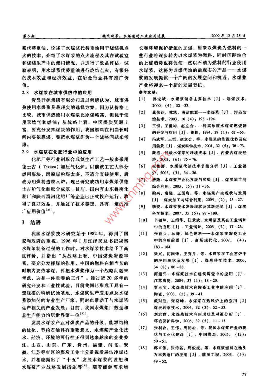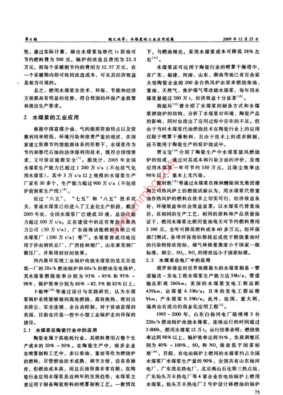 第6期選煤技求2009年12月COAL PREPARATION TECHNOLOGYDec.2009文章編號:1001-3571(2009)06-0074-04水煤漿的工業(yè)應(yīng)用進展魏文瓏,王燦,常宏宏,王志忠(太原理工大學(xué)化學(xué)化工學(xué)院,山西太原030024)摘要:水煤漿作為一種新型潔凈燃料,在陶瓷、發(fā)電、制鎂、工業(yè)取暖、節(jié)能減排和城市供熱等領(lǐng)城有著很好的應(yīng)用前景。文章綜述了水煤漿在技術(shù)、環(huán)保、經(jīng)濟等方面的諸多優(yōu)點,并對其應(yīng)用前景進行了展望。關(guān)鍵詞:水煤漿;優(yōu)點;潔凈煤燃料;工業(yè)應(yīng)用;應(yīng)用前景中圖分類號:TQ536文獻標識碼:A自20世紀70年代發(fā)生石油危機以來,水煤漿體積小,在煤漿和霧化空氣壓力均為250~350作為一種新型煤基流體燃料受到許多發(fā)達國家重kPa、氣耗率為0.12、助燃空氣壓力為ll5~210視,該燃料裝卸、儲存方便,具有濃度高、粒度kPa的操作條件下,水煤漿即可穩(wěn)定高效地燃燒,細、流動性好、燃燒效率高、負荷調(diào)節(jié)范圍大、環(huán)且火焰容易控制,溫度調(diào)節(jié)方便,燃燒效率高保節(jié)能、存儲安全等優(yōu)點,是國際上公認的潔馮武軍等通過對水煤漿中水分的研究發(fā)現(xiàn),凈煤燃料,可以廣泛應(yīng)用于電站鍋爐、集中供熱、雖然水煤漿中含有35%的水,但這并不會導(dǎo)致其工業(yè)鍋爐和工業(yè)窯爐等領(lǐng)域,也可作為氣化原料用著火困難。水煤漿燃燒后煙氣中含有大量水蒸氣于生產(chǎn)合成氨、合成甲醇等]。通常,水煤漿是其燃燒火焰溫度能夠滿足一般工業(yè)鍋爐、爐窯的要由質(zhì)量分數(shù)為70%的干煤粉、29%的水和1%的求。水分的存在可降低燃燒火焰中心溫度、抑制氮化學(xué)添加劑組成的。氧化物的產(chǎn)生。1水煤漿的優(yōu)點1.2環(huán)保優(yōu)點通常采用濕磨工藝制備水煤漿,故而制備過程1.I技術(shù)優(yōu)點中無粉塵污染,且工藝簡單,安全性好。與煤氣化、液化工藝相比,水煤漿的制備工業(yè)商品水煤漿的灰分含量一般在5.5%以下,燃是最簡單可行的。水煤漿具有良好的穩(wěn)定性和流變燒后SO2和NO,排放濃度較低。在水煤漿制備過性能,儲存、運輸十分方便,除公路、鐵路及水運程中,可以加入脫硫劑來脫硫,脫硫率可達40%。之外,還可采用管道長距離運輸。另外,水煤漿可以采用管道、罐車輸送,不會產(chǎn)生水煤漿替代重油在鍋爐中的燃燒效率可達因煤炭流失造成的環(huán)境污染,具有較好的環(huán)境效96%~99%,鍋爐效率在90%左右,達到了燃油益,且環(huán)境粉塵和噪聲低,排渣活性好,燃燒后的的等同水平,并且水煤漿粘度低于重油,易于調(diào)灰渣還可以作為水泥摻合料,沒有二次污染13。節(jié),最低負荷可調(diào)節(jié)至40%,且運行穩(wěn)定可靠。1.3經(jīng)濟優(yōu)點在制漿過程中,磨漿溫度低,僅50~60℃,生產(chǎn)水煤漿代油可充分利用原有設(shè)備,生產(chǎn)流程簡較安全。單,投資省,運行成本低,1.8~2.1t水煤漿的燃北京科技大學(xué)開發(fā)的水煤漿燃燒器結(jié)構(gòu)簡單,燒發(fā)熱量相當lt燃油的,可節(jié)約燃料費約200收稿日期:2009-05-27600元。與燒粉煤相比,燒水煤漿的費用僅為燒粉作者簡介:魏文瓏(1959-),男,山西平定人,博士,教授,現(xiàn)煤的1/3~1/2,改造時間僅為改燒粉煤的1/3。燃就職于太原理工大學(xué)化工學(xué)院,主要從事媒瀝青燃料和藥物中間體油鍋爐改燒水煤漿經(jīng)濟效益顯著。(0351)6ll11652003年,崔彬澎0探討了水煤漿代油的可行靠性。及仿真[J].機械設(shè)計,2008,(2):8-10.參考文獻:[2]丁錦宏,吳國慶,Po/E軟件在新產(chǎn)品設(shè)計中的應(yīng)[1]楊宇,等,臥式螺旋沉降離心機的三維可視化設(shè)計用[J].信息技術(shù),2006,(4):138~139第6期魏文瓏等:水煤漿的工業(yè)應(yīng)用進展200年12月25日性,通過實際計算,得出水煤漿每替代It原油可下,與燃油相比,采用水煤漿成本可降低28%左節(jié)約燃料費為500元,鍋爐的改造總費用為23.3右萬元,而每個采暖期節(jié)約的費用為3257萬元,在水煤漿還可應(yīng)用于陶瓷行業(yè)的噴霧干燥塔中個采暖期內(nèi)即可收回改造成本,可見其經(jīng)濟效益在廣東、福建、河南、山東、湖南等地已有百余家是相當可觀的。大型陶瓷企業(yè)的200余臺熱風(fēng)爐由原來燃燒柴油總之,燃用水煤漿在技術(shù)、環(huán)保、節(jié)能和經(jīng)濟重油、天然氣、焦爐煤氣等改燒水煤漿,每年用水方面都具有明顯的優(yōu)勢,符合我國的環(huán)保產(chǎn)業(yè)政策煤漿量超過200萬t,經(jīng)濟效益十分顯著)。和清潔生產(chǎn)要求。商超兵{3曾介紹了水煤漿的制備方式和水煤2水煤漿的工業(yè)應(yīng)用漿燃燒爐的結(jié)構(gòu),分析了水煤漿對環(huán)境、陶瓷產(chǎn)品的影響,同時也指出了應(yīng)用過程中存在的不足。但根據(jù)中國富煤少油、氣的能源資源特點以及資由于當時水煤漿代油燃燒技術(shù)在陶瓷行業(yè)上的應(yīng)用源利用率較低、環(huán)境污染和浪費嚴重的現(xiàn)狀,在國僅限于噴霧干燥粉料,且由于技術(shù)上的諸多限制家建立資源節(jié)約型能源體系的形勢下,水煤漿作為還不能用于陶瓷生產(chǎn)的窯爐燒成中。節(jié)約和替代石油的潔凈煤利用技術(shù),既符合國情要賈玉寶“介紹了陶瓷生產(chǎn)中水煤漿旋風(fēng)燃燒求,又可保證能源安全”。據(jù)統(tǒng)計,2005年全國