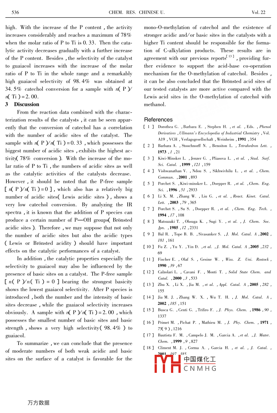 Available online at www.sciencedirect.comSCIENCEdoinnor.CHEM. RES. CHINESE U.2006 ,224),533- -536V apour-phase O-methylation of Catechol with Methanolon Ti-containing Phosphate CatalystsZHU Xiao-meil , LI Xue-mei? , LIU Gang' , Z0U Xiu-jing'WANG Yan-li' , JIA Ming-jun'** and ZHANG Wen-xiang'1. College of Chemistry , Jilin University , Changchun 130021 ,P. R. China ;2. Shanghai Huayi Acrylic Acid Co. Ltd. , Shanghai 200137 ,P. R. ChinaReceived July 28 ,2005Ti-containing phosphat( Ti-P-0 ) catalysts with different molar ratios of P to Ti( 0- -2. 0 ) were synthesized andcharacterized by XRD , N2 -adsorption/ desorption , IR and temperature-programmed desorption( TPD ) methods. Thecatalytic properties of Ti-P-O samples in the vapor-phase O-methylation of catechol with methanol were also studied.The catechol conversion increases with the increase of the molar ratioof P to Ti in a range of0- -0. 33 ,while a furtherincrease in the P content leads to a decrease of the catalytic activity. Meanwhile , the selectivities of the catalysts tothe main produc( guaiacol ) increase gradually with the increase of the molar ratio of P to Ti. The presence of rela-tively strong Lewis acidic and/ or basic sites in the P-free catalyst should be responsible for the formation of C-alkyla-tion products. The weak acid-base characteristics of the catalysts are favourable for the mono-O-methylation of cate-chol. In comparison with the Lewis acidic sites , the Bronsted acidic sites on the catalysts are more active for the titlereaction.Keywords Phosphates ; Acid-base catalysis ; Guaiacol ; Catechol ; O-MethylationArticle ID 1005 _9040( 2006 )-04 -533-04Introductionincrease in basic intensity of the metal ions , the selec-Guaiacol is an important synthesis intermediate intivities of these catalysts to guaiacol decrease. Vish-the production of flavoring agents , fragrances , agricul-wanathan et al.'41 proposed that the presence of weaktural chemicals and pharmaceuticals' ". Vapor -phasebasic sites on supported caesium catalysts is importantalkylation of catechol with methanol is believed to be anfor the formation of guaiacol. In another work , Fu etalternative method for the synthesis of guaiacol , sinceal.!10] found that a ZnCl2/ y-Al2O3 catalyst with a cer-this process is more economical and more environmen-tain amount of Lewis acidic sites is very active and se-tally friendly than traditional synthetic methods' 2- 61.lective for the preparation of guaiacol. Calzolari and co-Several heterogeneous catalysts have been reported toworkers' 2 I reported that a co-operation effect betweenbe active for the reaction , including various oxides andbasic and acidic sites by the addition of potassium intosupported oxides ,aluminium phosphates and zeo-B/P/O catalysts could improve the catalytic perform-lites' 3-1. Recently , more attention has been drawn toance for the O-methylation of catechol. A similar con-studying the relationship between the acidic or basicclusion has recently been put forward in our work' 1 ! al-properties and the catalytic performance of a catalyst forso. We found that AI-P-Ti-O catalysts bearing relativelythe purpose of understanding the nature of active sitesweak acid-base characteristics show very high activitiesand to provide guidance for designing novel efficientand selectivities to mono-O-alkylation production with acatalysts.good中國煤化工Bal et al.t9y found that alkali supported SiO2 cata-CNMHGrelationship betweenlysts are active for the title reaction. However , with thethe aciu-baste pruperuies U1 ule catalysts and their cata-. Supported by the Development Project of Science and Technology of Jilin Province( Nos. 20050309-1 and 20040563 ) , the Spe-cialized Research Fund for the Doctoral Program of Higher Educatior( No. 20040183003 ),CNPO( No. JTGS 20040010 ) , and the Na-tional Natural Sciese Foundation of Chind( No. 20403006 ).* *ToWhomCorrespondence should be addressed. E-mail : zhwenx@ mail. ju. edu. cn ; jiamingjun@ email. jlu. edu. cn .534CHEM. RES. CHINESE U.Vol. 22lytic performances for the title reaction , we attemptedphate or titanium pyrophosphate. For the sample withto simplify the multi-ingredient catalysts to binary phos-n(P )r( Ti )=2. 00 ,the main crystal phase is titani-phate( Ti-P-0 ) catalysts. A series of Ti-P-O catalystsum pyrophosphate.with different molar ratios of P to Ti was prepared , and: TiO2the effects of the molar ratio of P to Ti on the texturev: TiP2O7and surface acid-base properties were studied by vari-ous methods. The vapor-phase O-methylation of cate-chol was investigated on the Ti-P-O catalysts.Experimental1 Catalyst PreparationTi-P-O catalysts with the molar ratio of P to Ti var-ied from 0 to 2. 00 were prepared according to a proce-103(5C28/()dure for synthesizing Ti-containing aluminium phos-Fig.1 XRD patterns of Ti-P-O catalysts withphates 13 . Typically , tetra-n-butyl titanate dissolved indifferent molar ratios of P to Ti.ethanol was hydrolyzed in distilled water at room tem-n(P):r(Ti):a. 0;b. 0.50;c. 1.00;d. 2.00.perature under vigorous stirring. After that , phosphoricThe textural properties of various Ti-P-O samplesacid was dropped into the mixture under reflux. Afterre listed in Table 1. Compared to the sample ofstanding for several hours , the mixture was heated atn(P )n( Ti)=0 ,the sample of n( P )n( Ti )=0.33363 K in open air with continuous stirring to removehas a higher BET surface area( 238 m'/g ) and a largerwater and all other volatiles. Then the resulting whitepore volume( 0. 50 cm3/g ). With the increase of the Psolid was dried at 383 K for 12 h and calcined at 673 Kto Ti ratid( from 0.33 to 2. 00 ) , both the BET surfacefor5hinair.area and the pore volume decrease obviously ,and a2 Catalyst Characterizationvery low specific surface area( 6 m'/g ) can be ob-XRD patterns were recorded on a Lab XRD-6000served in the sample of n( P )/n( Ti )=2.00. .X-ray diffractometer with nickel-filtered Cu Ko radia-Table 1 Textural properties of Ti-P-O 